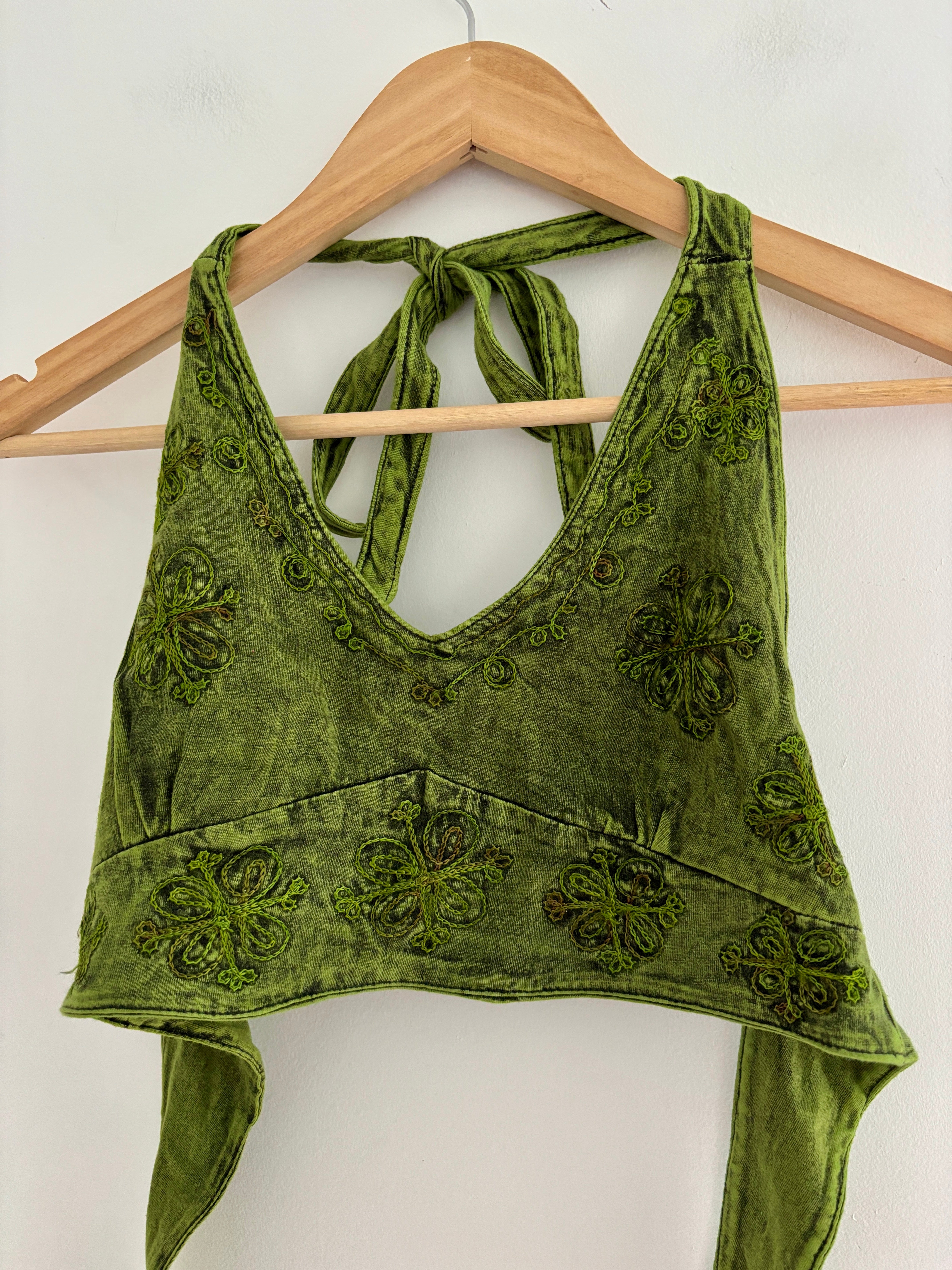 These beautiful halter tops are decorated with embroidery with ties at the neck and back.