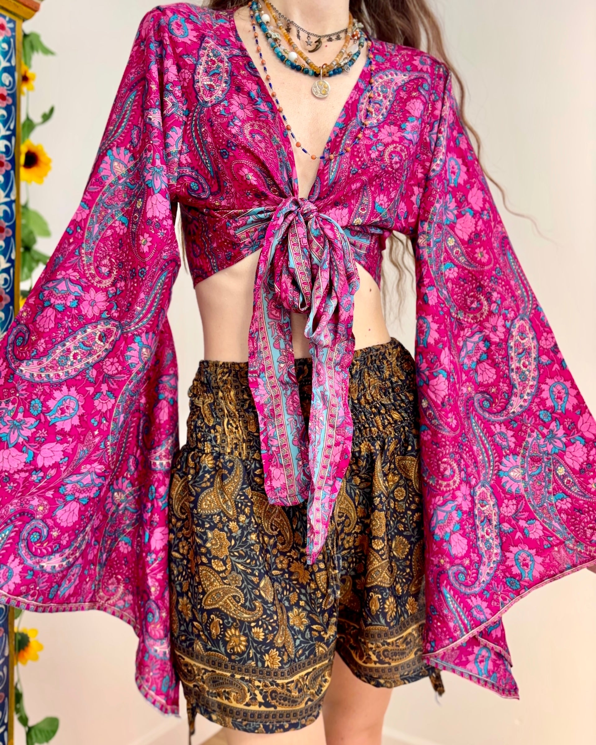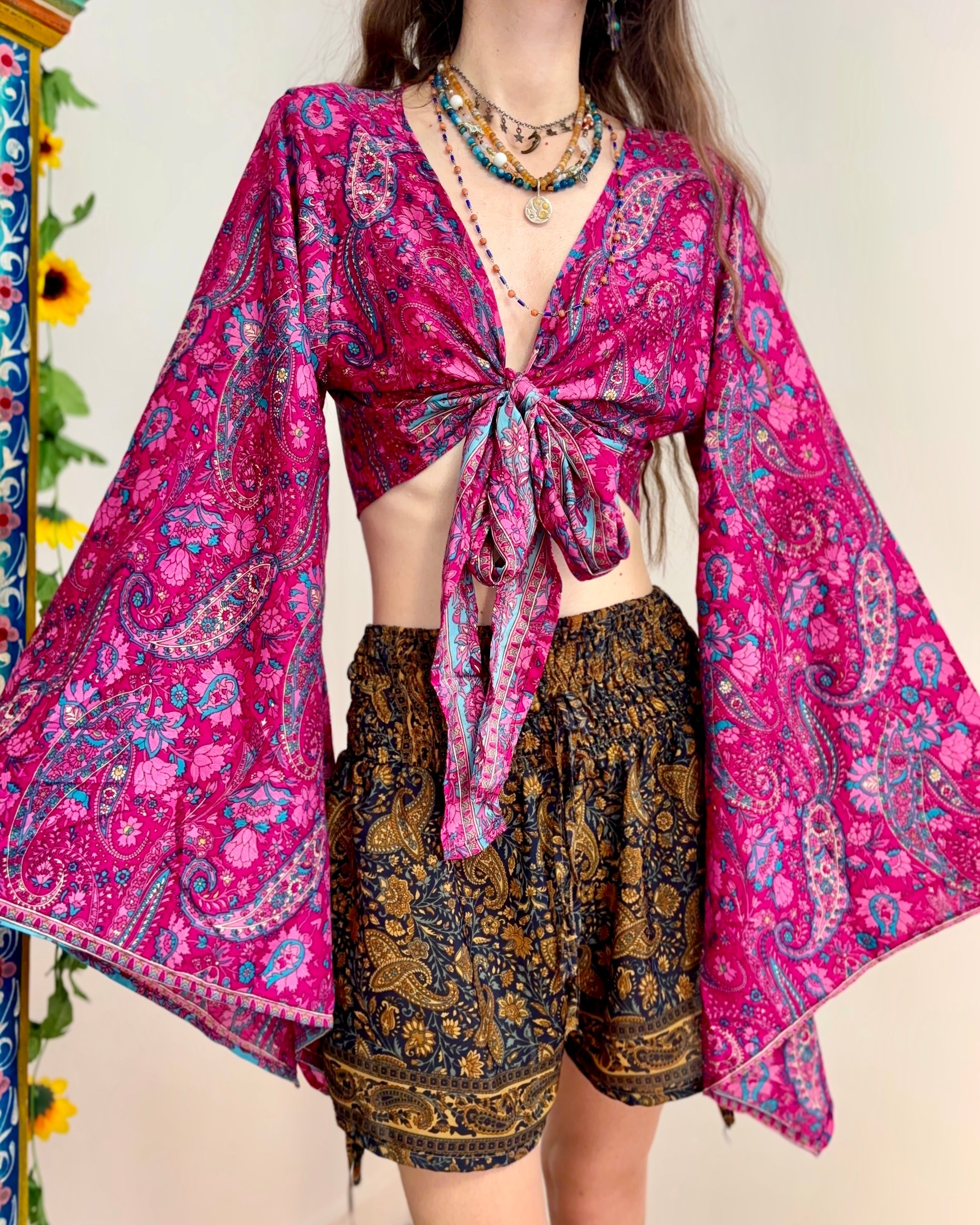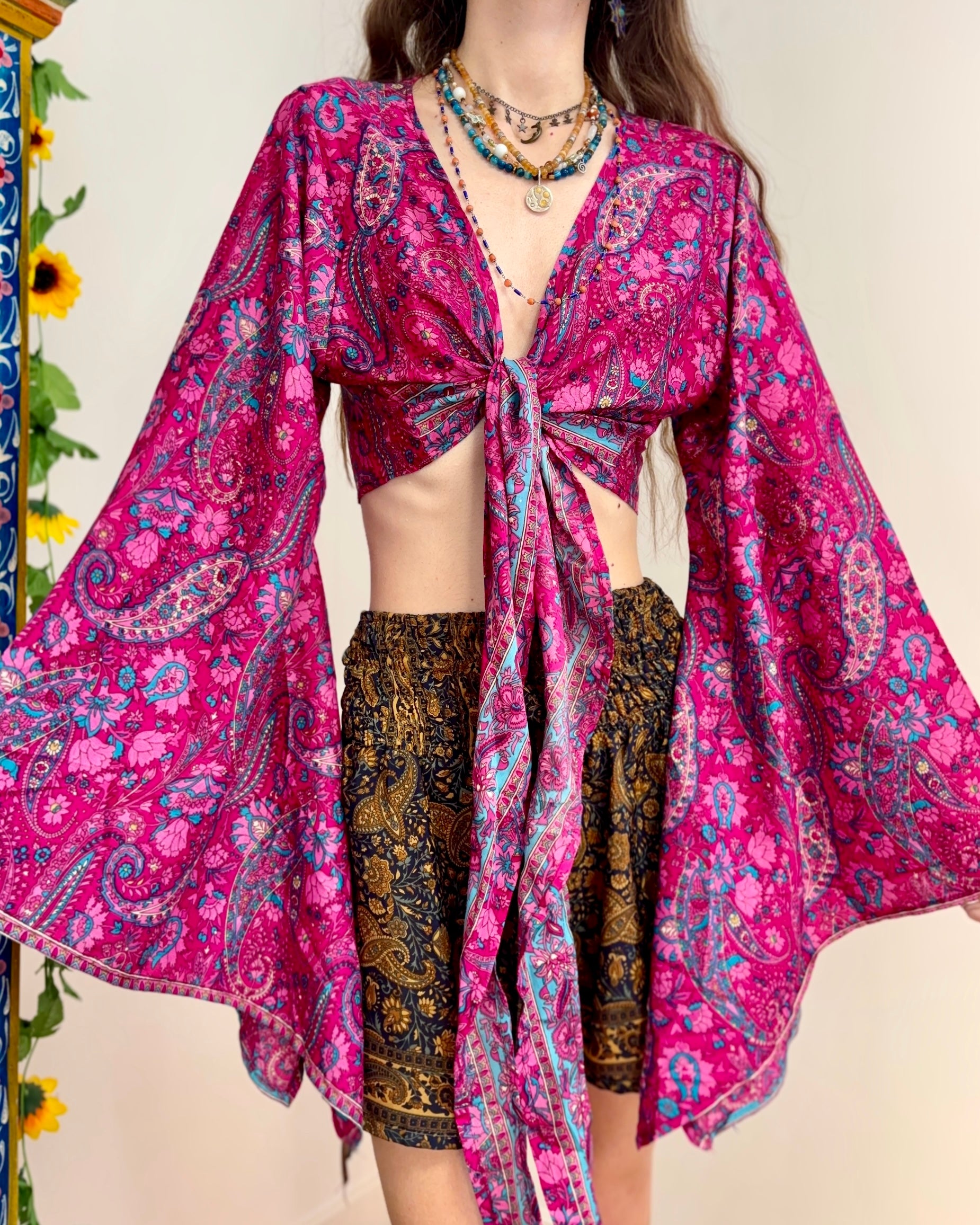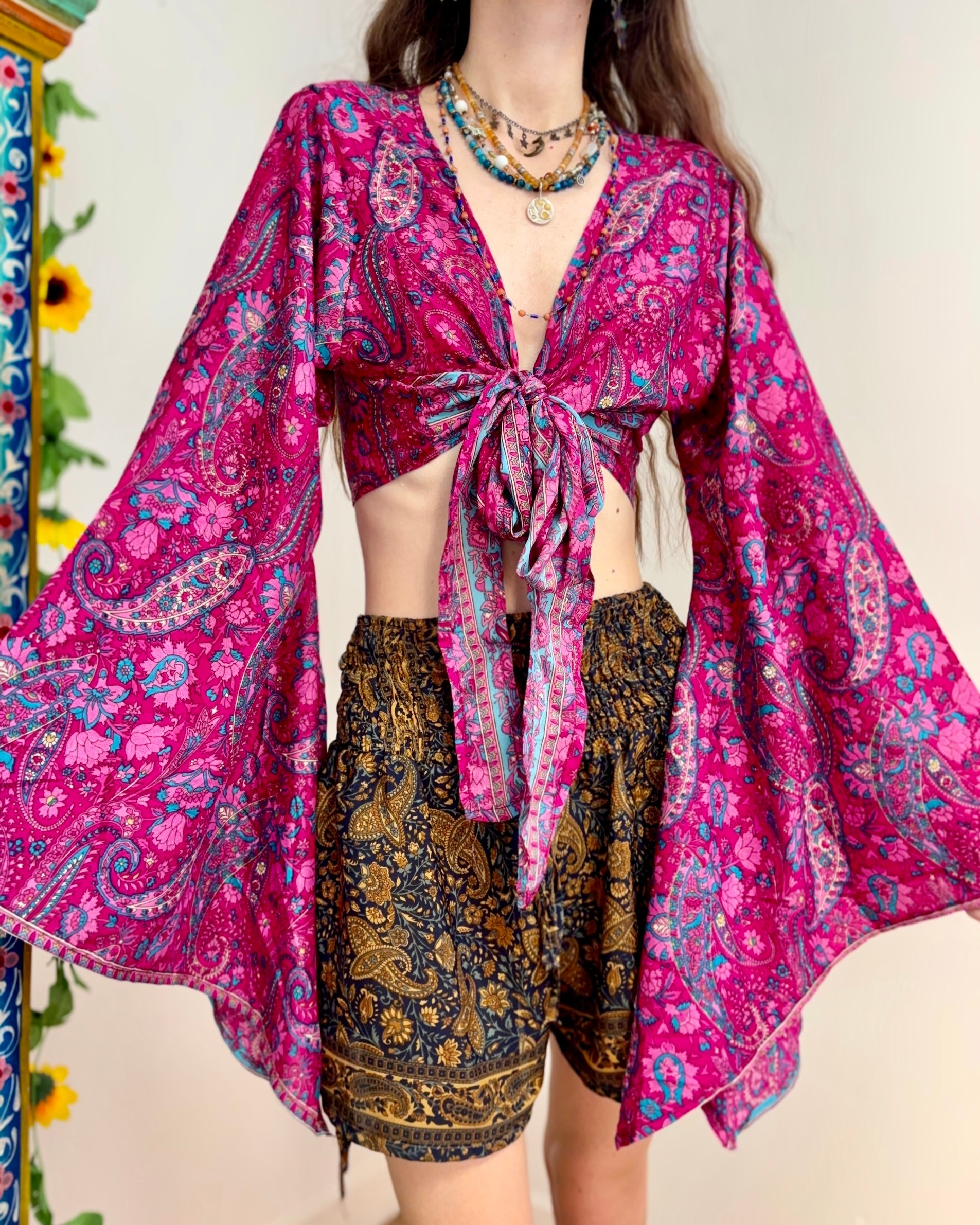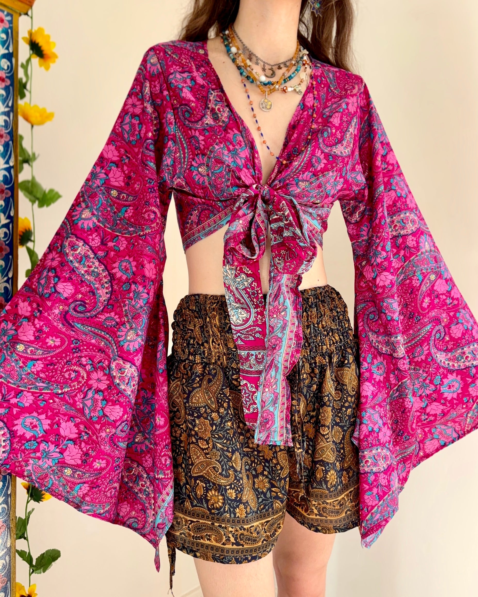 These beautiful bell sleeve tops are made from recycled Sari silk, that would have otherwise gone to waste! With flared sleeves & large ties, they can be worn in a variety of ways.