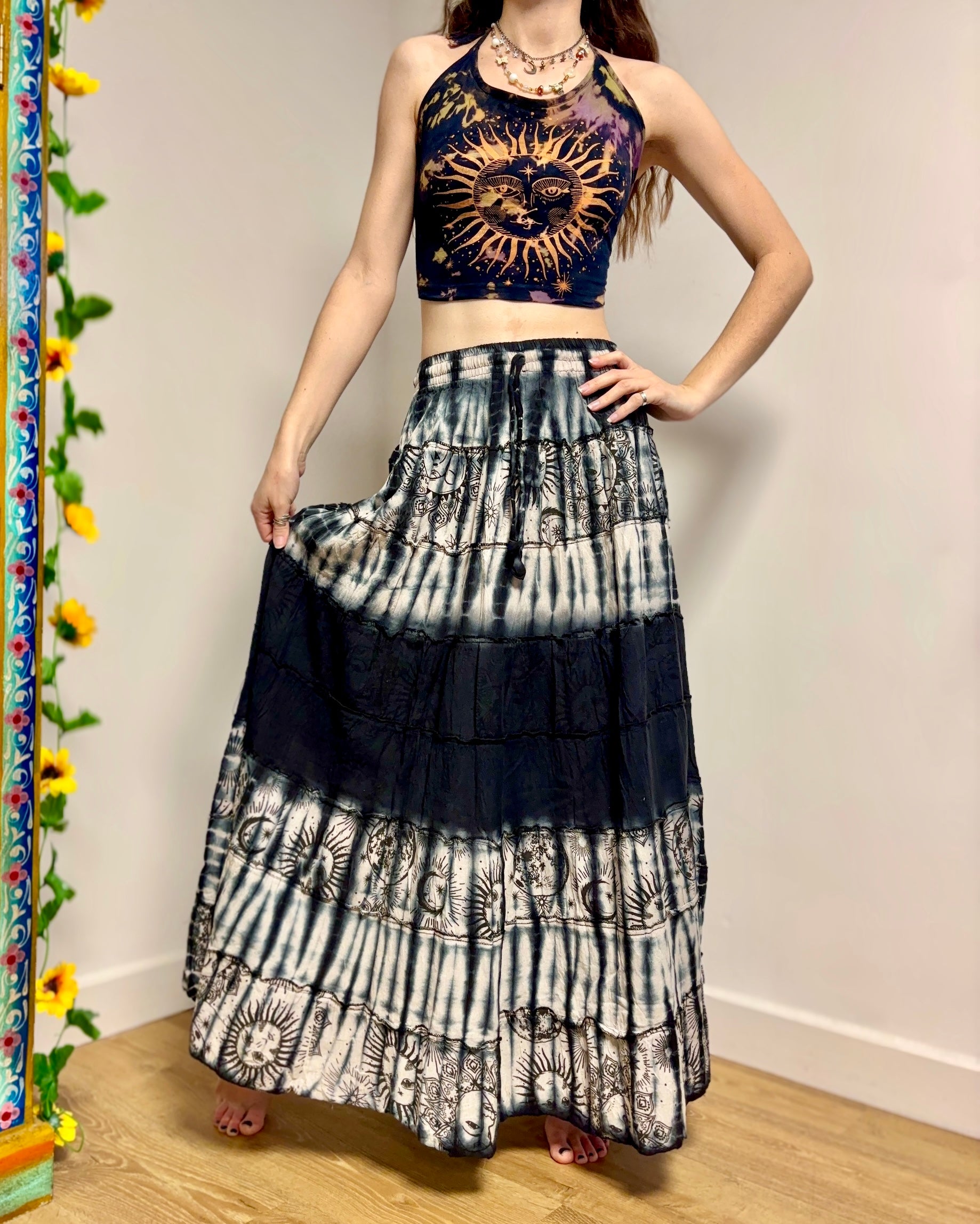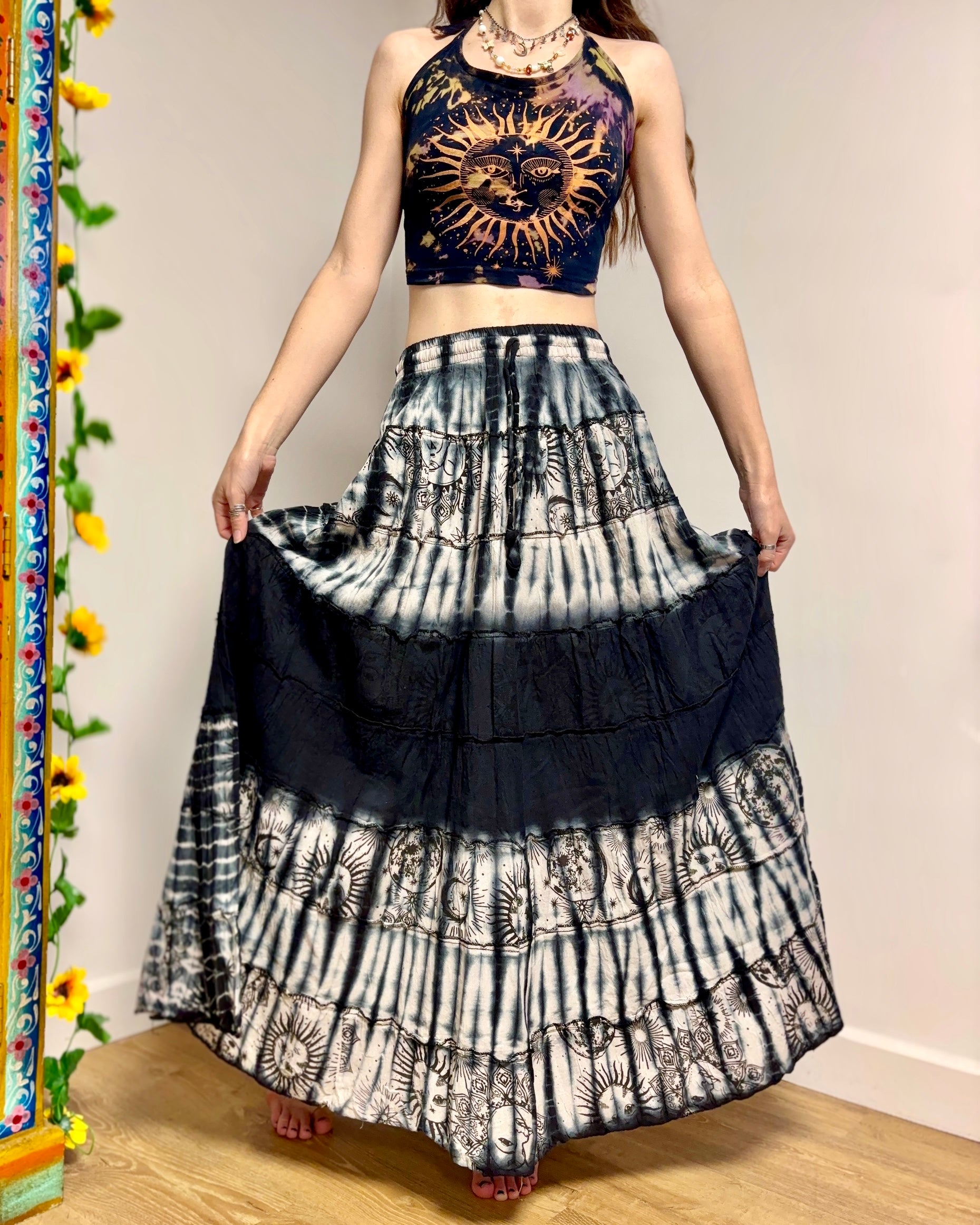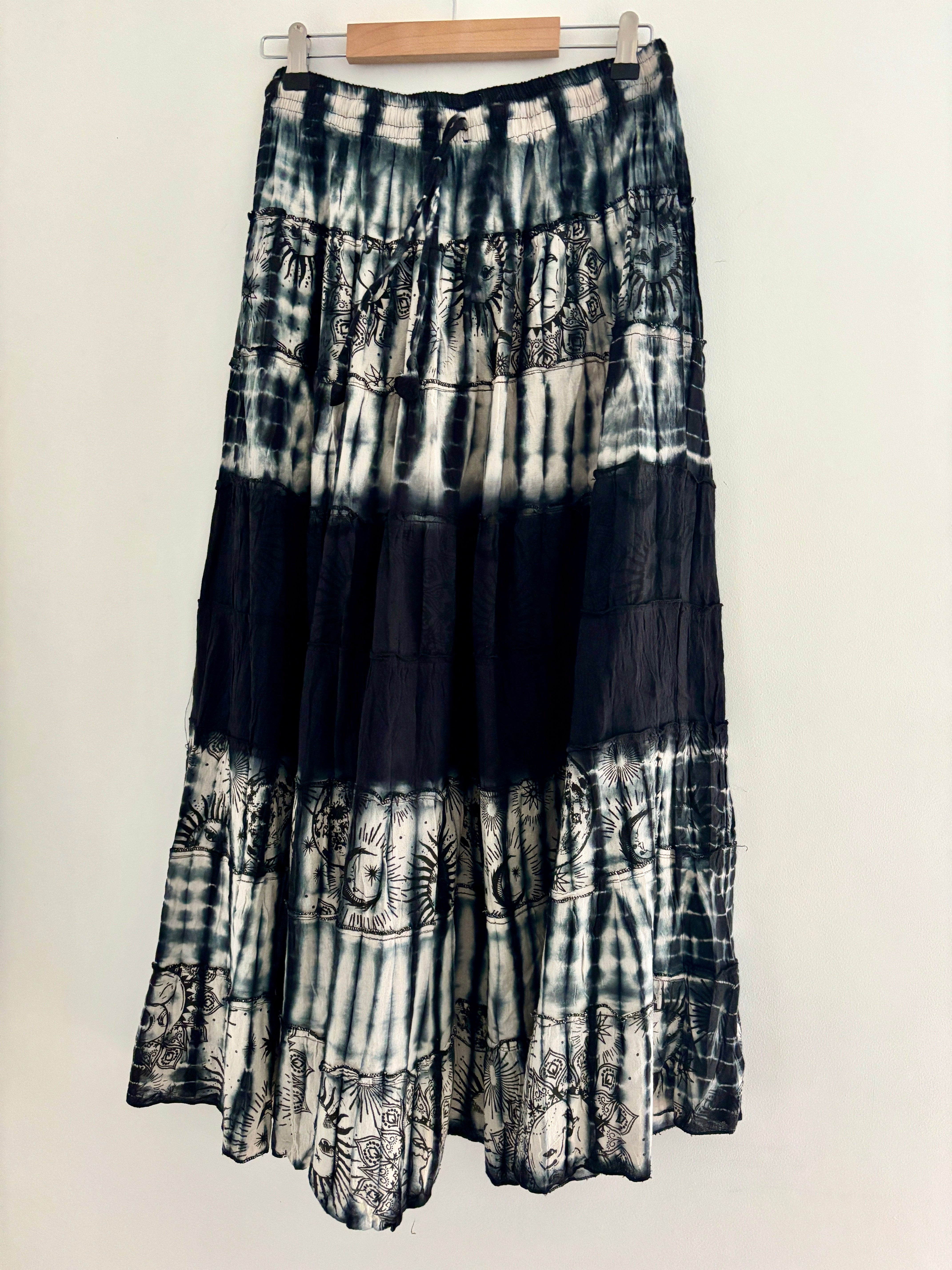 This beautiful celestial maxi skirt is made from black tie-dyed fabric decorated with suns, moons and stars. It has an elastic waist for a comfortable fit.