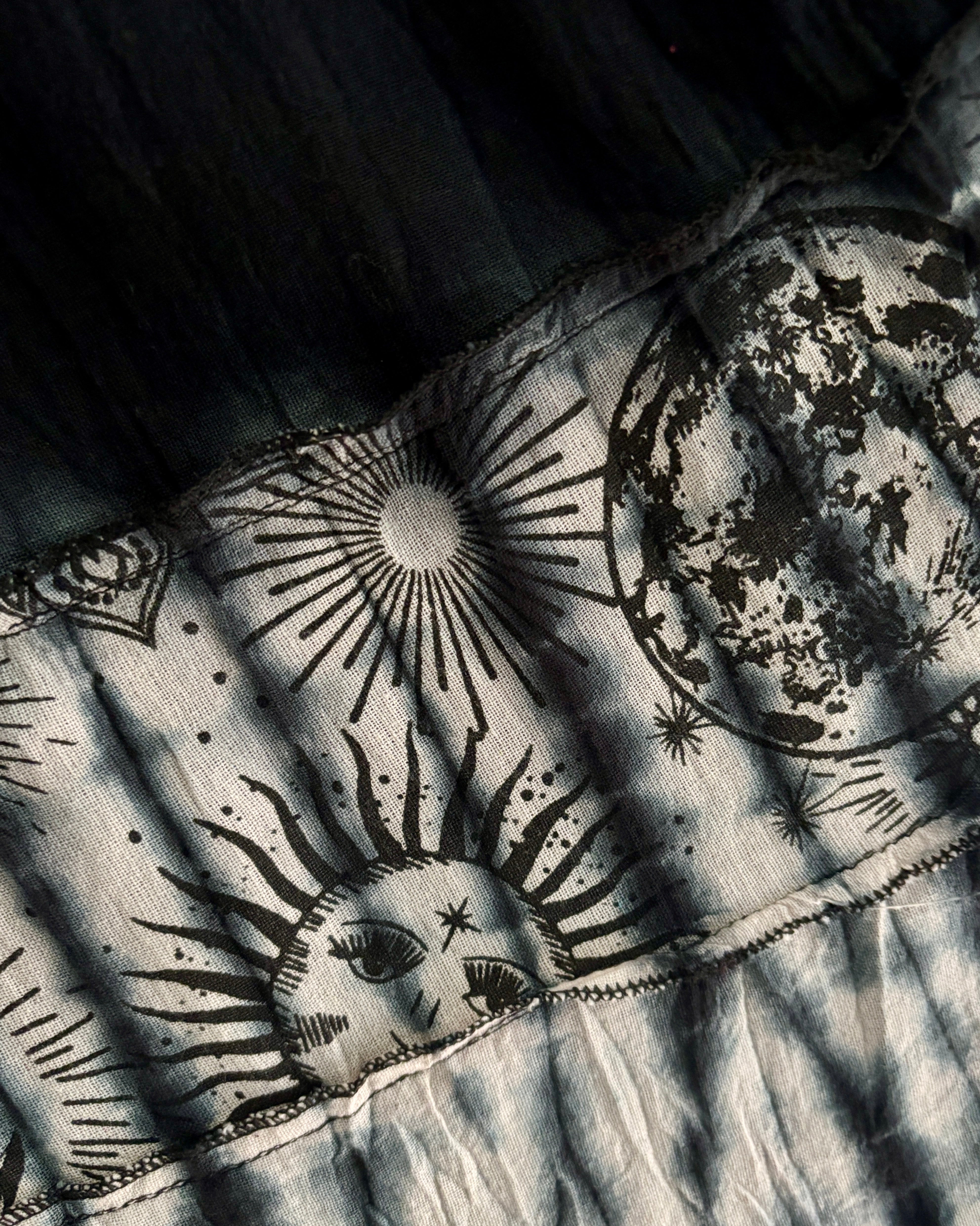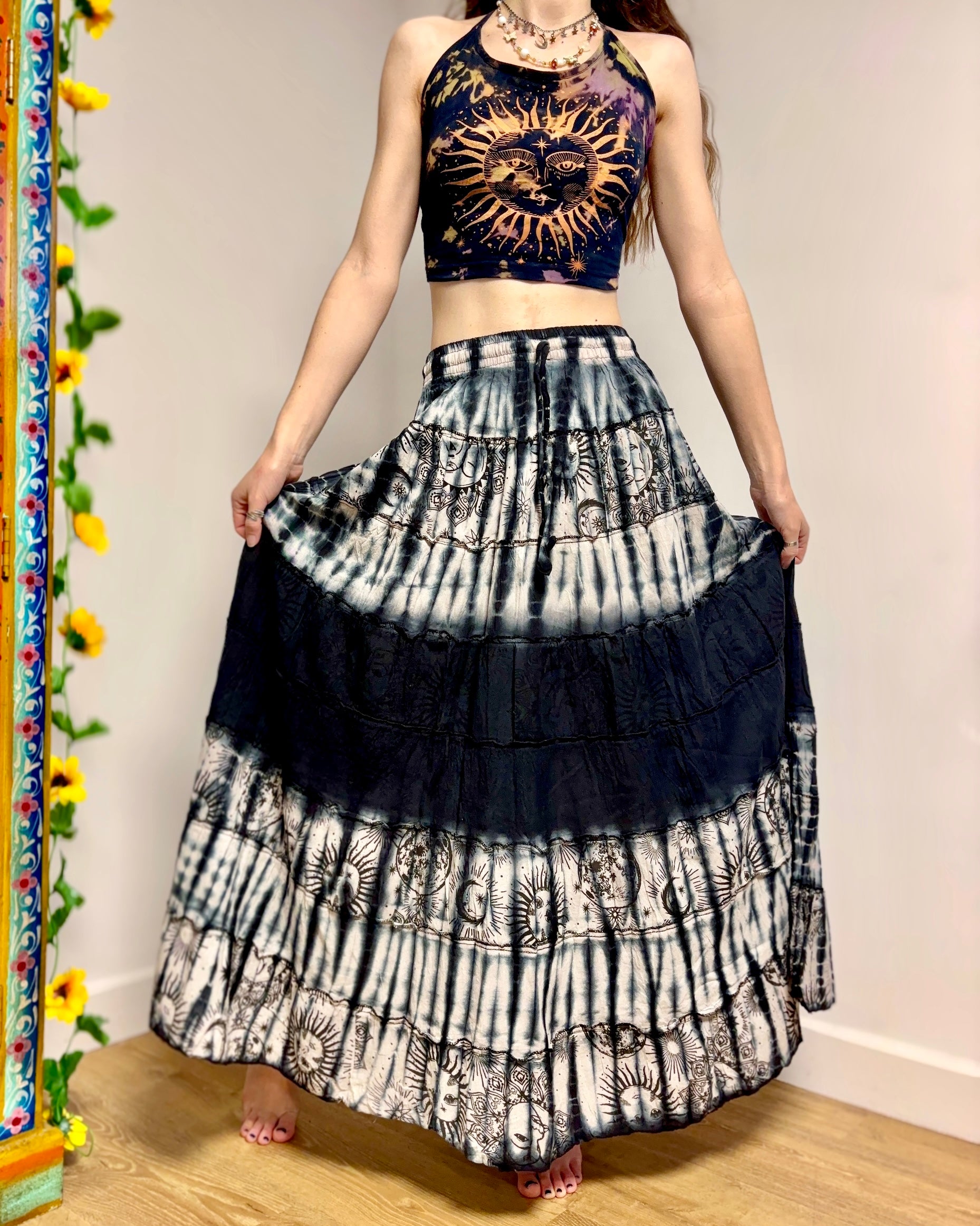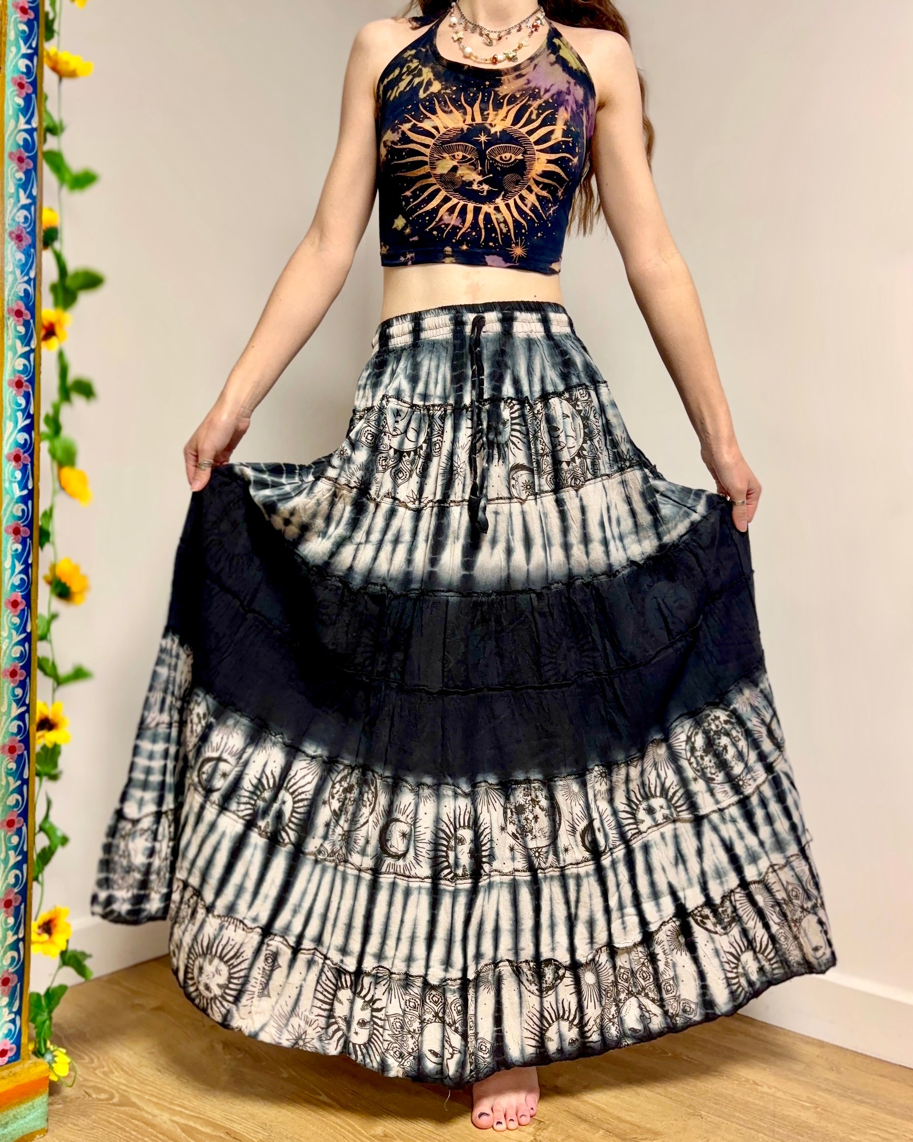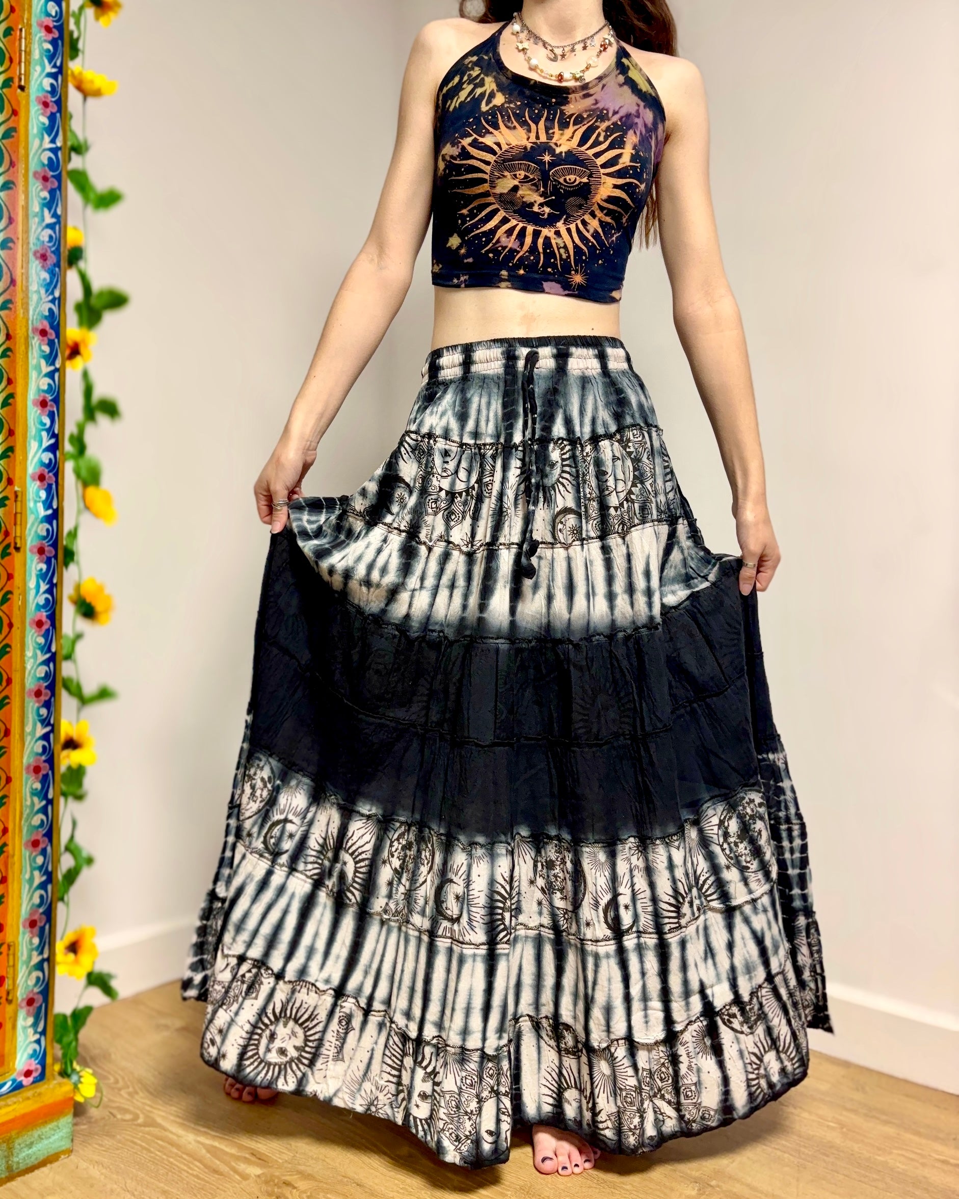 This beautiful celestial maxi skirt is made from black tie-dyed fabric decorated with suns, moons and stars. It has an elastic waist for a comfortable fit.