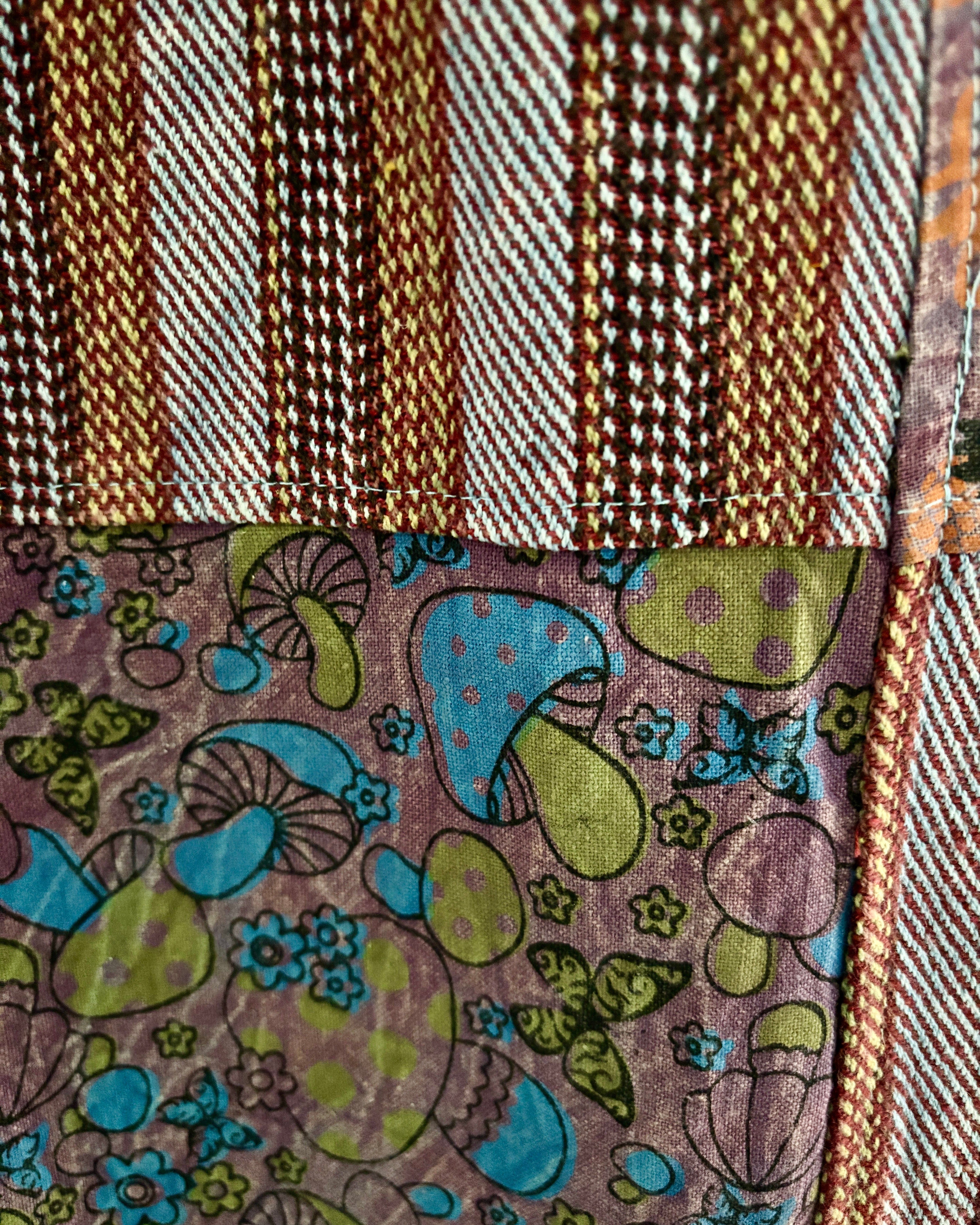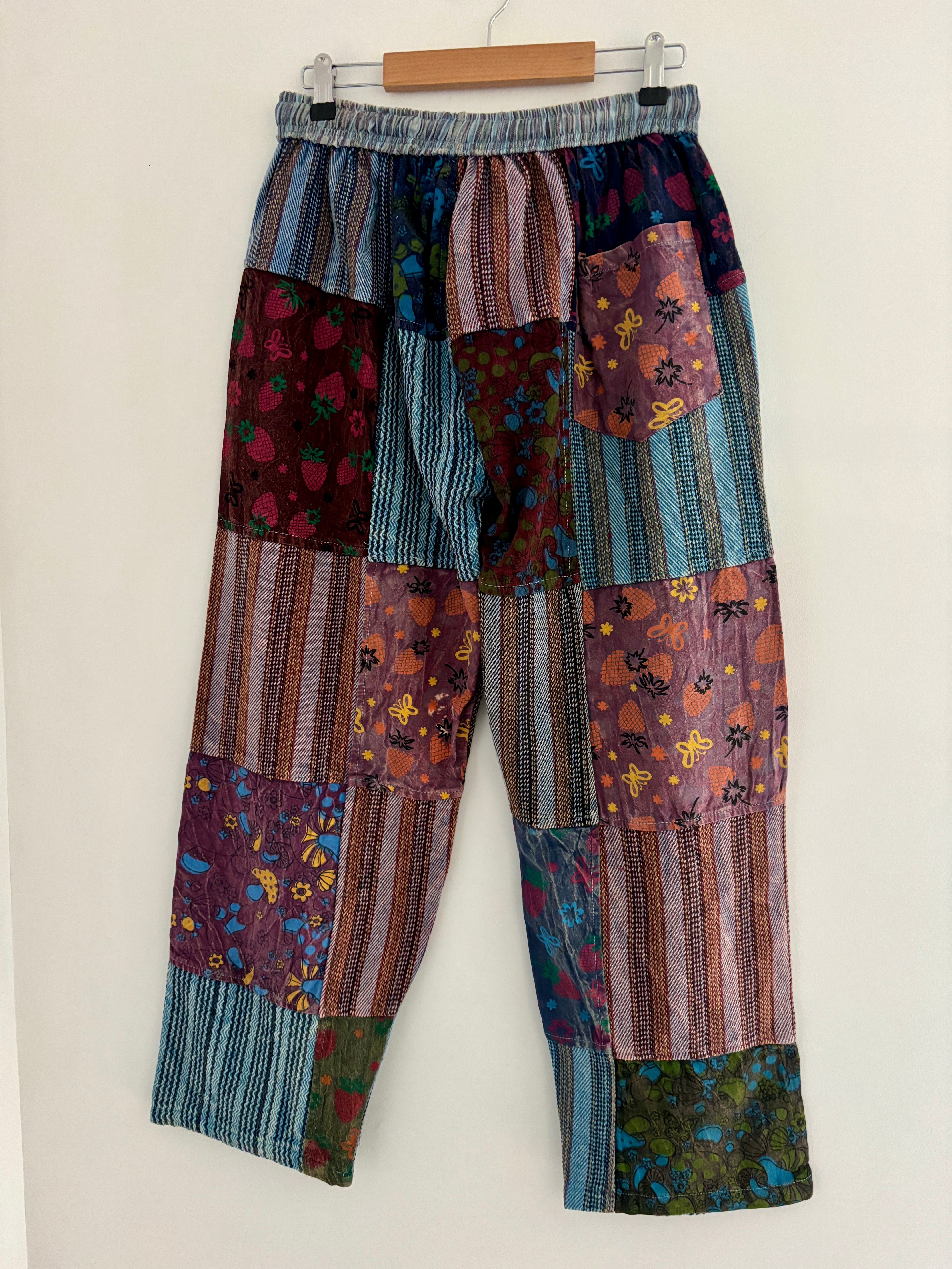 These trousers are made from purple coloured fabric featuring strawberry and mushroom patches. They have an elasticated waist and 2 side pockets.