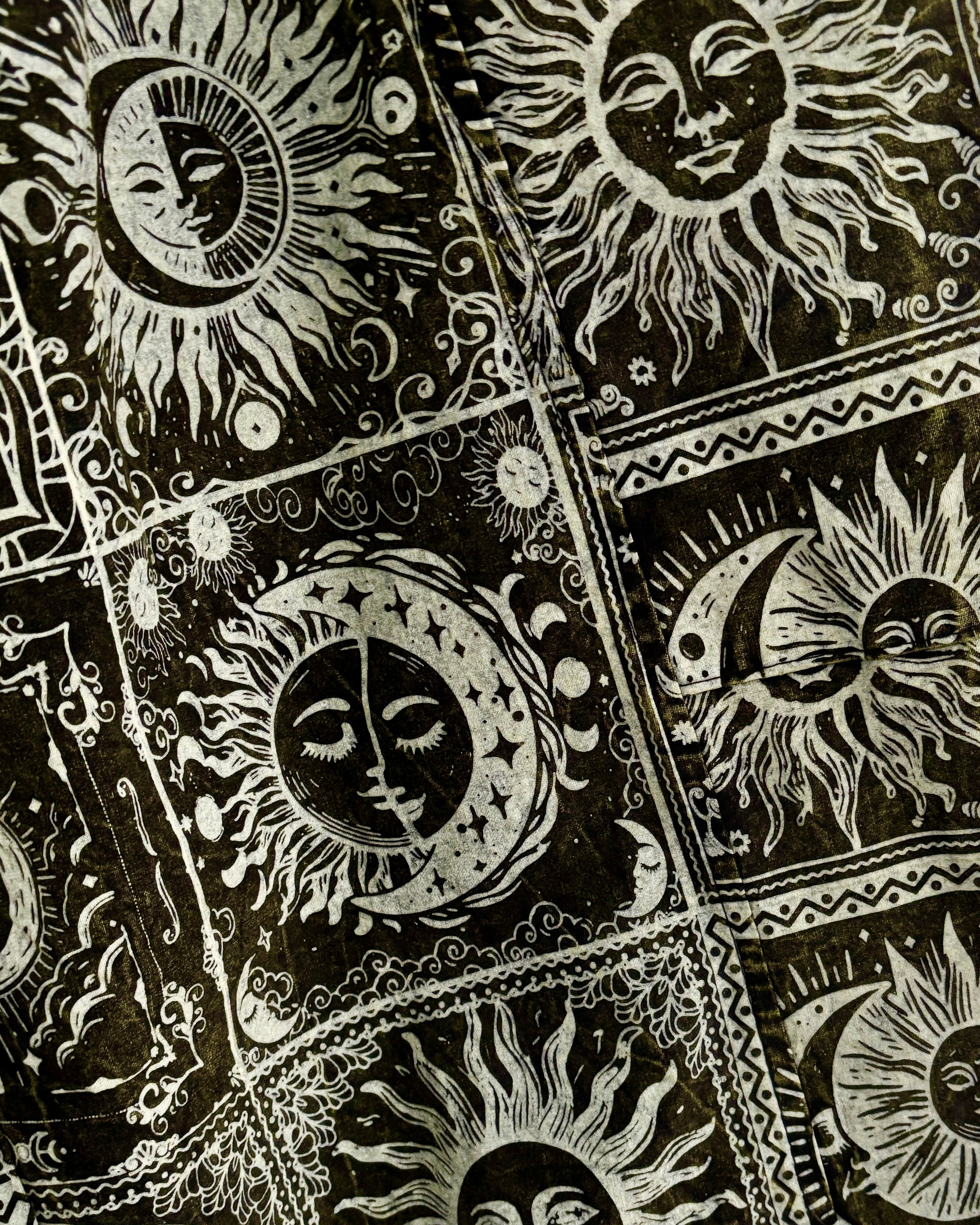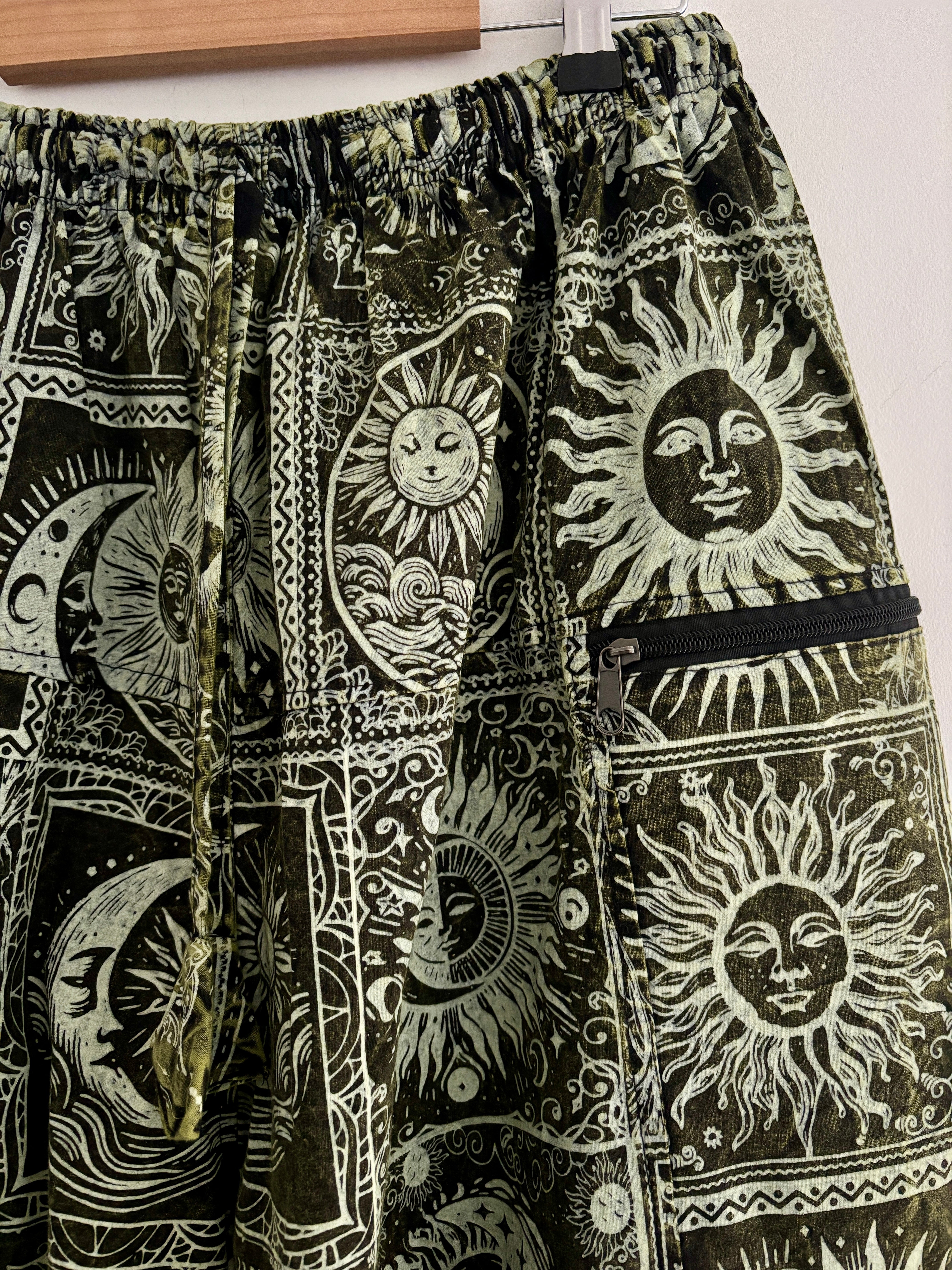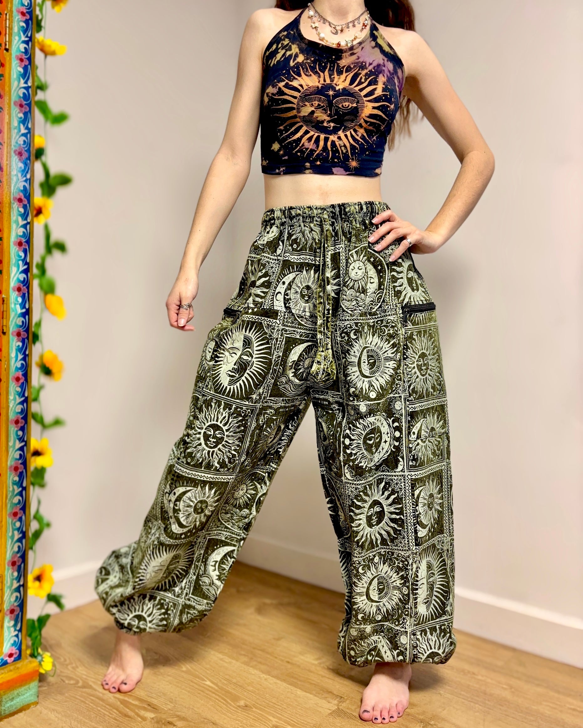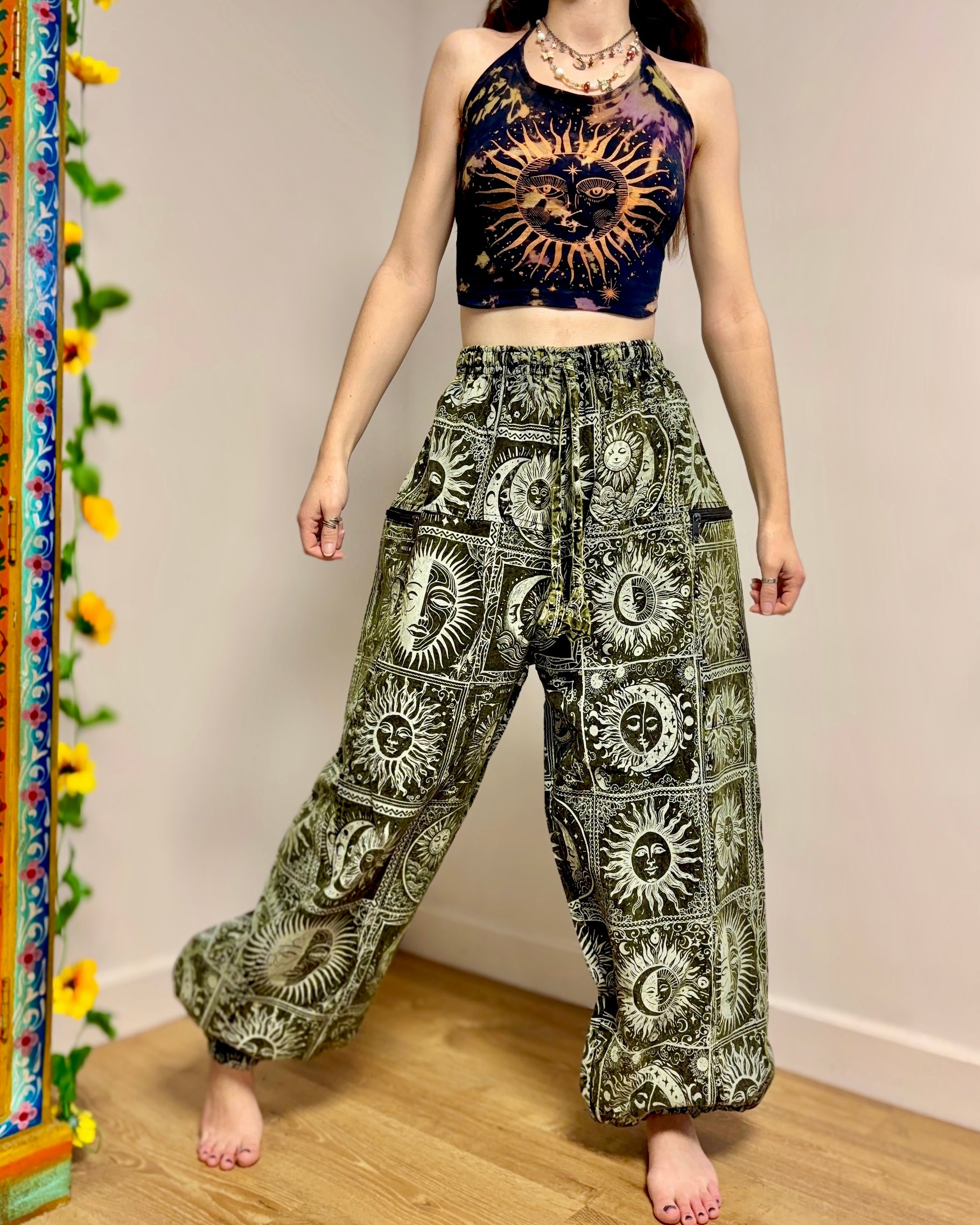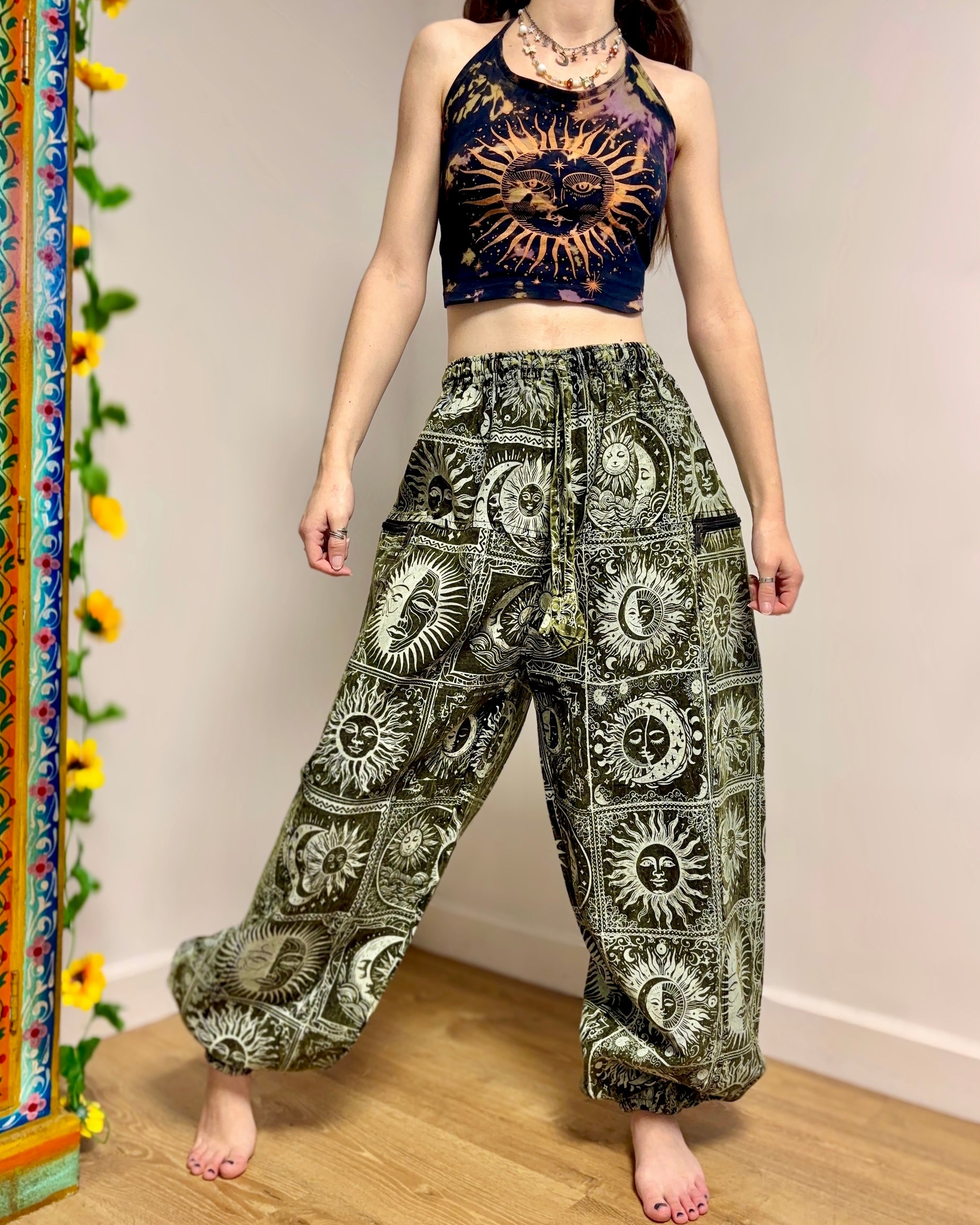 These magical palazzo harems are made from celestial fabric, decorated with moons, suns and stars. They have an elasticated waist and two zipped front pockets.