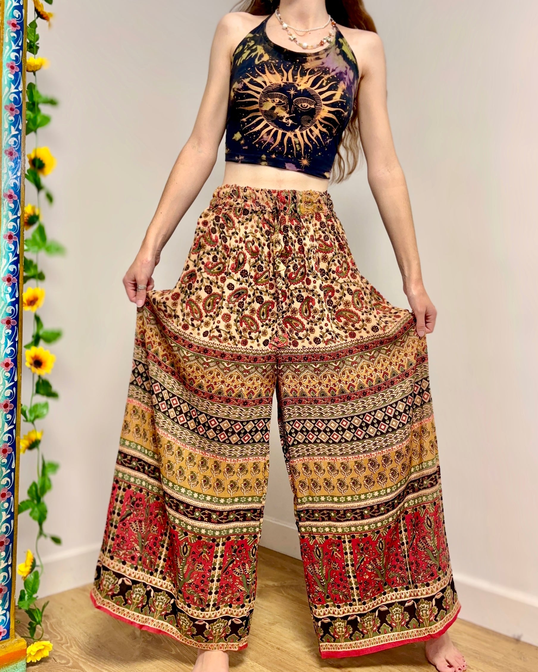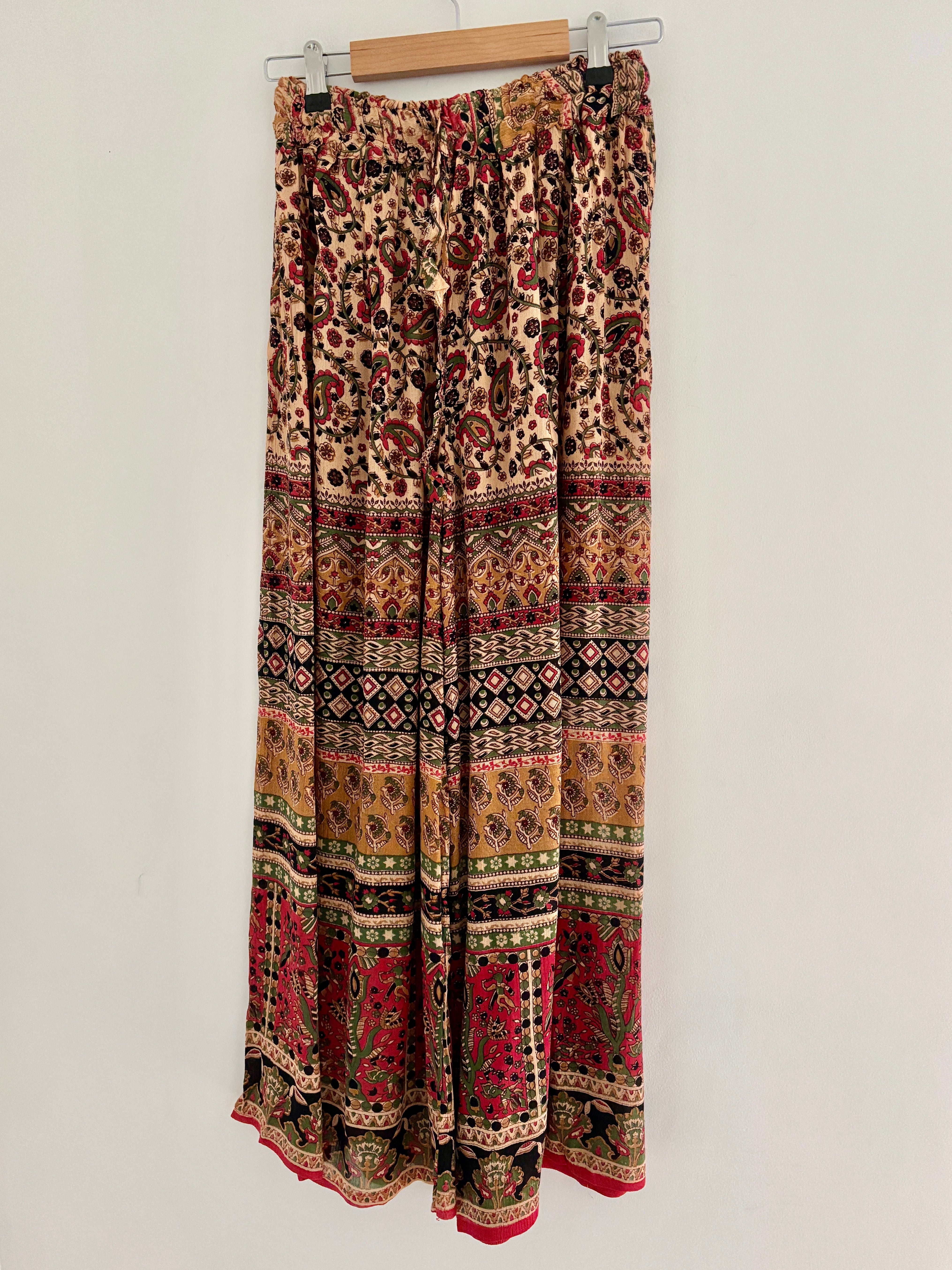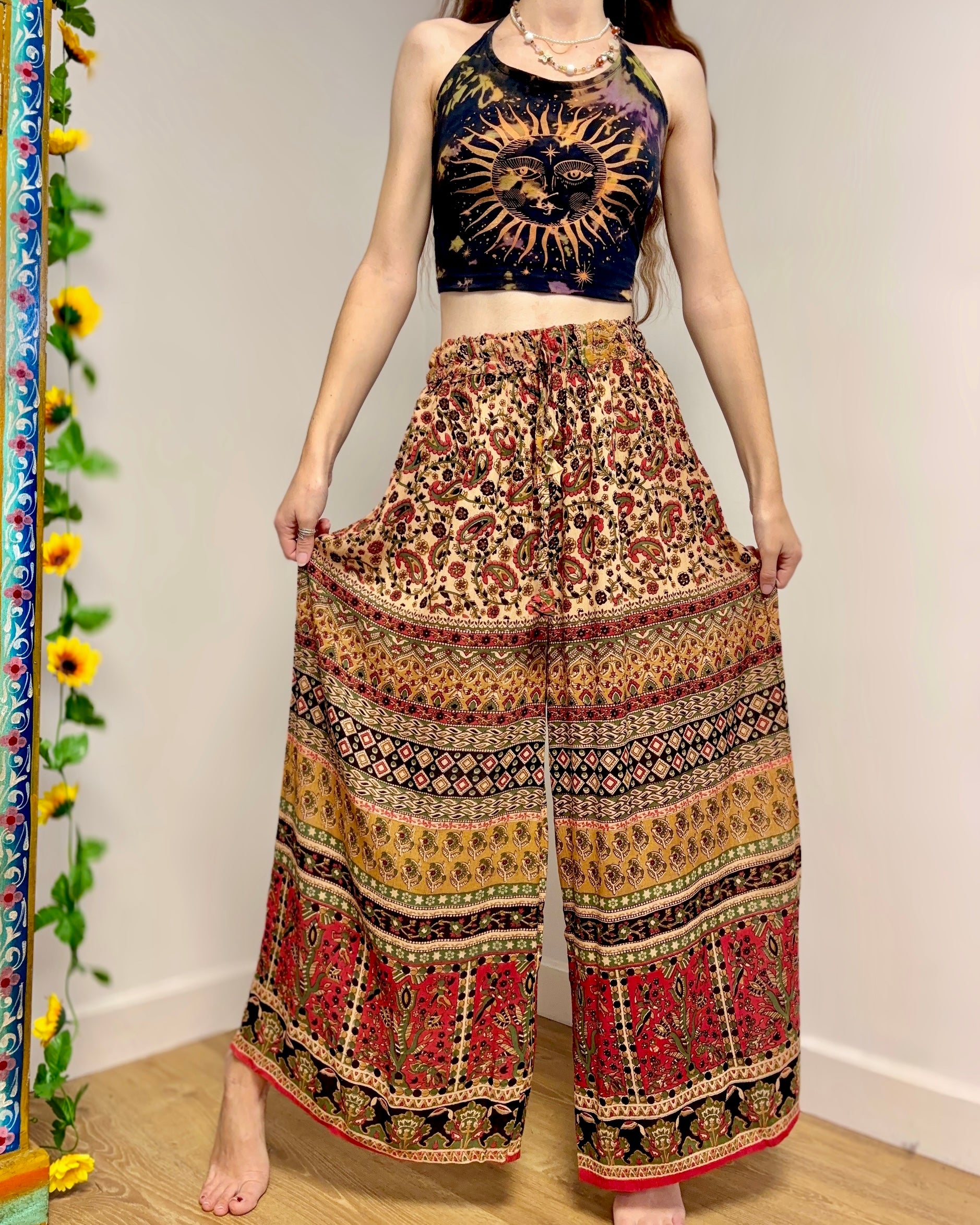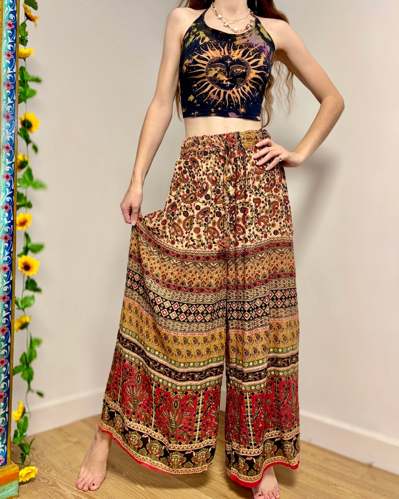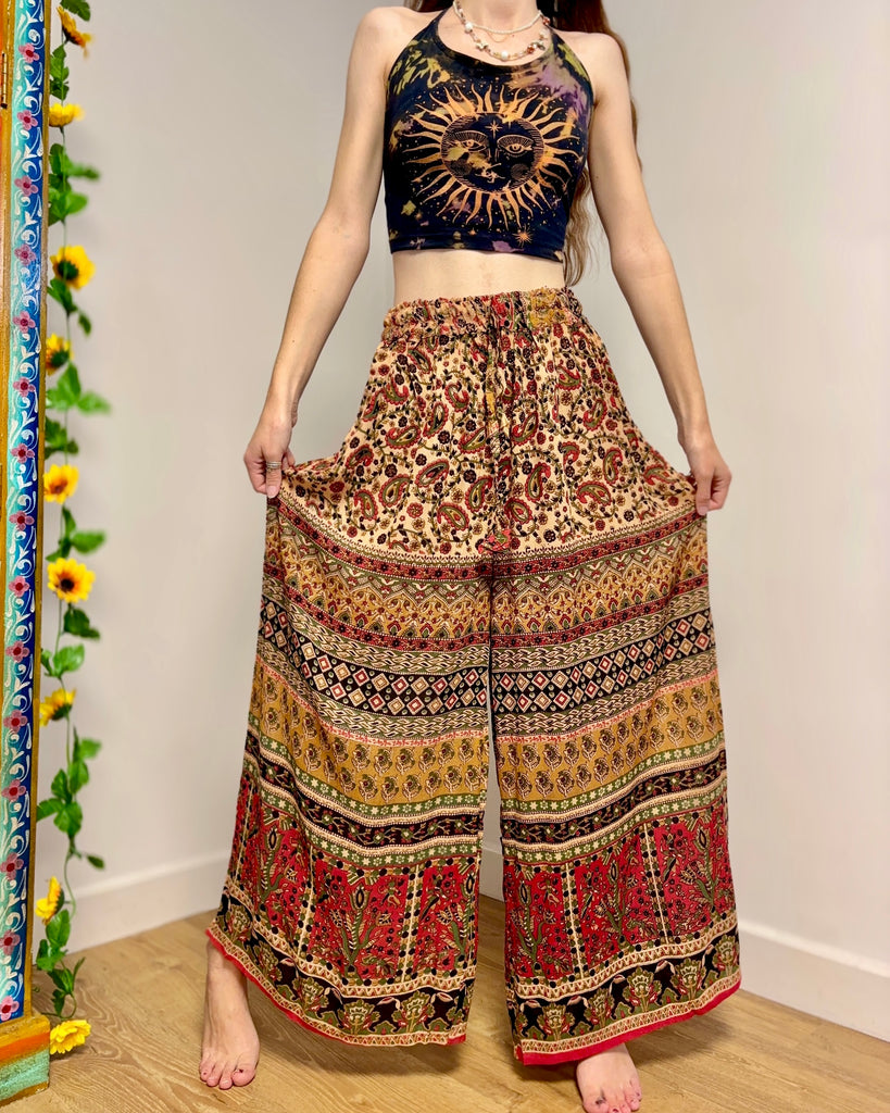 These beautiful palazzo trousers are made from earthy Indian fabric, with an elasticated waist and flared bottoms, they provide a loose comfortable fit, in warm autumn colours.