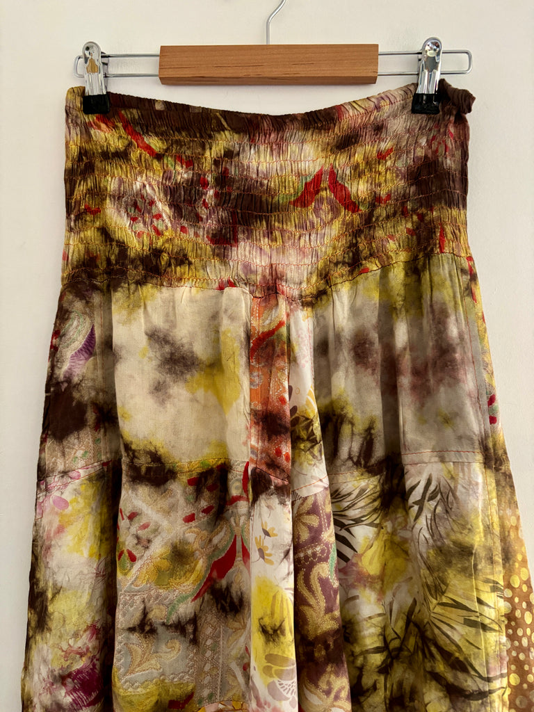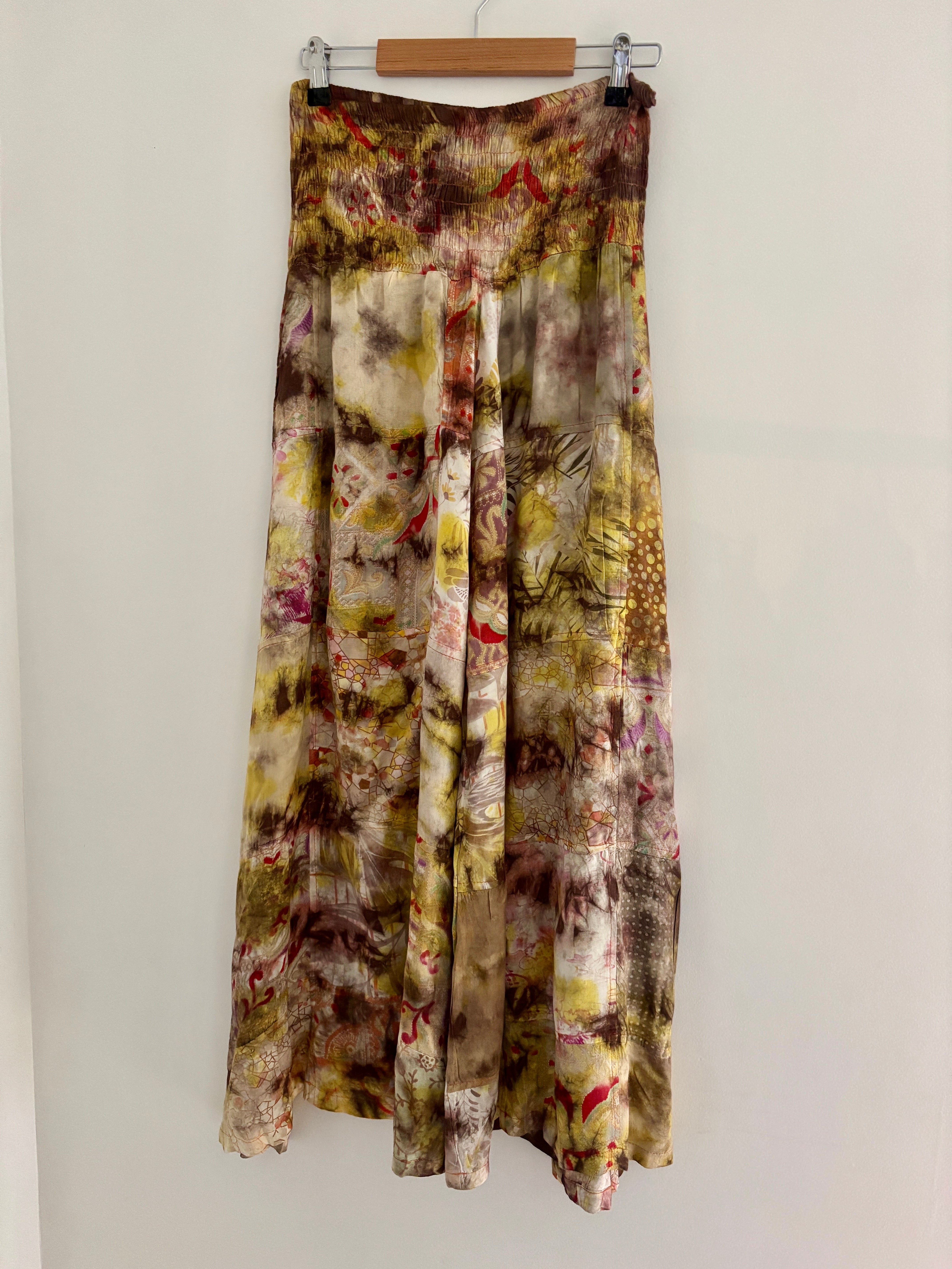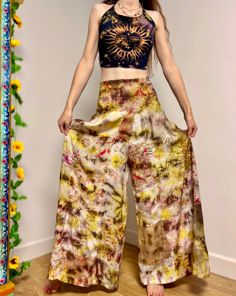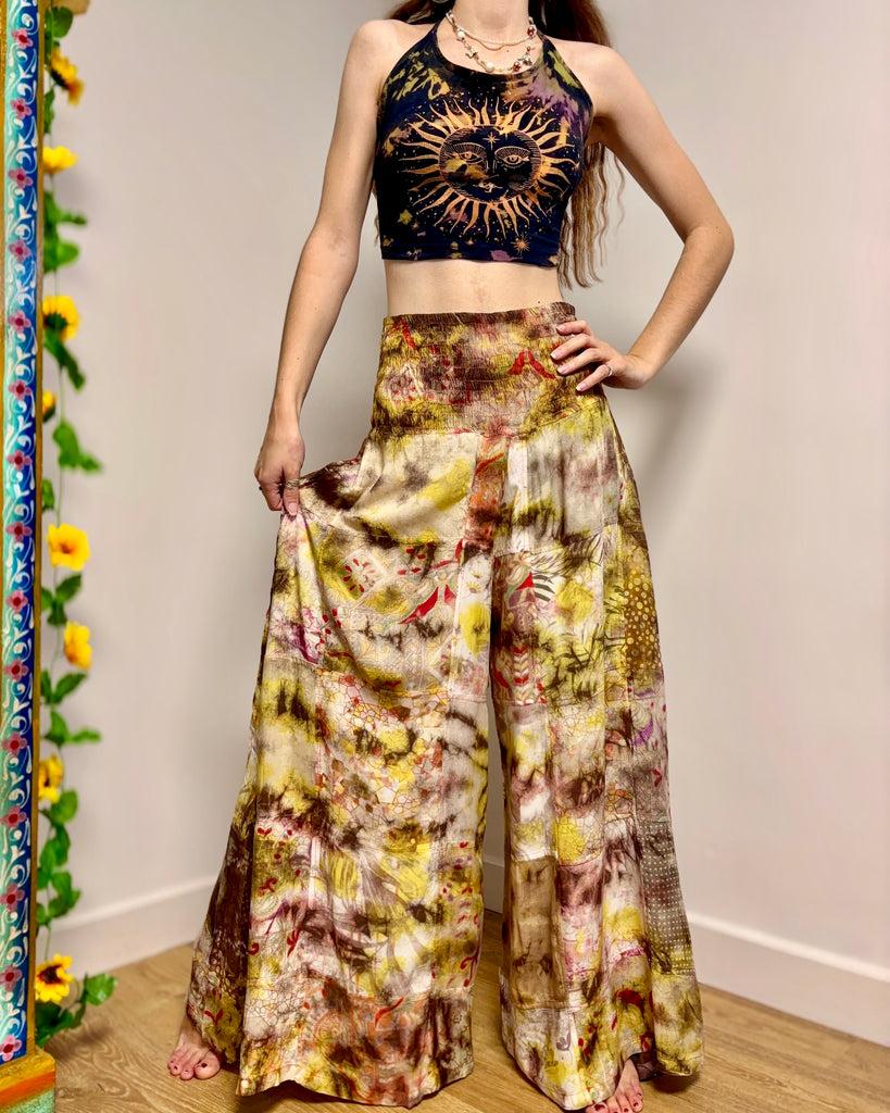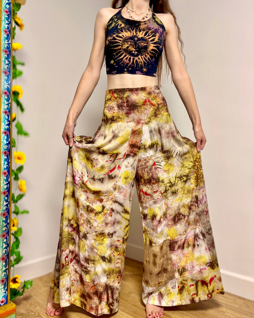 These beautiful palazzo trousers are made from patches of earthy brown fabric made in a variety of designs including magical leaves giving them an autumn look. With an elasticated waist and wide flared bottoms, they provide a loose comfortable fit.