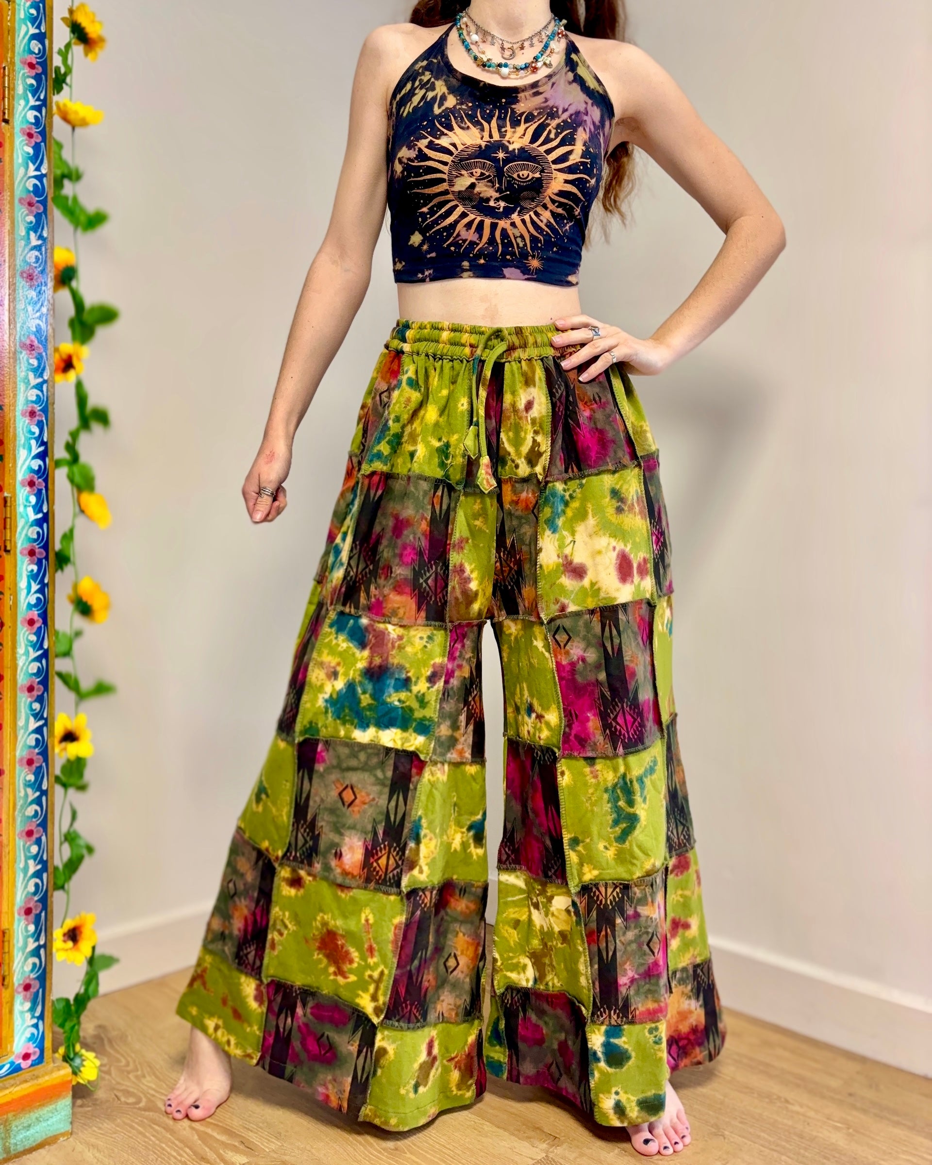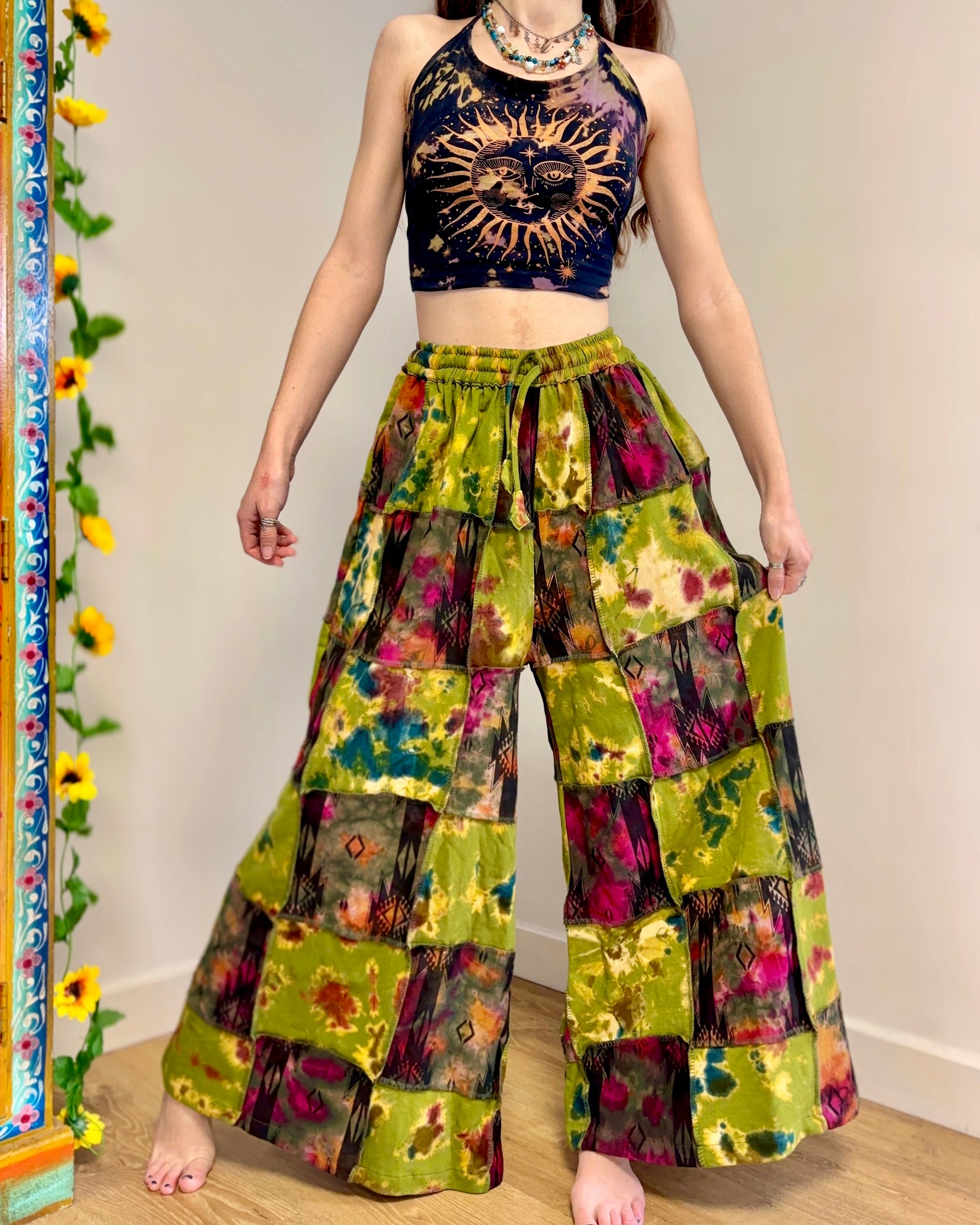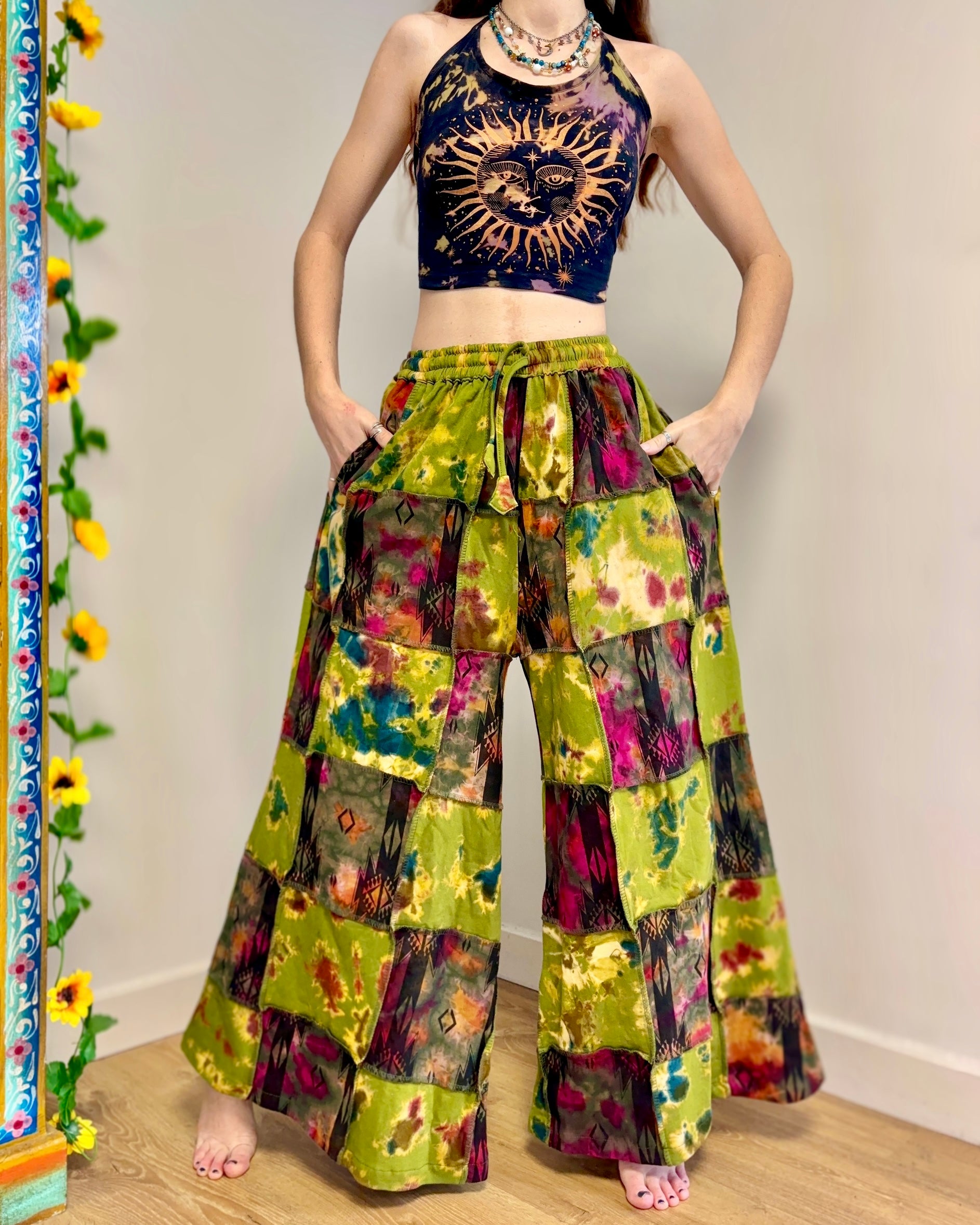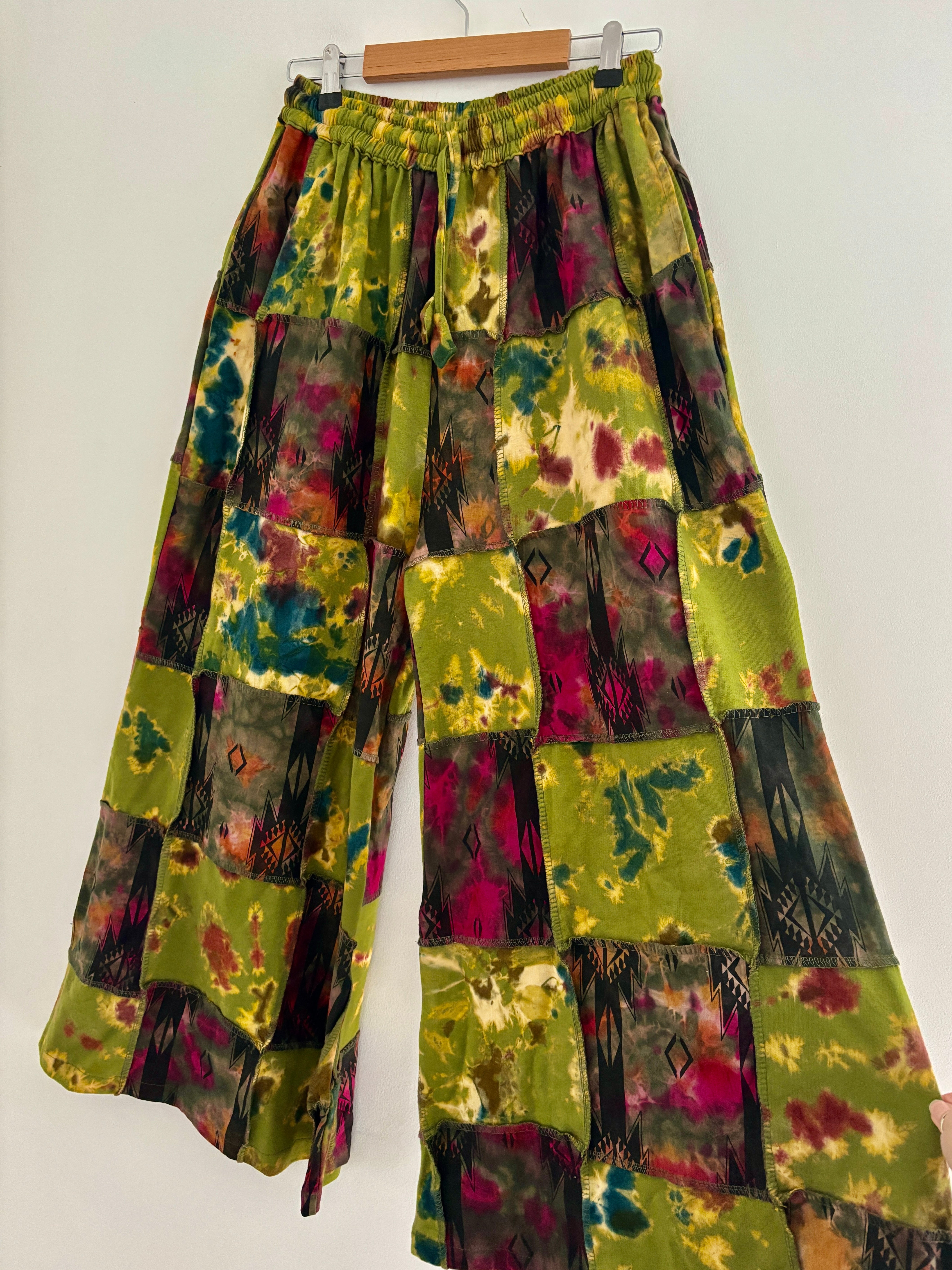 These new flared pants are made from patches of tie-dyed fabric in green and pink colours. They have an elasticated waist and two side pockets.