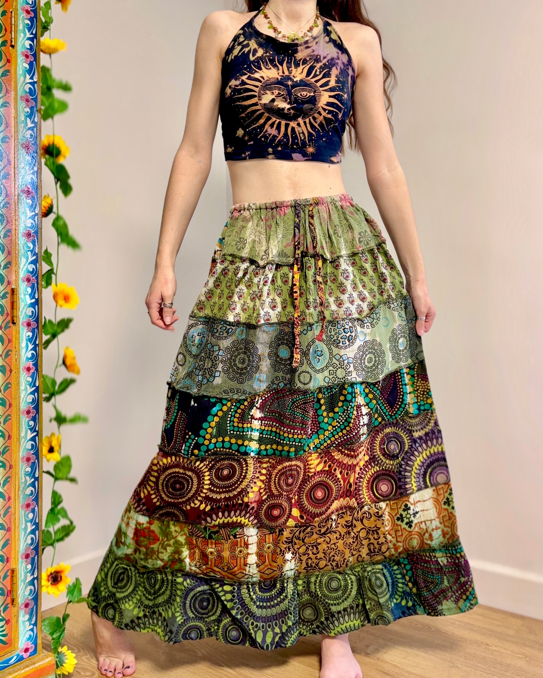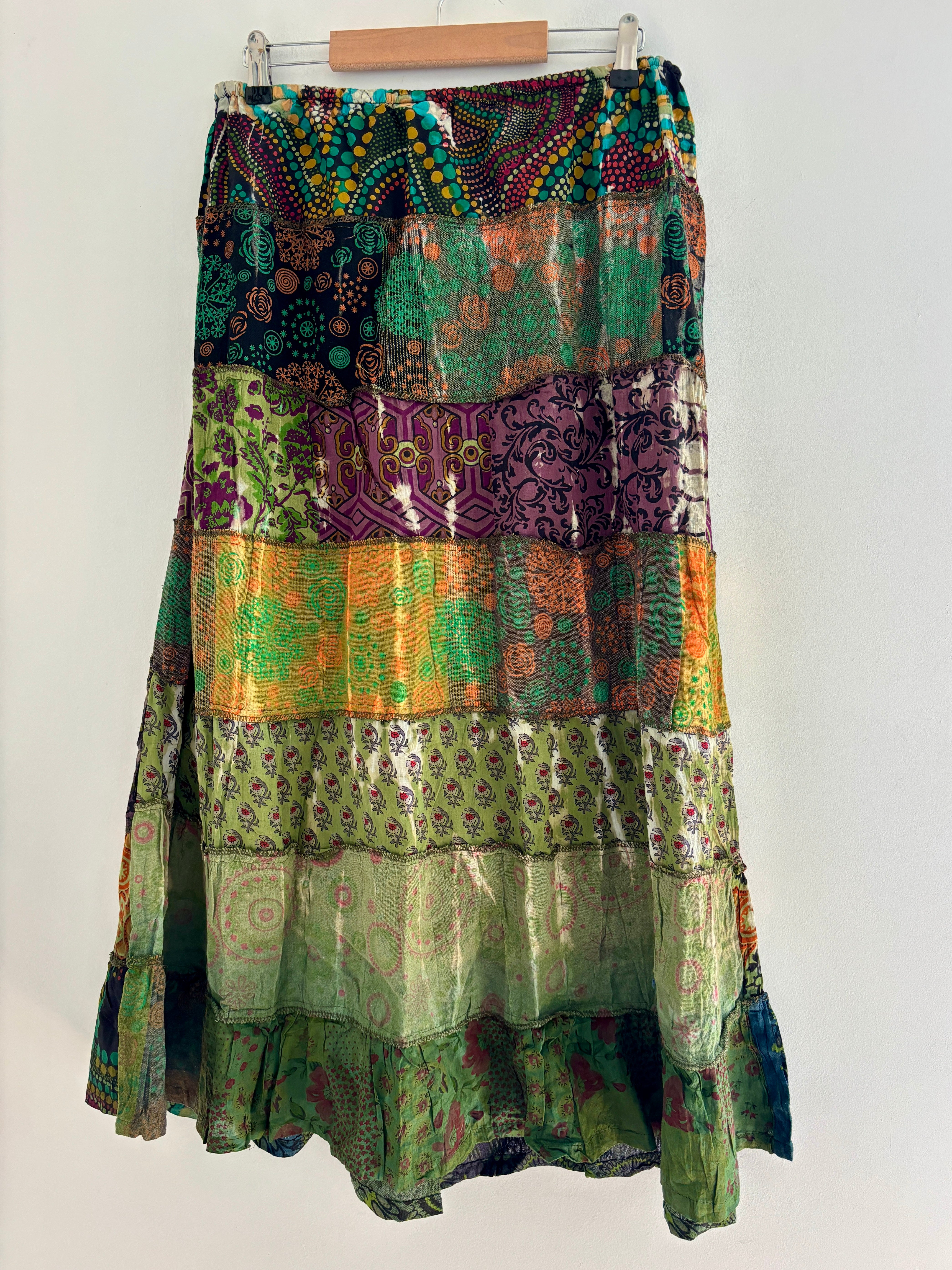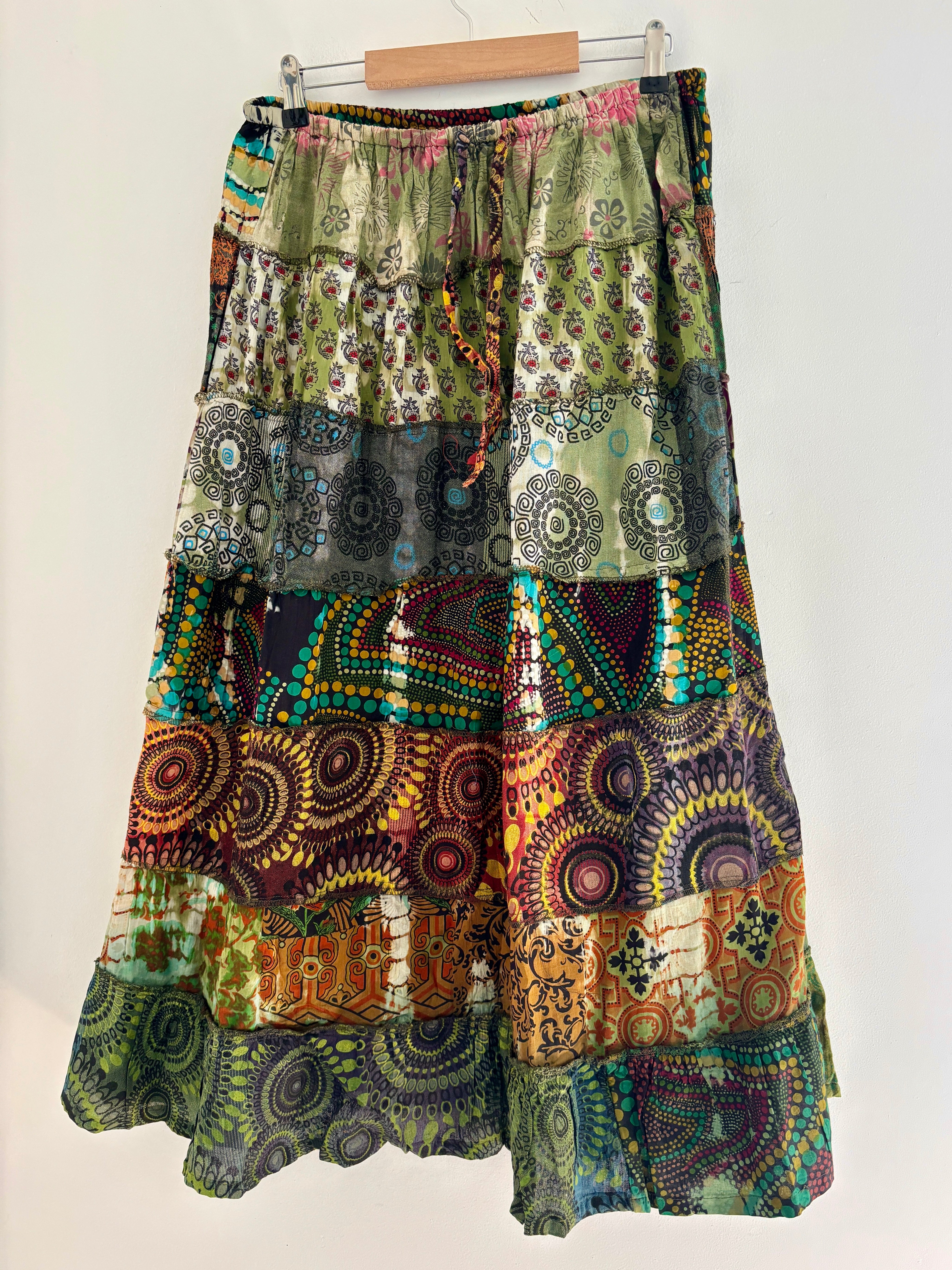 These beautiful skirts are made from patches of green earthy fabric made in a variety of designs and using different dye techniques.