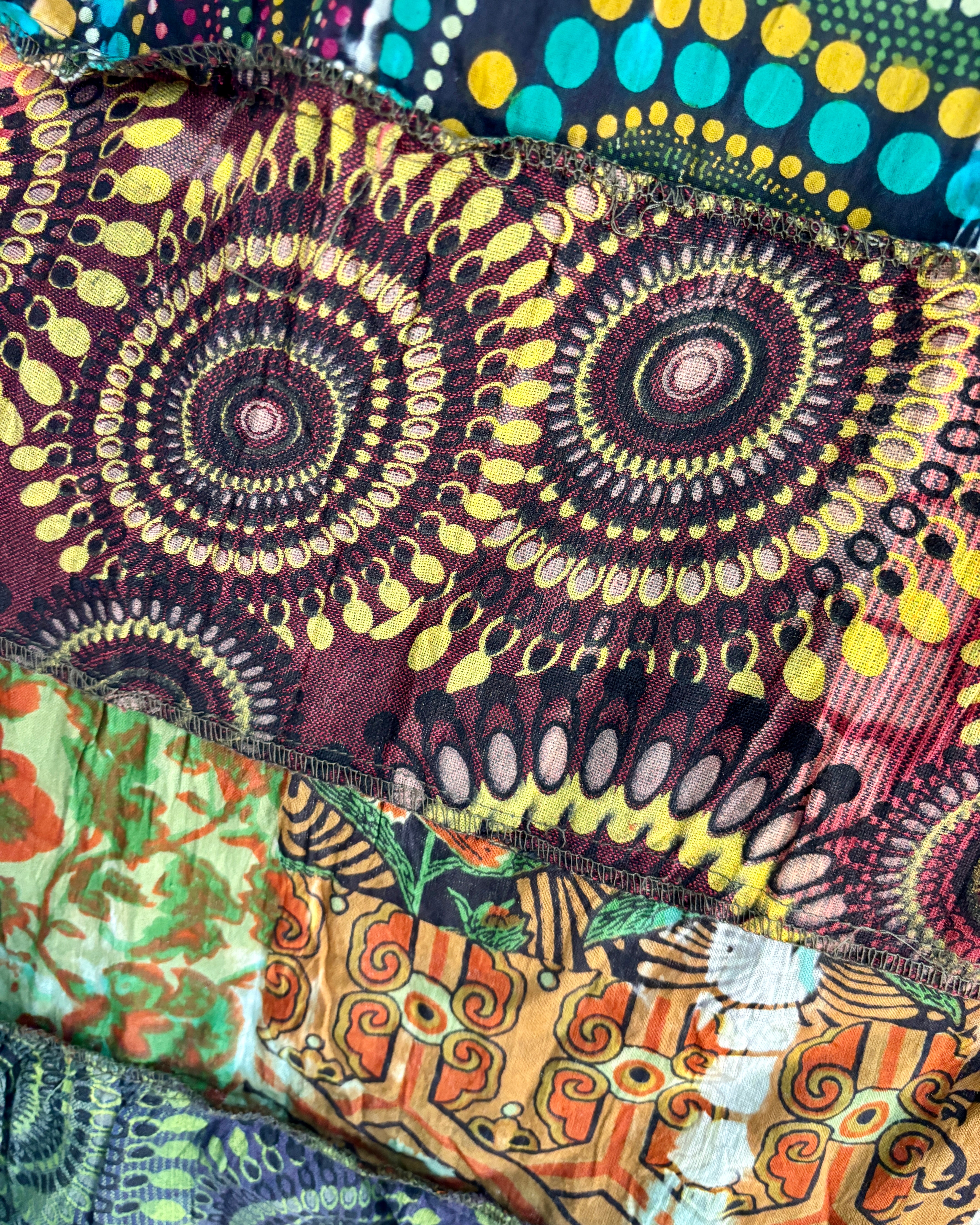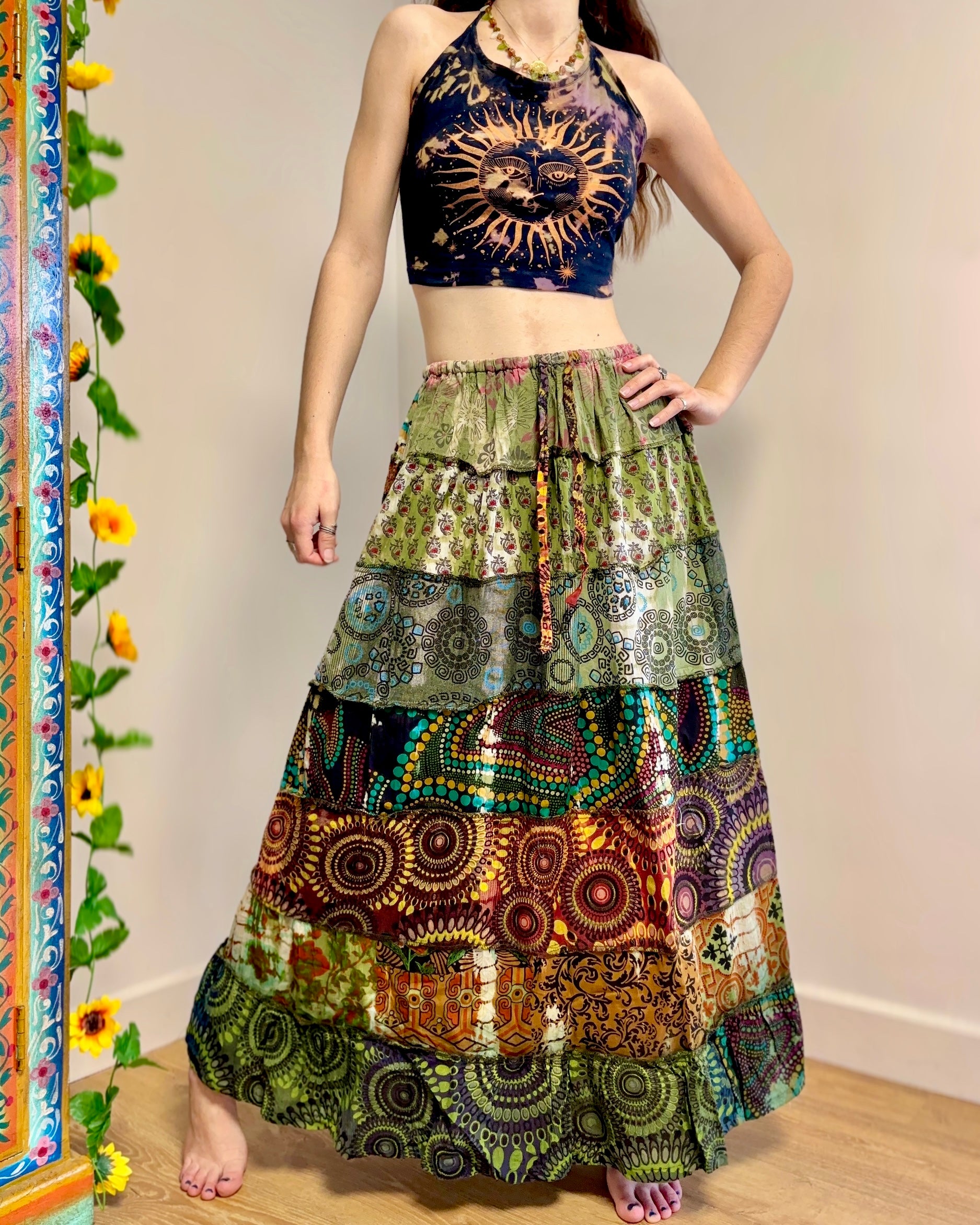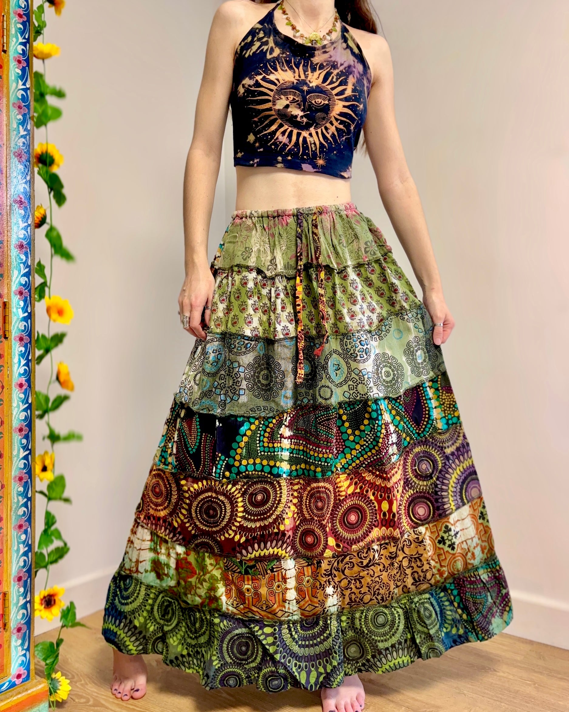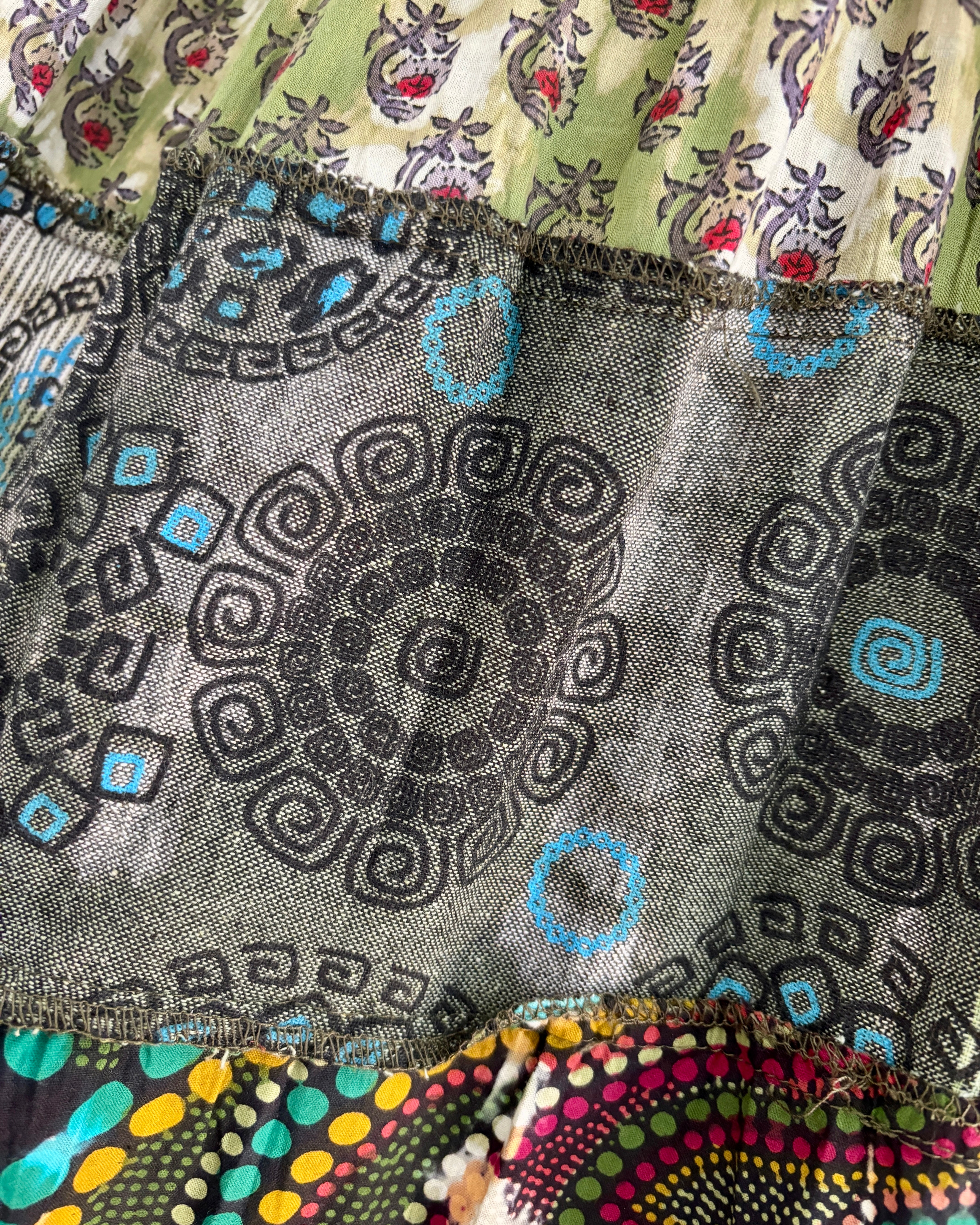 These beautiful skirts are made from patches of green earthy fabric made in a variety of designs and using different dye techniques.