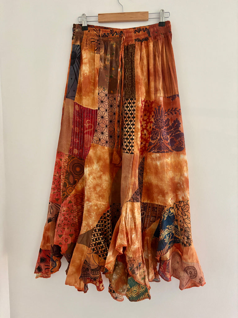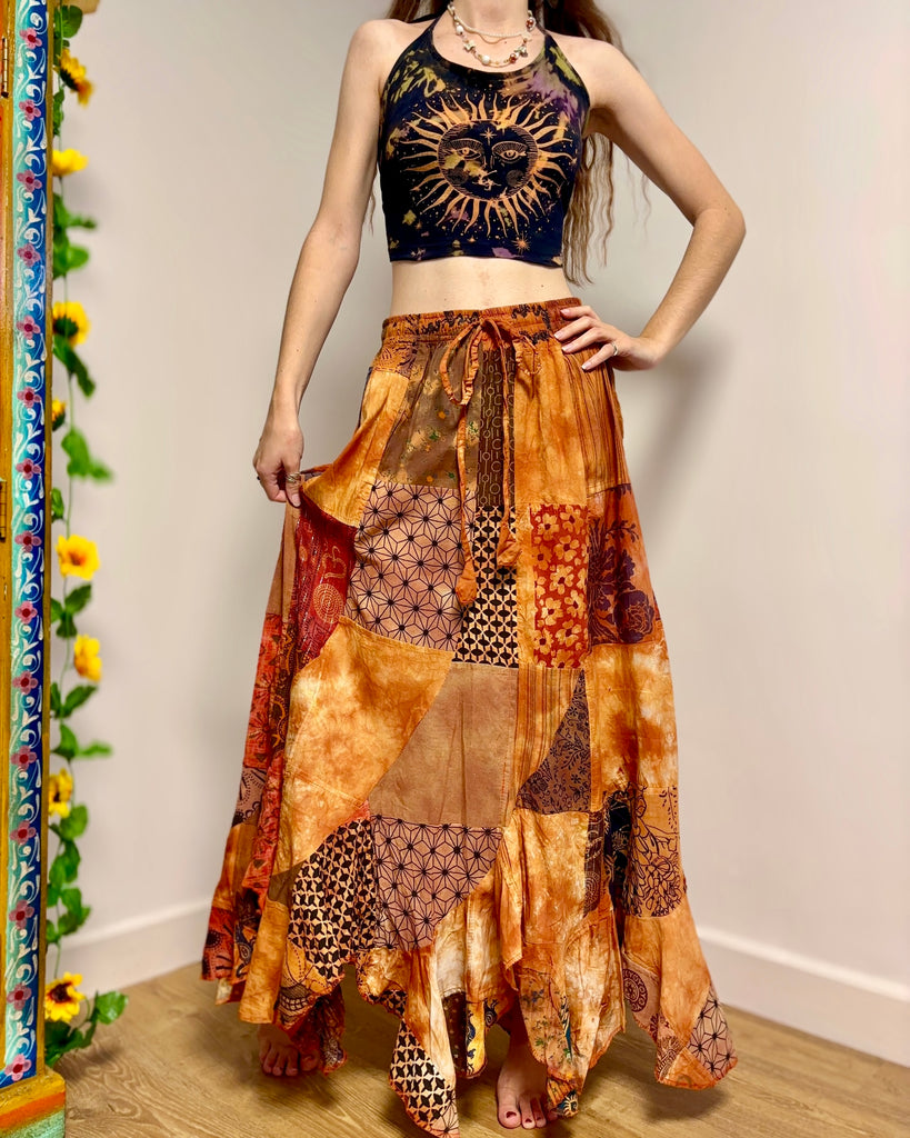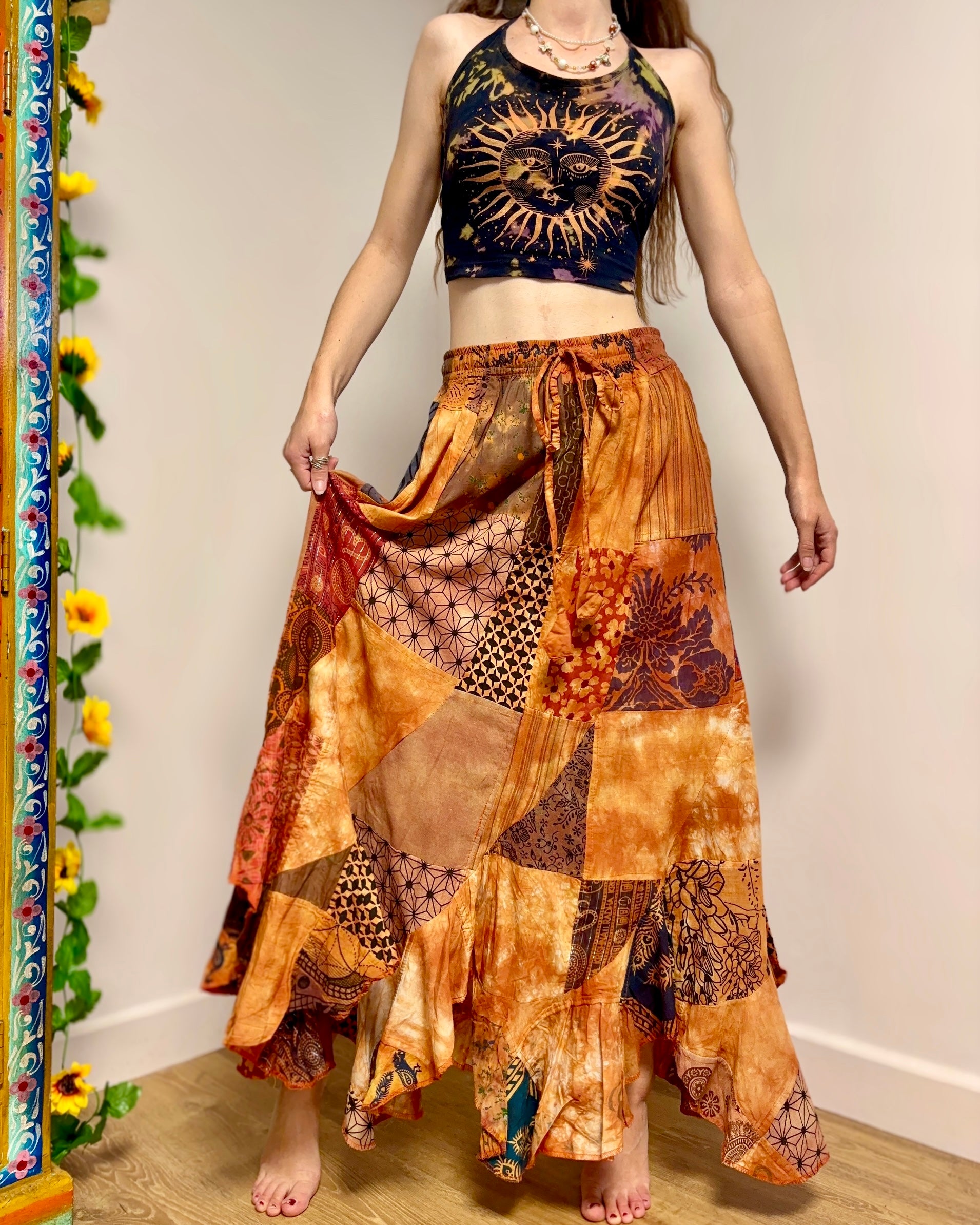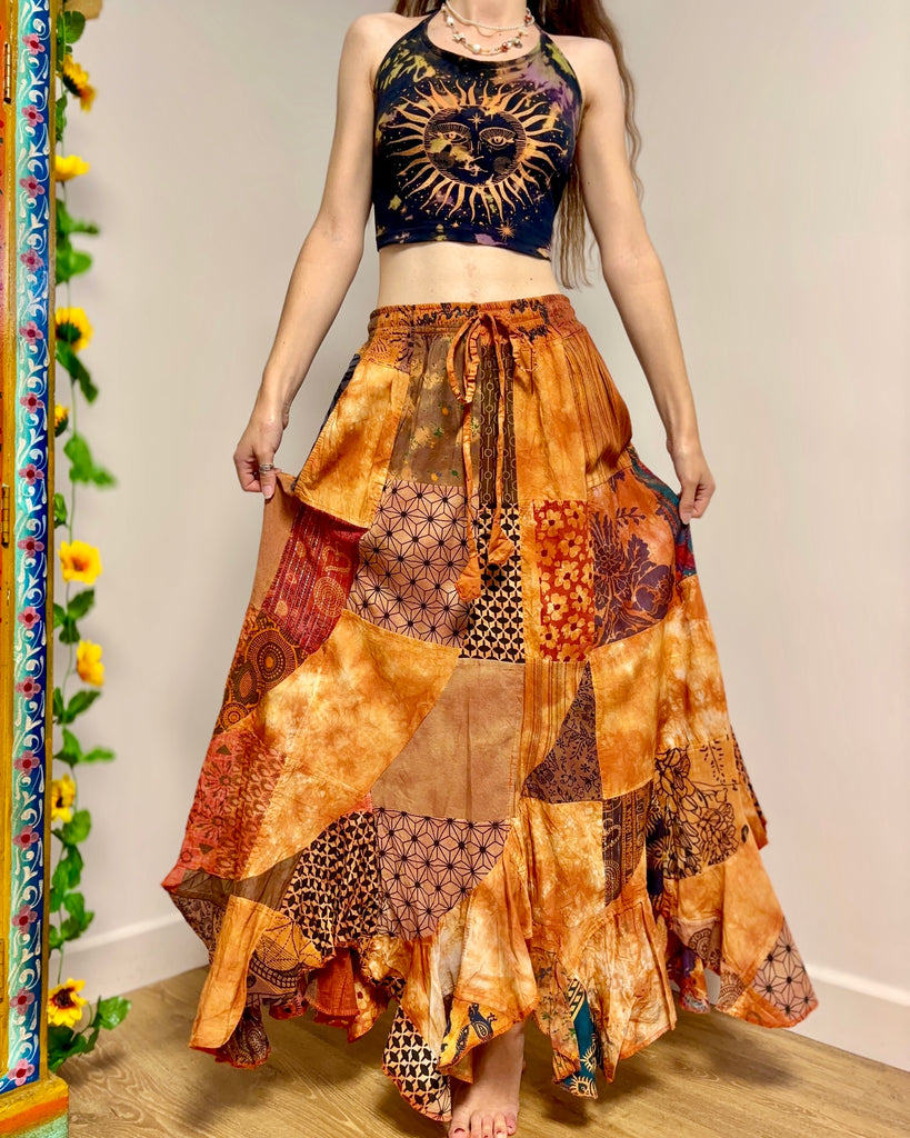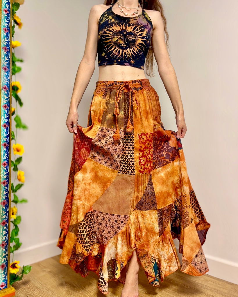 This beautiful tiered maxi skirt features patches of fabric in warm orange colours. It has an elastic drawstring waist for a comfortable fit.
