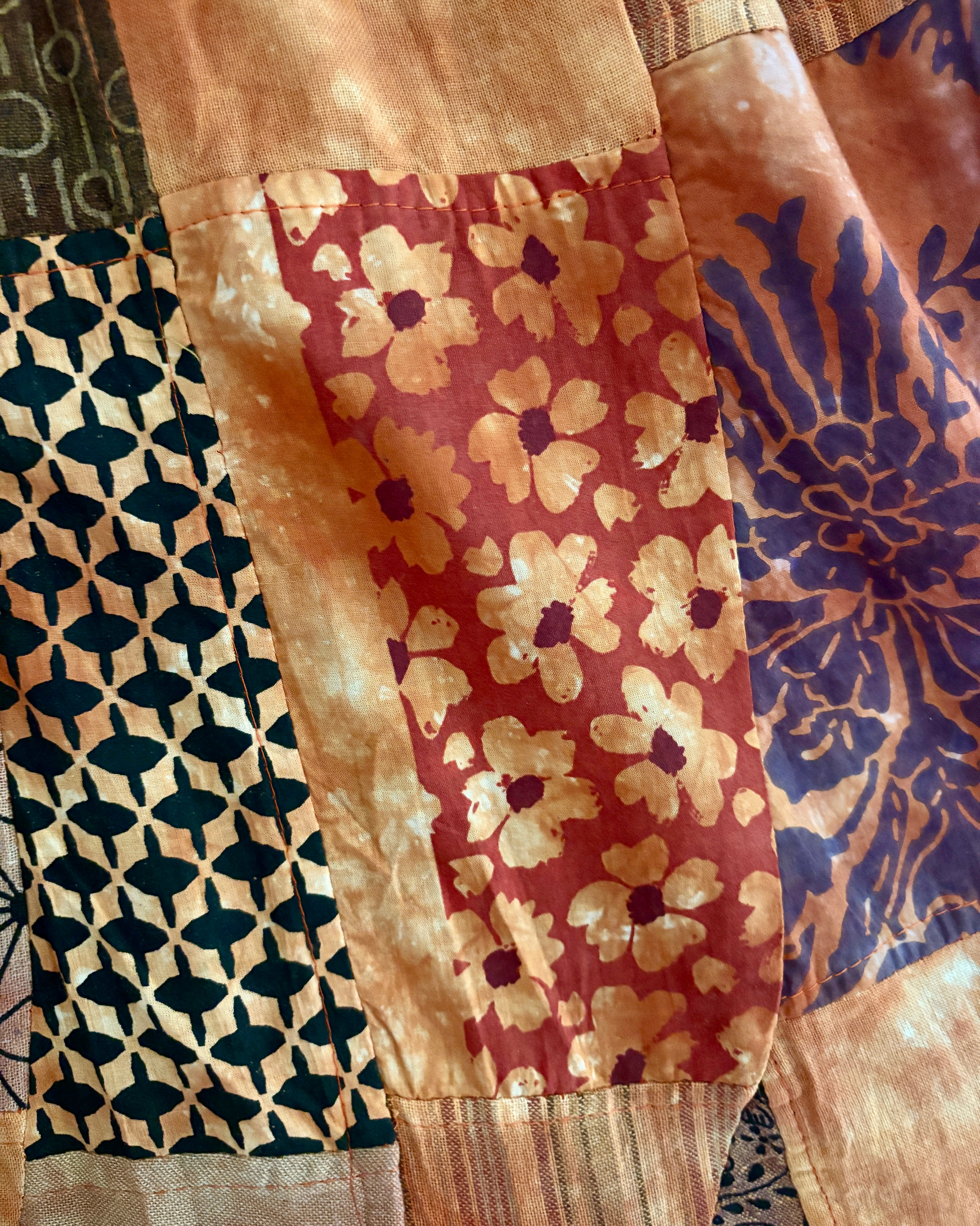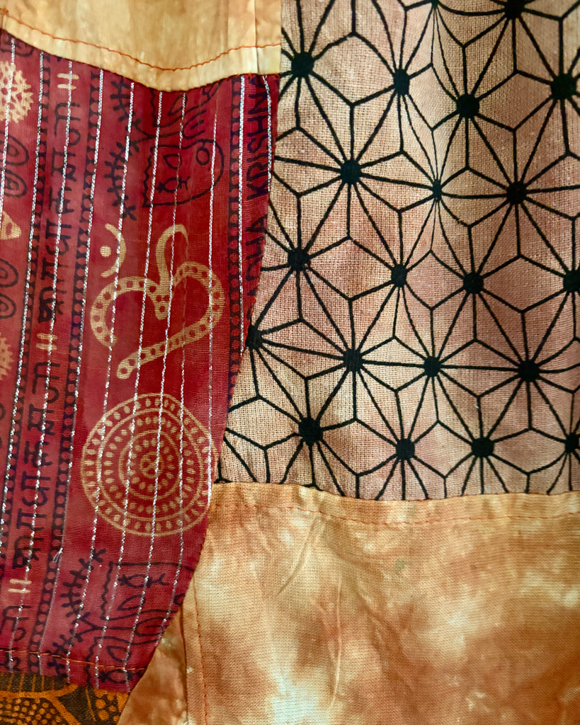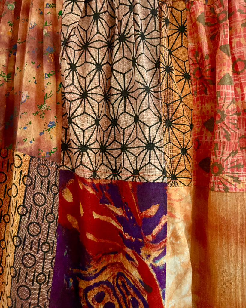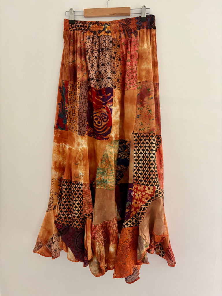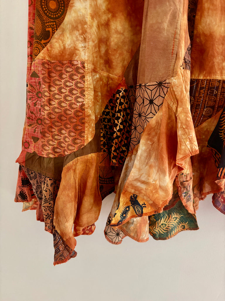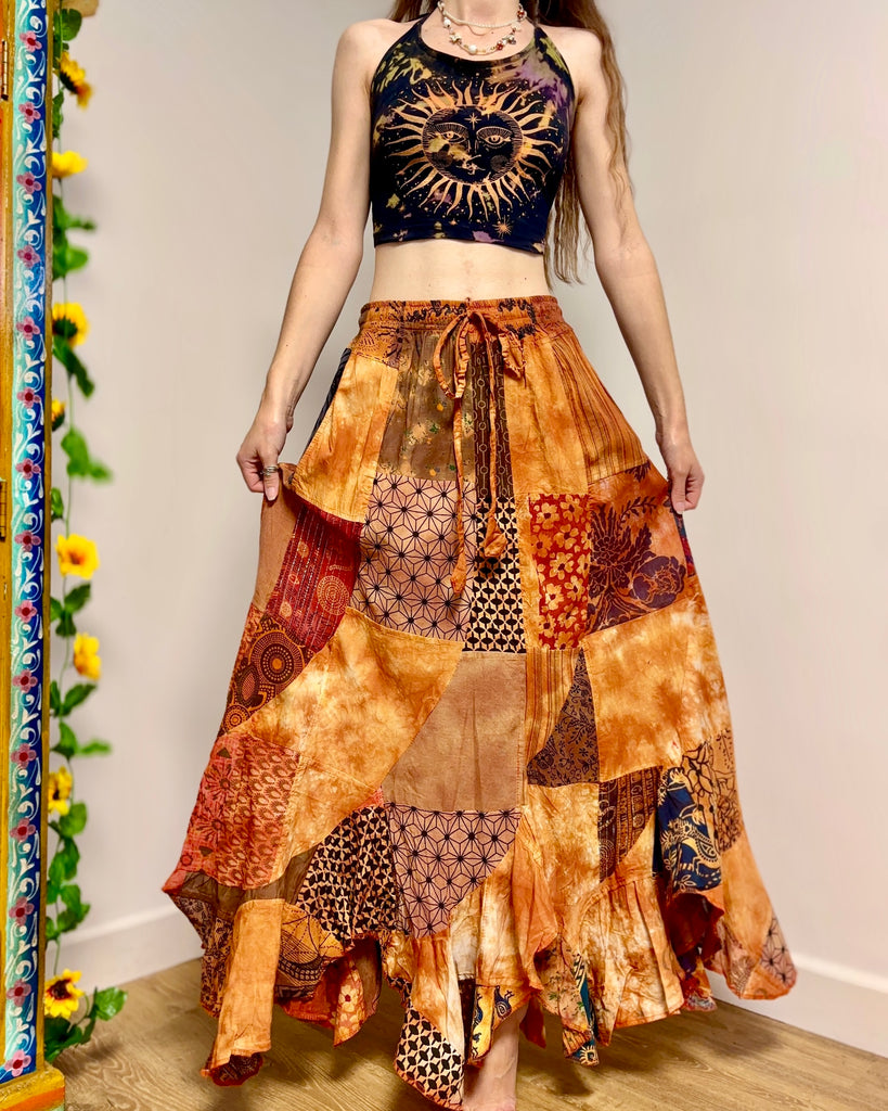 This beautiful tiered maxi skirt features patches of fabric in warm orange colours. It has an elastic drawstring waist for a comfortable fit.