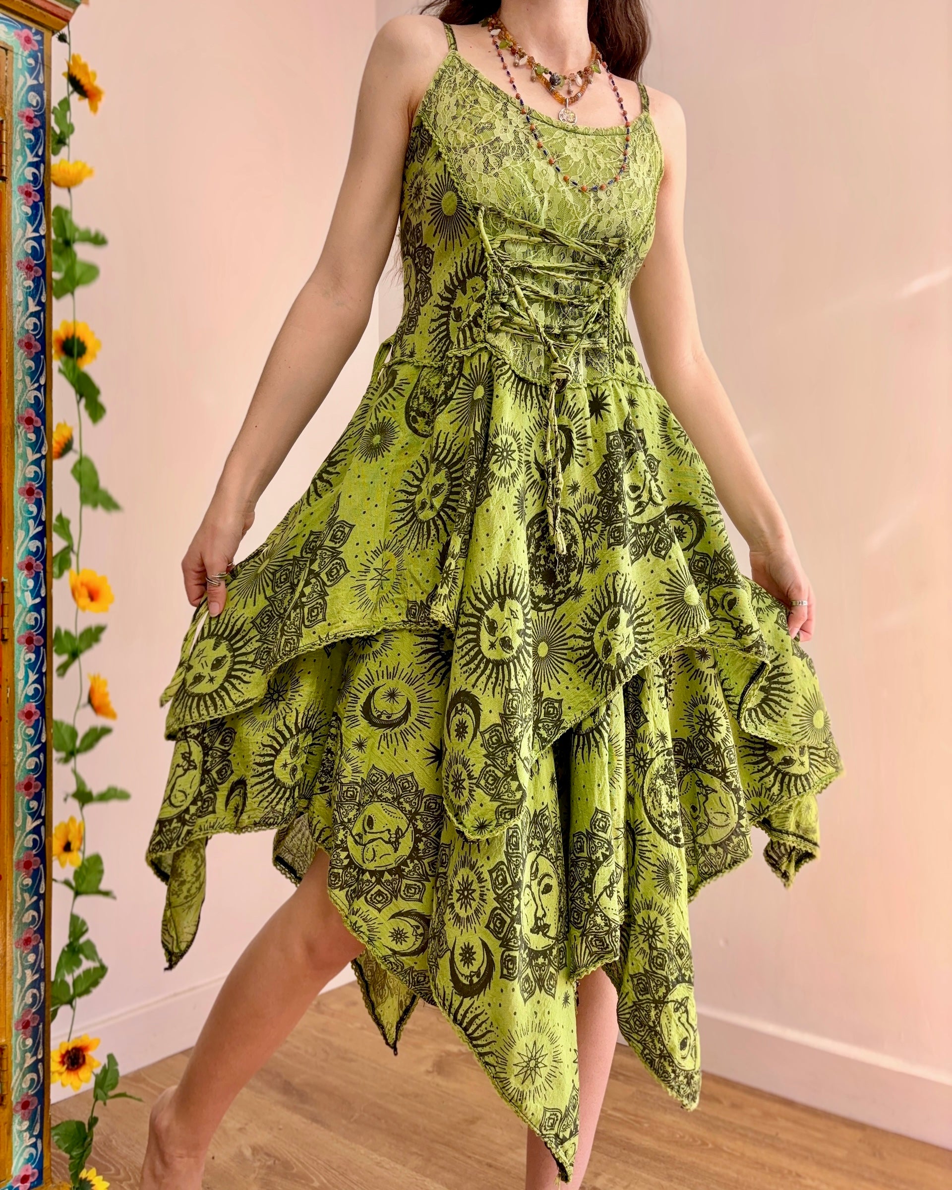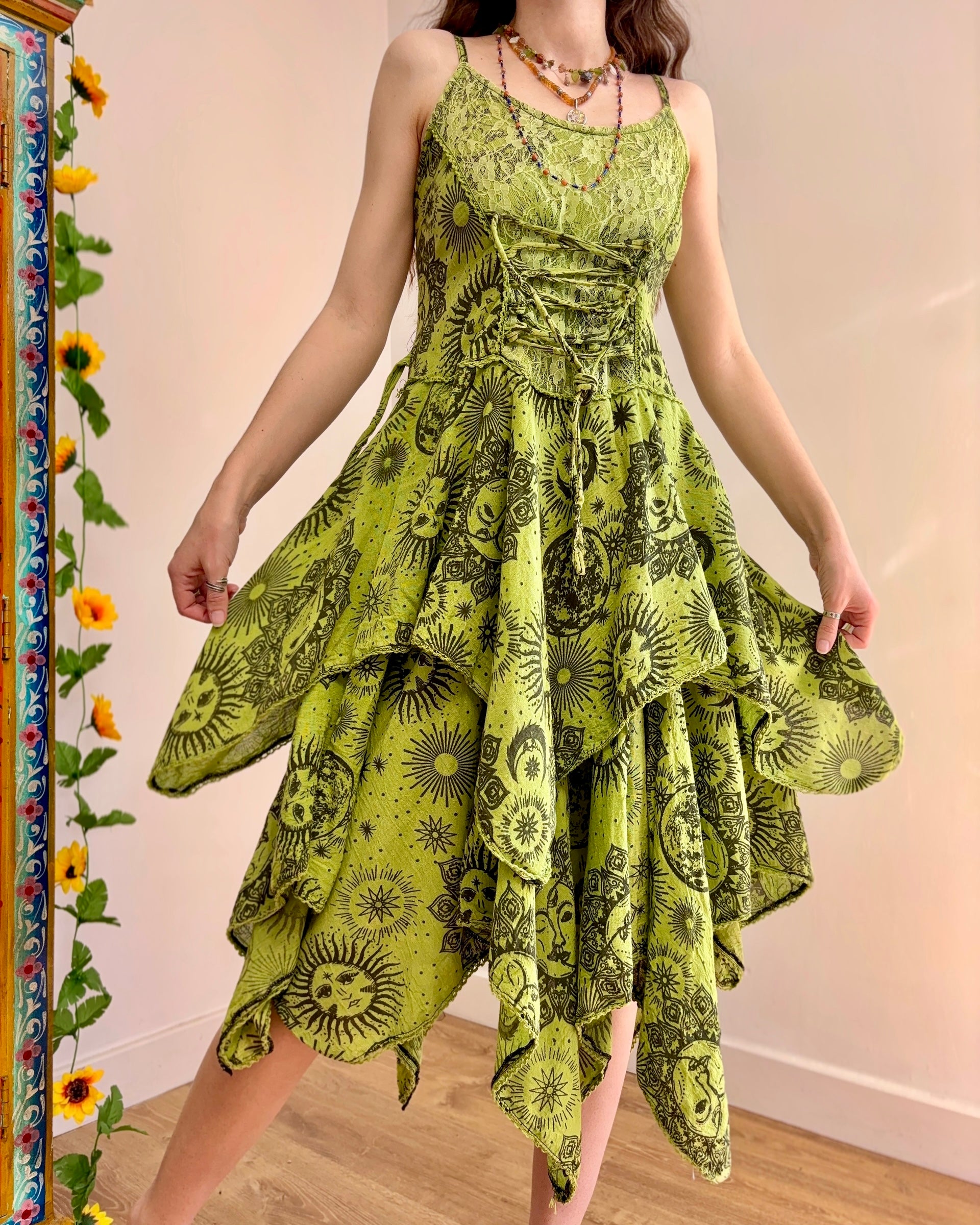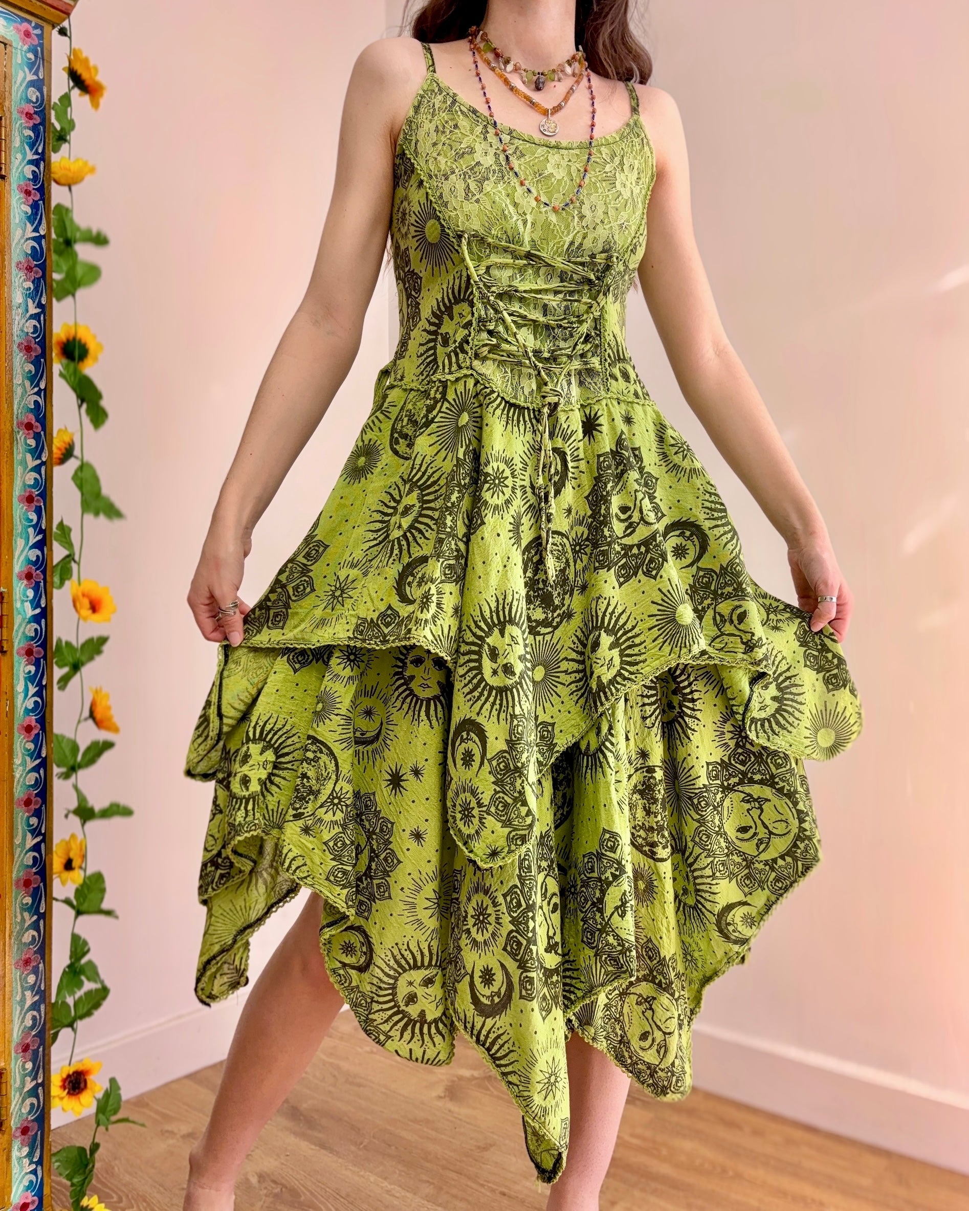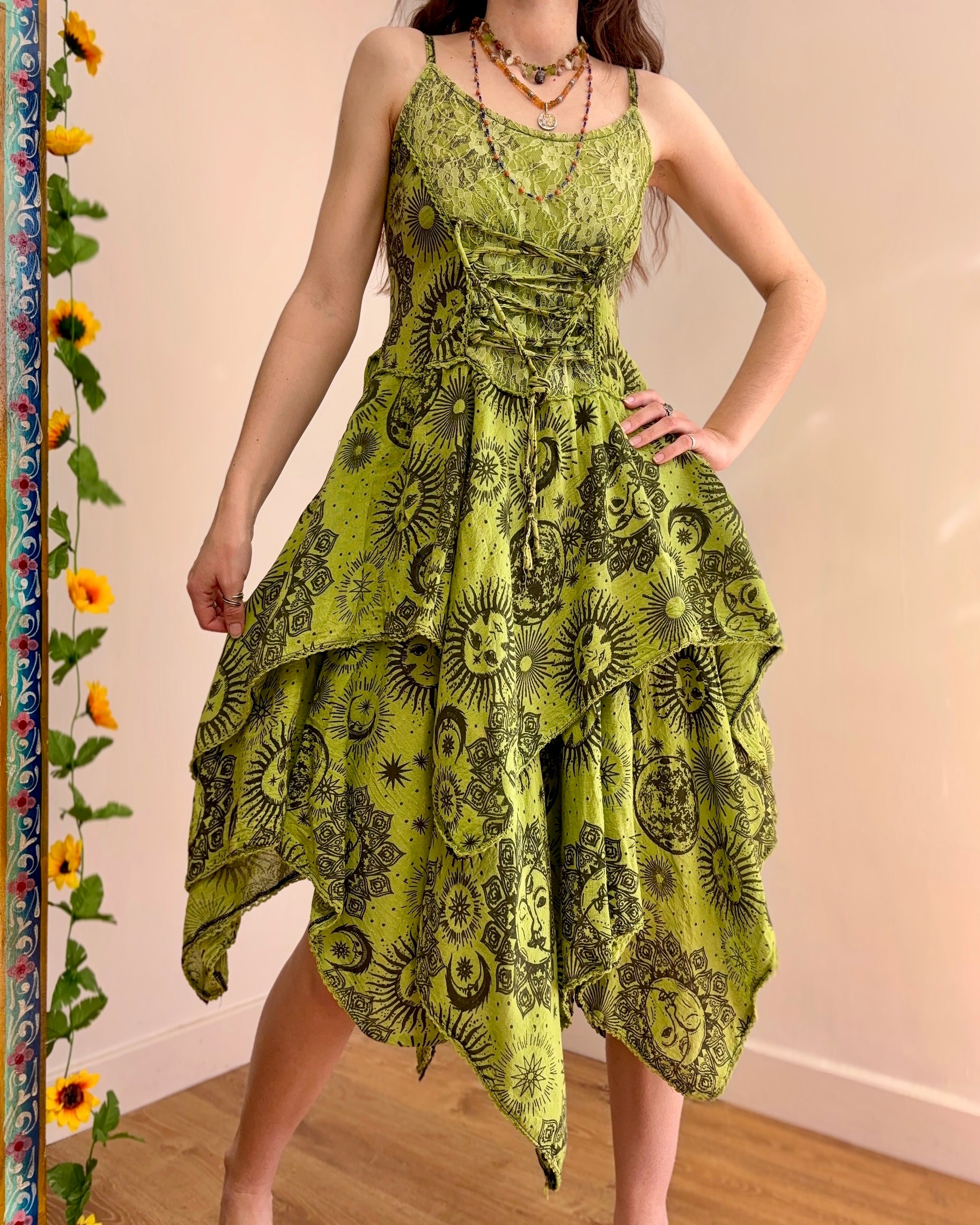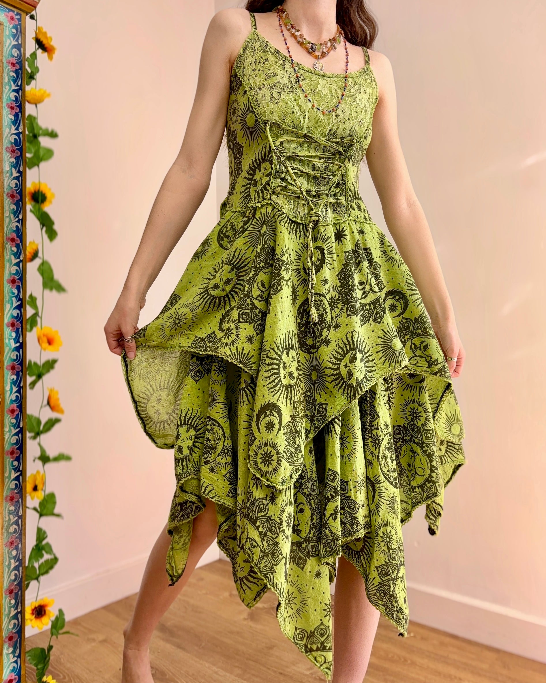 This beautiful dress is made with a corset-style lace top, and a bottom made from 100% cotton green celestial fabric that gives a forest fairy hippie look. The straps are adjustable.