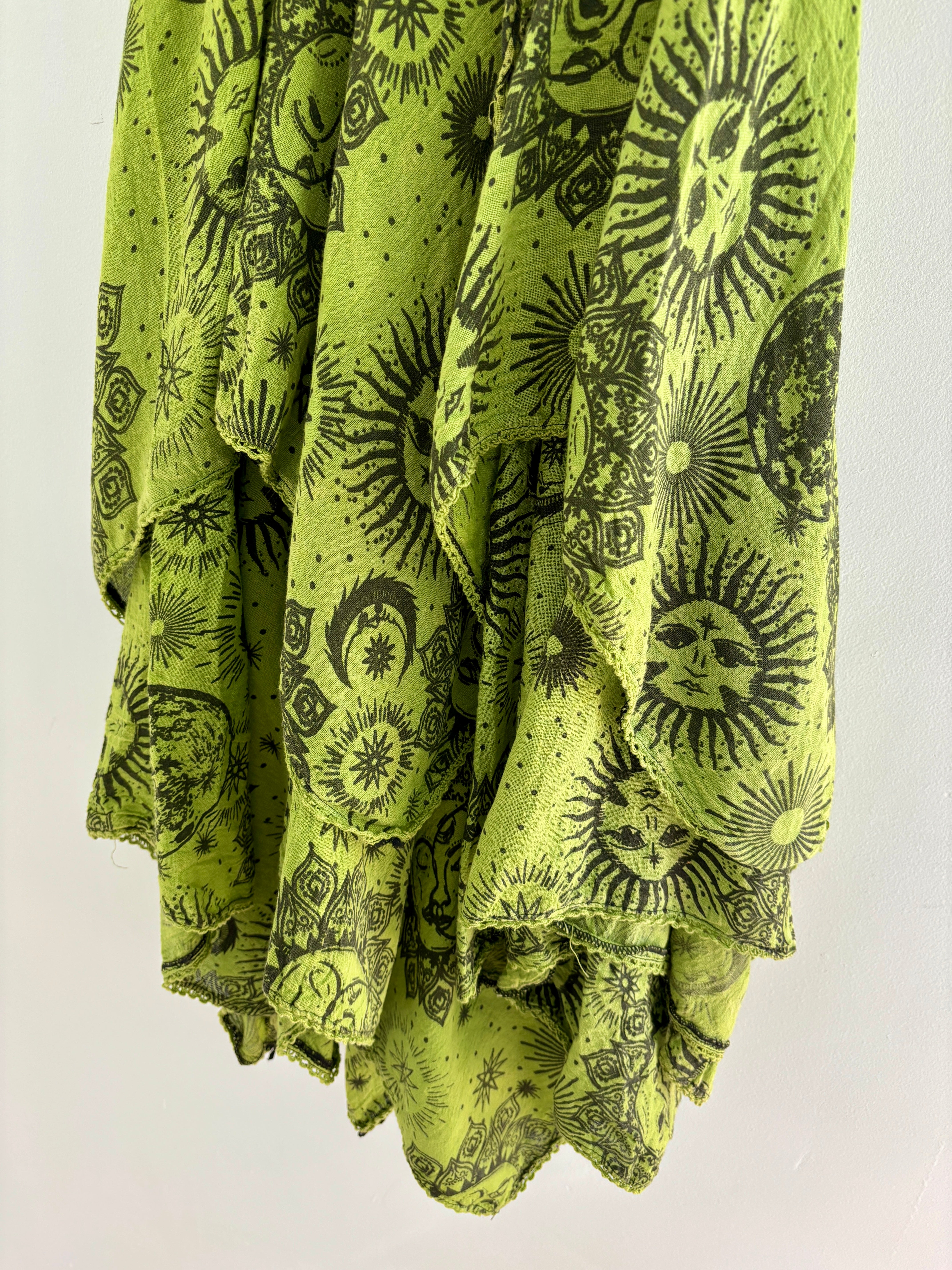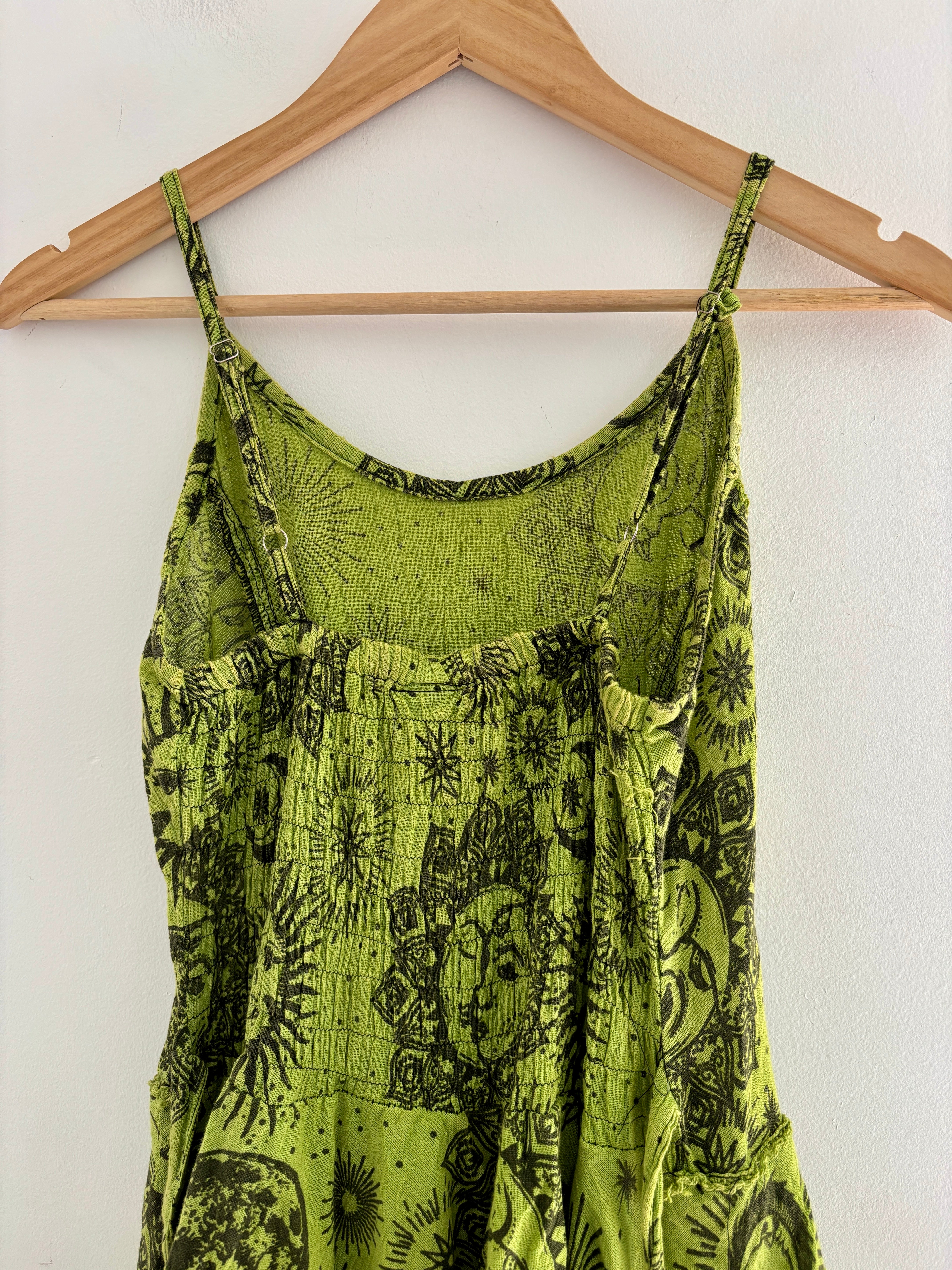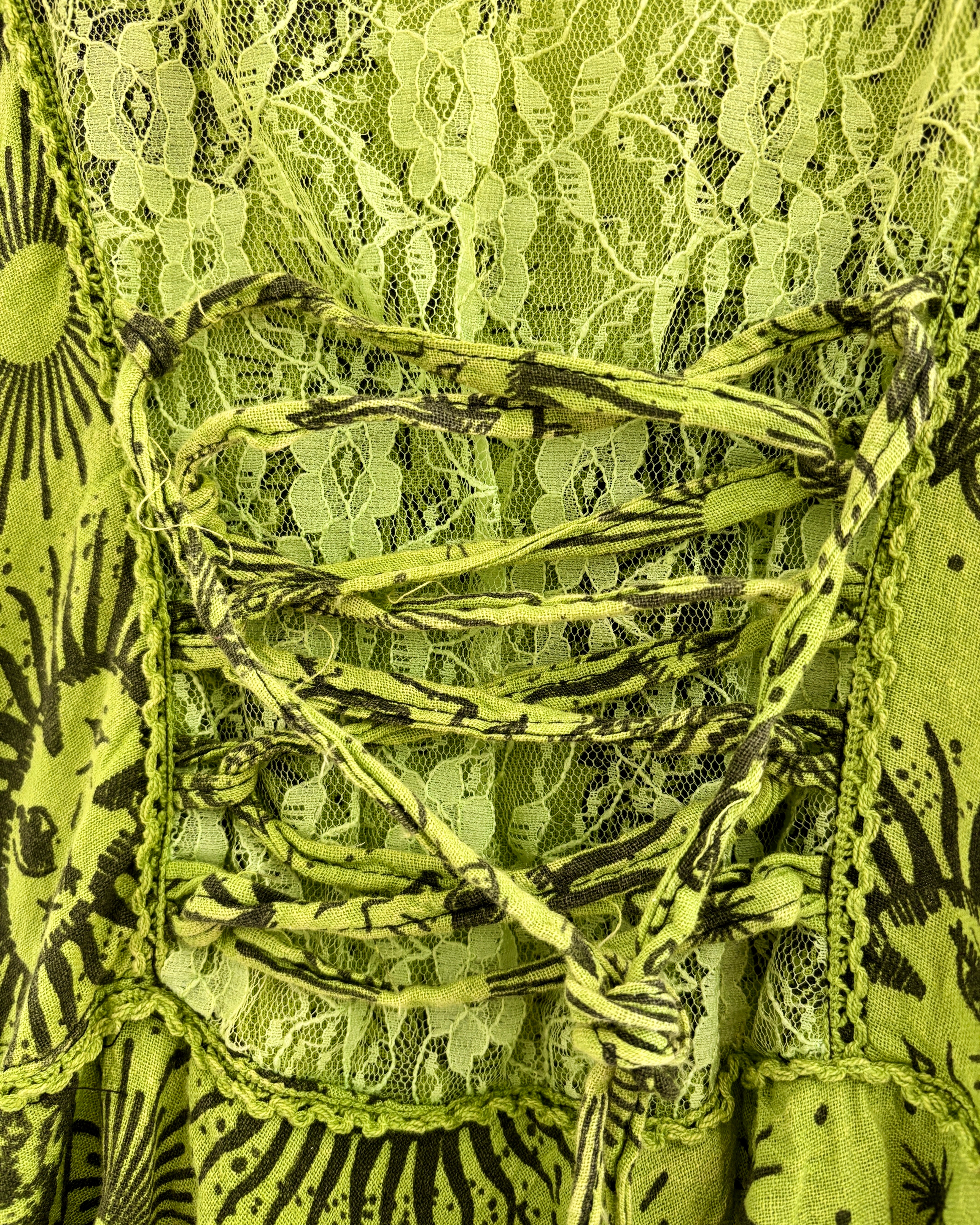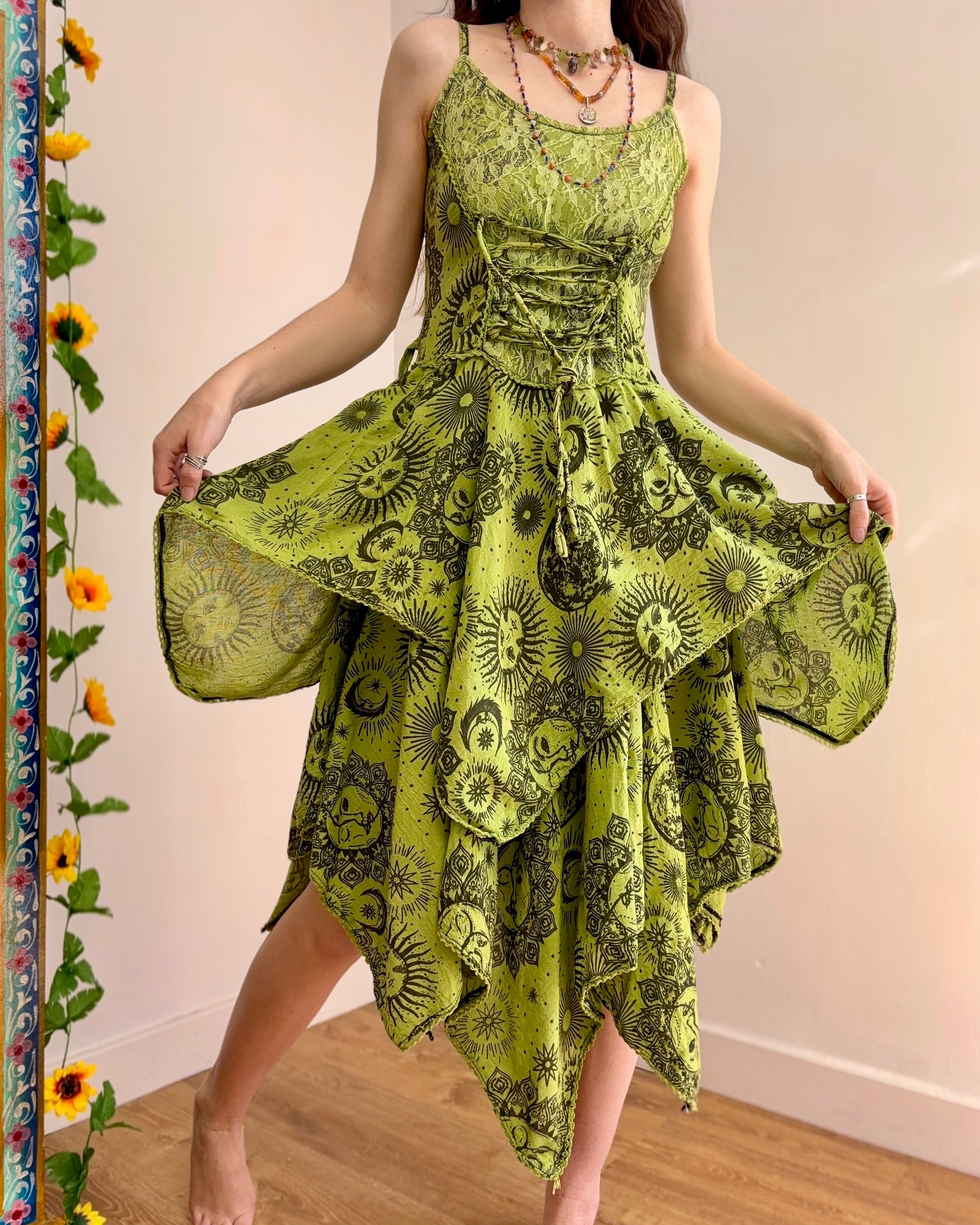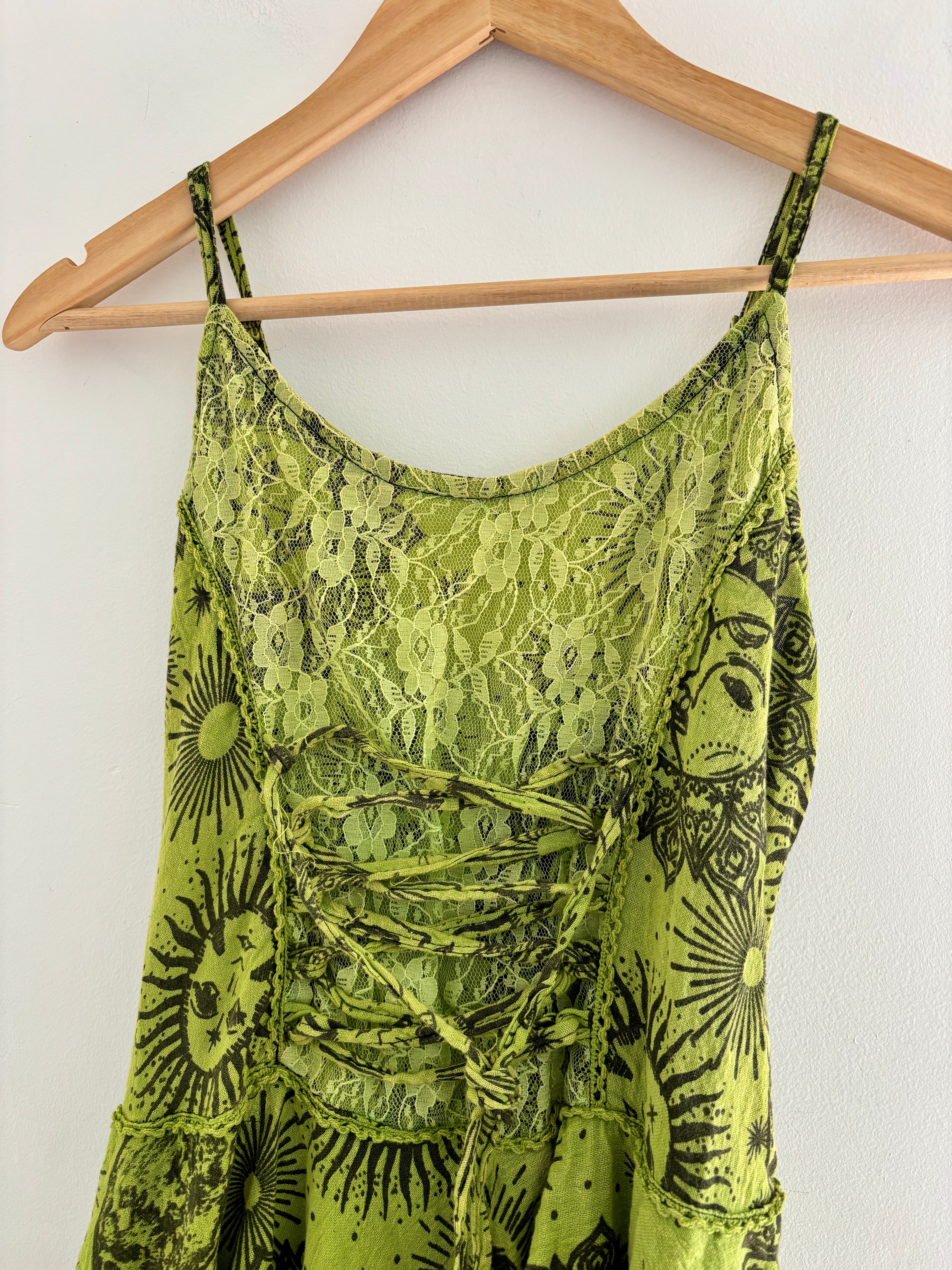 This beautiful dress is made with a corset-style lace top, and a bottom made from 100% cotton green celestial fabric that gives a forest fairy hippie look. The straps are adjustable.
