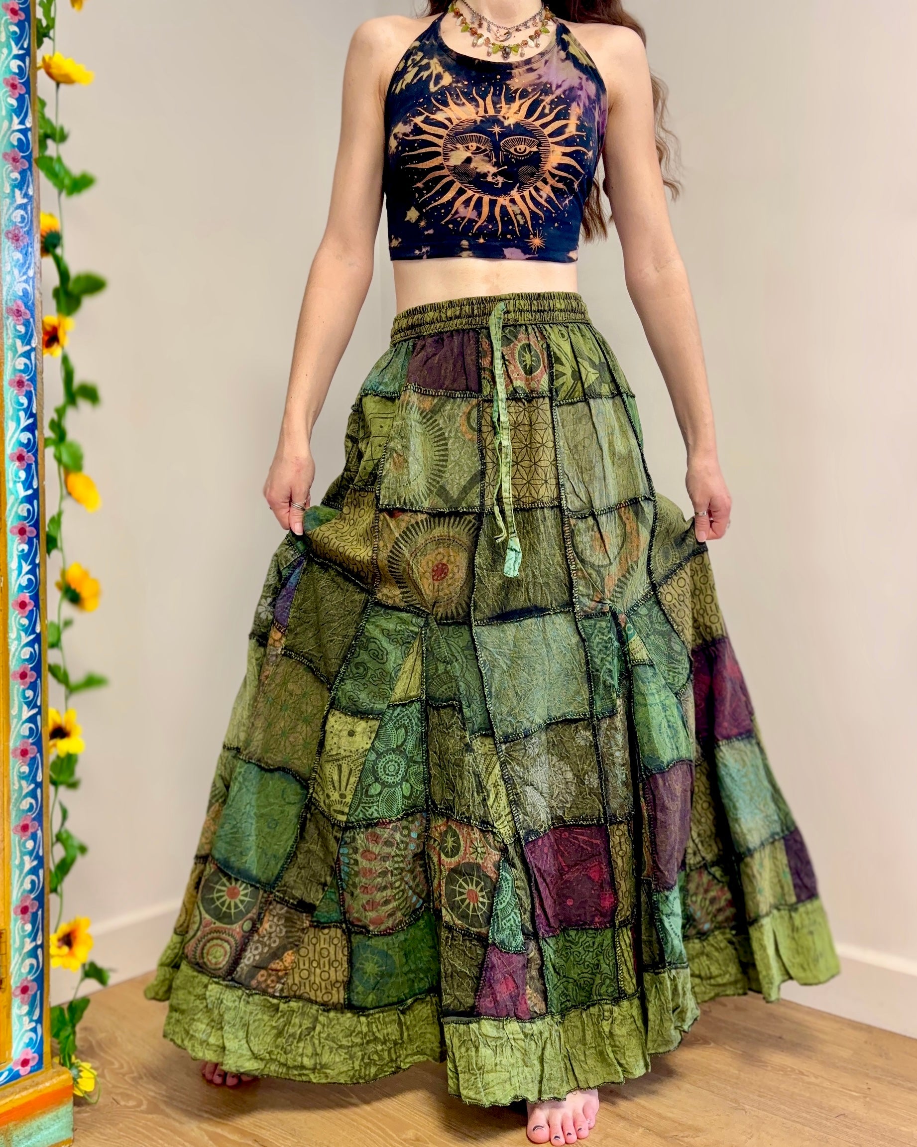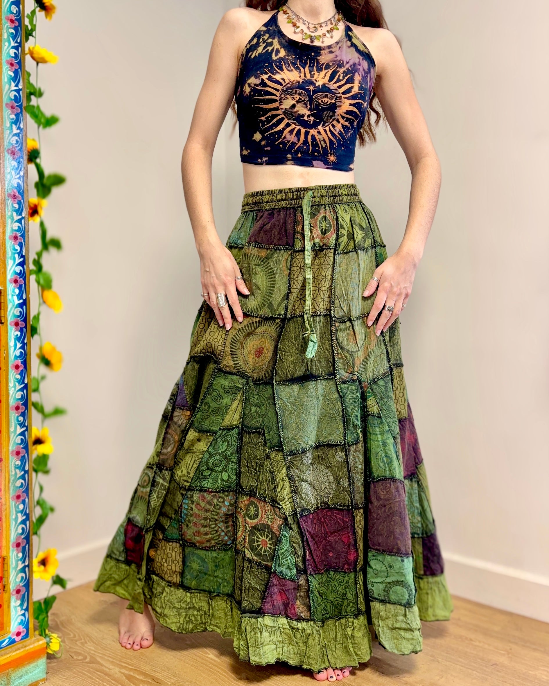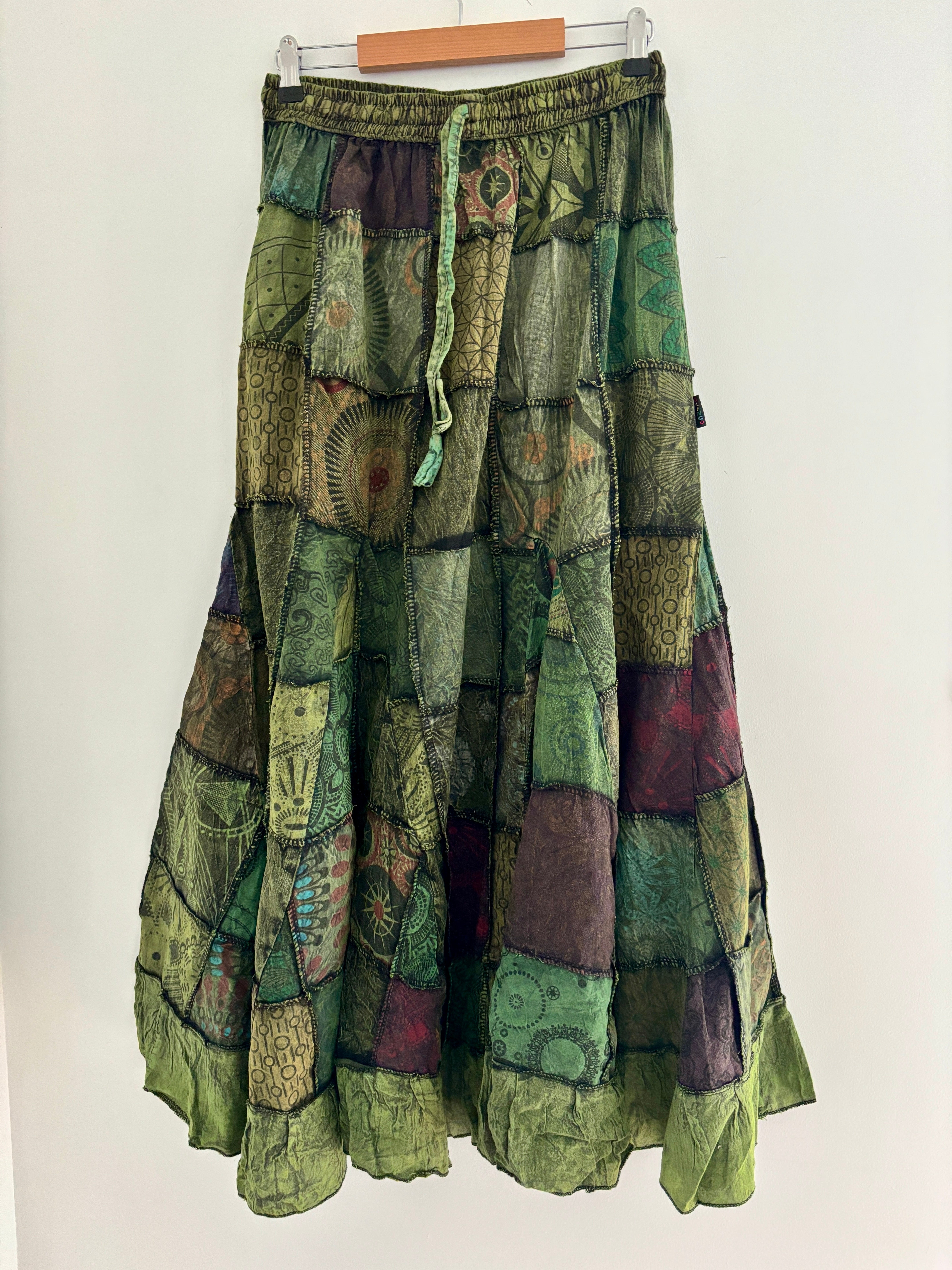 This beautiful maxi skirt features patches of fabric in earthy green colours. It has an elastic waist and two side pockets.