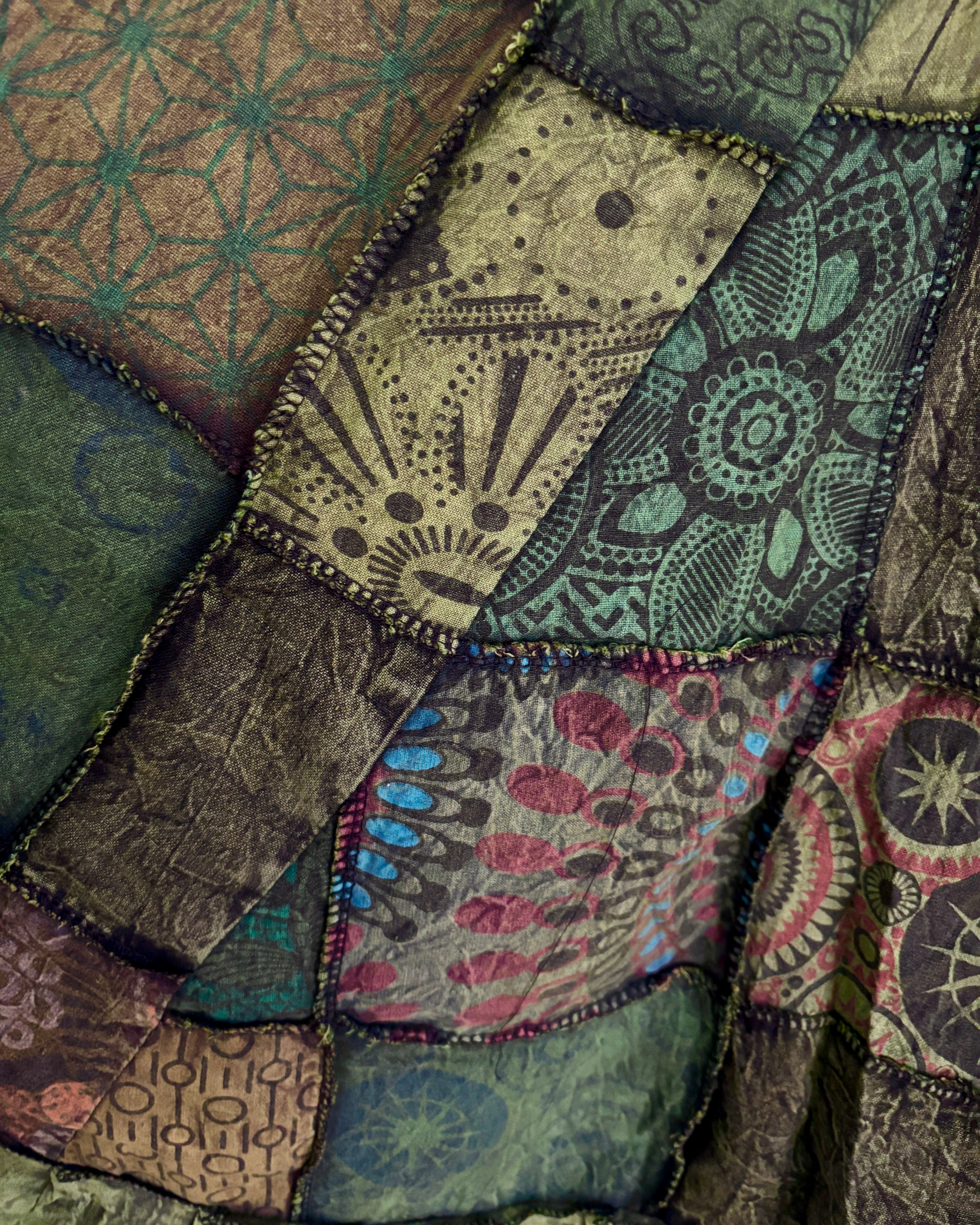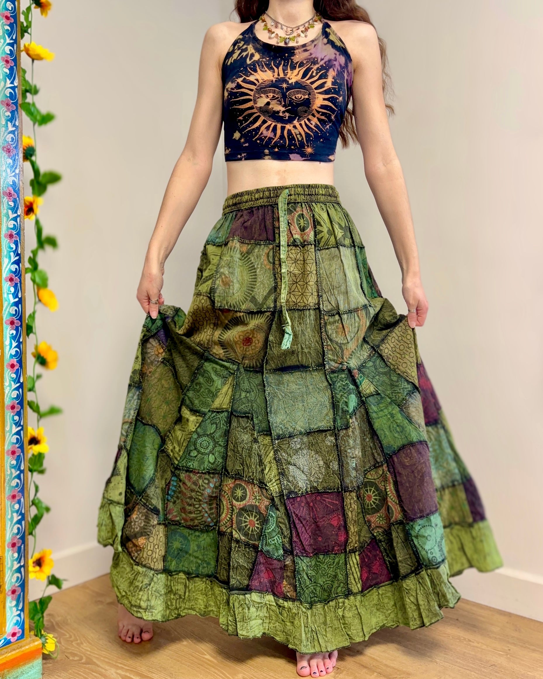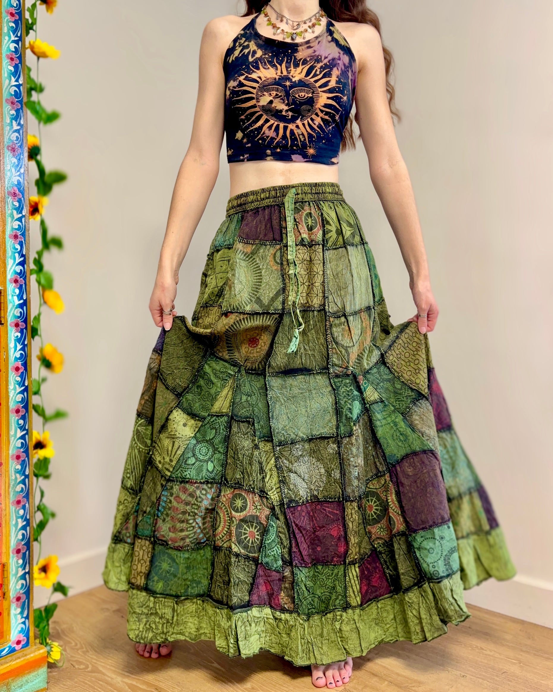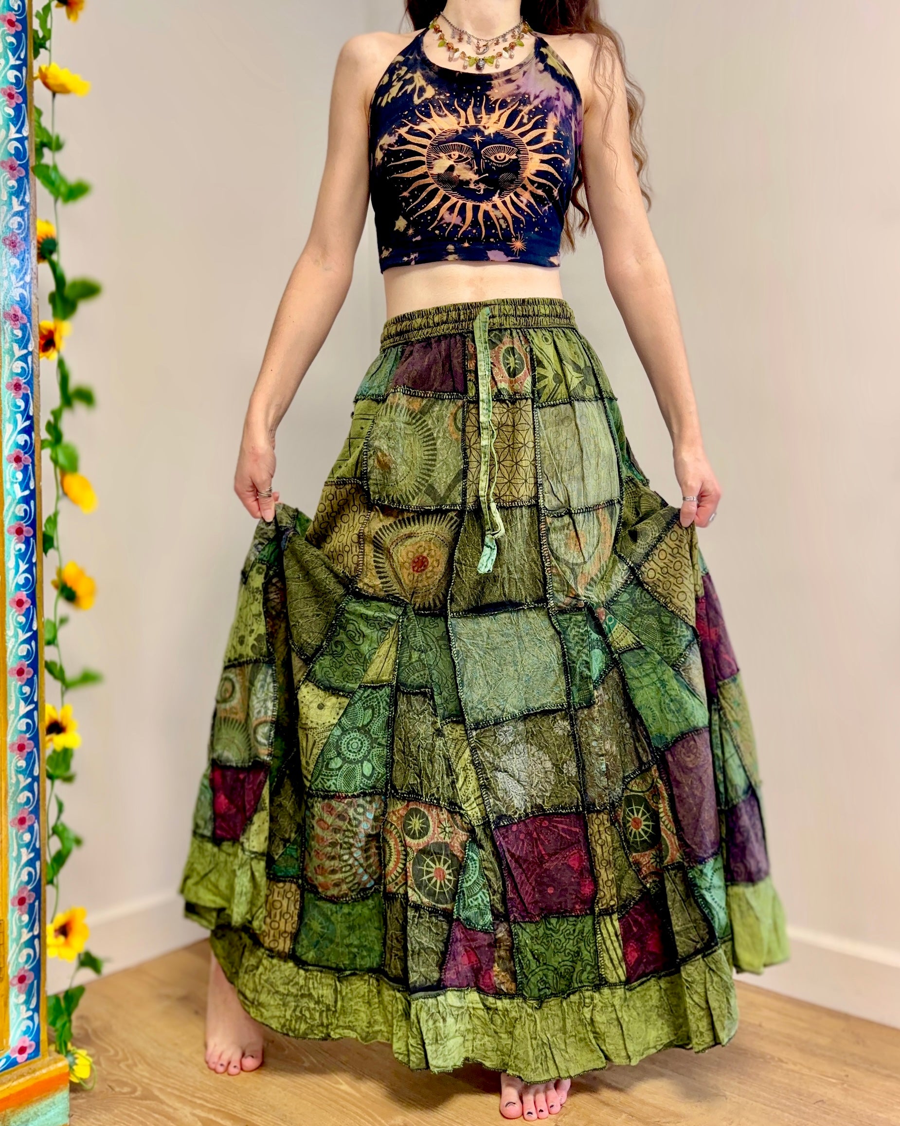 This beautiful maxi skirt features patches of fabric in earthy green colours. It has an elastic waist and two side pockets.