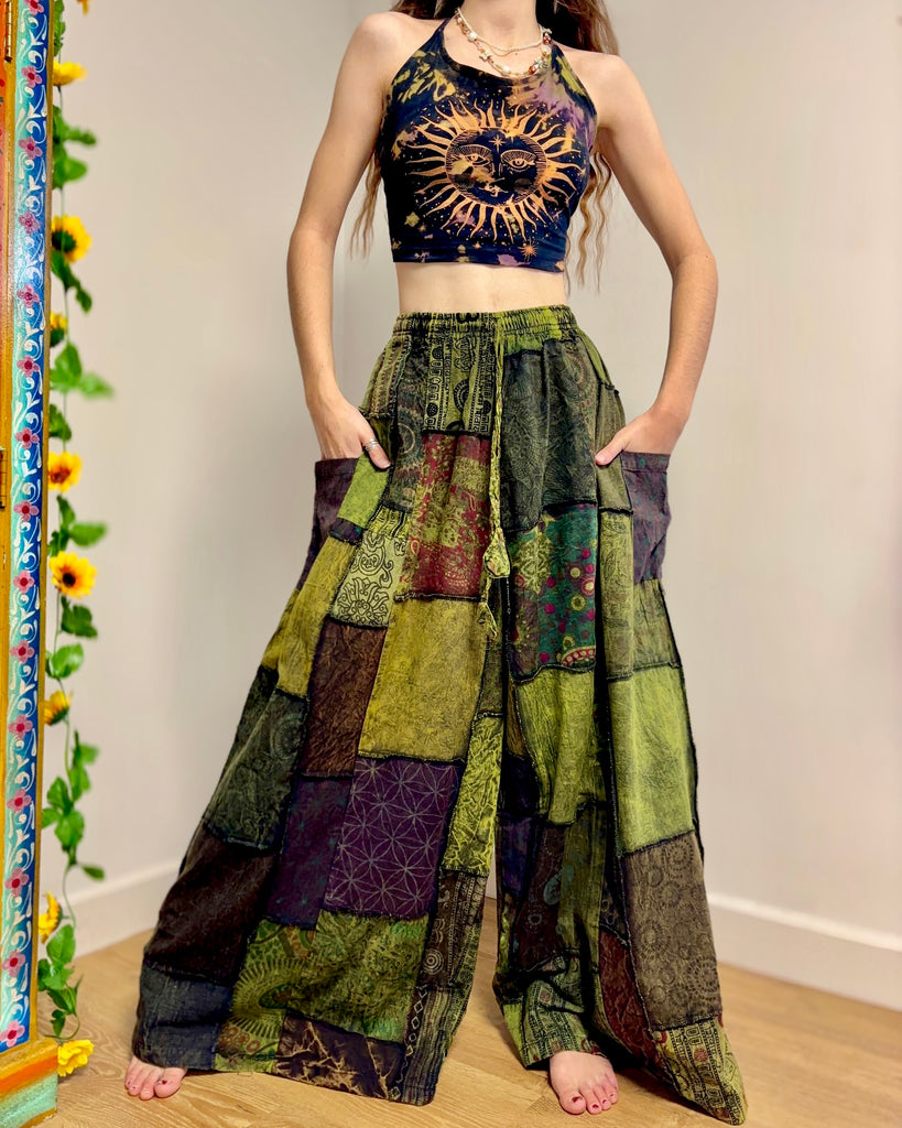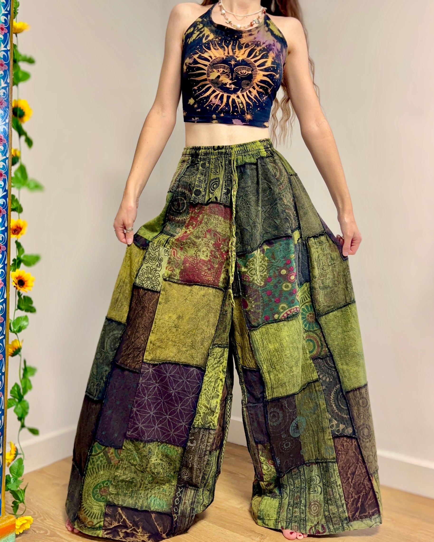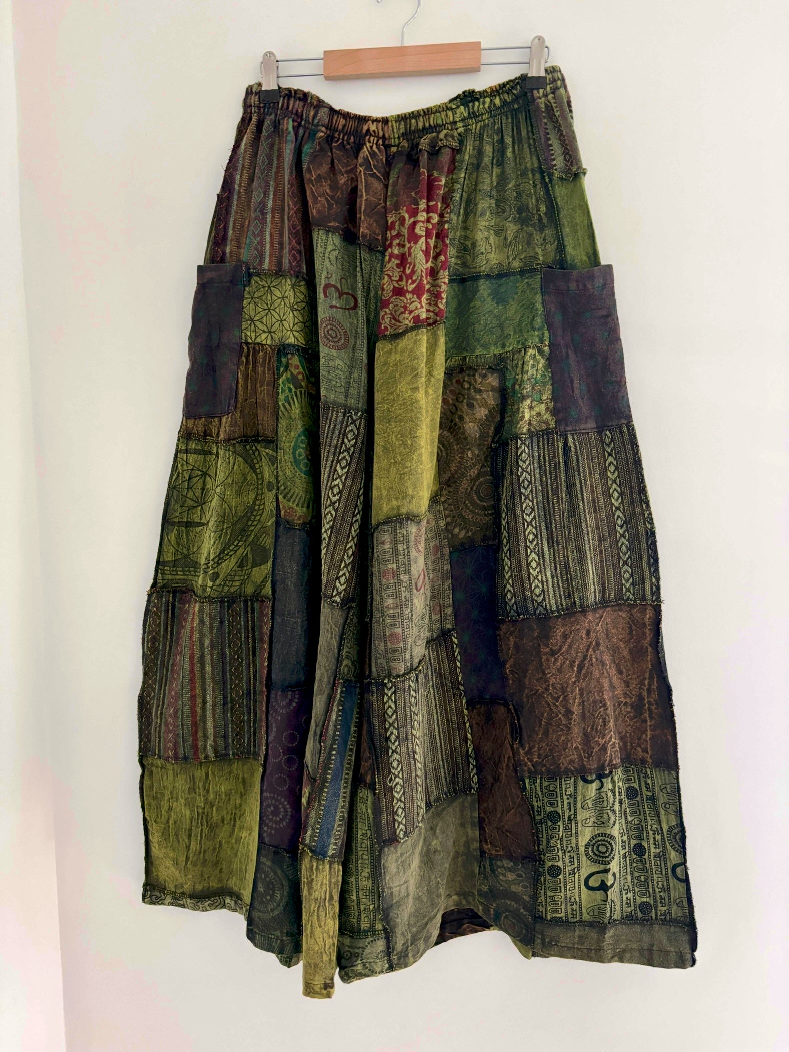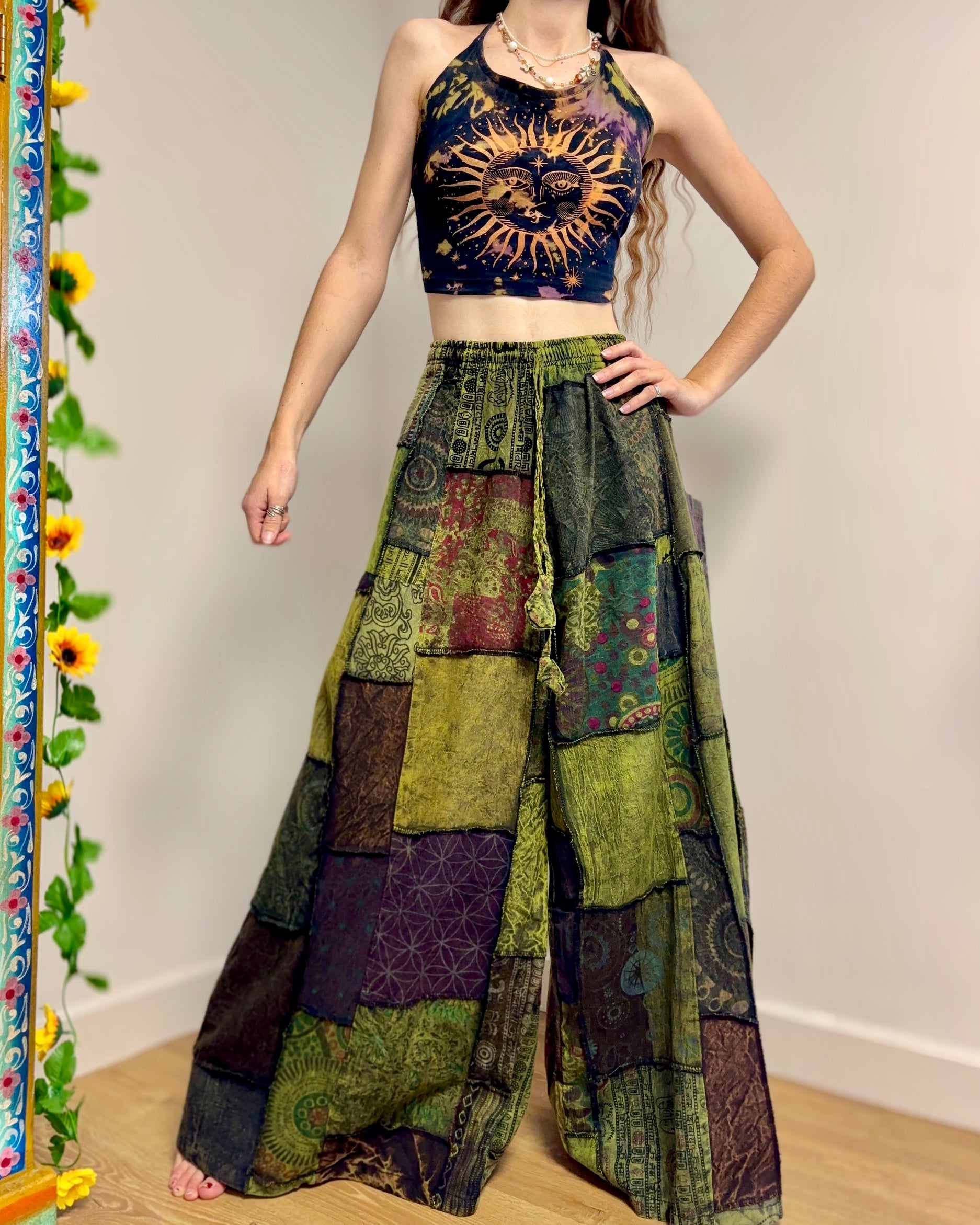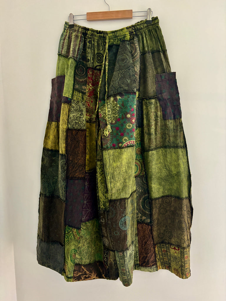 These palazzo trousers are made from patches of earthy green fabric. They have wide legs, have an elasticated waist and two front pockets for a comfortable fit. Colours of patches vary.