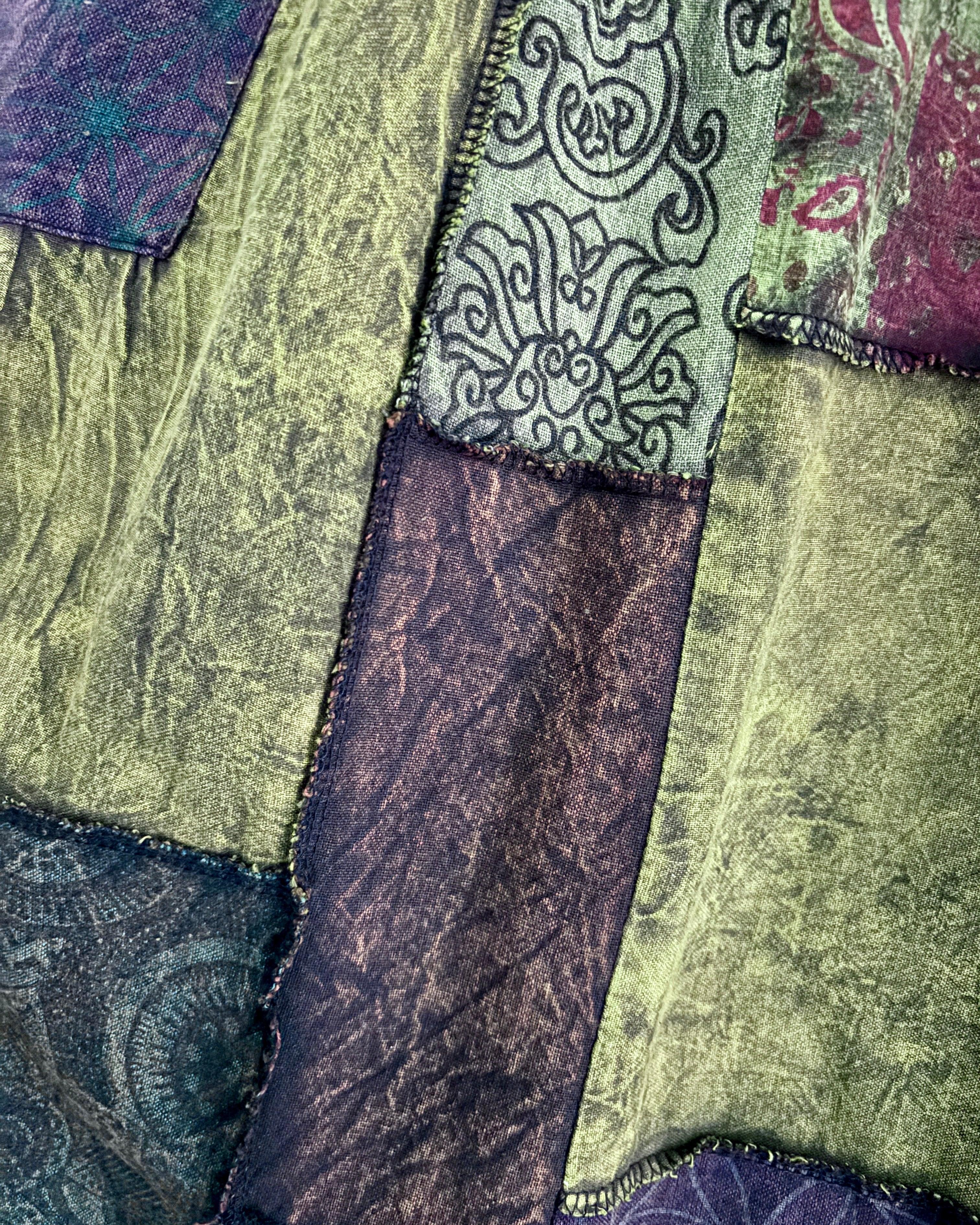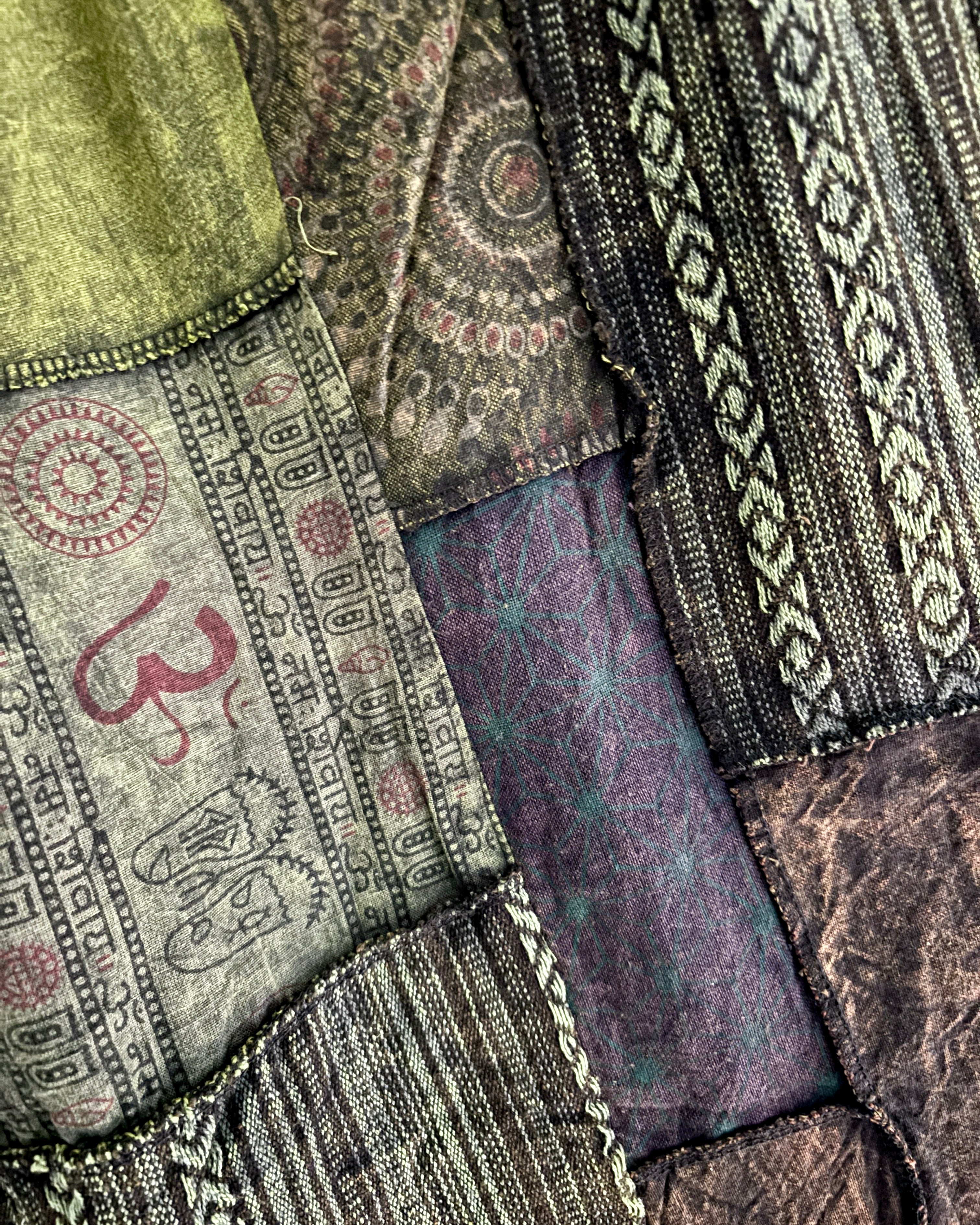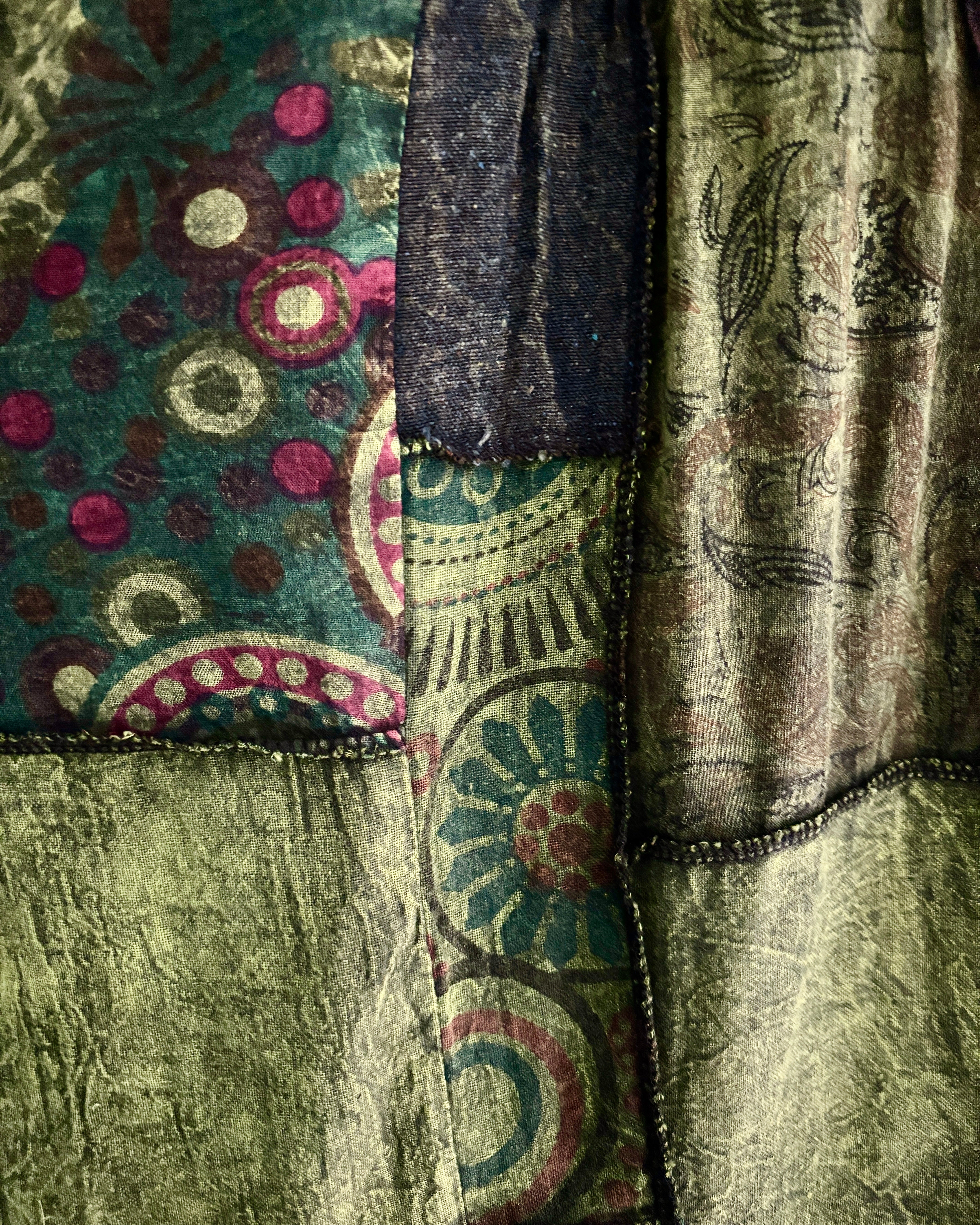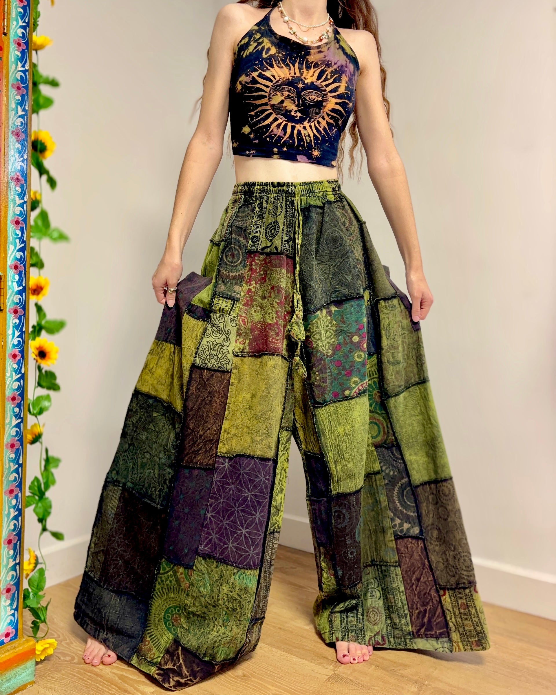 These palazzo trousers are made from patches of earthy green fabric. They have wide legs, have an elasticated waist and two front pockets for a comfortable fit. Colours of patches vary.