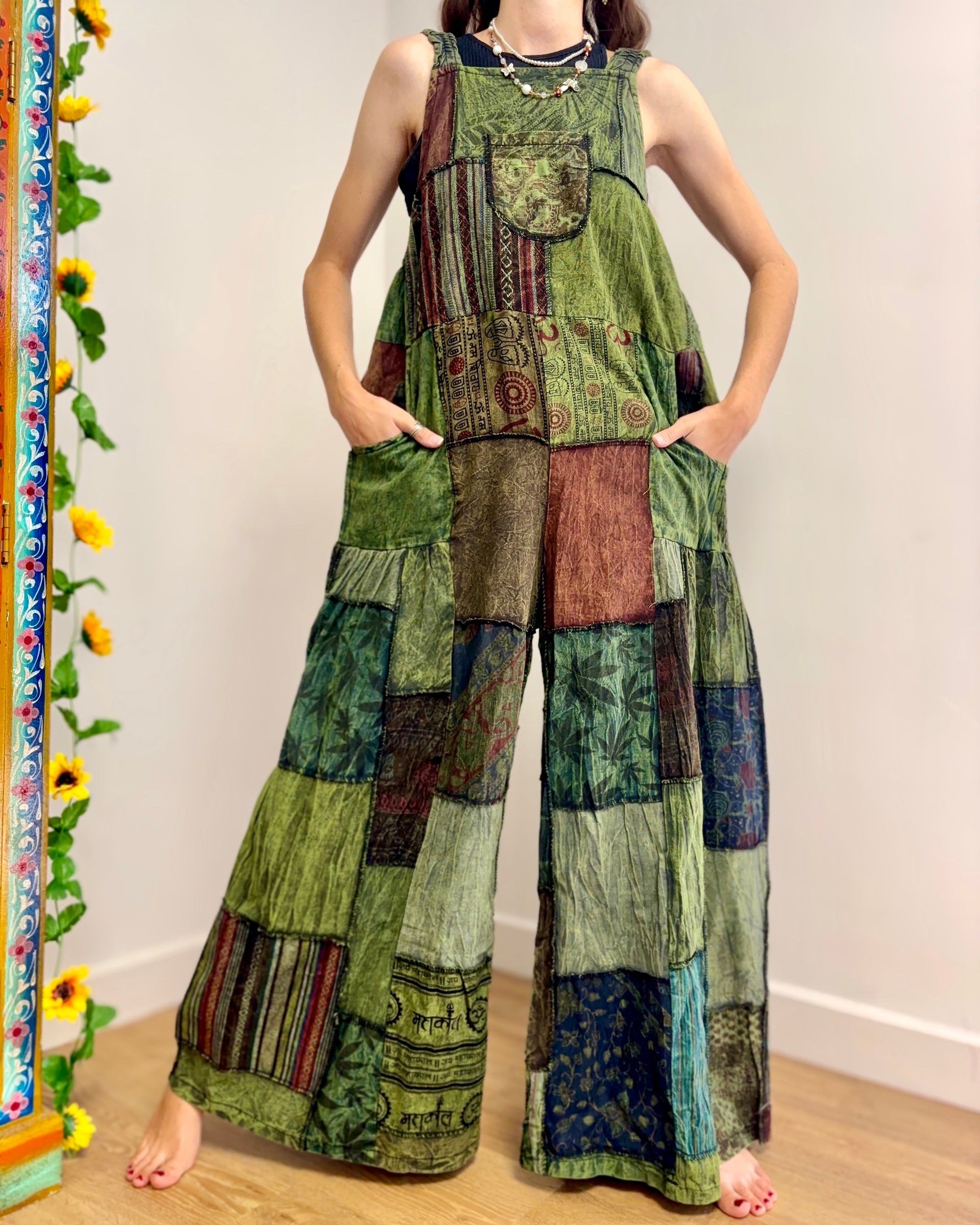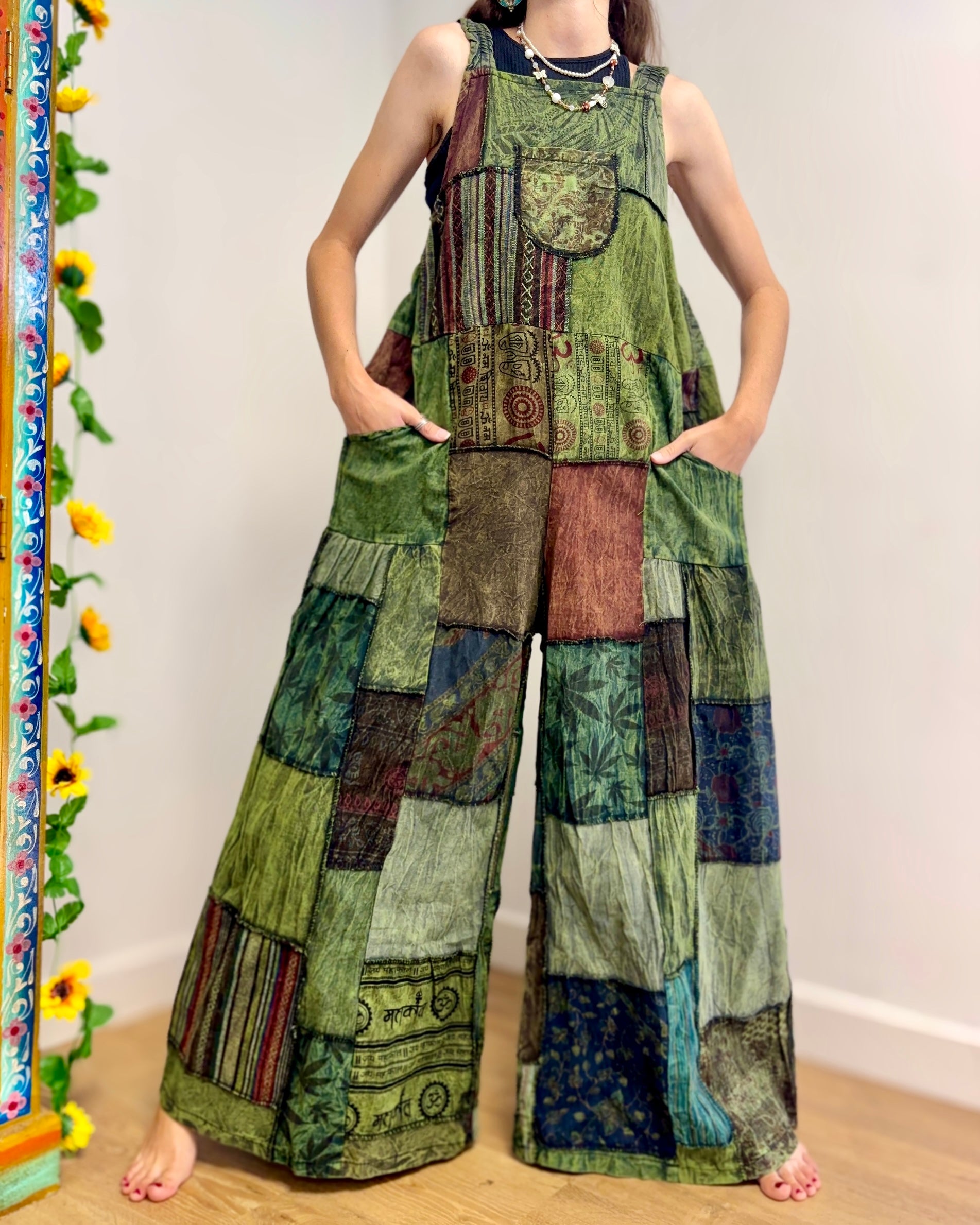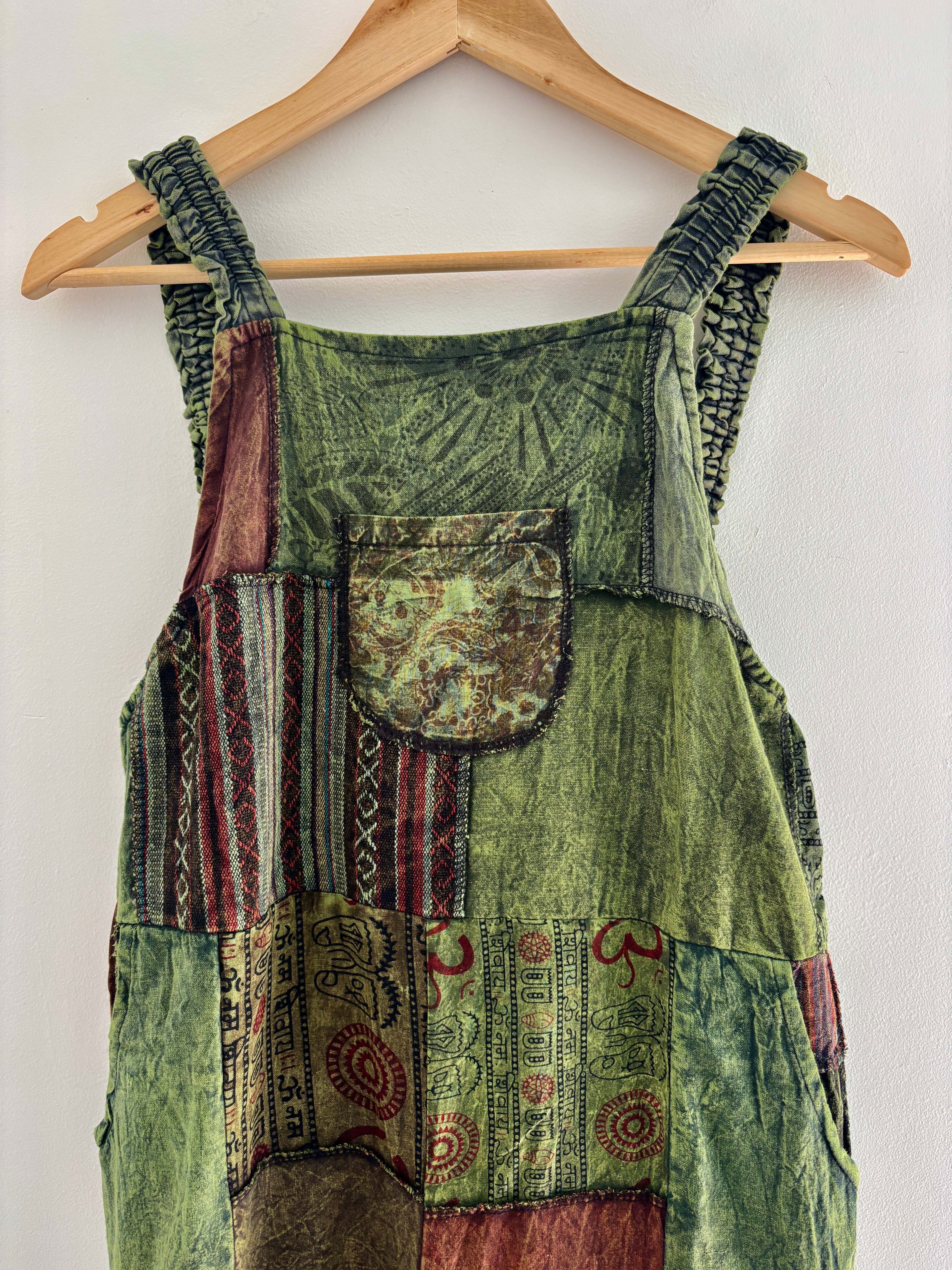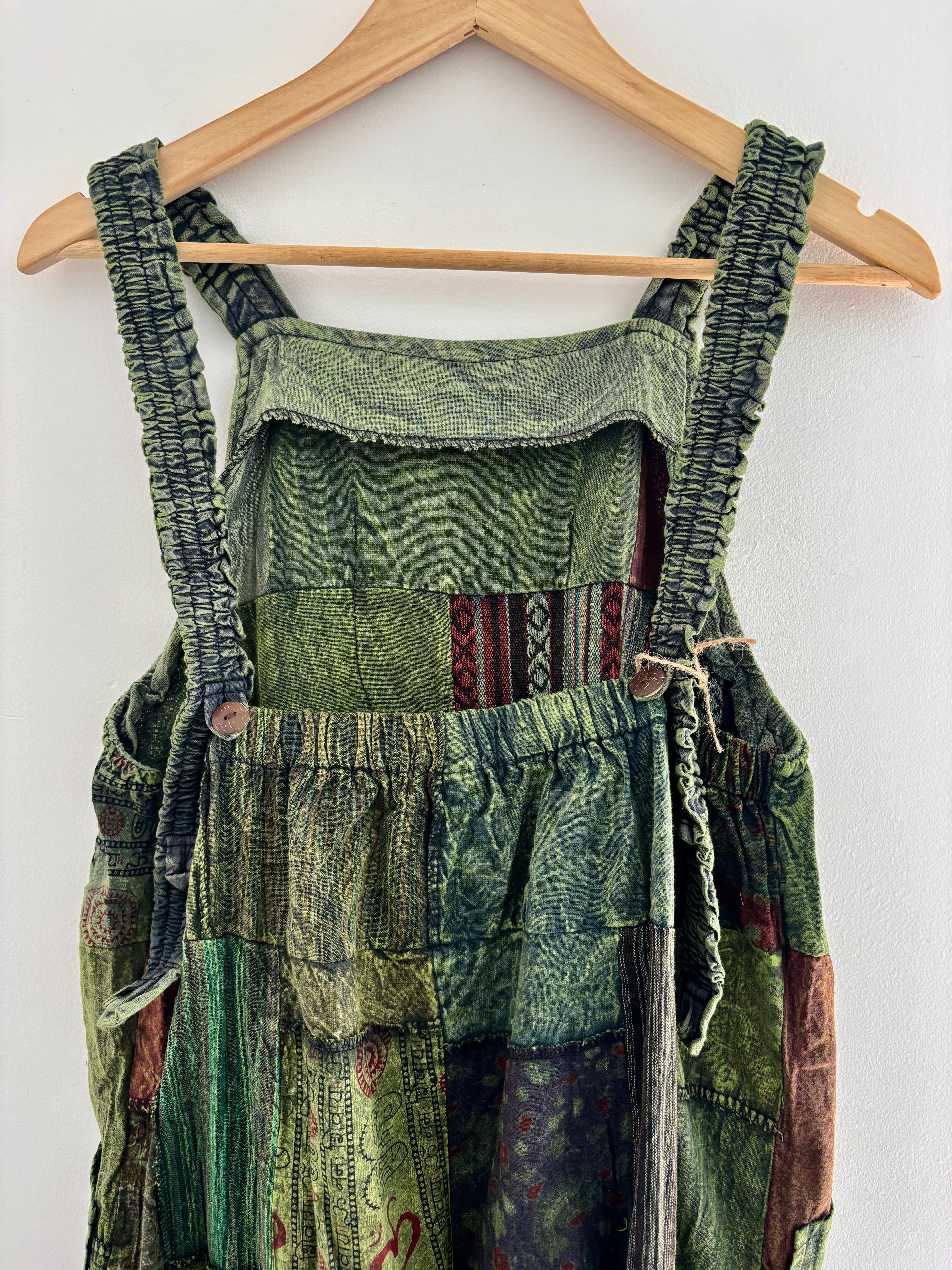 Super funky overalls made from patches of green fabric. Made from 100% cotton, with side pockets and adjustable straps. The pattern of the fabrics vary but are always similar colours as shown.