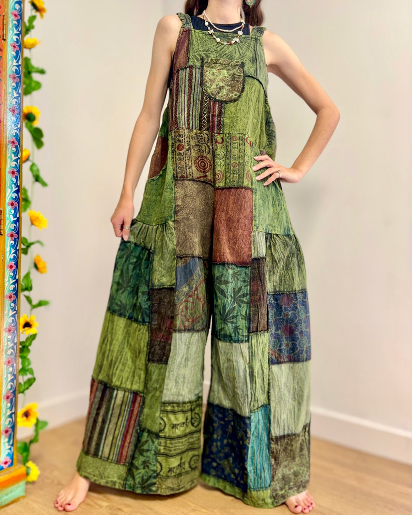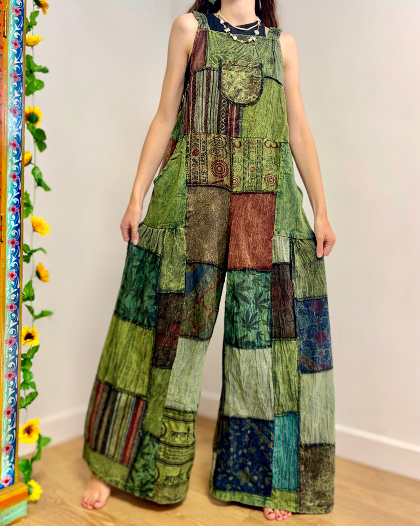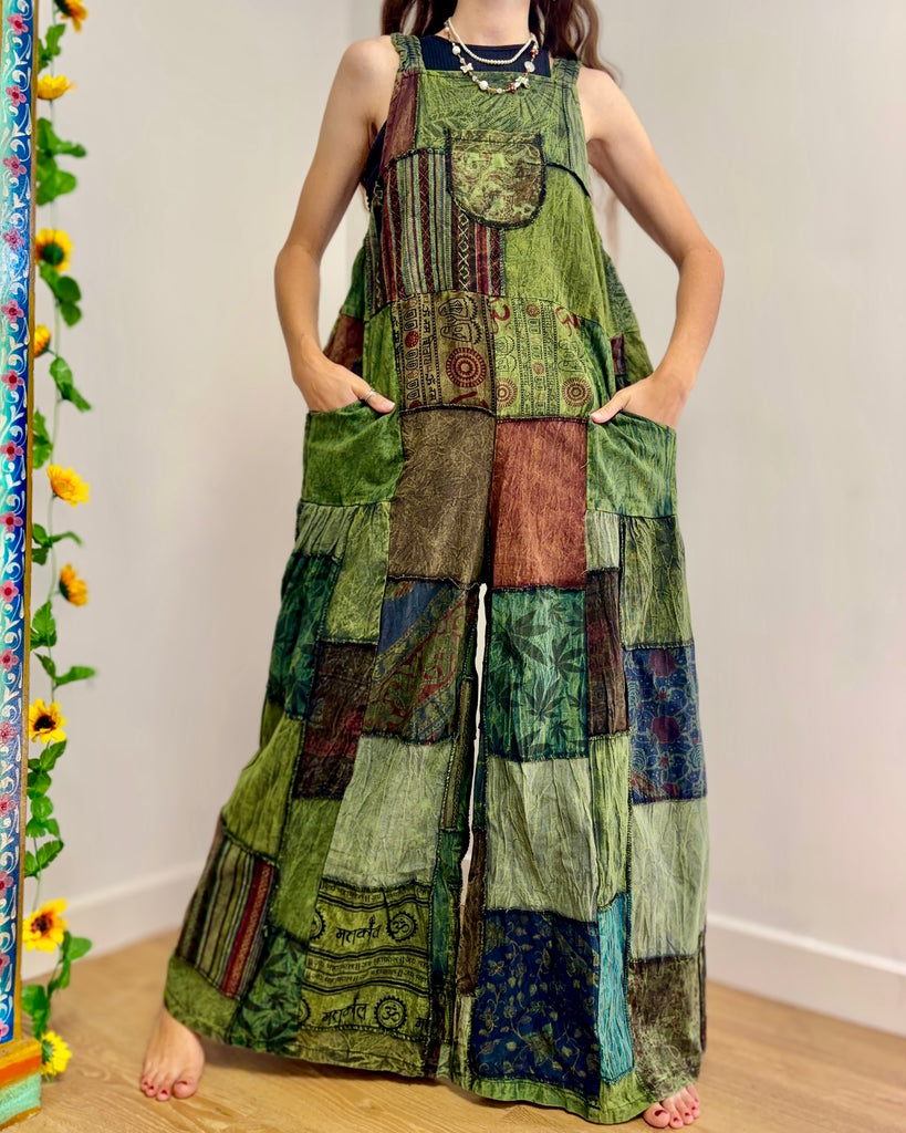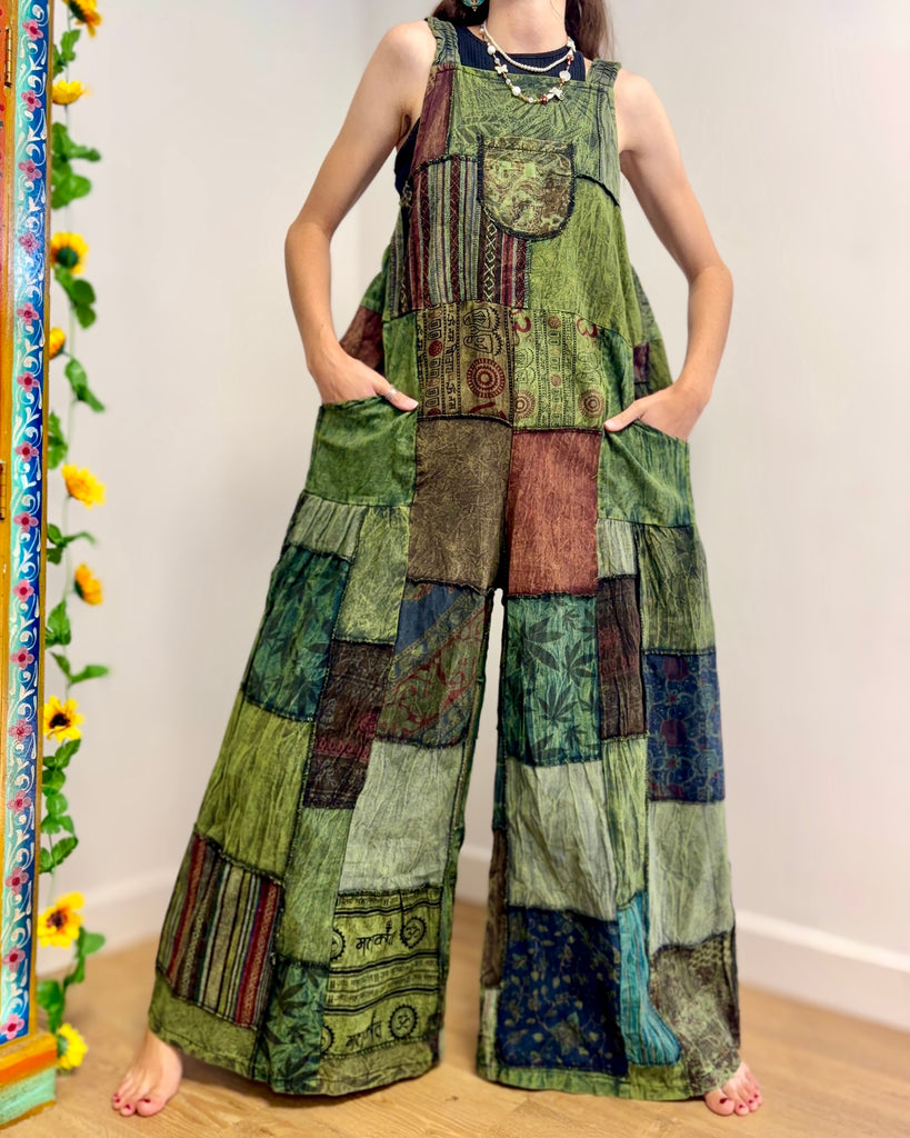 Green Patchwork Wide Leg Dungarees