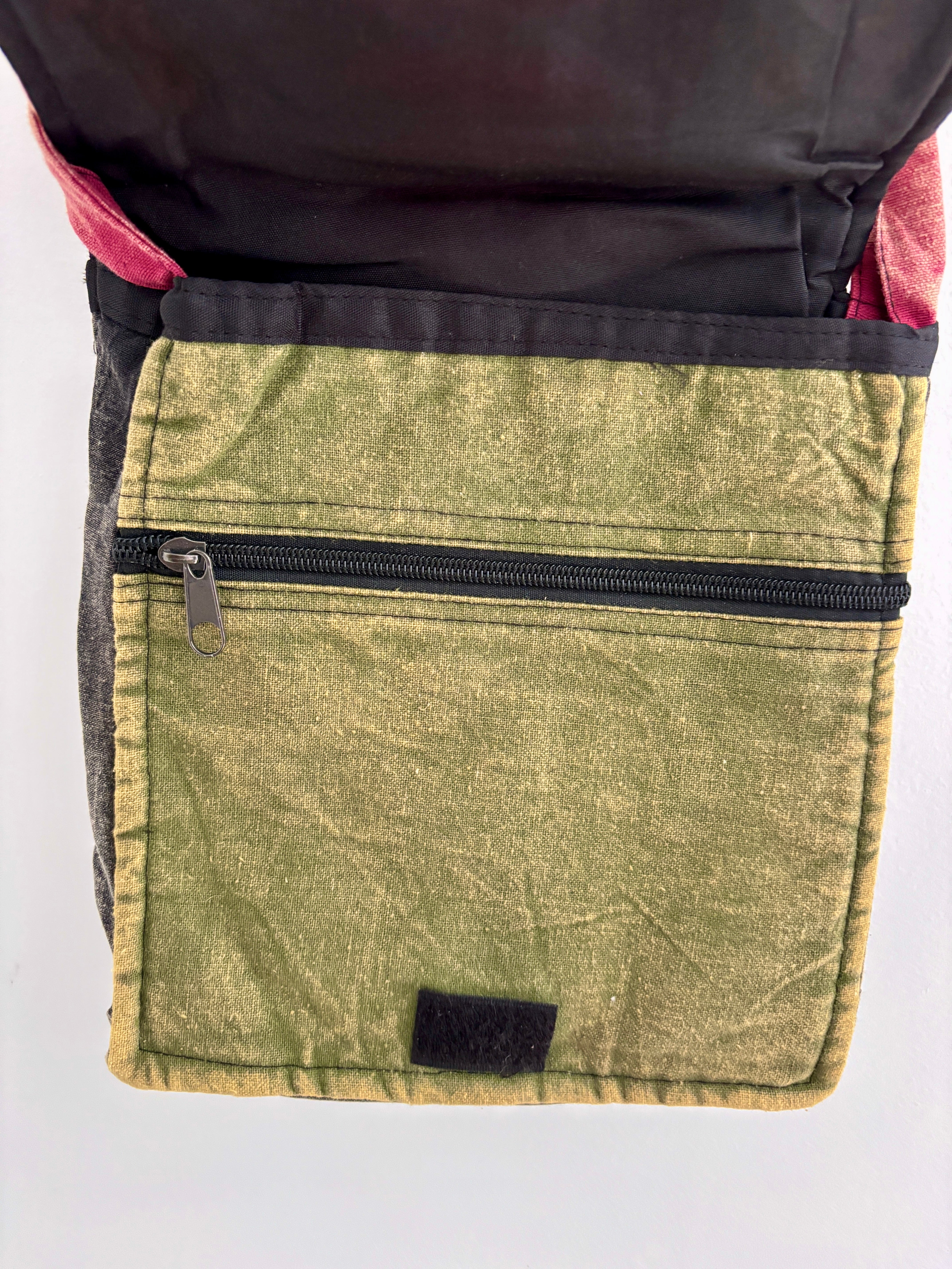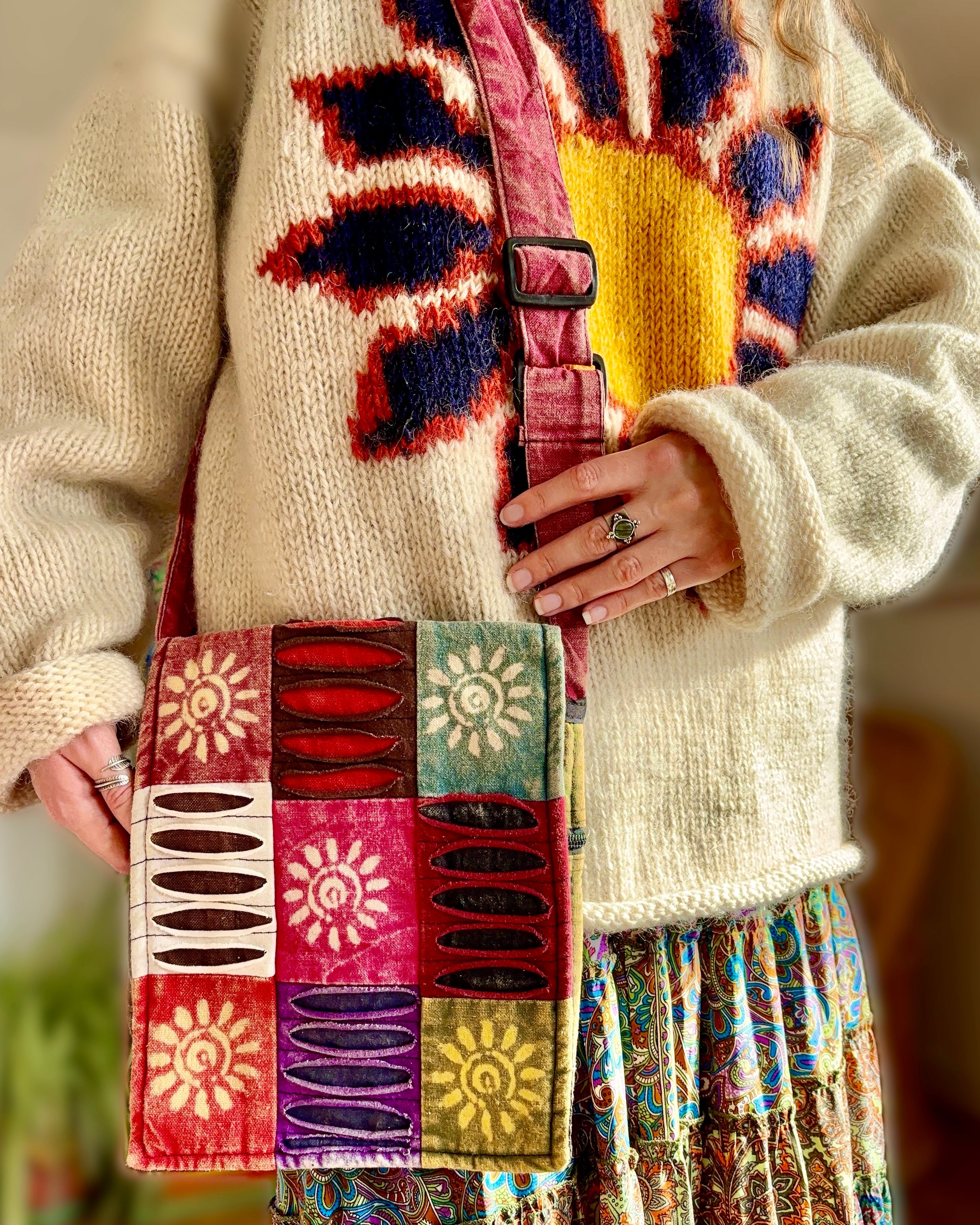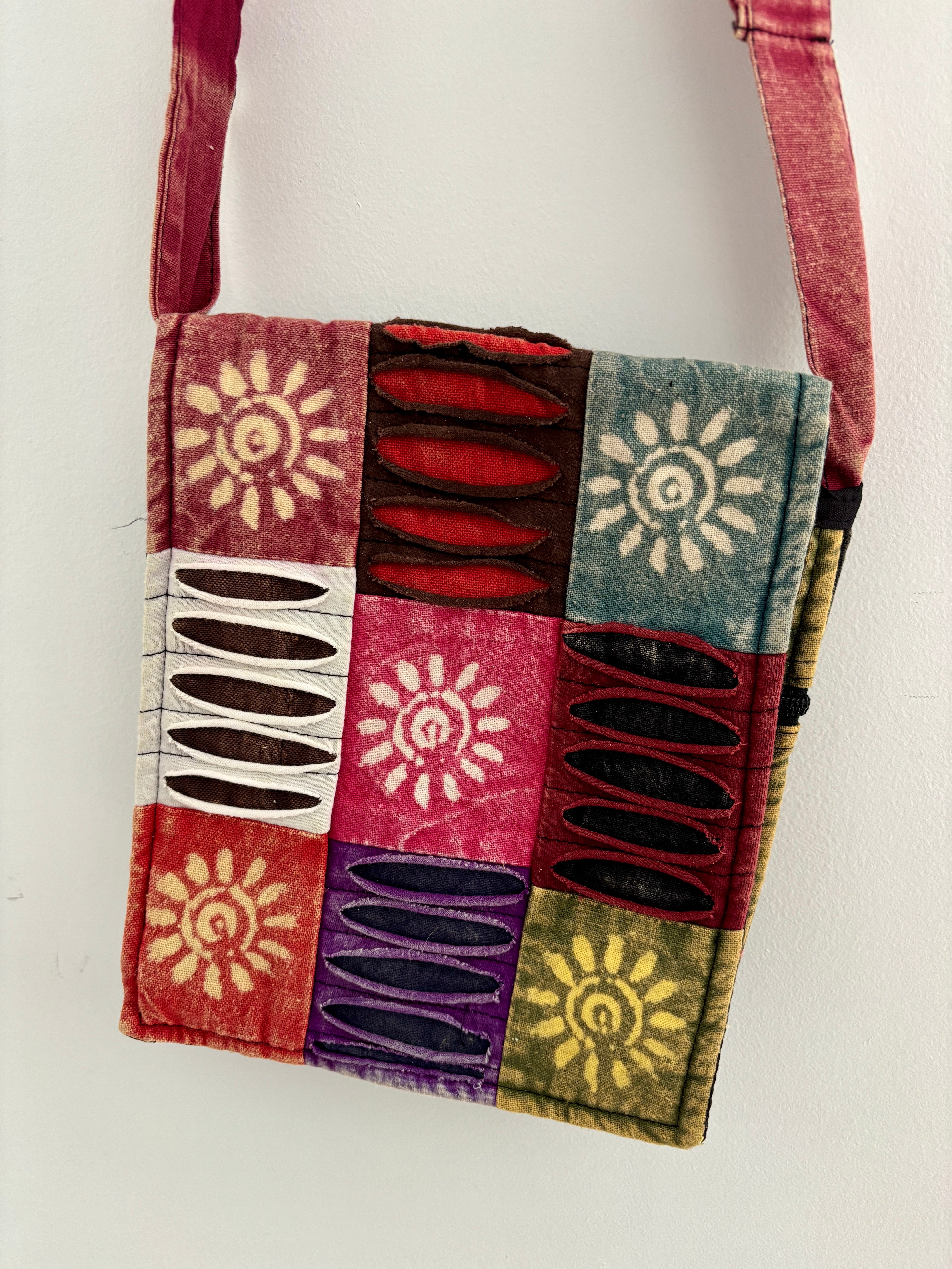 These small hippie shoulder bags feature a ripped cotton patchwork design. They have two compartments, one zipped, and are fully lined. There is also a velcro fastening for extra security.