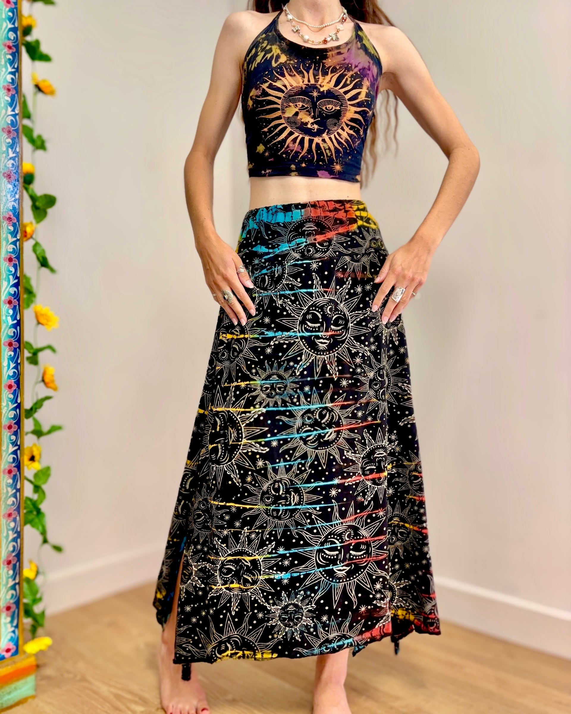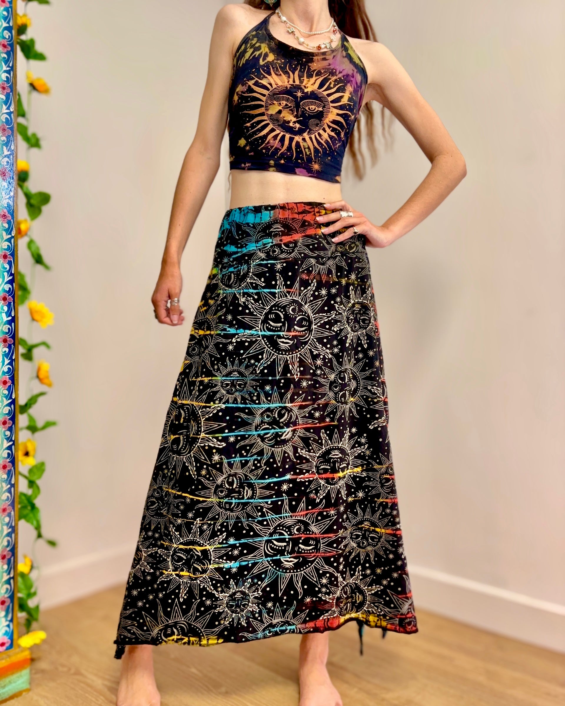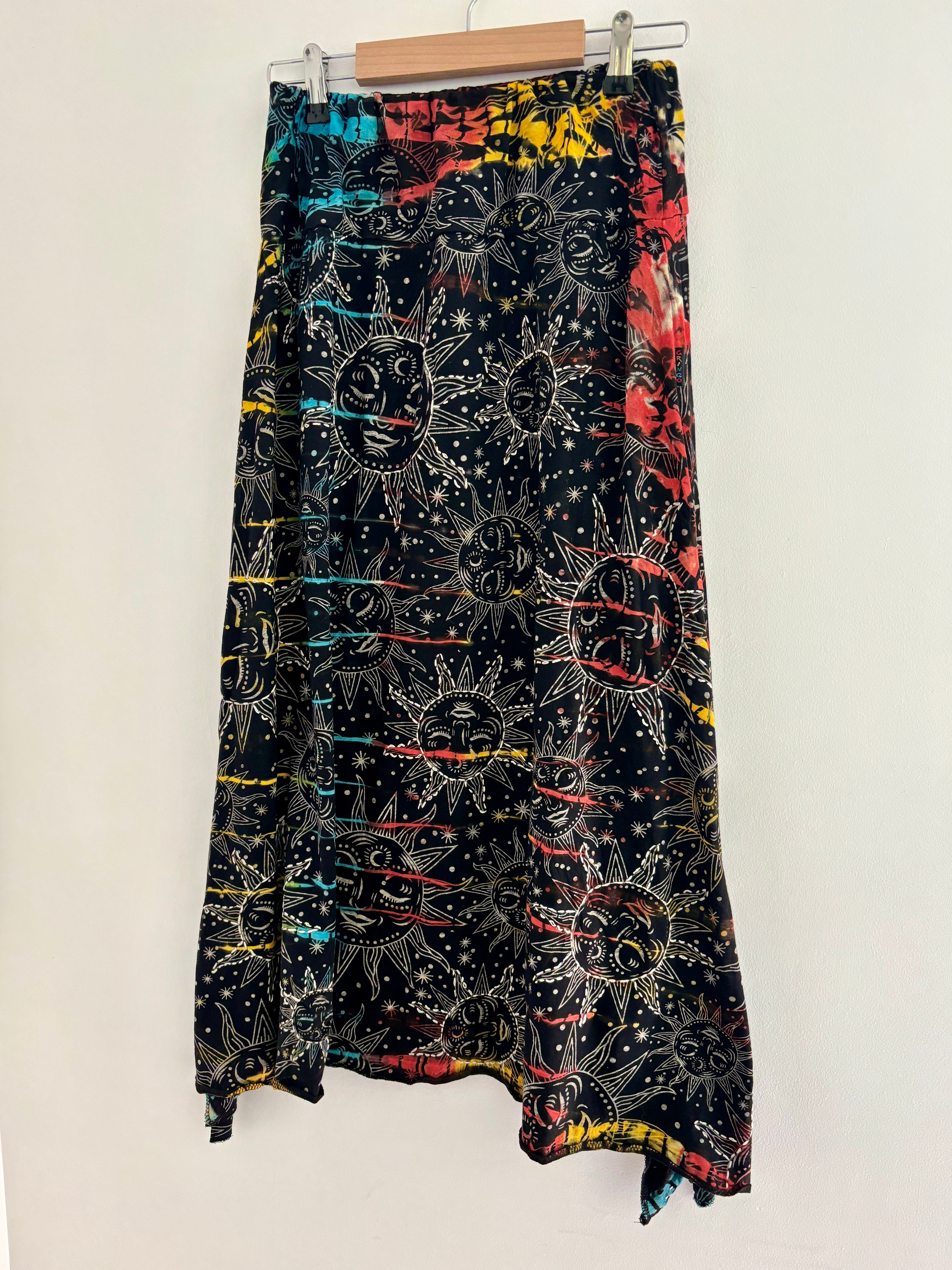 This magical midi skirt is made from from black celestial fabric dyed in magical colours. It has an elasticated waist, with an uneven hem giving a fairy look.