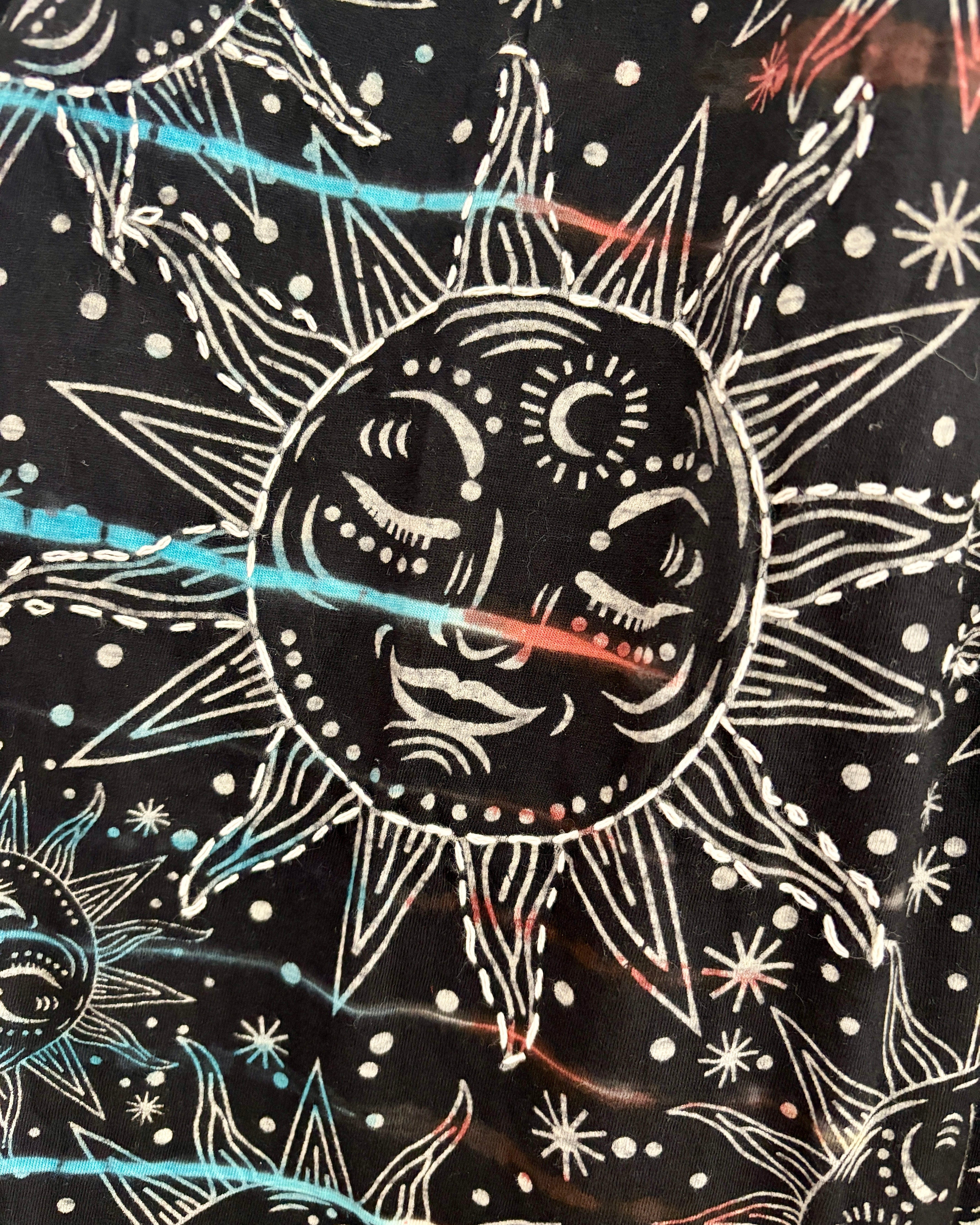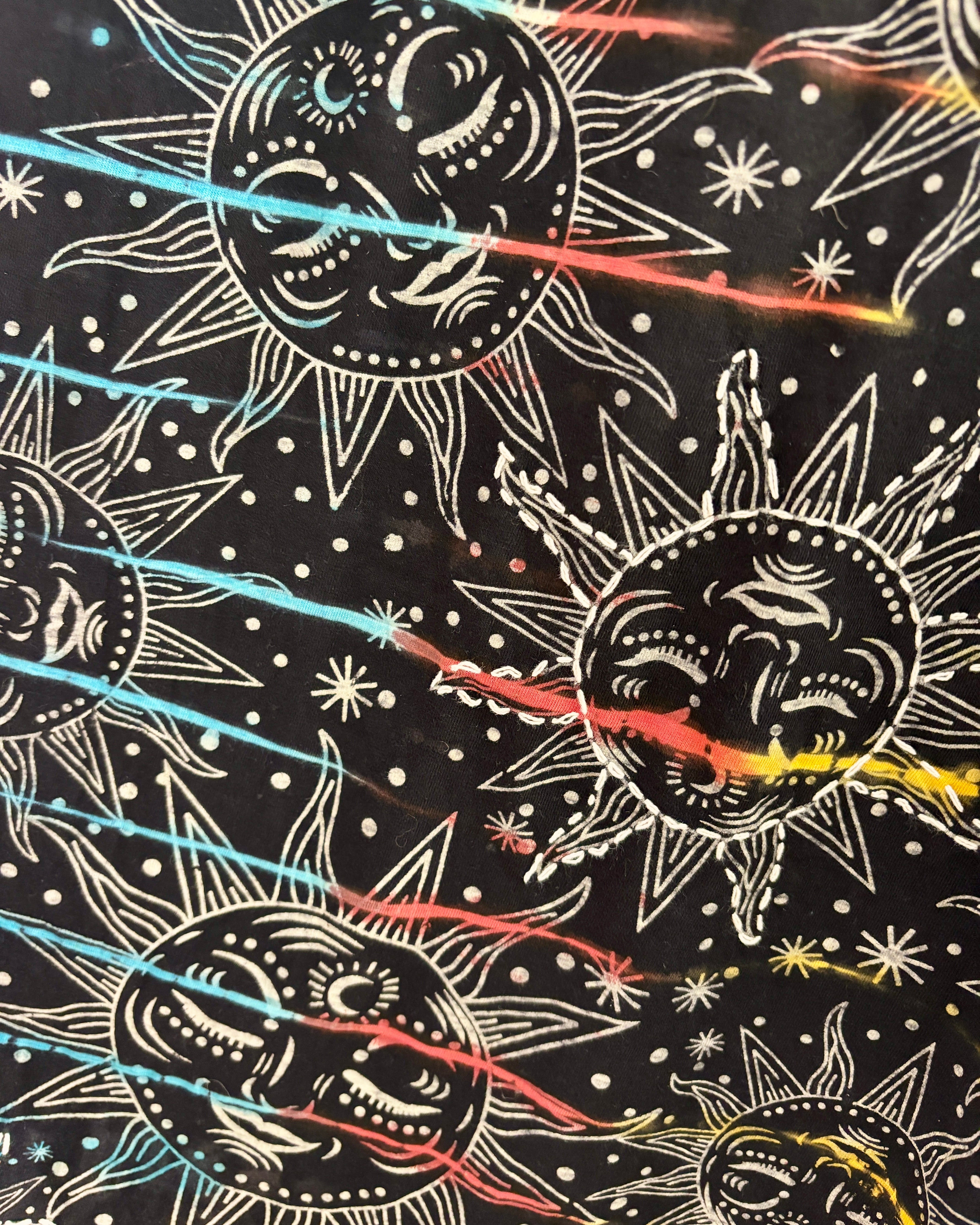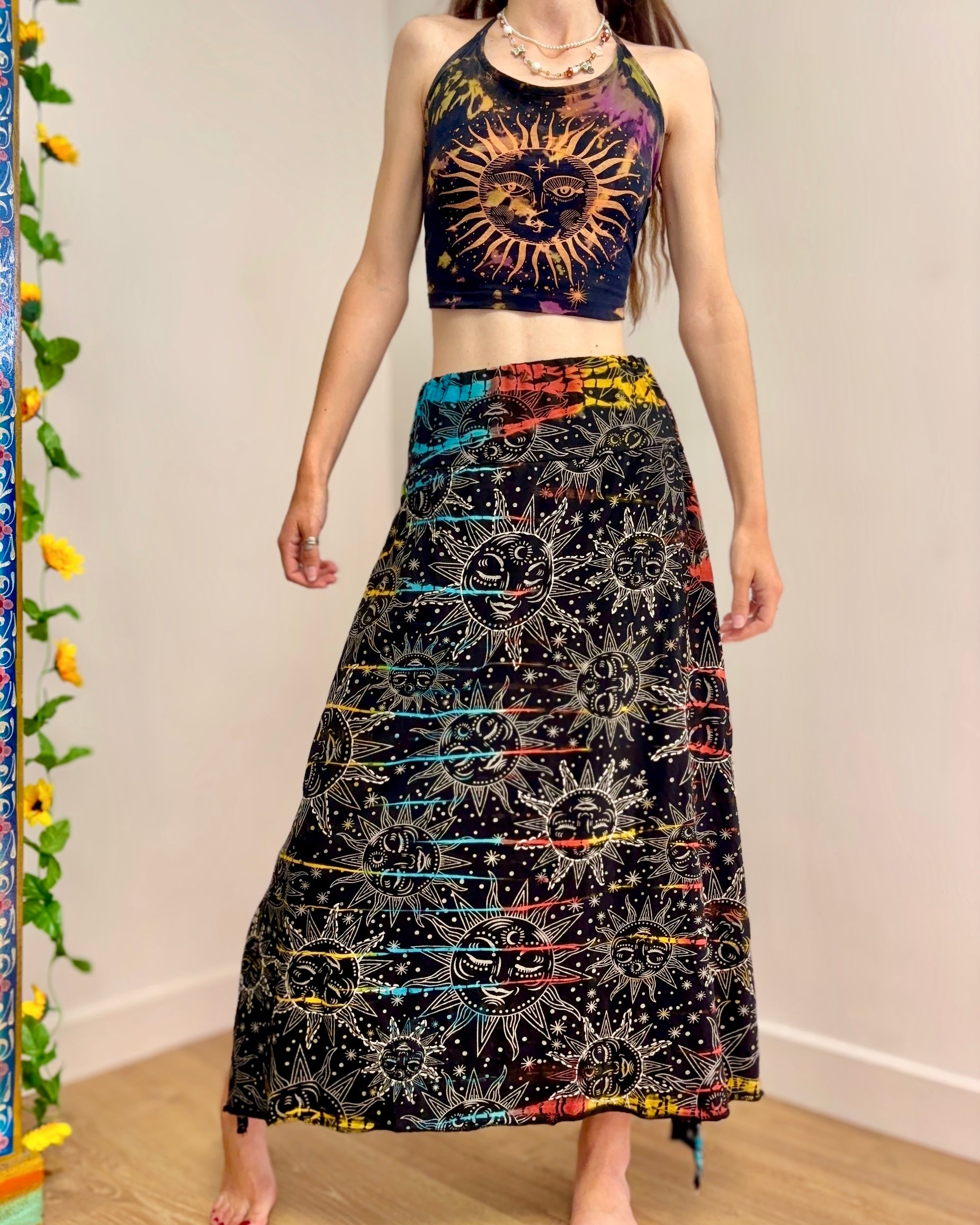 This magical midi skirt is made from from black celestial fabric dyed in magical colours. It has an elasticated waist, with an uneven hem giving a fairy look.