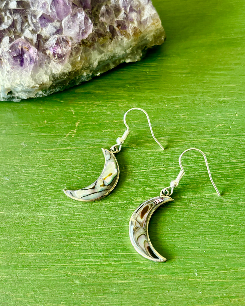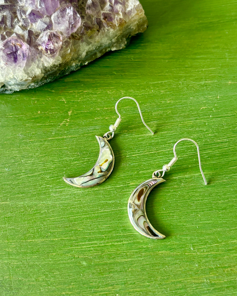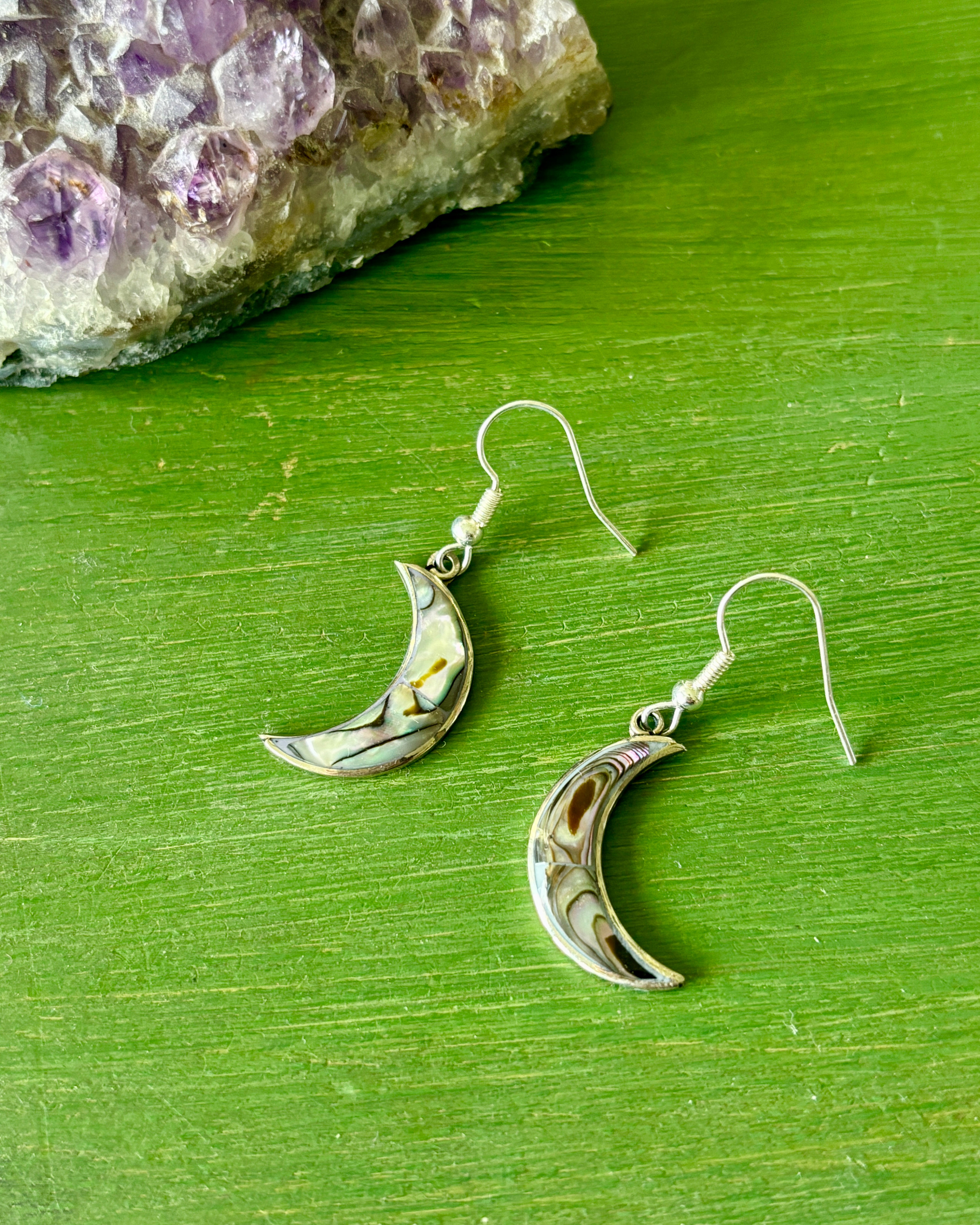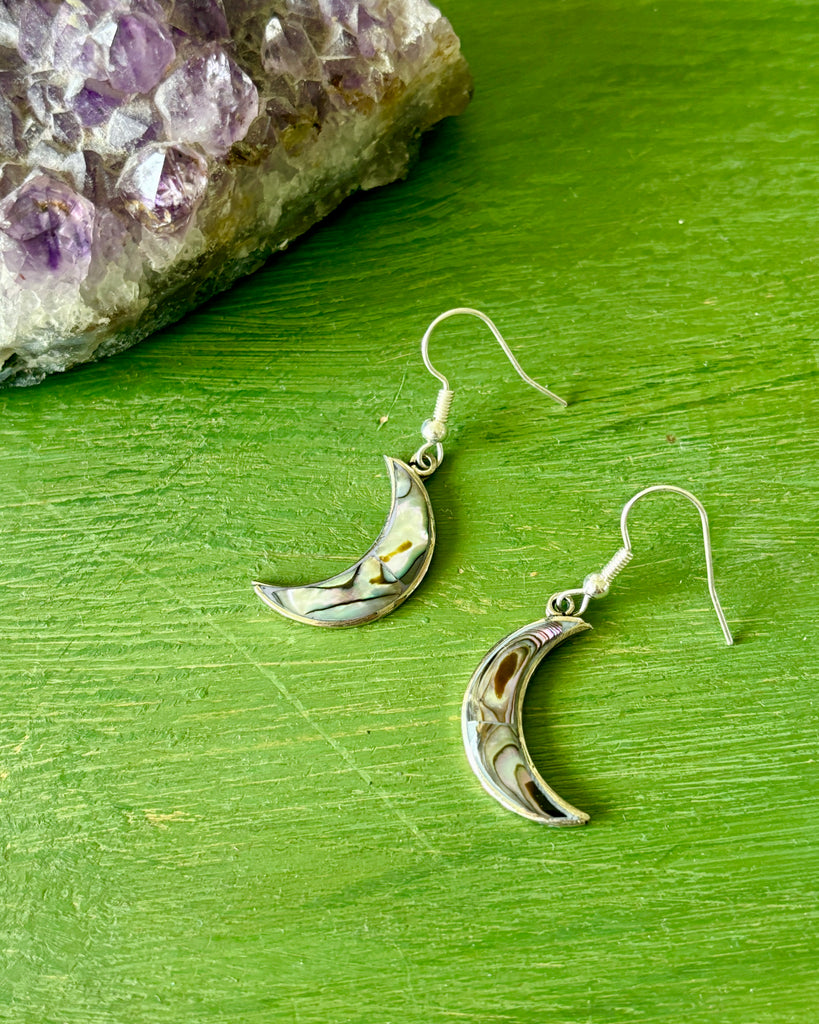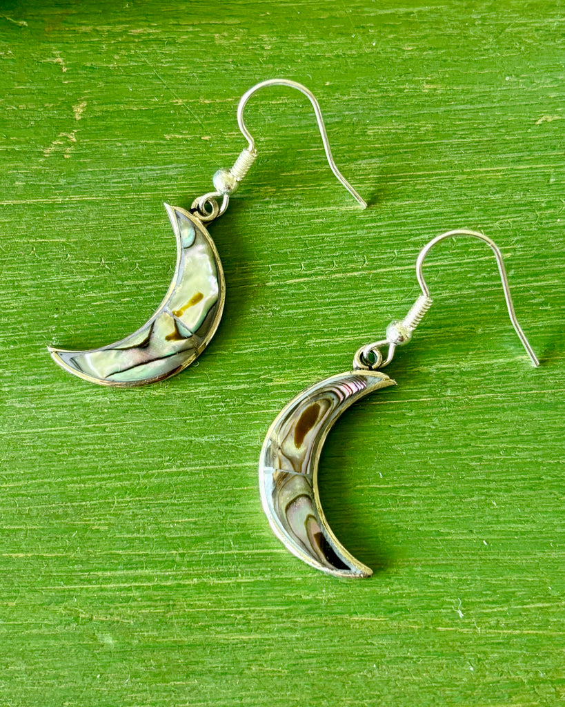 Moon Earrings made from magical Abalone shell. They have silver plated hooks & measure 5cm in length.