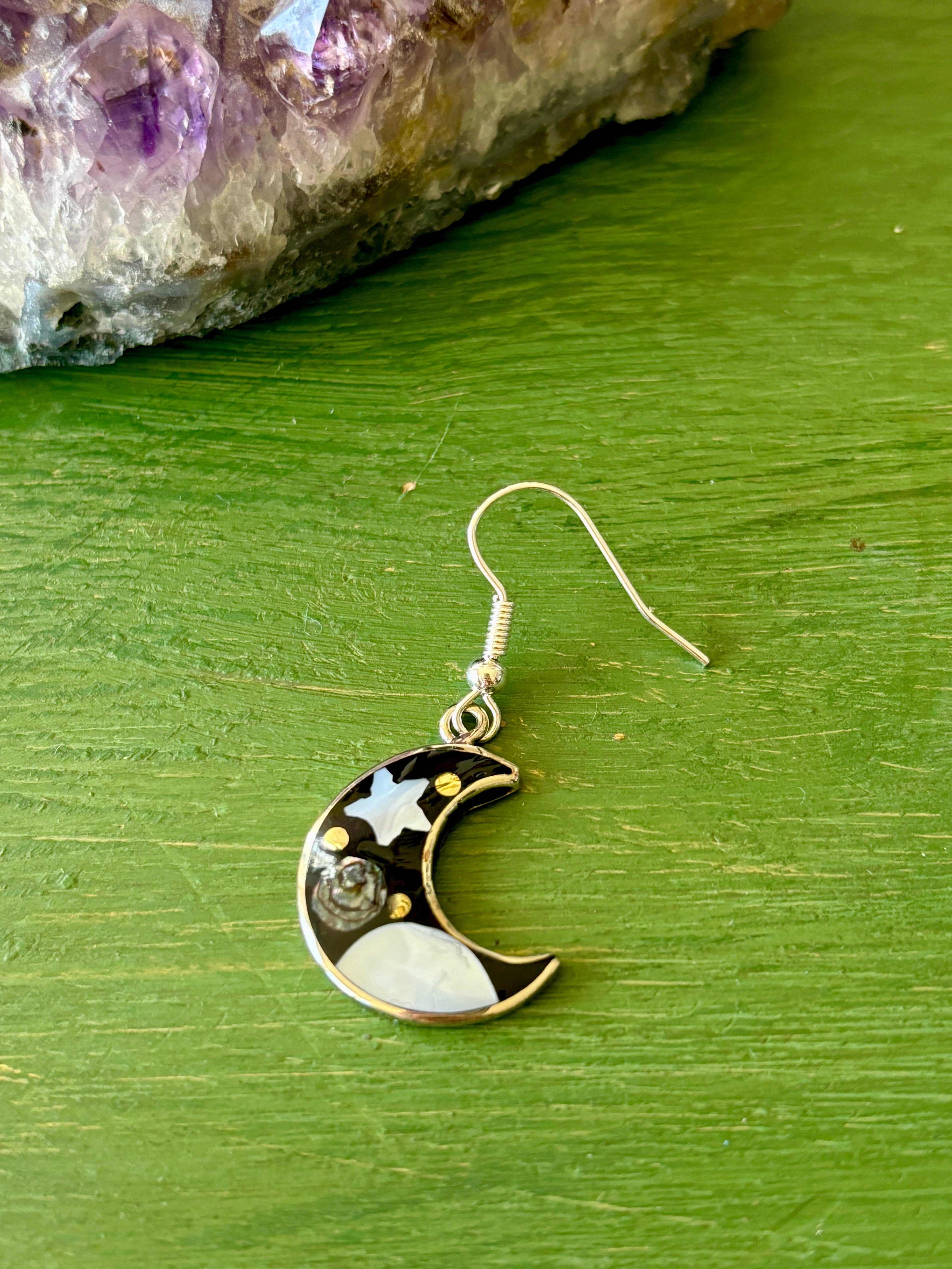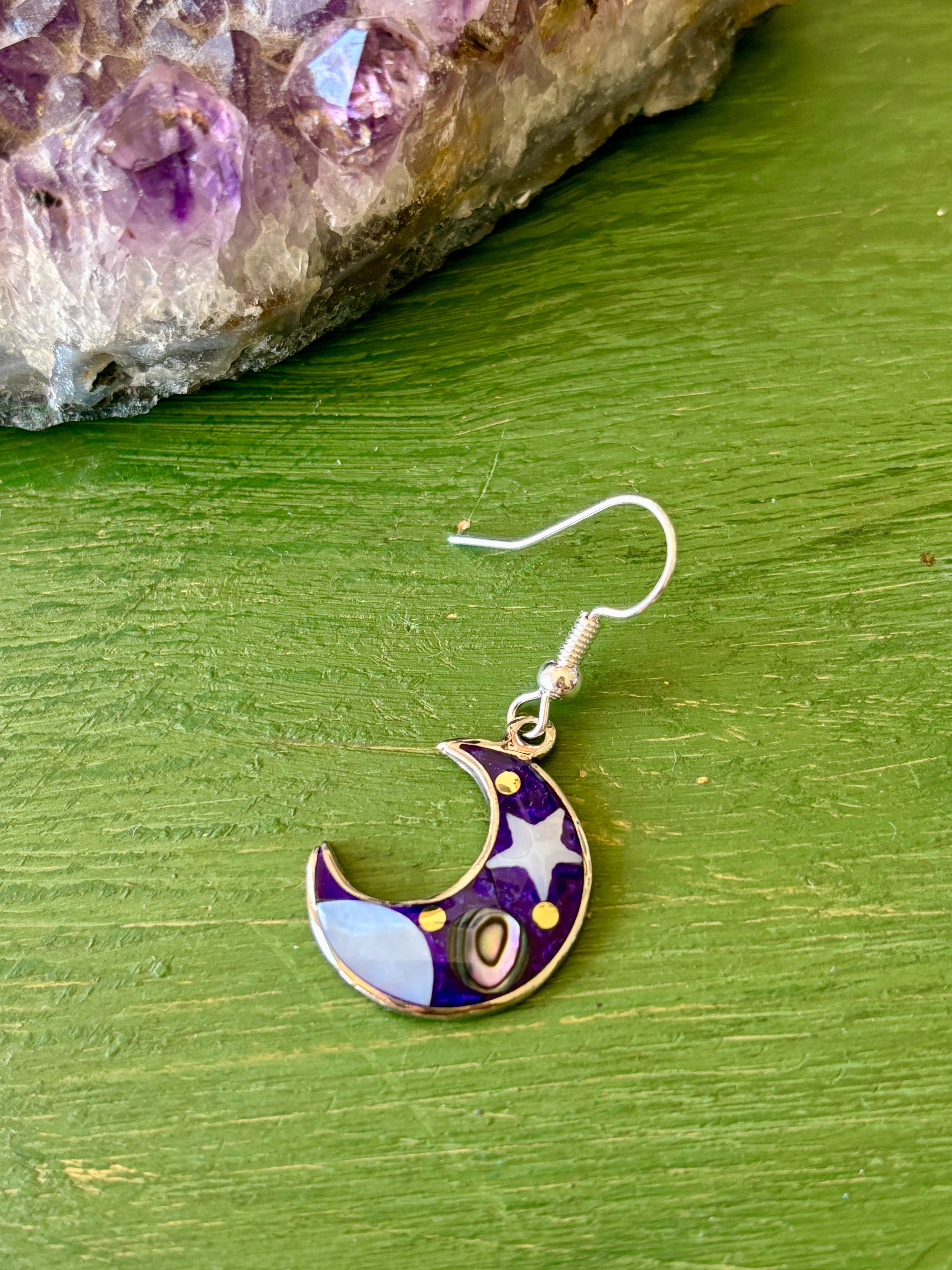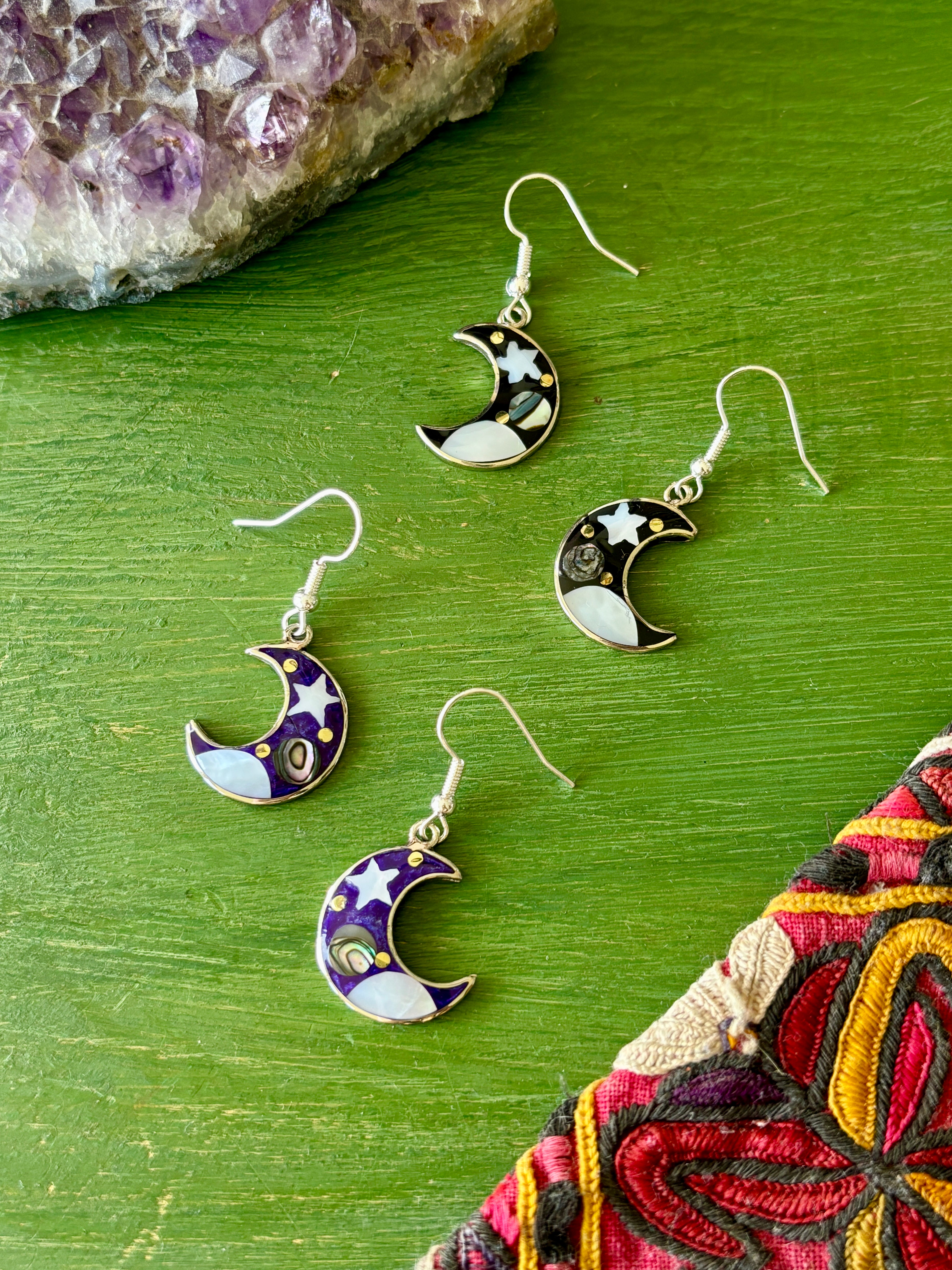 Our beautiful Moonlight Crescent Earrings show moons and stars made from Abalone shell set in an eye-catching black moon design. They have silver plated hooks & measure 4cm in length. Available in black or purple!