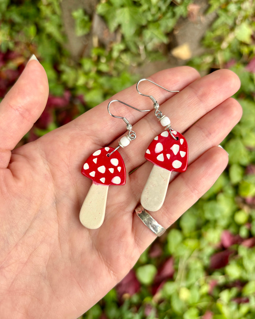 These mushroom earrings are made from hand-carved soapstone and are painted in a classic fly agaric mushroom style. They measure 7cm in length.