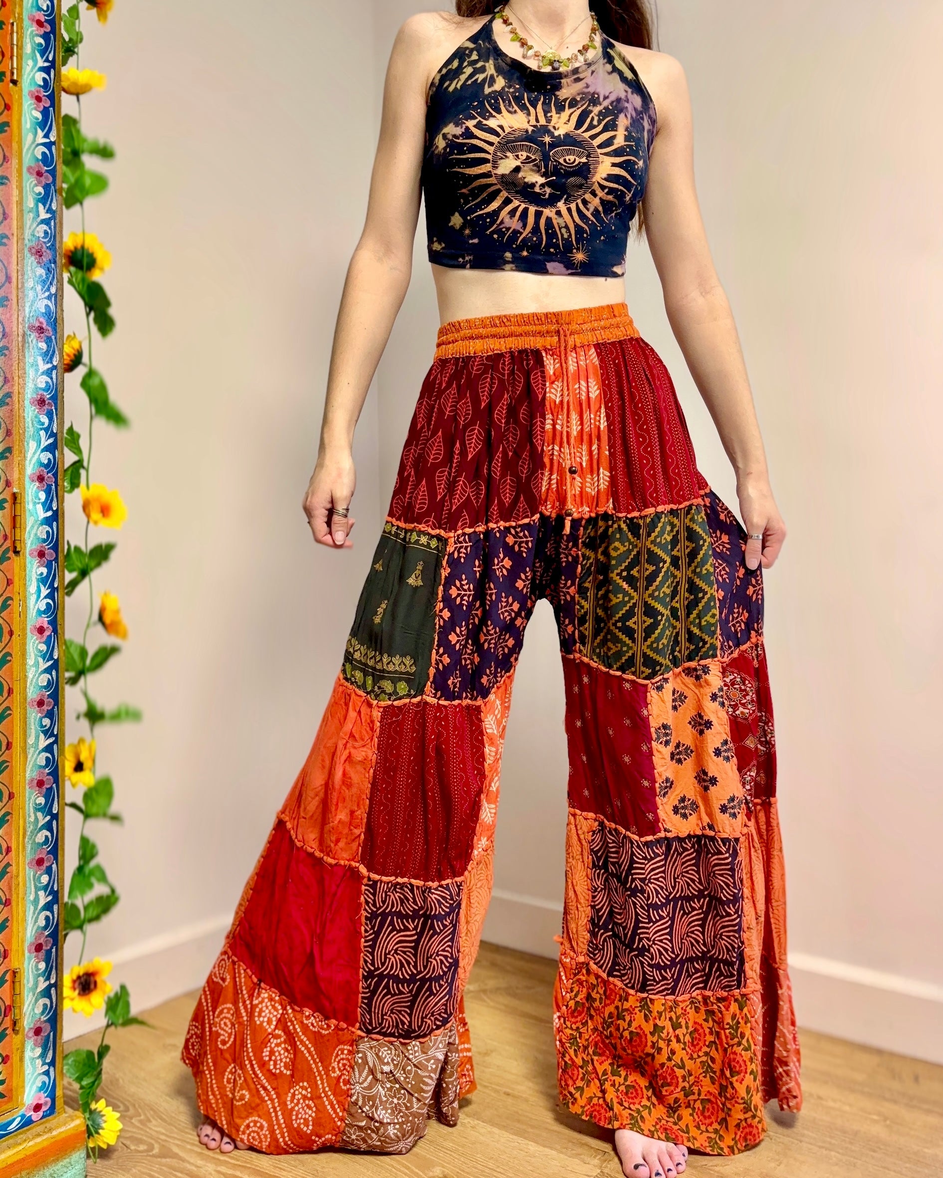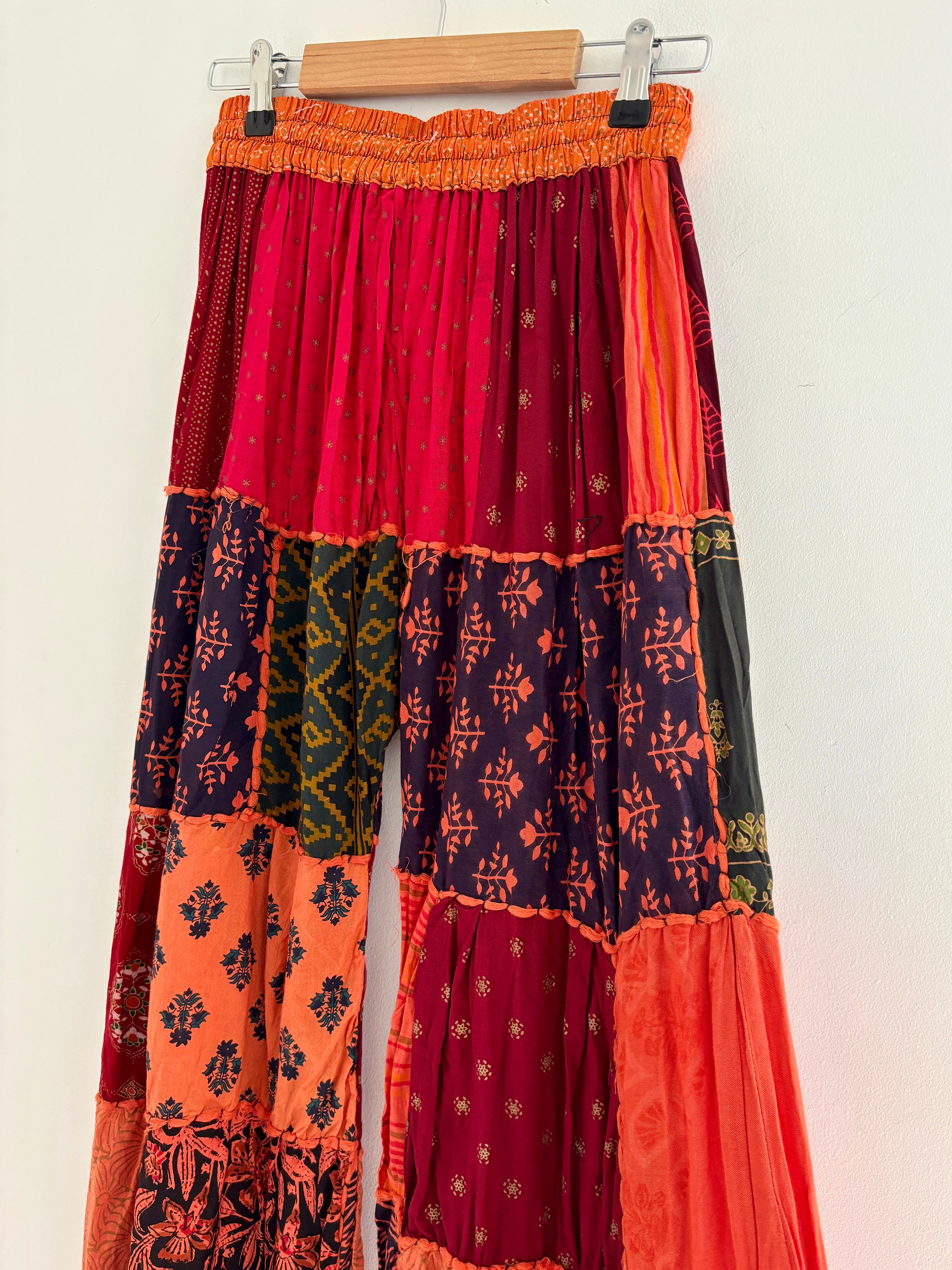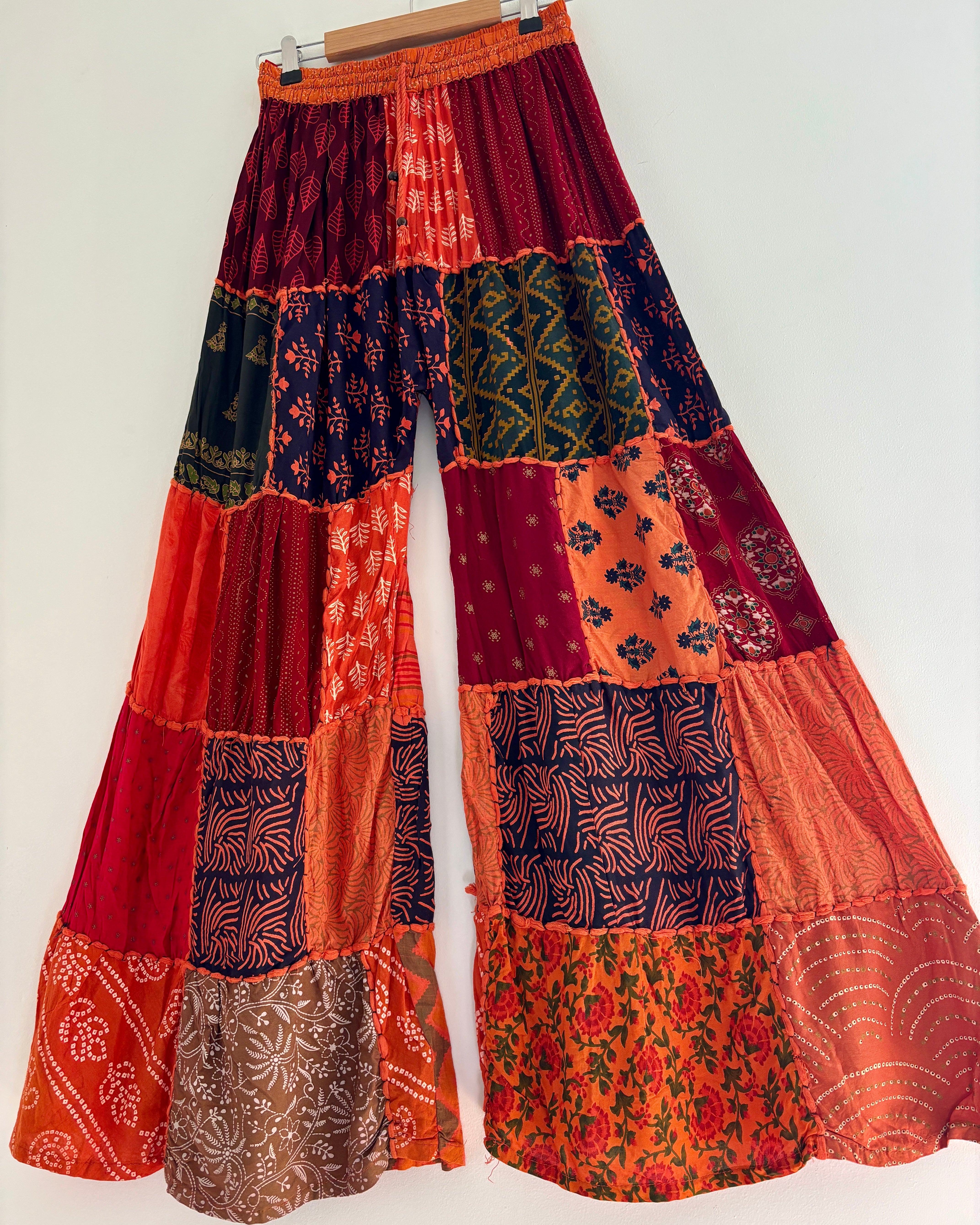 These palazzo trousers are made from patches of orange fabric. They have wide legs, have an elasticated waist and two front pockets for a comfortable fit.