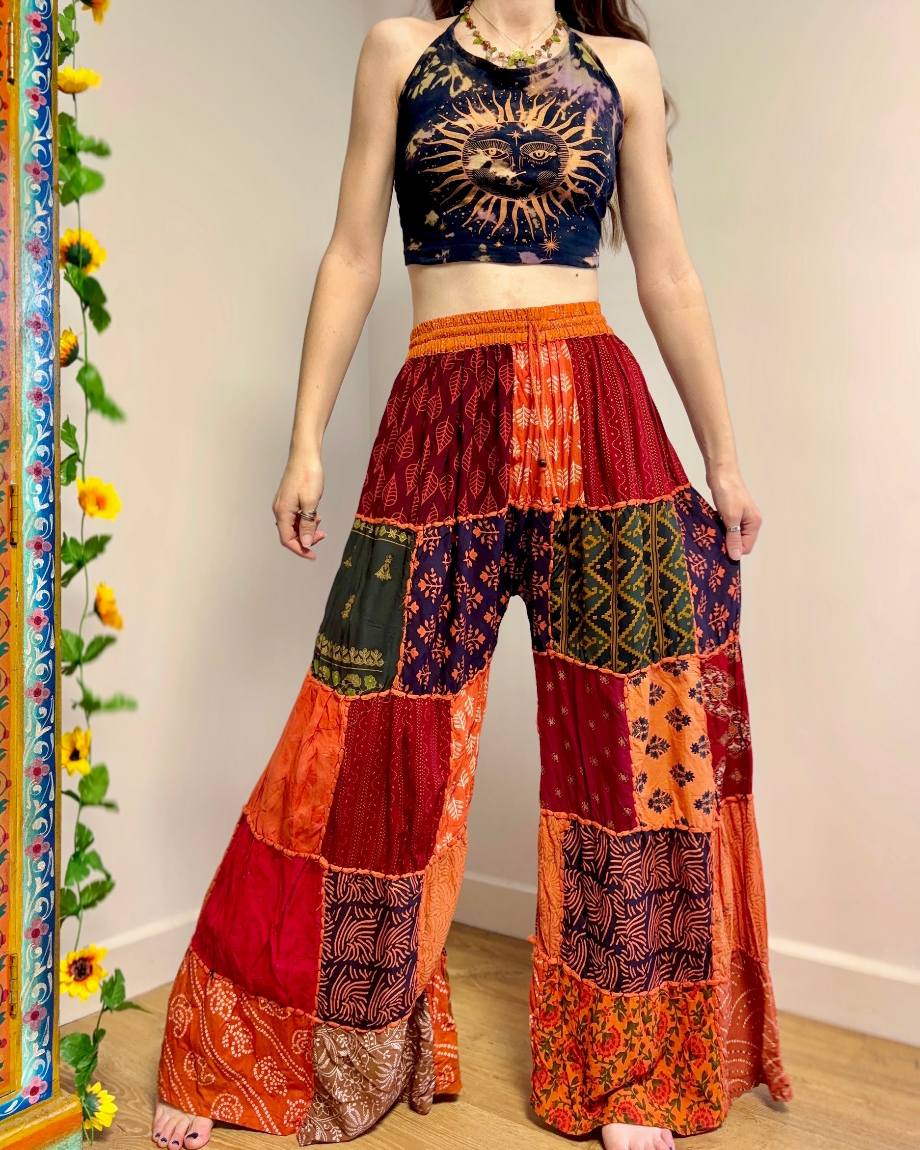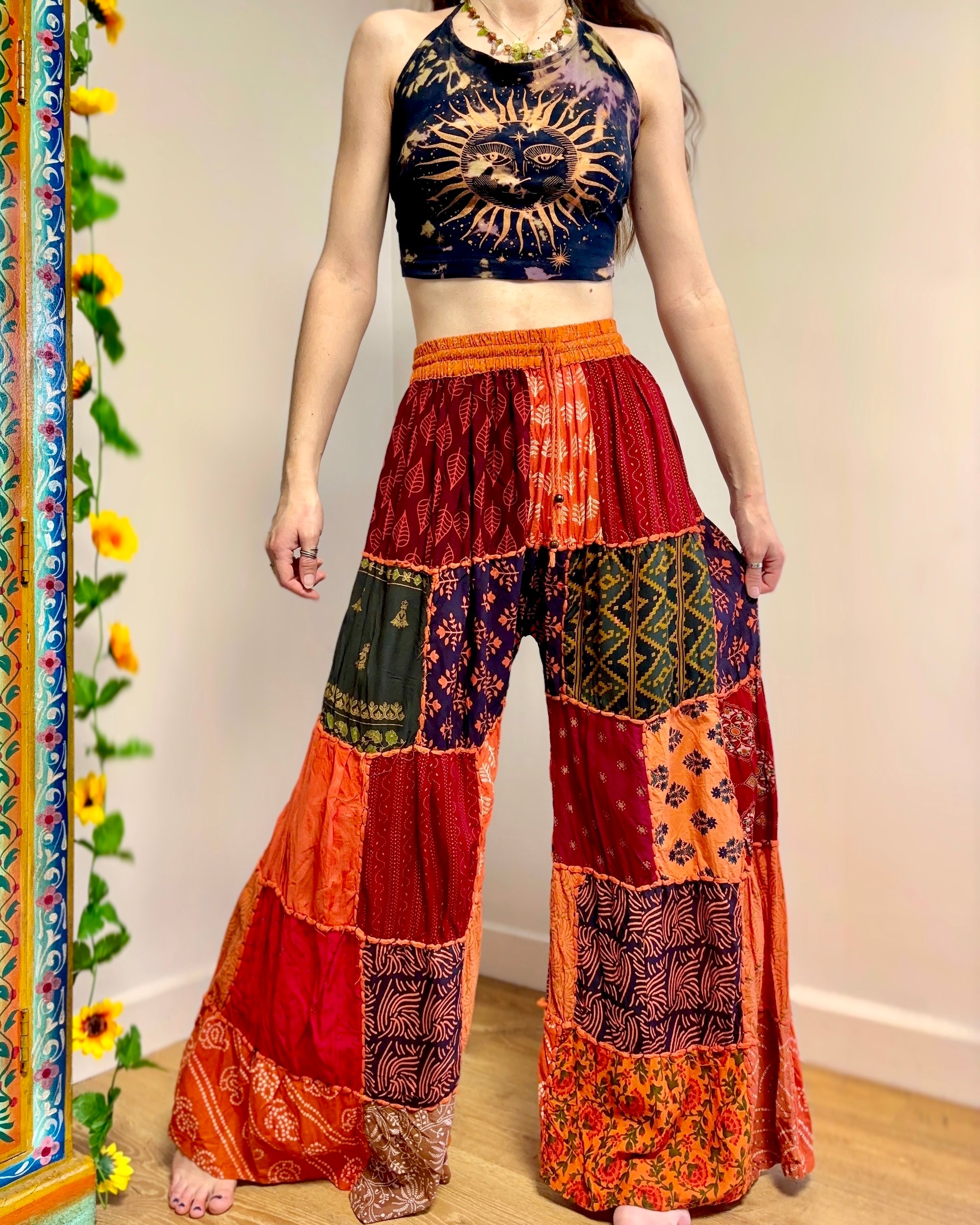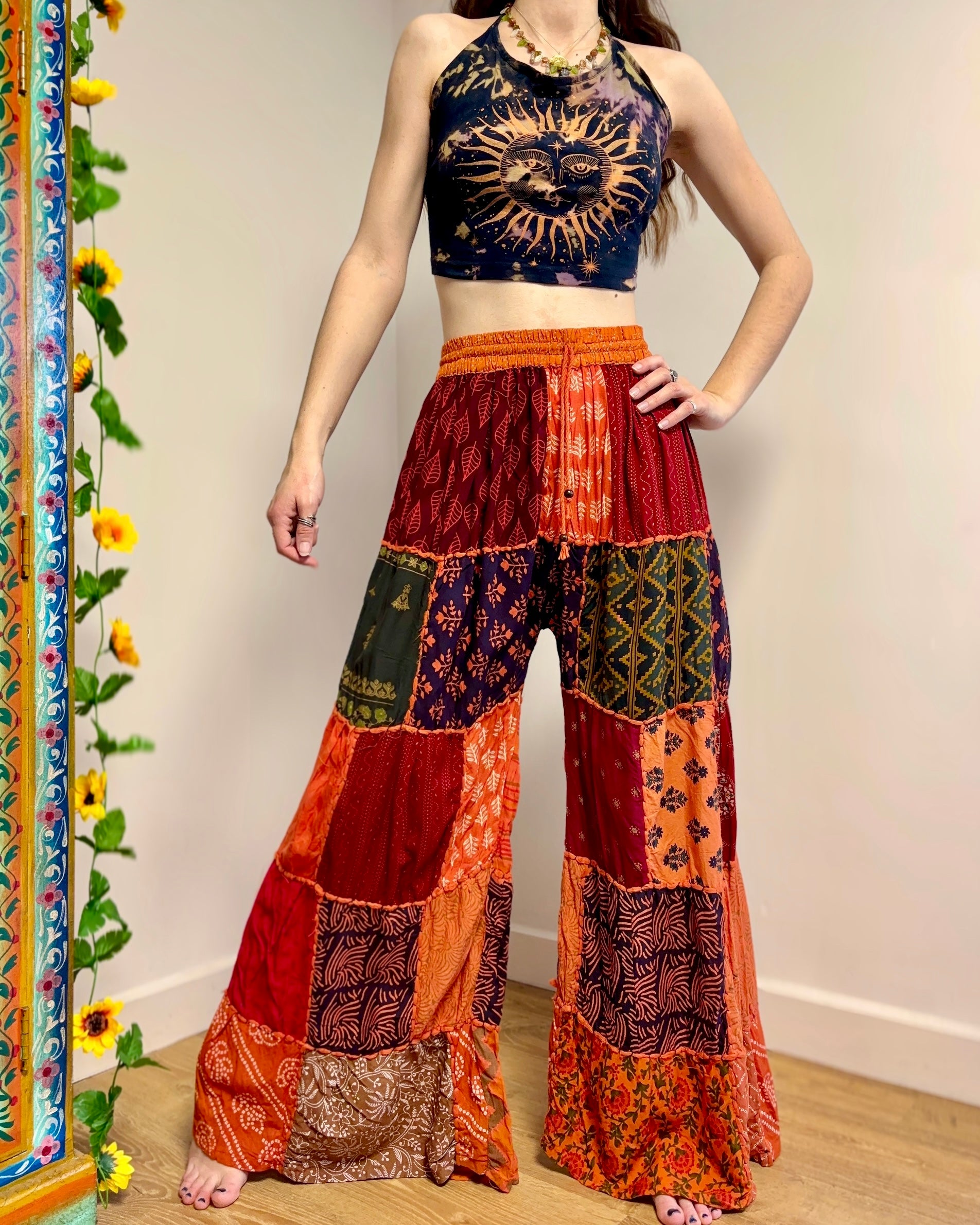 These palazzo trousers are made from patches of orange fabric. They have wide legs, have an elasticated waist and two front pockets for a comfortable fit.