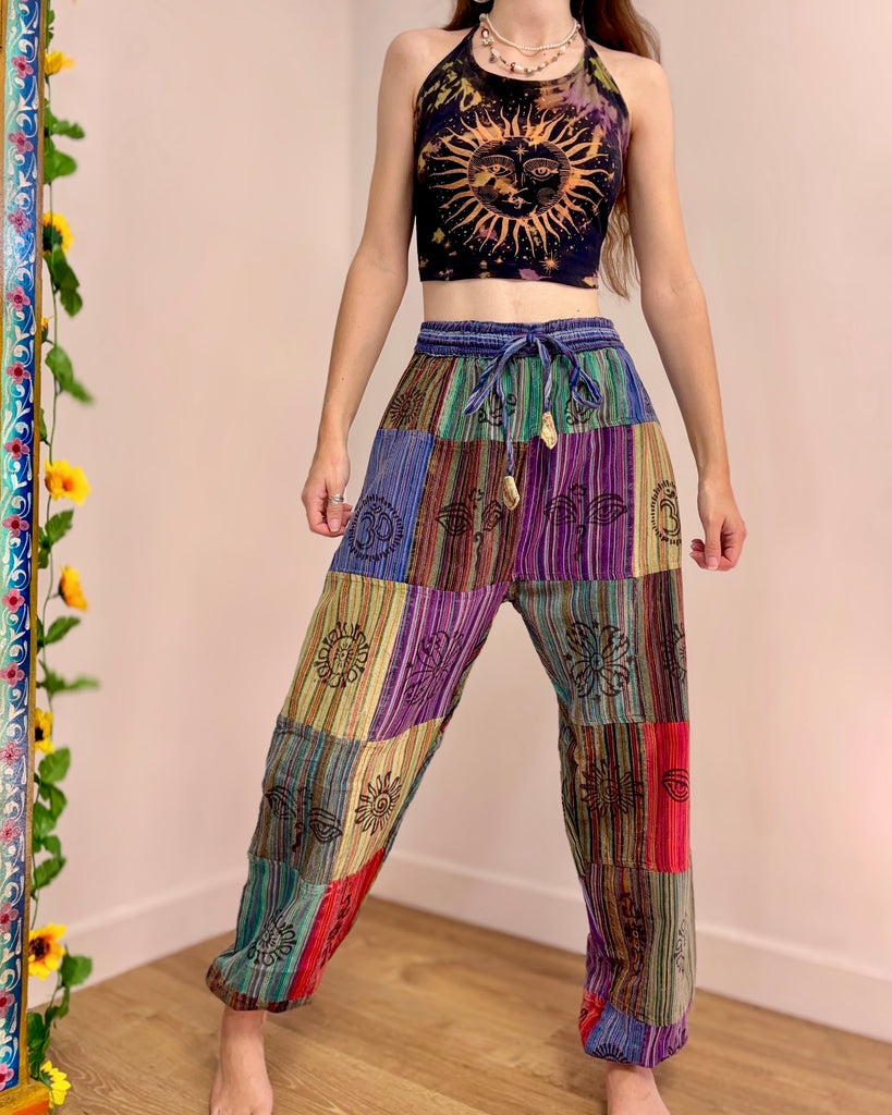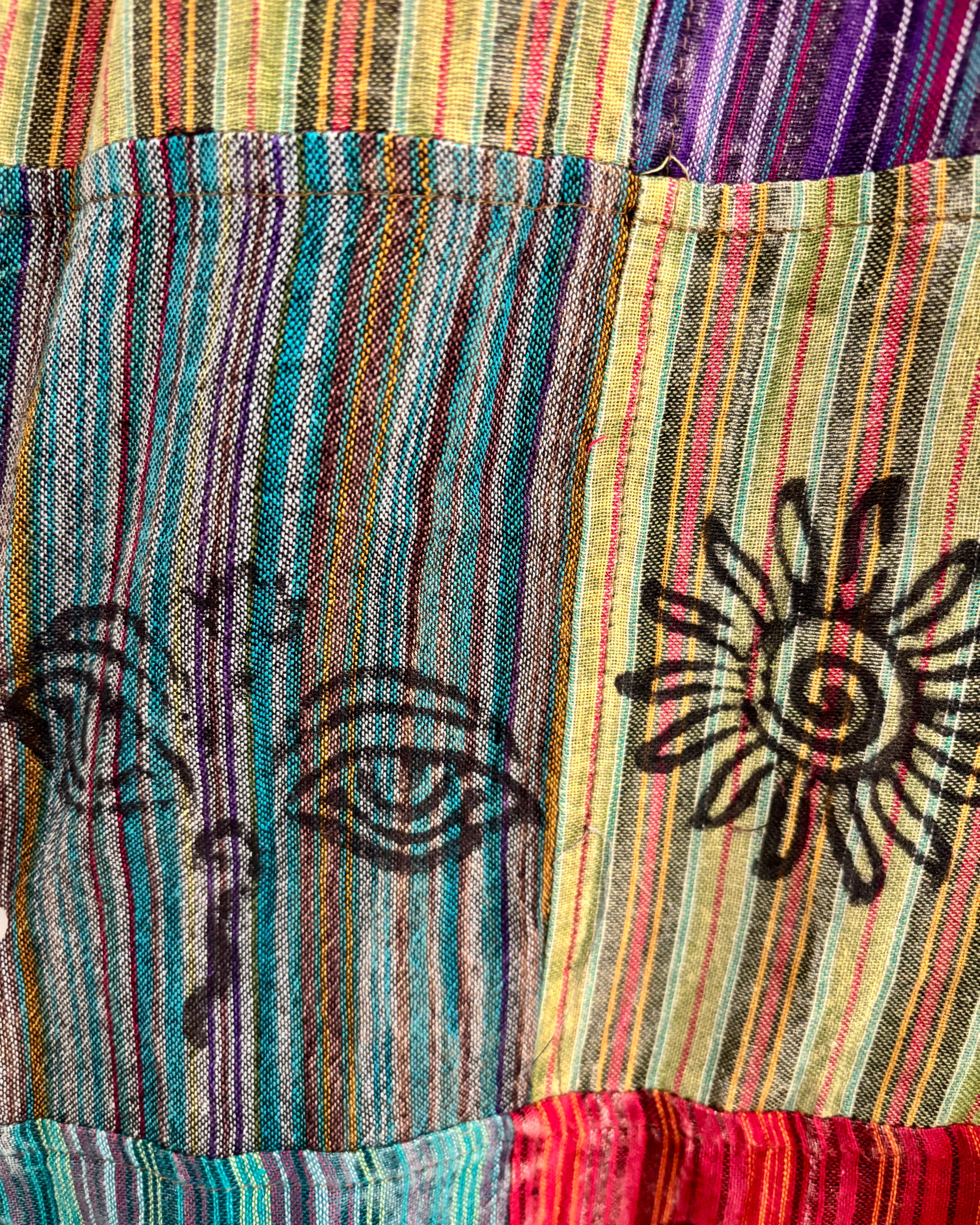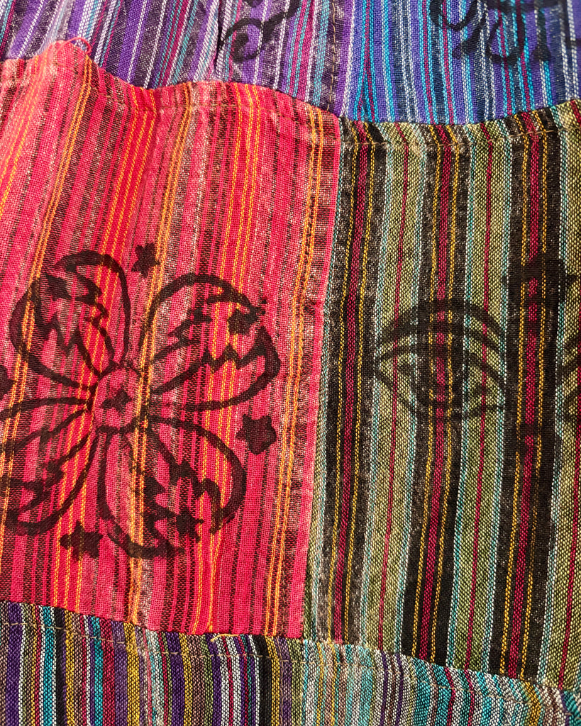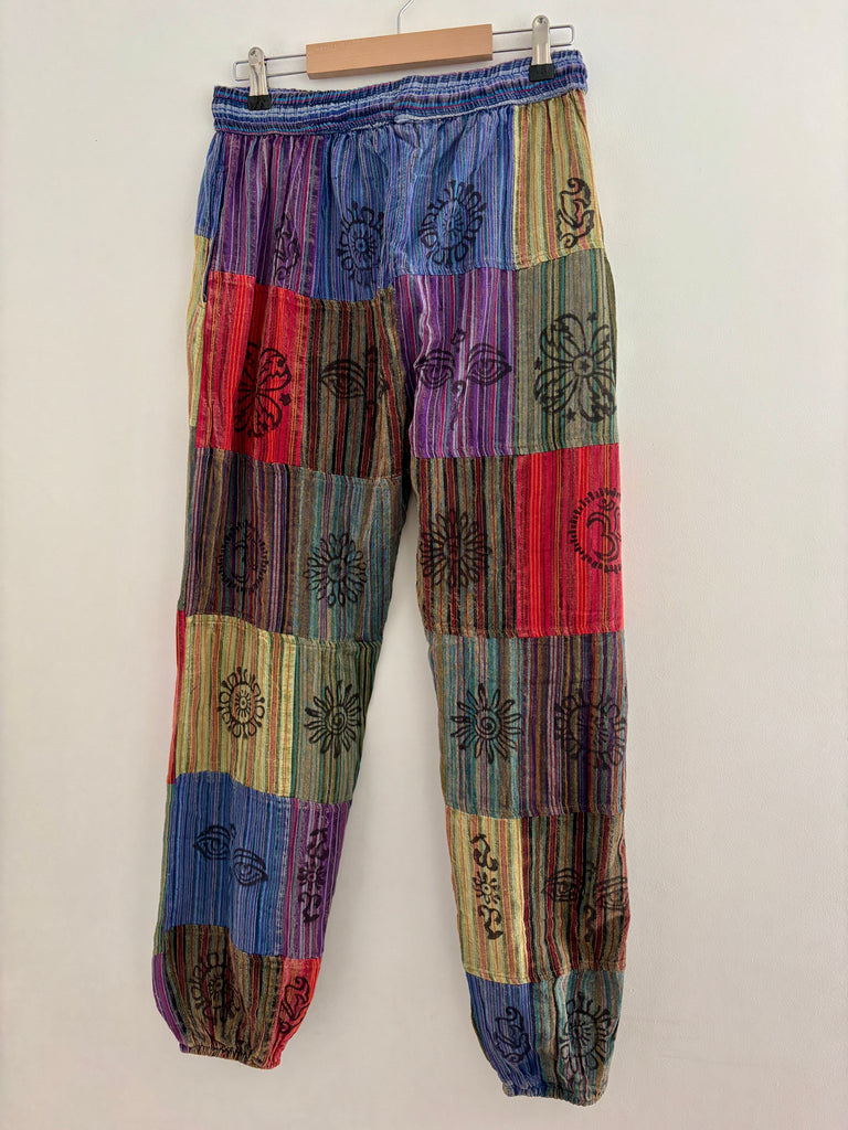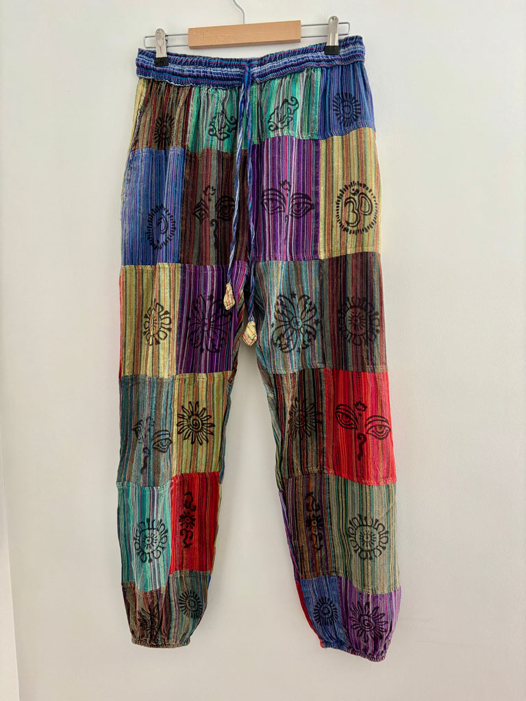 These beautiful harem pants are made from patches of Nepalese striped fabric in multi colours, and decorated with block-printed symbols.