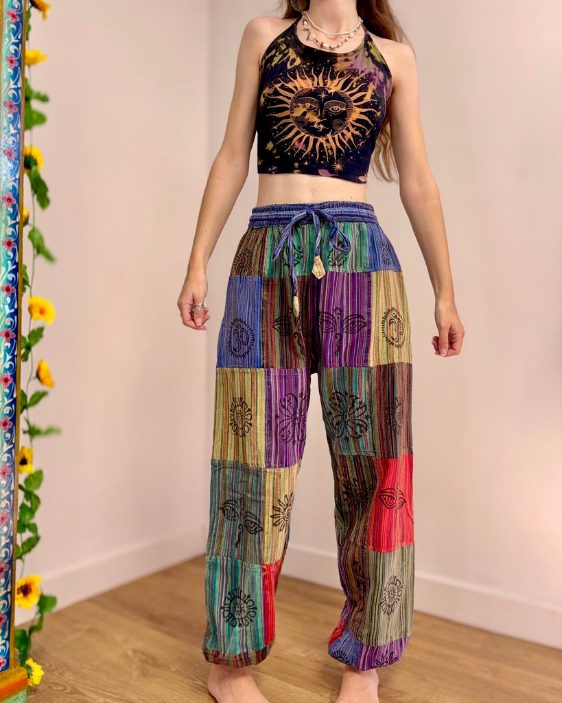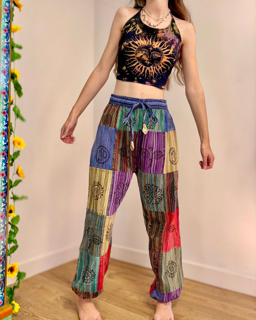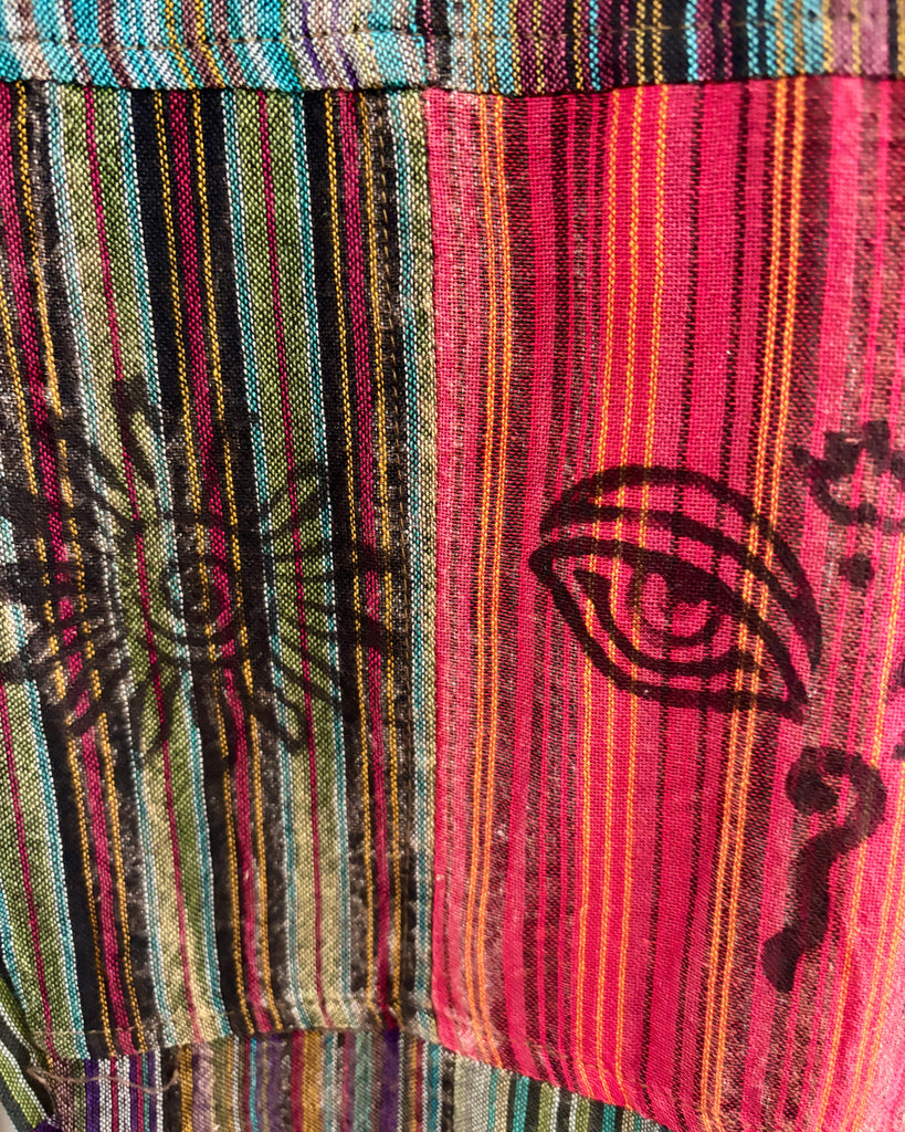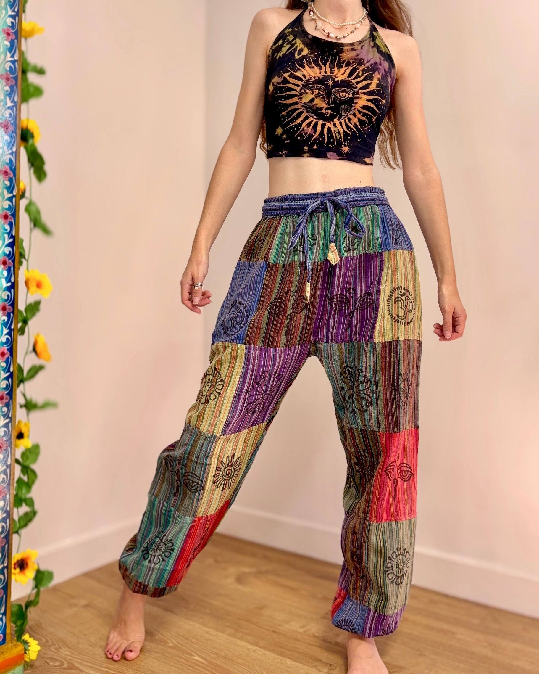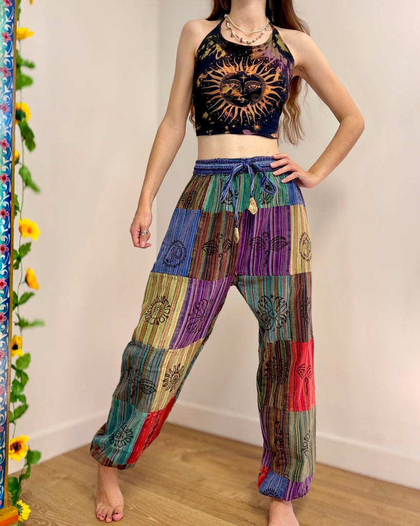 These beautiful harem pants are made from patches of Nepalese striped fabric in multi colours, and decorated with block-printed symbols.