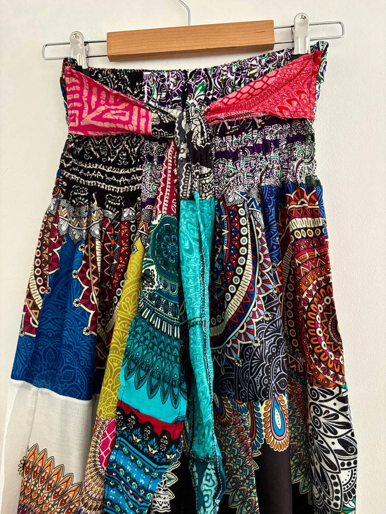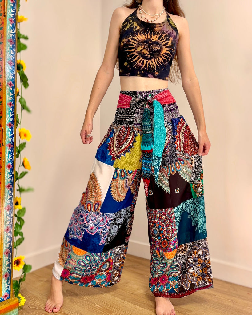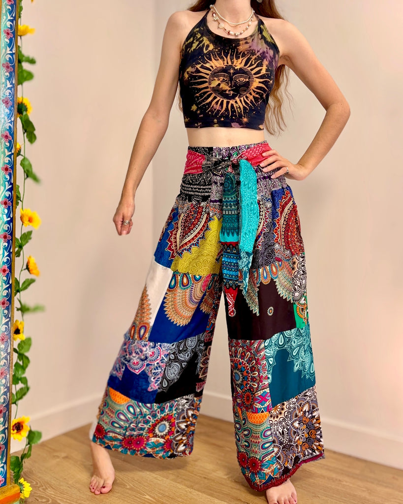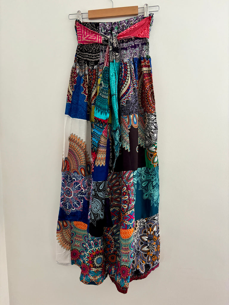 These beautiful palazzo trousers are made from patches of bright fabric made in a variety of designs. With an elasticated waist and wide flared bottoms, they provide a loose comfortable fit. They have a tie that can be worn at the front or back!