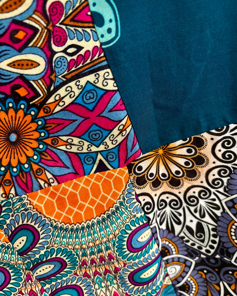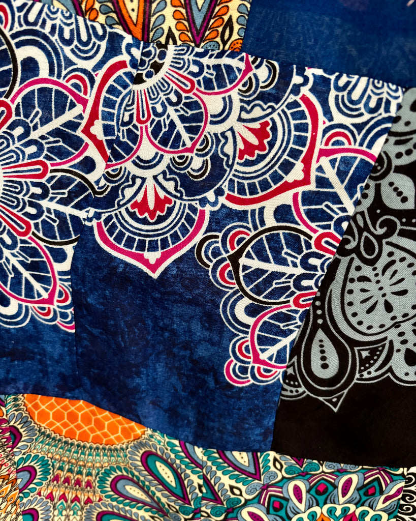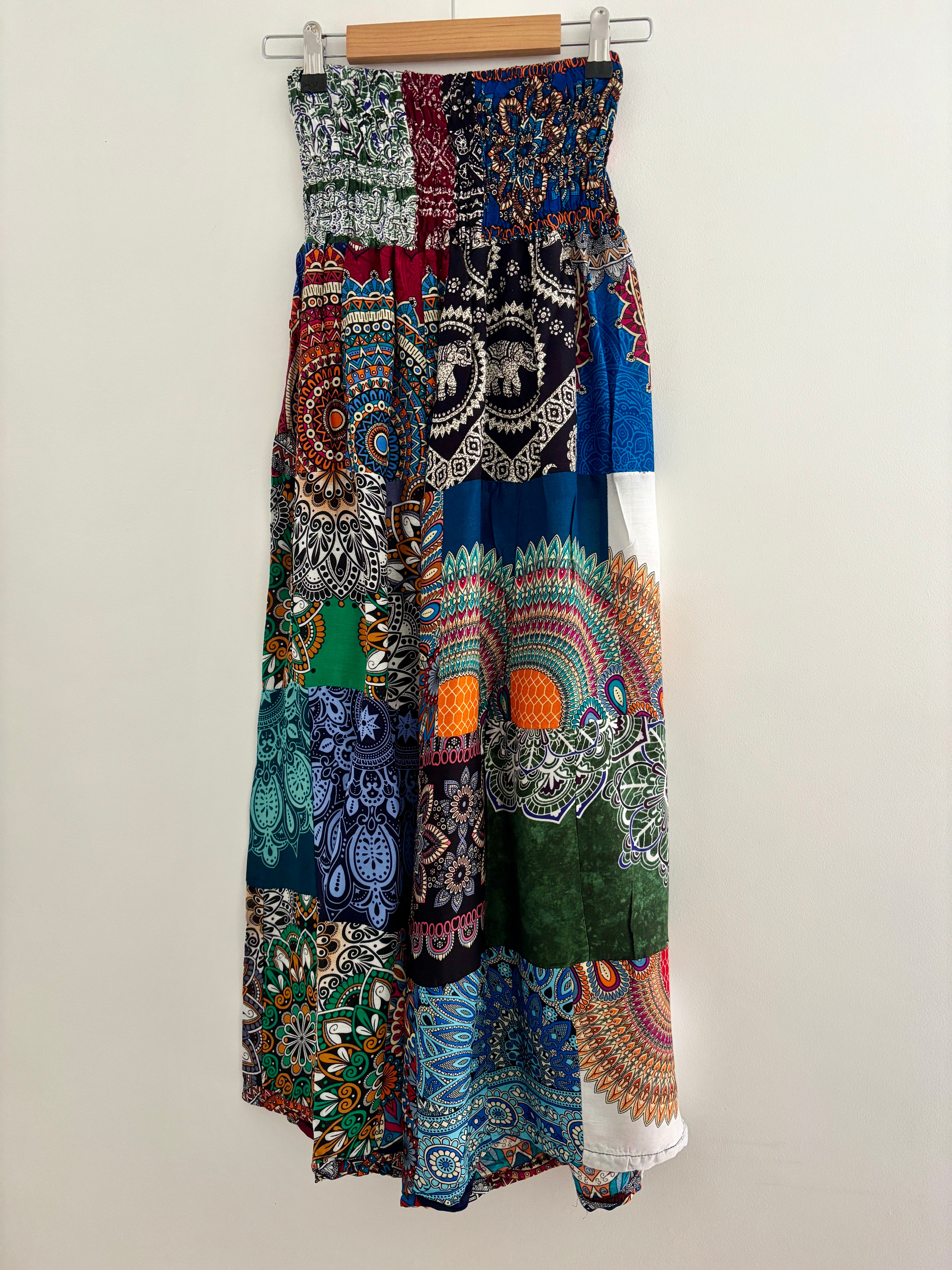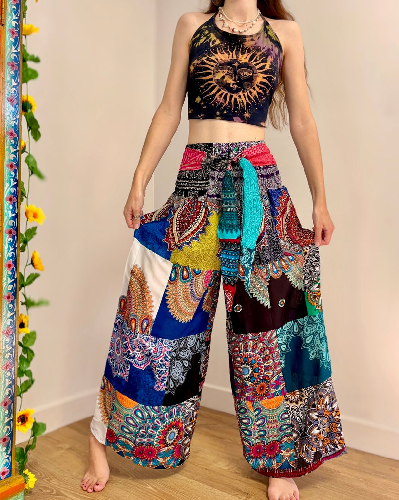 These beautiful palazzo trousers are made from patches of bright fabric made in a variety of designs. With an elasticated waist and wide flared bottoms, they provide a loose comfortable fit. They have a tie that can be worn at the front or back!