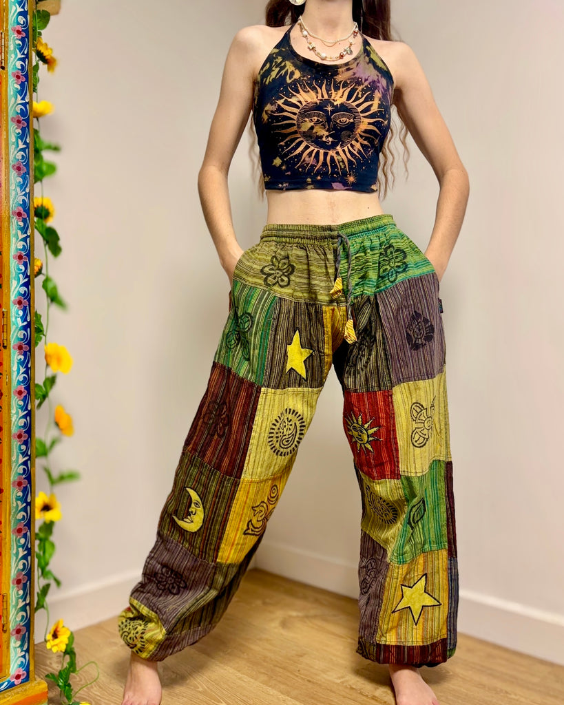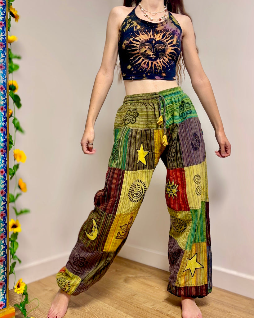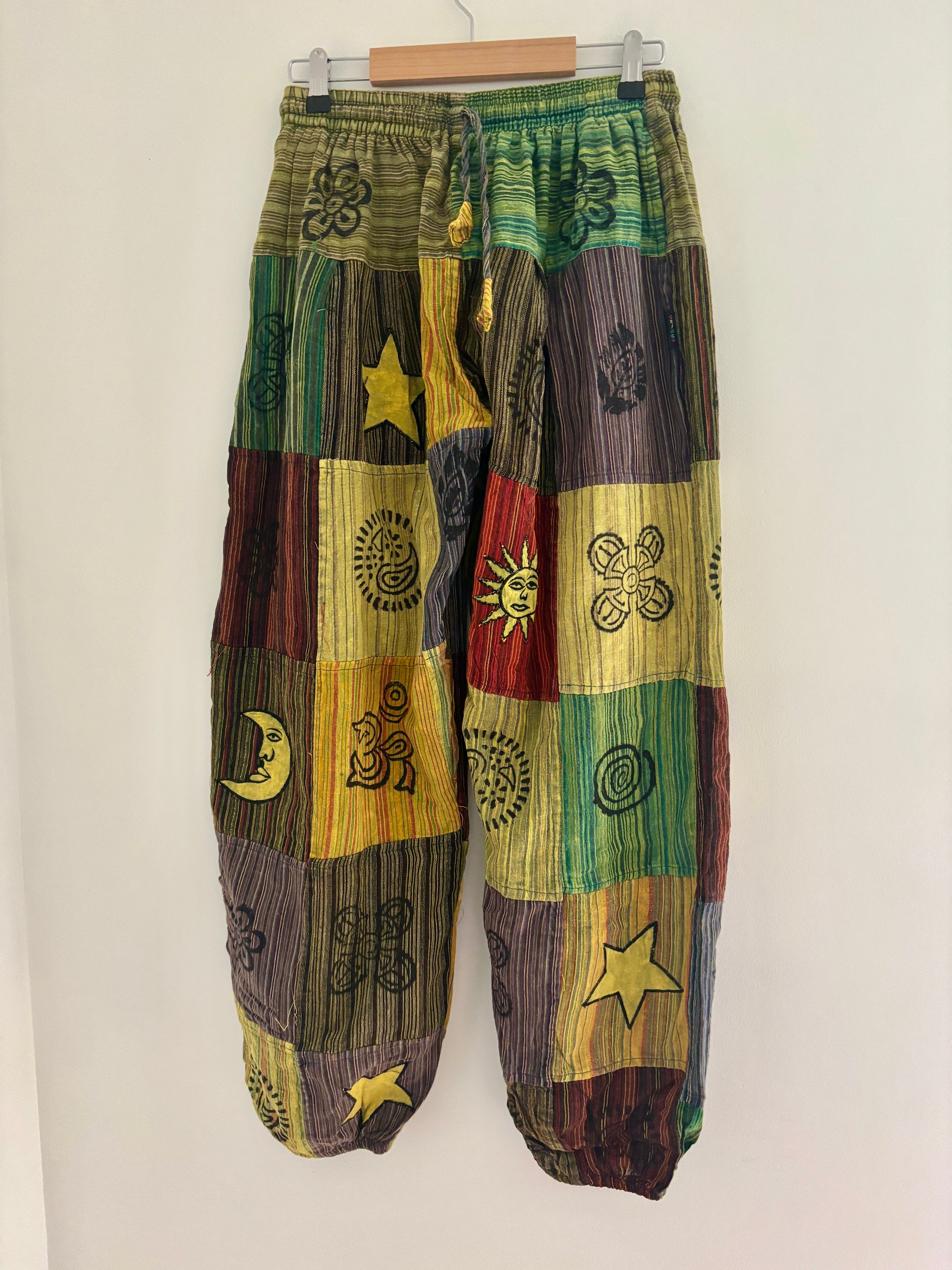 These magical harems are made from patchwork cotton fabric decorated with embroidered suns, moons & stars. They have an elasticated waist and 2 front pockets.