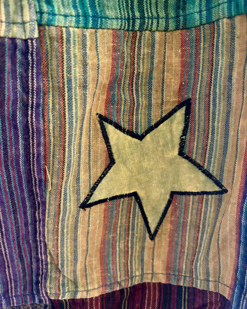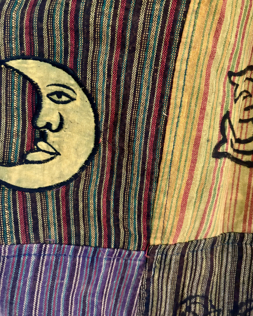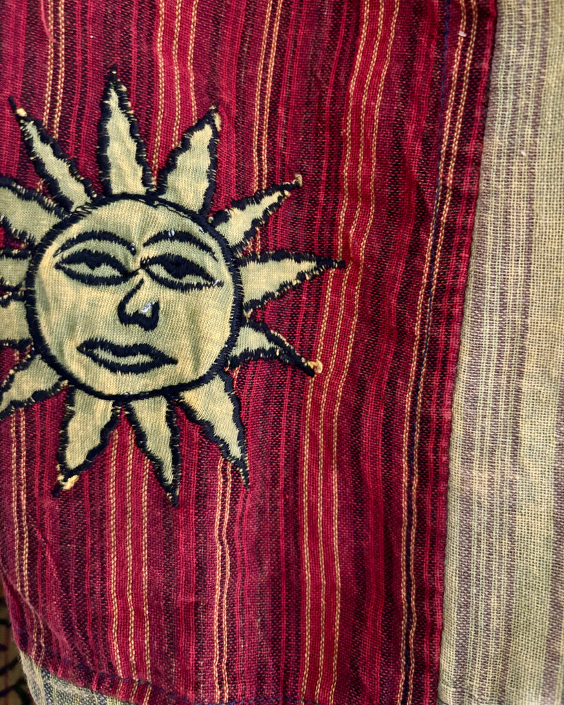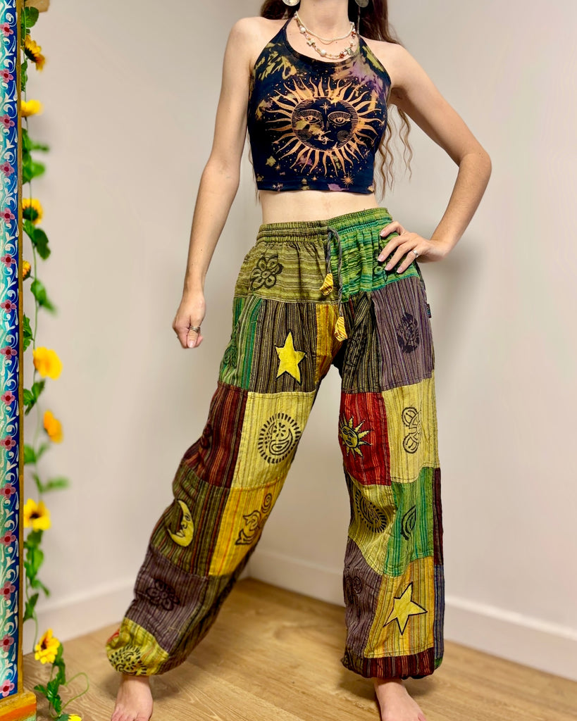 These magical harems are made from patchwork cotton fabric decorated with embroidered suns, moons & stars. They have an elasticated waist and 2 front pockets.