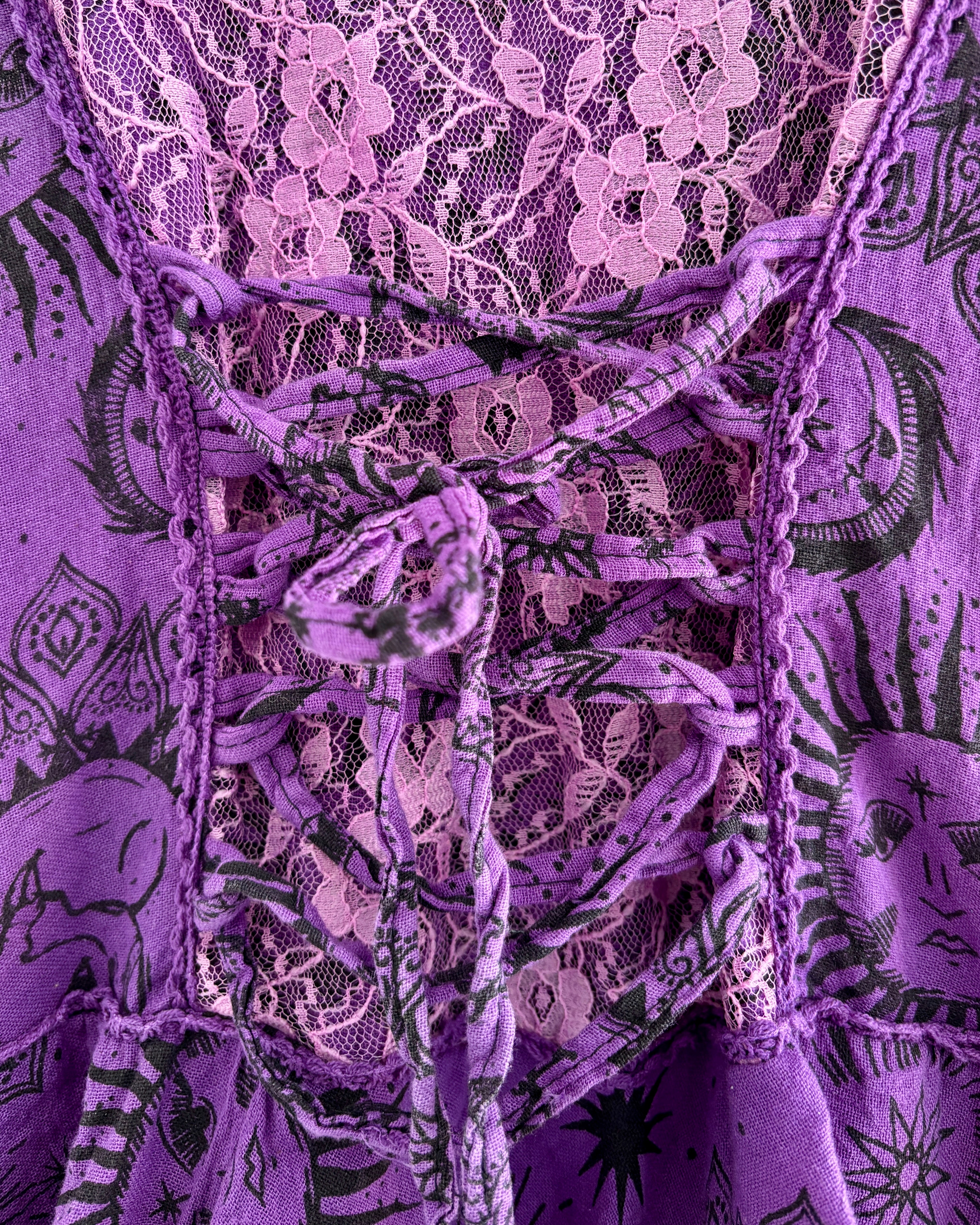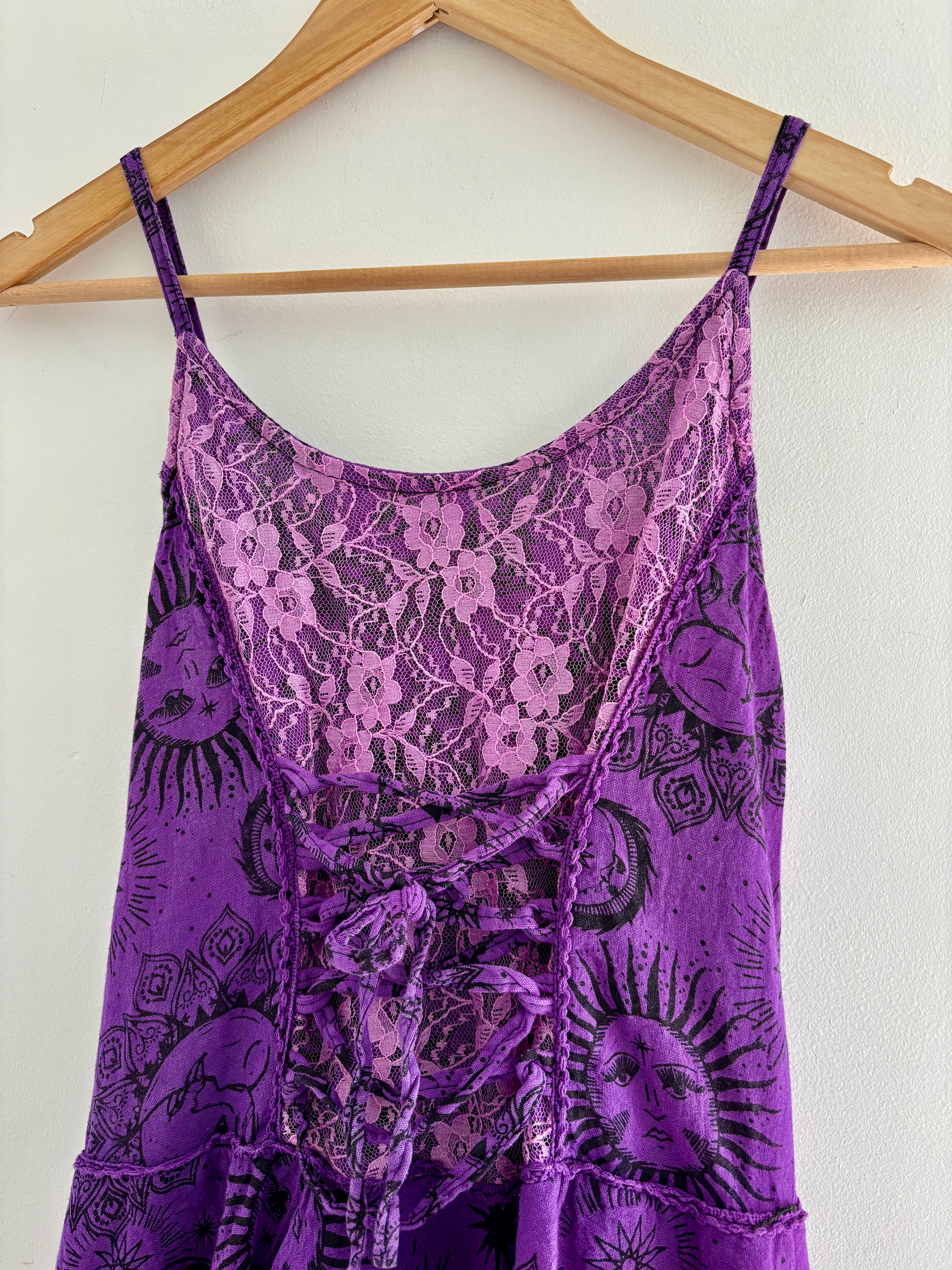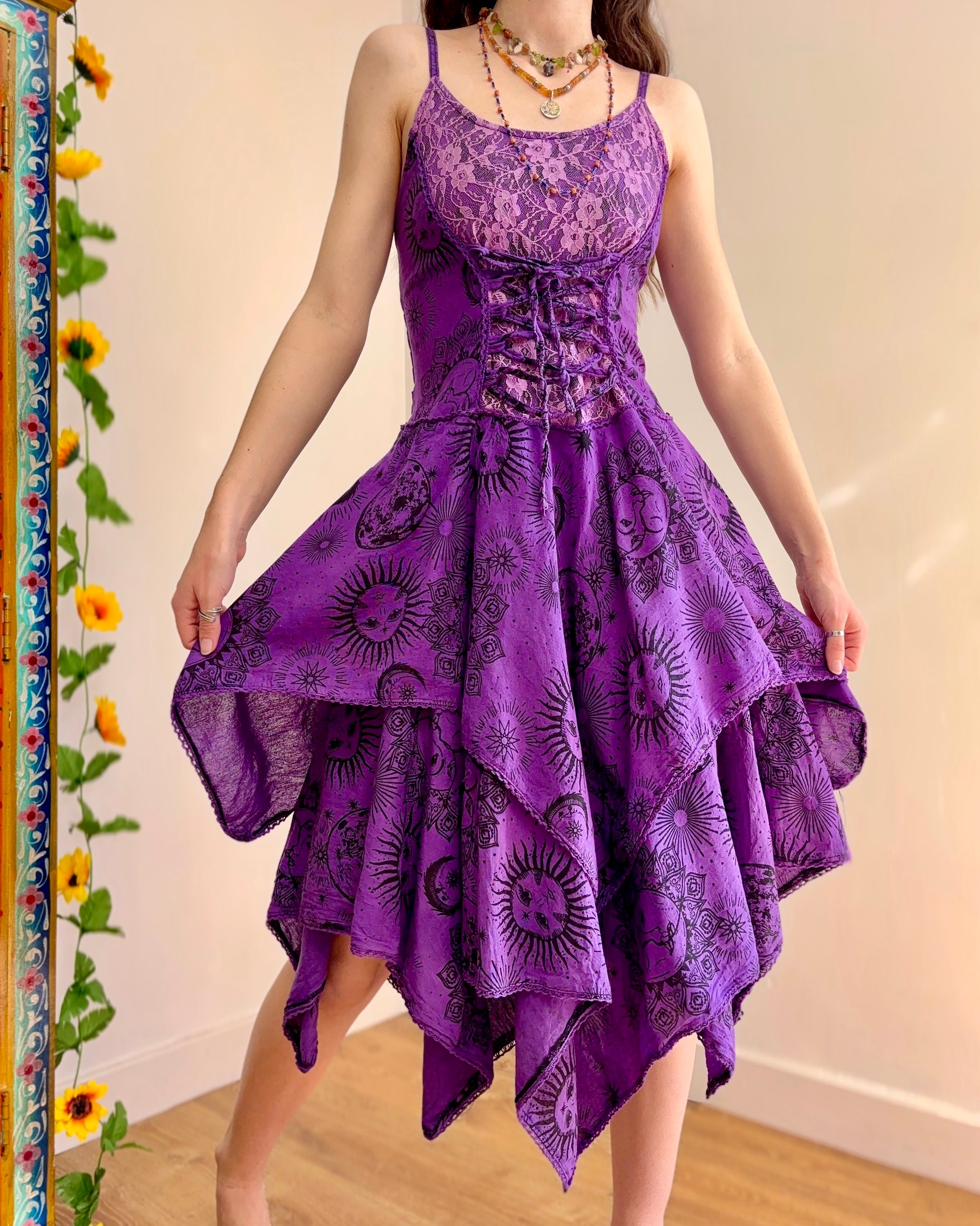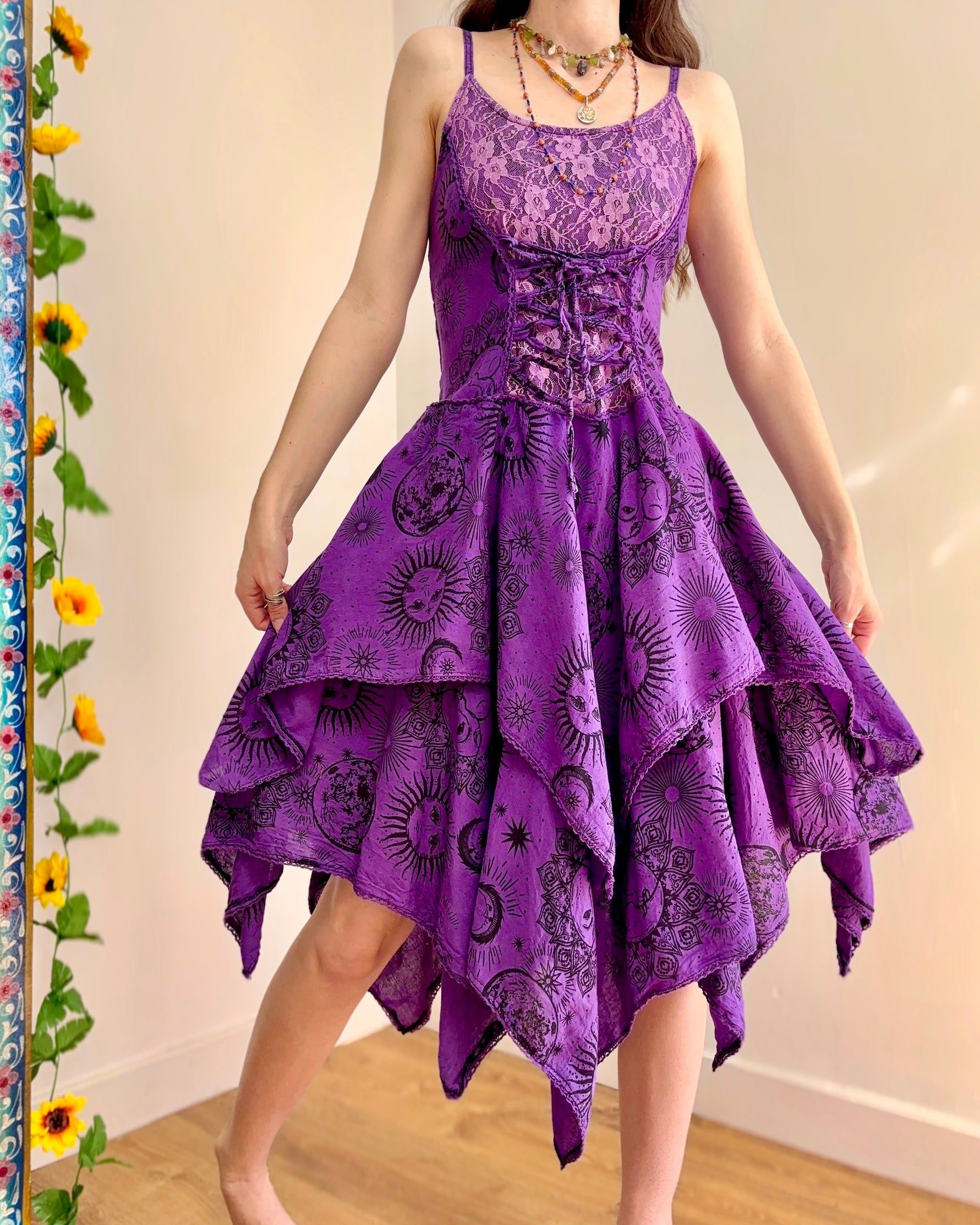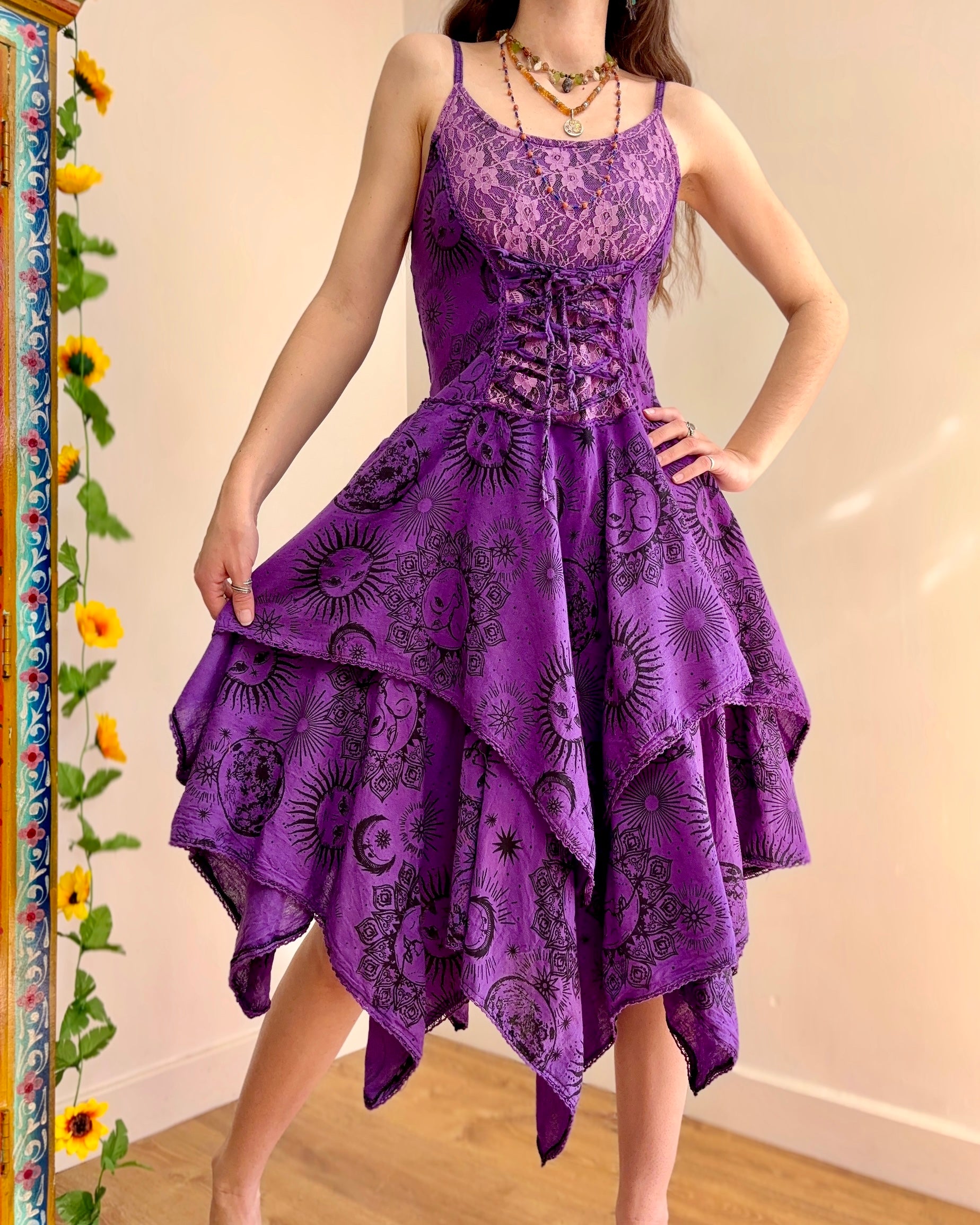 This beautiful dress is made with a corset-style lace top, and a bottom made from 100% cotton green celestial fabric that gives a forest fairy hippie look. The straps are adjustable.