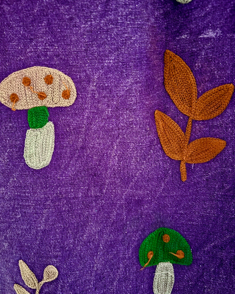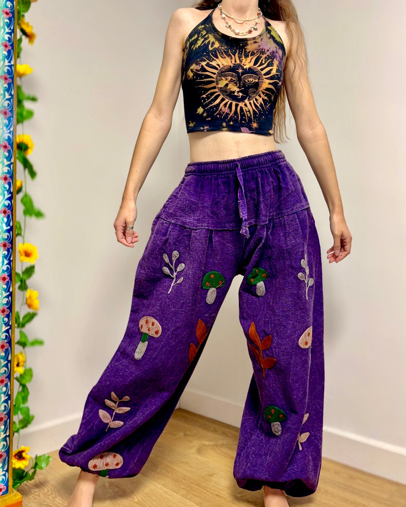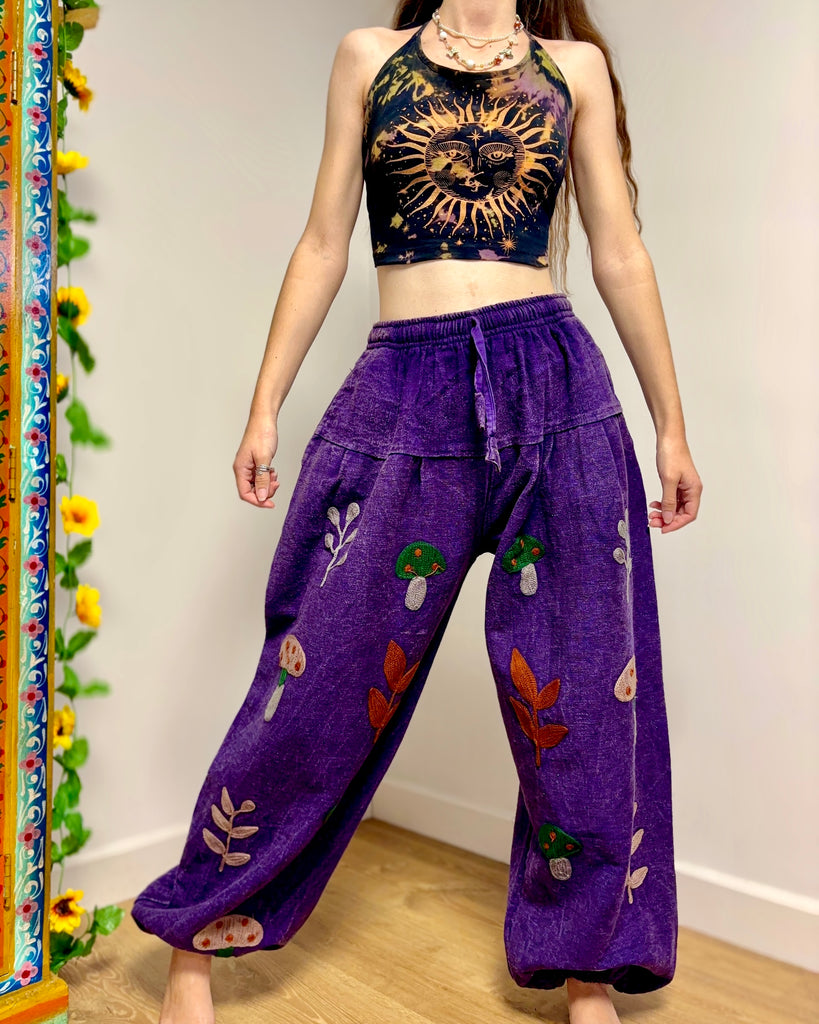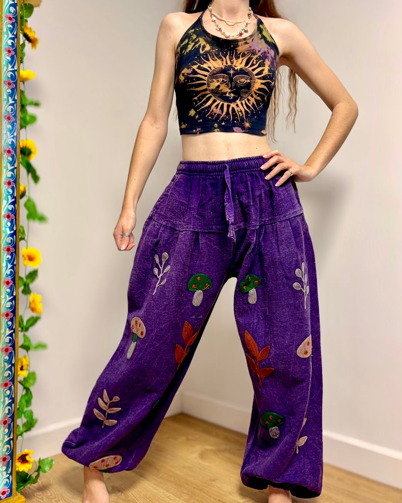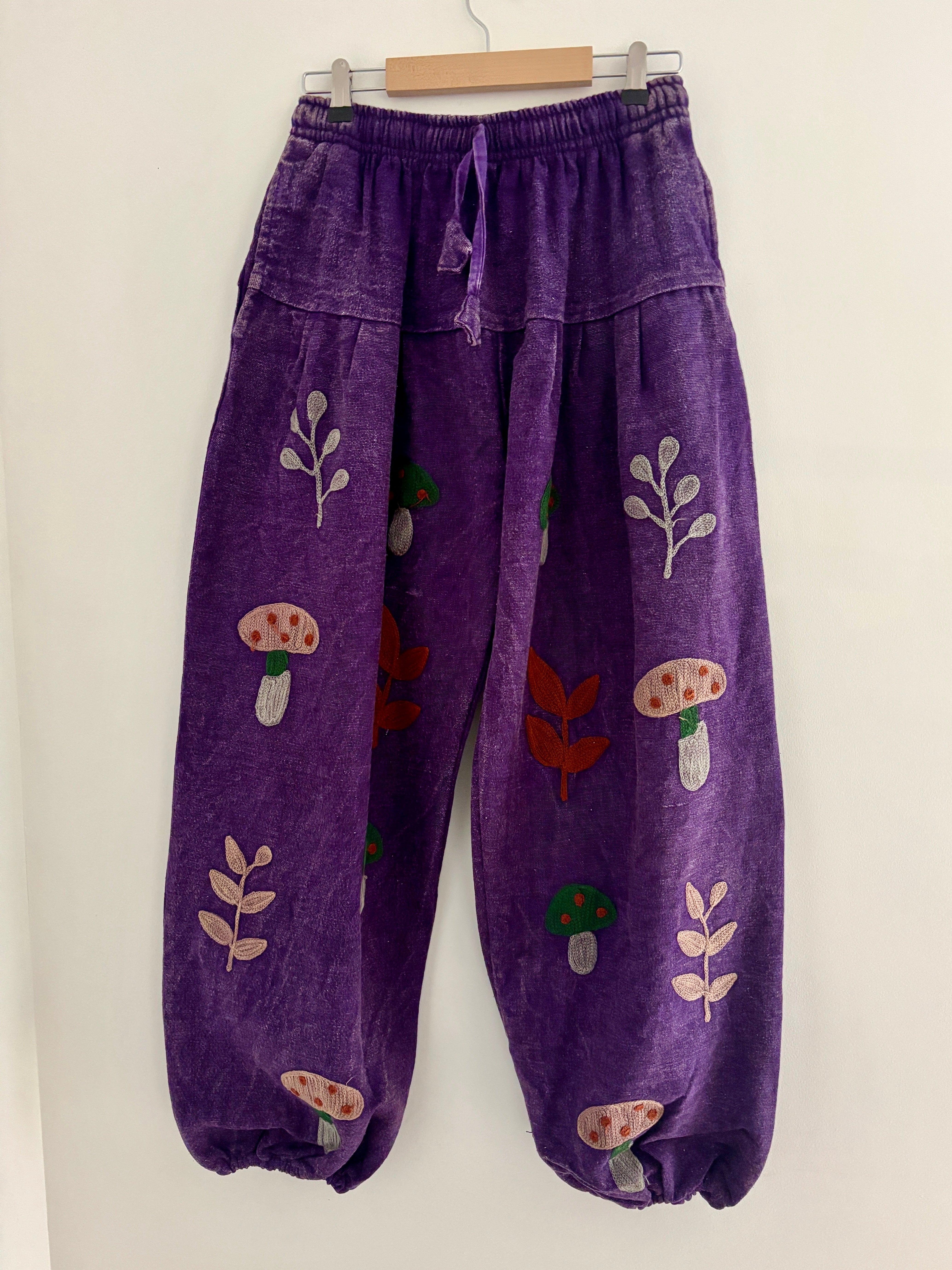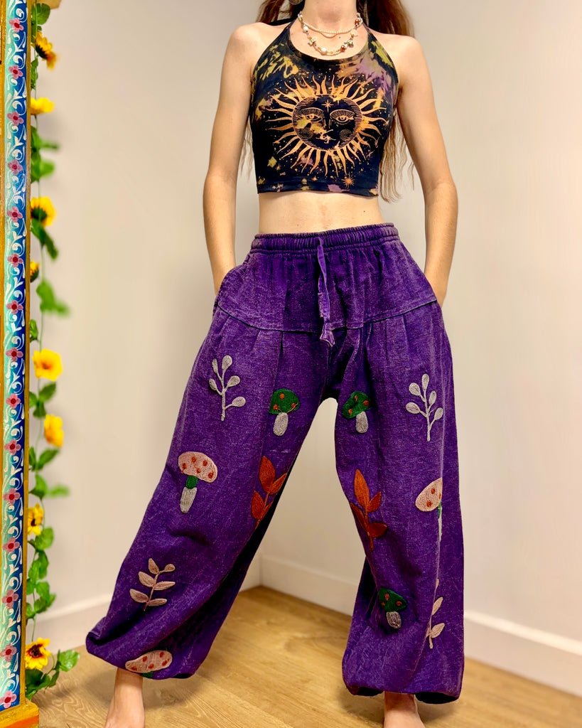 These new harem pants are made from earthy green coloured fabric decorated with an embroidered mushroom design. They have an elasticated waist and 2 side pockets.