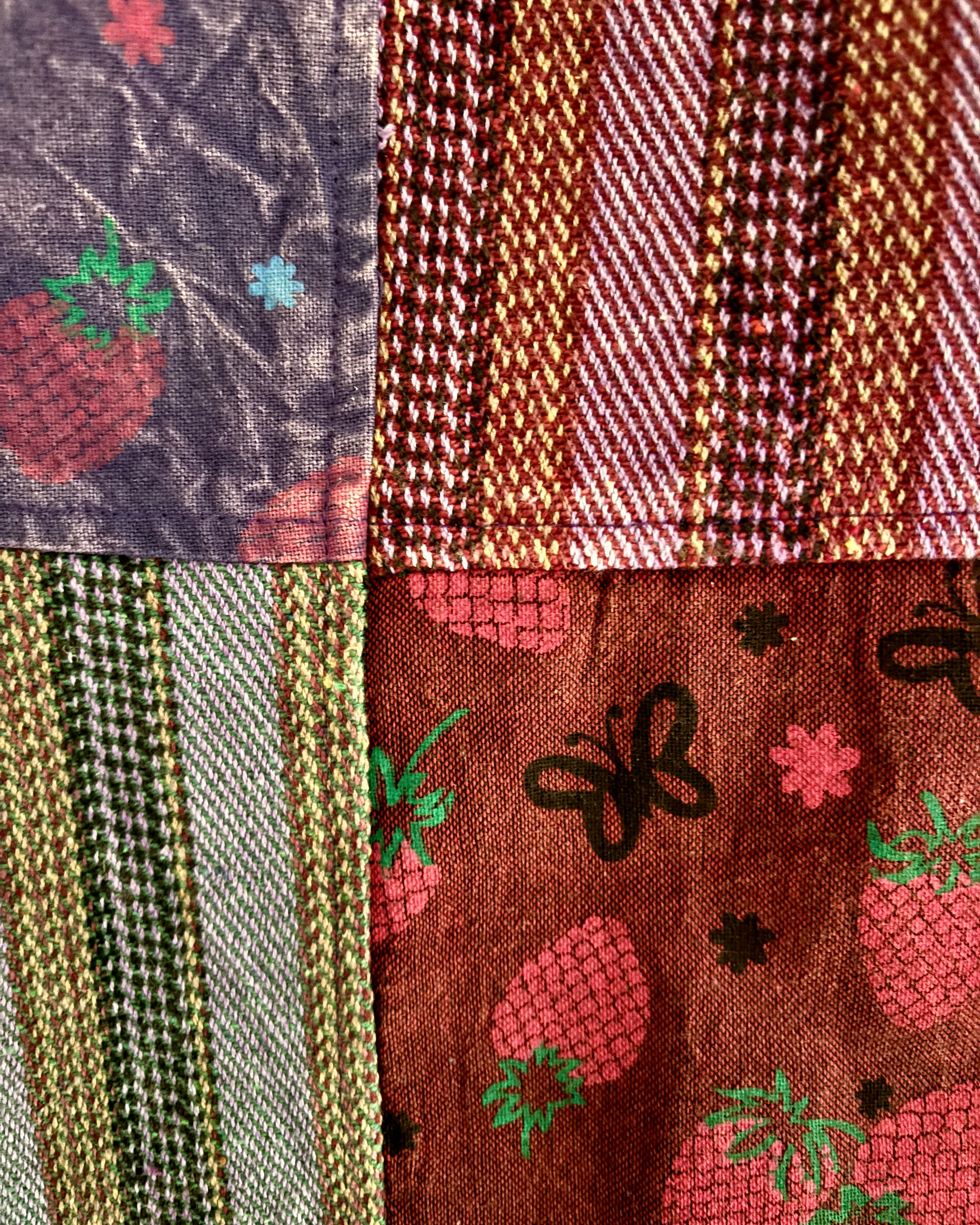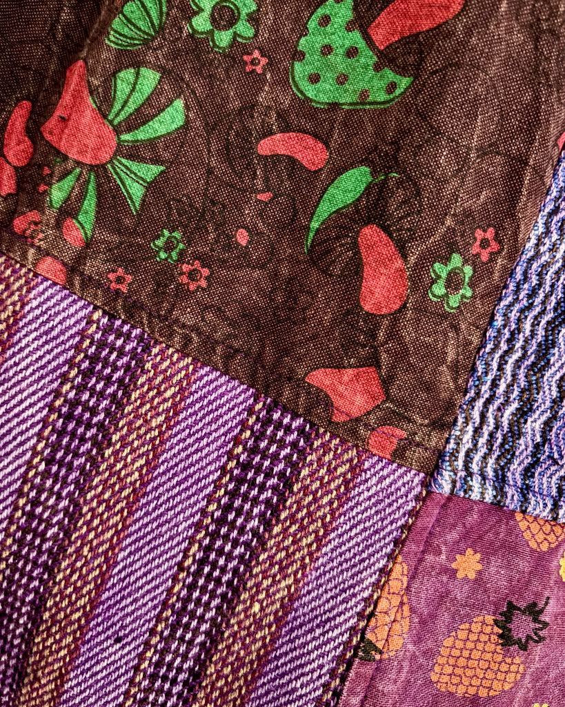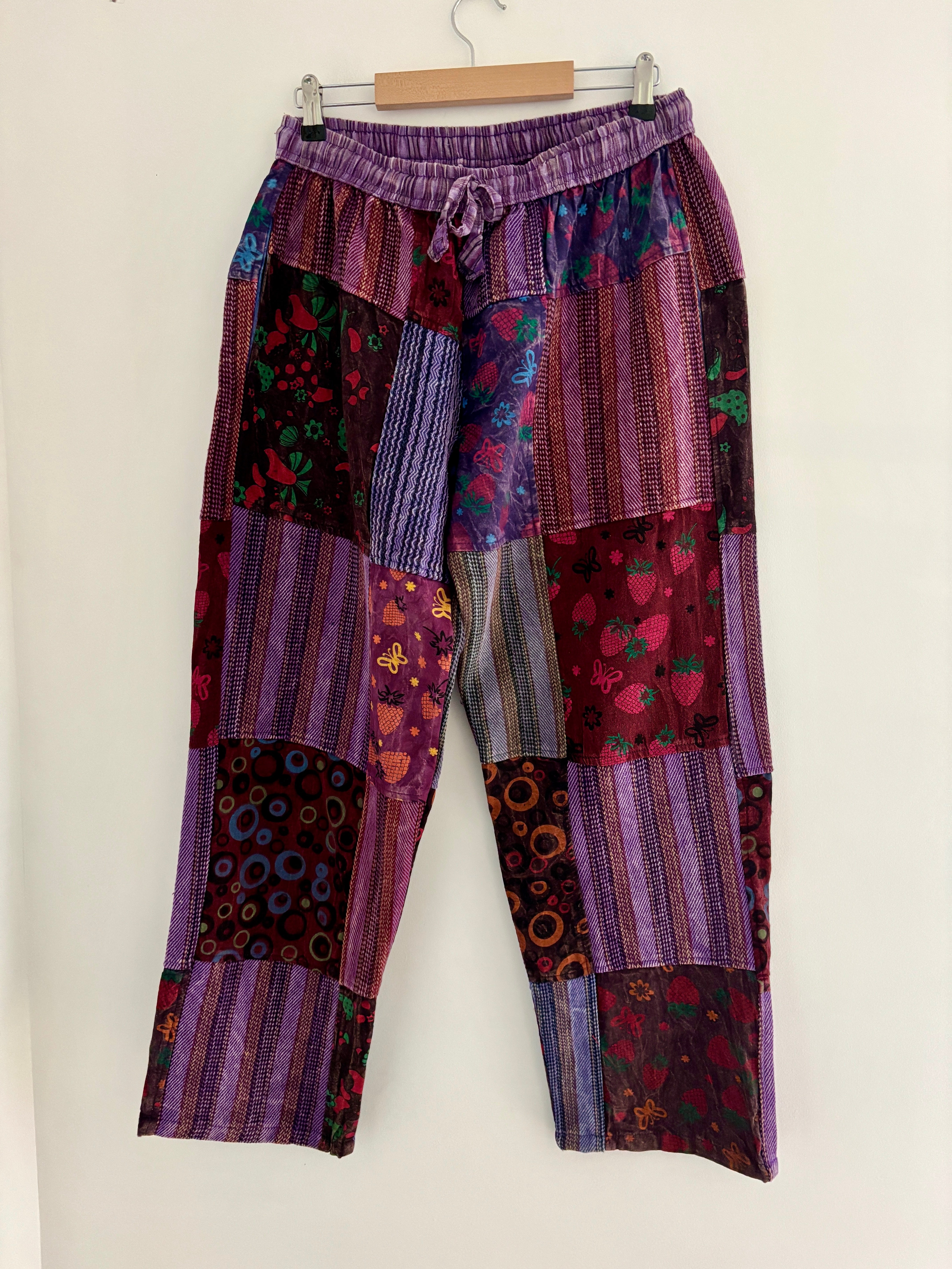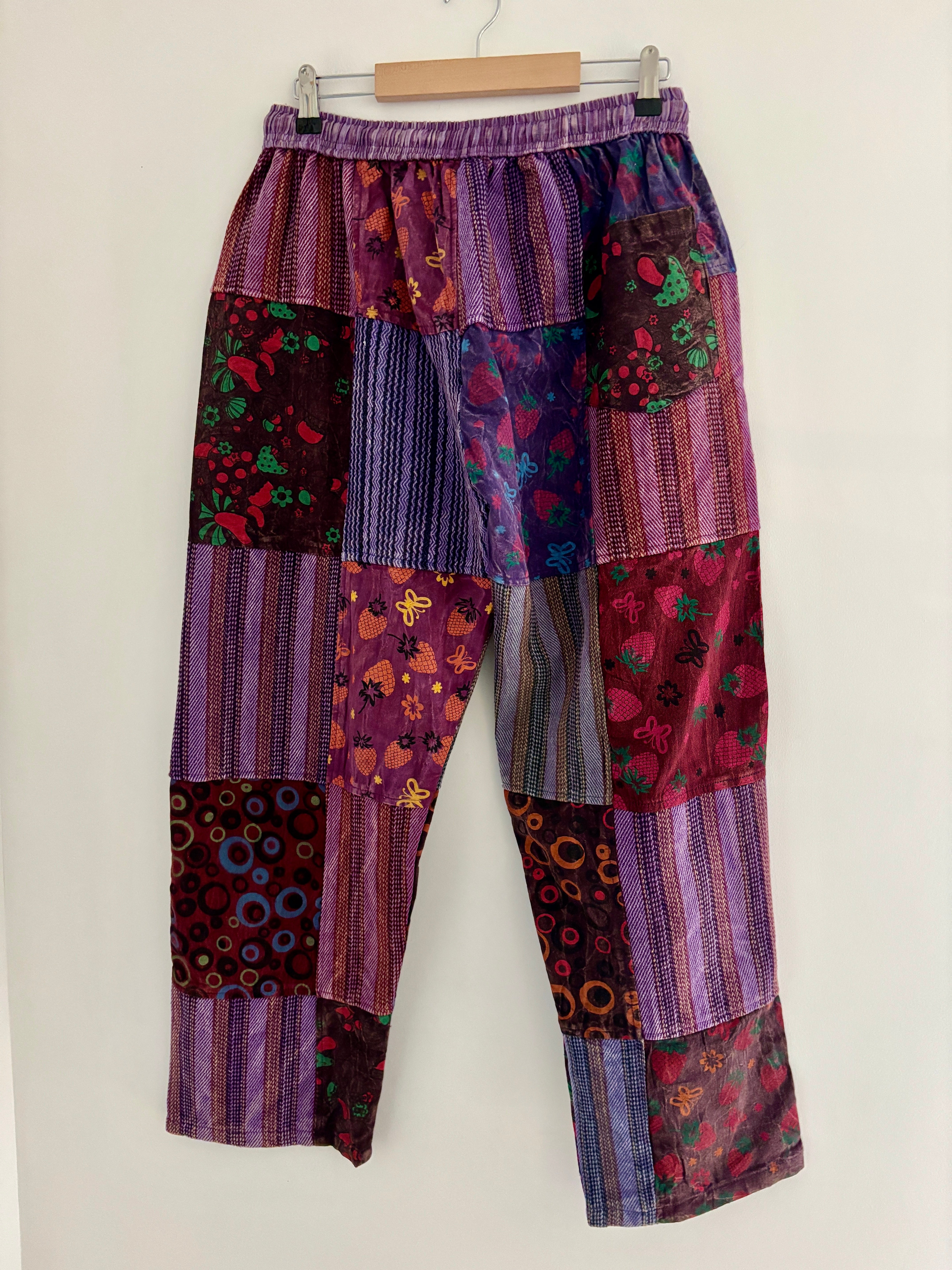 These trousers are made from purple coloured fabric featuring strawberry and mushroom patches. They have an elasticated waist and 2 side pockets.