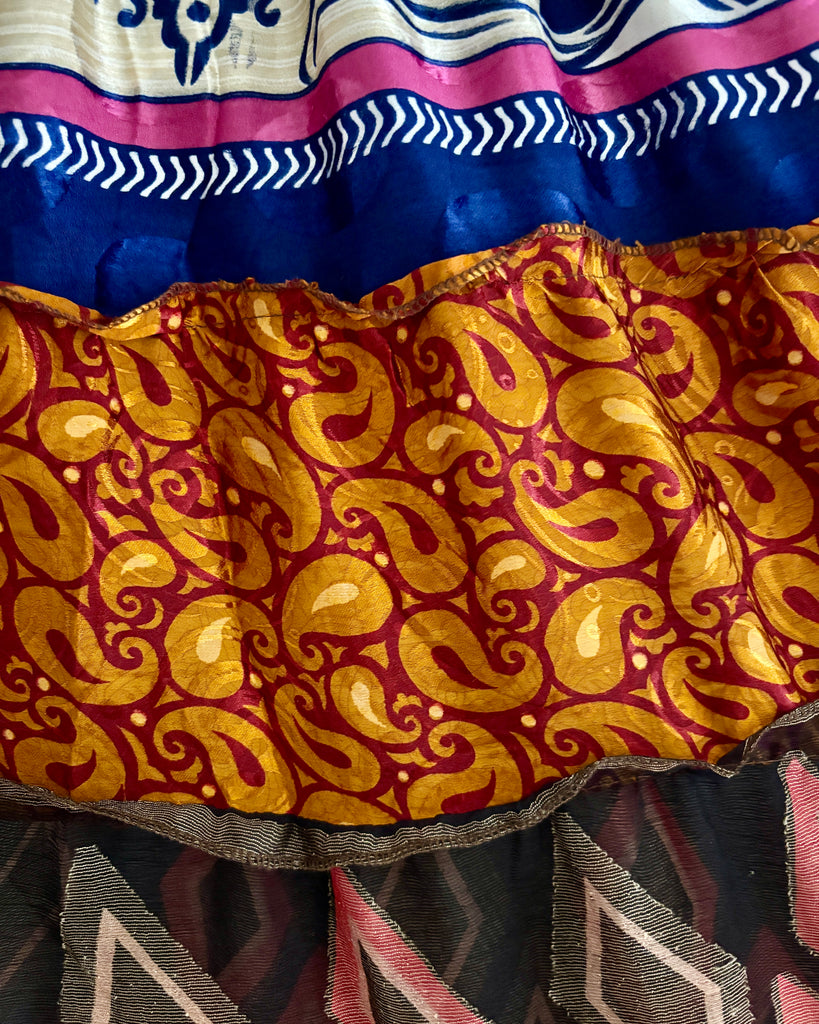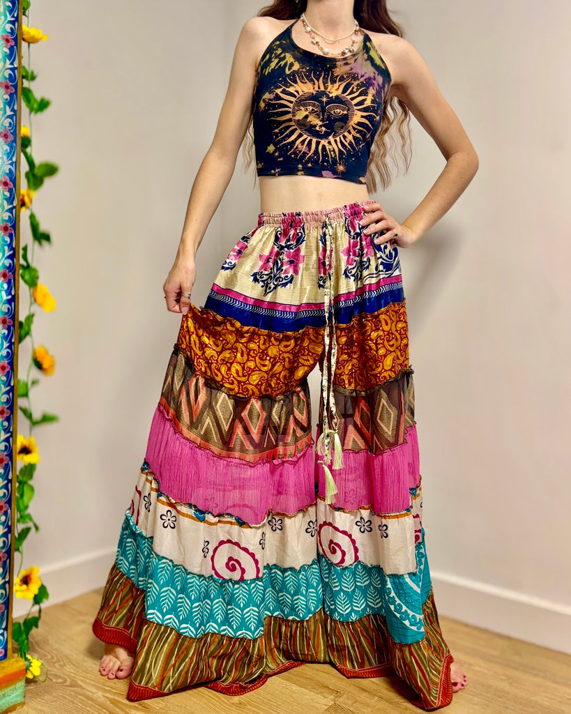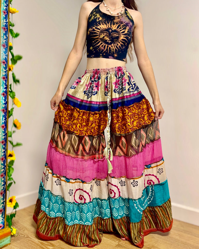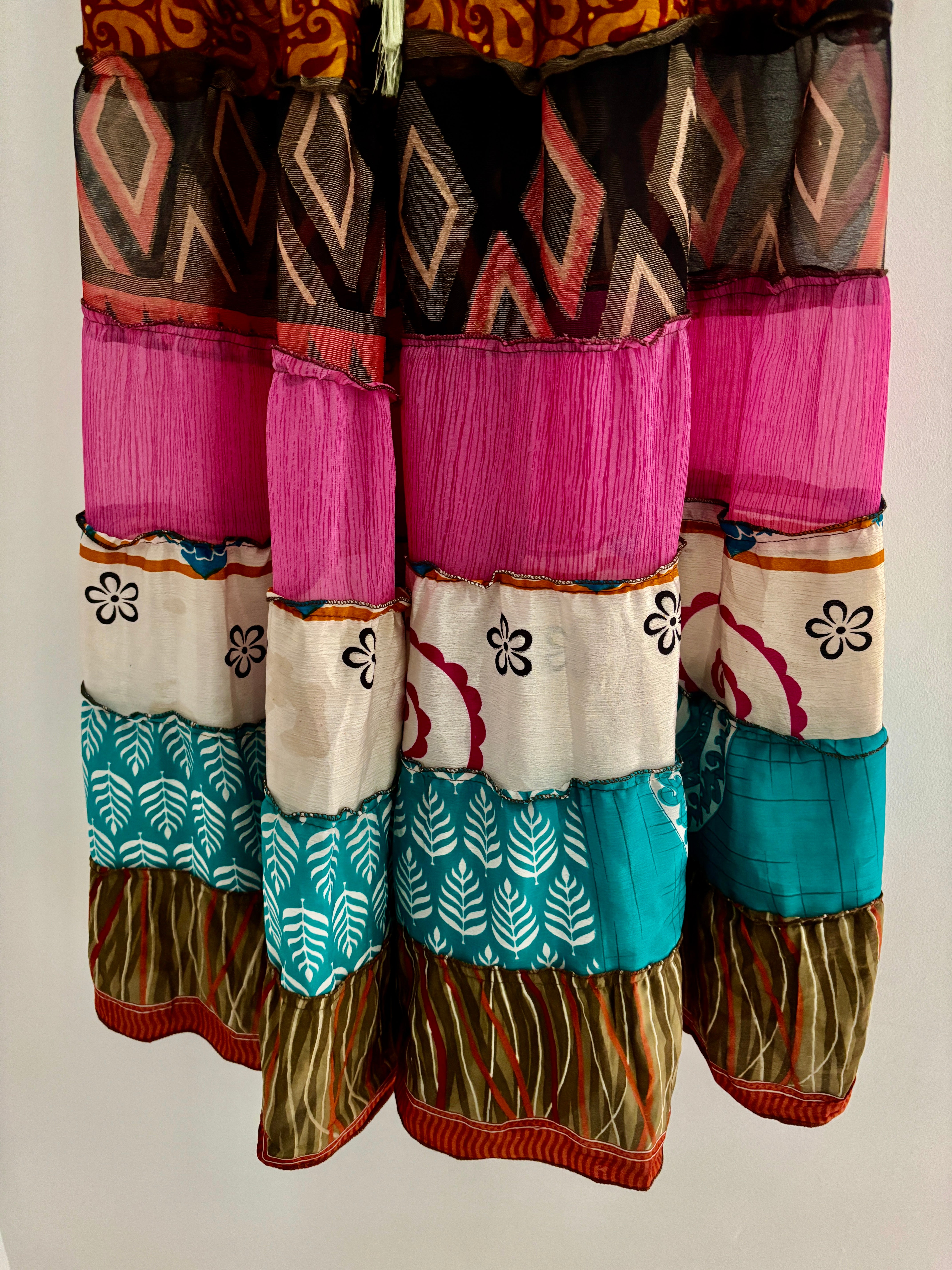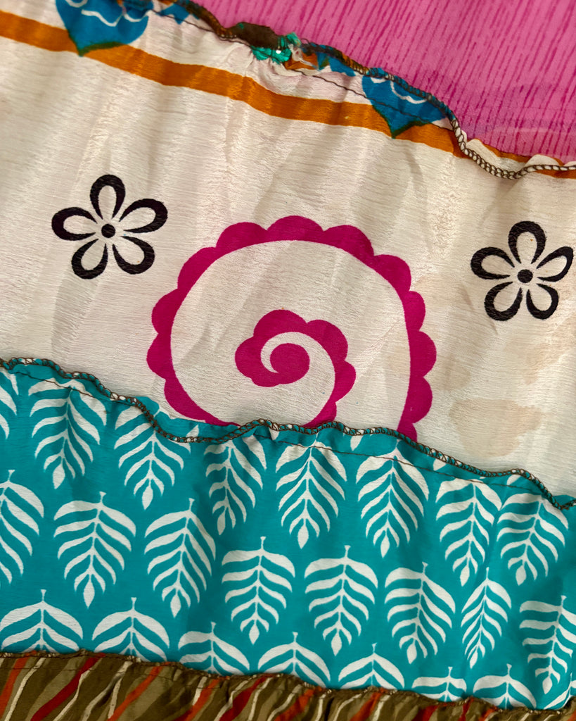 This piece is made from patches of beautiful recycled sari fabric that would otherwise have gone to waste. They are so magical and floaty, perfect for a festival hippie look!