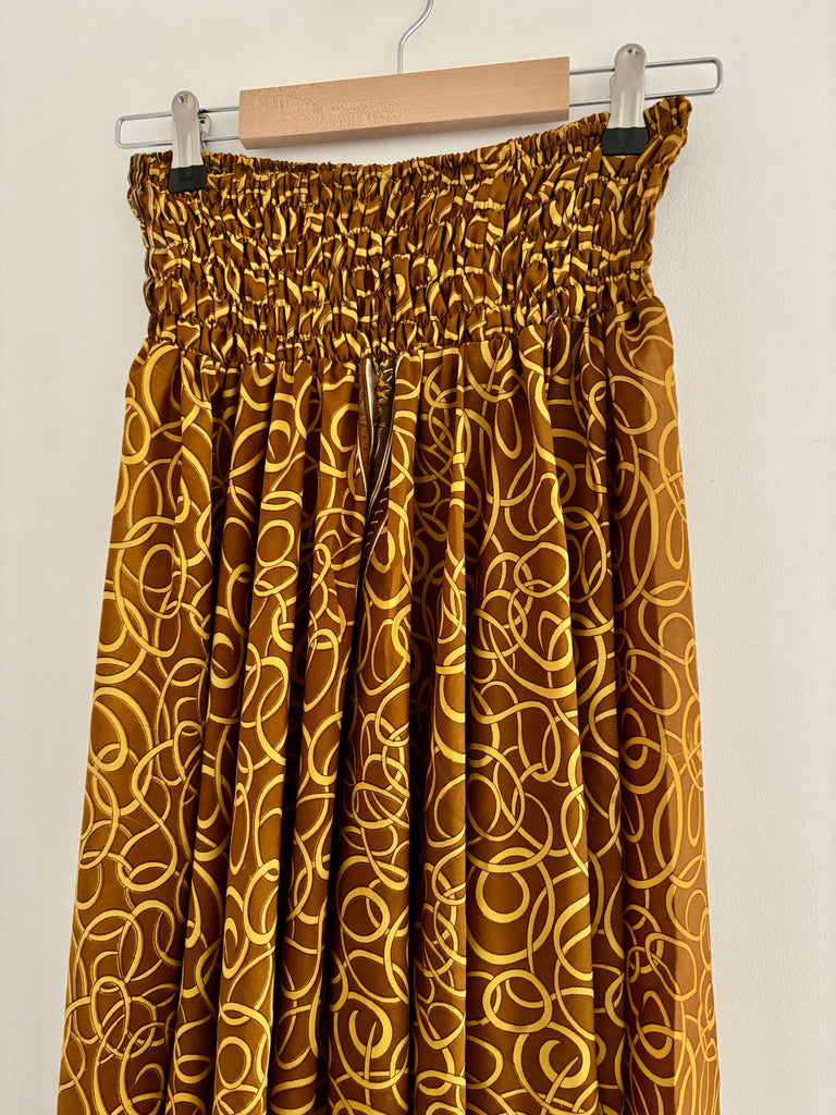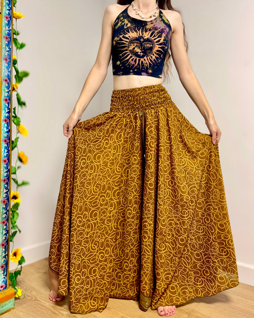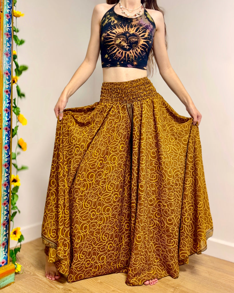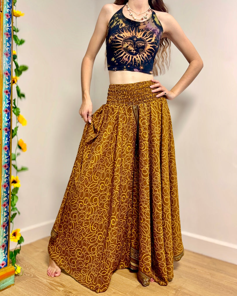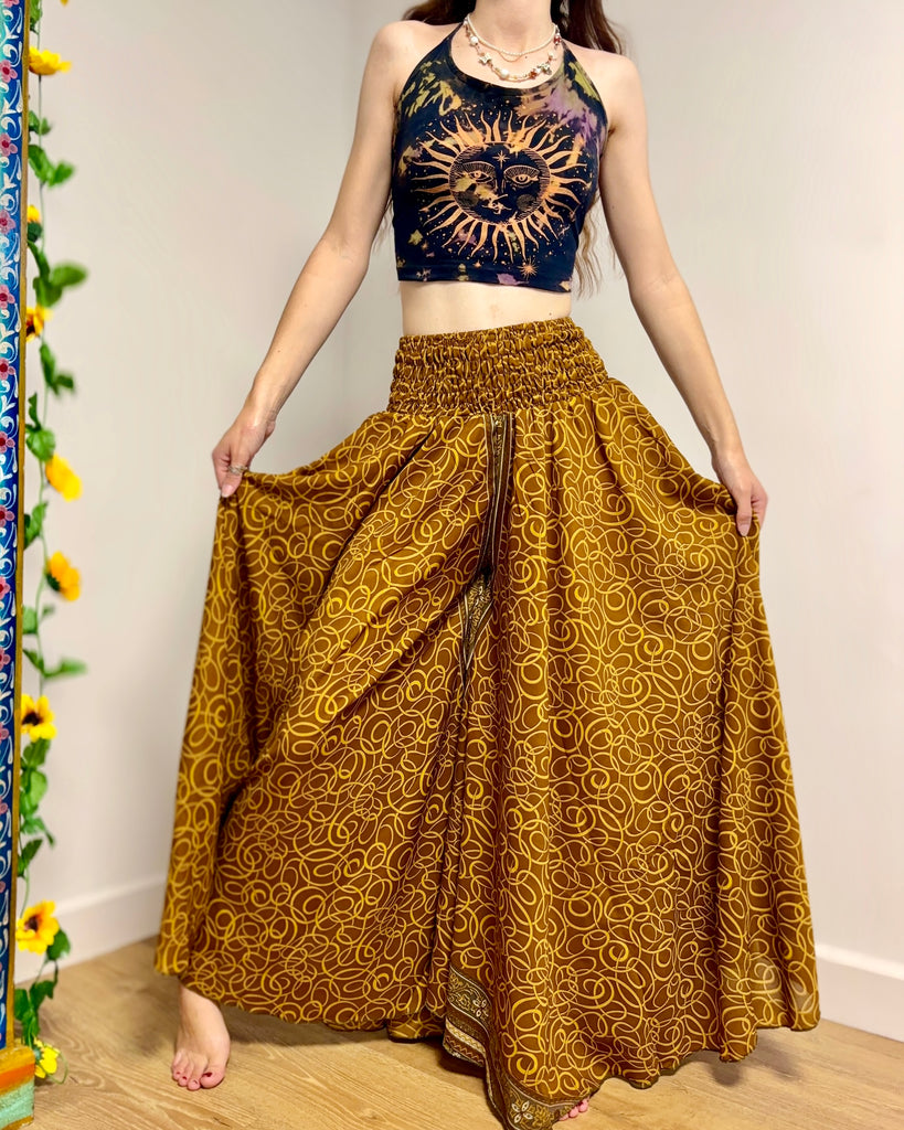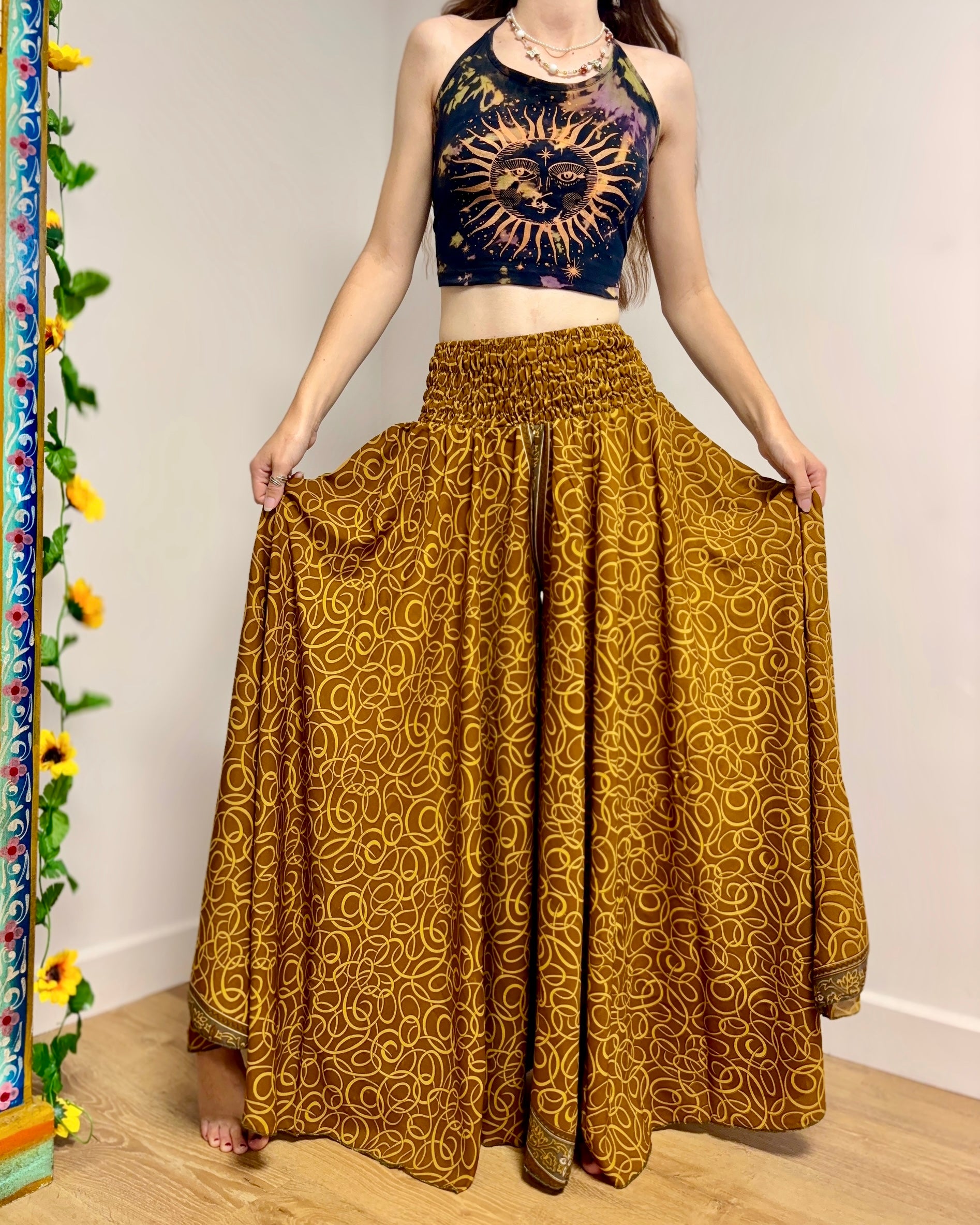 These beautiful palazzo trousers are made from 100% silk. With an elasticated waist and wide flared bottoms, they provide a loose comfortable fit.