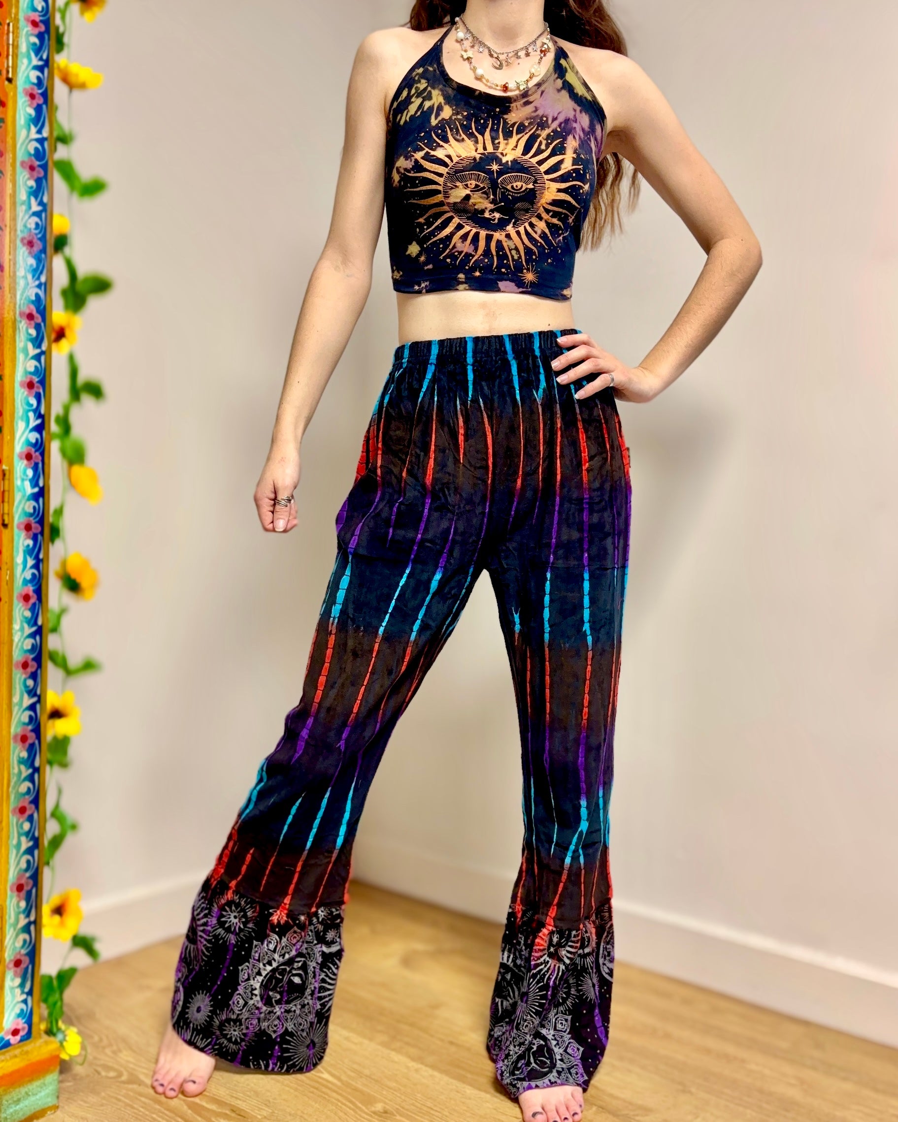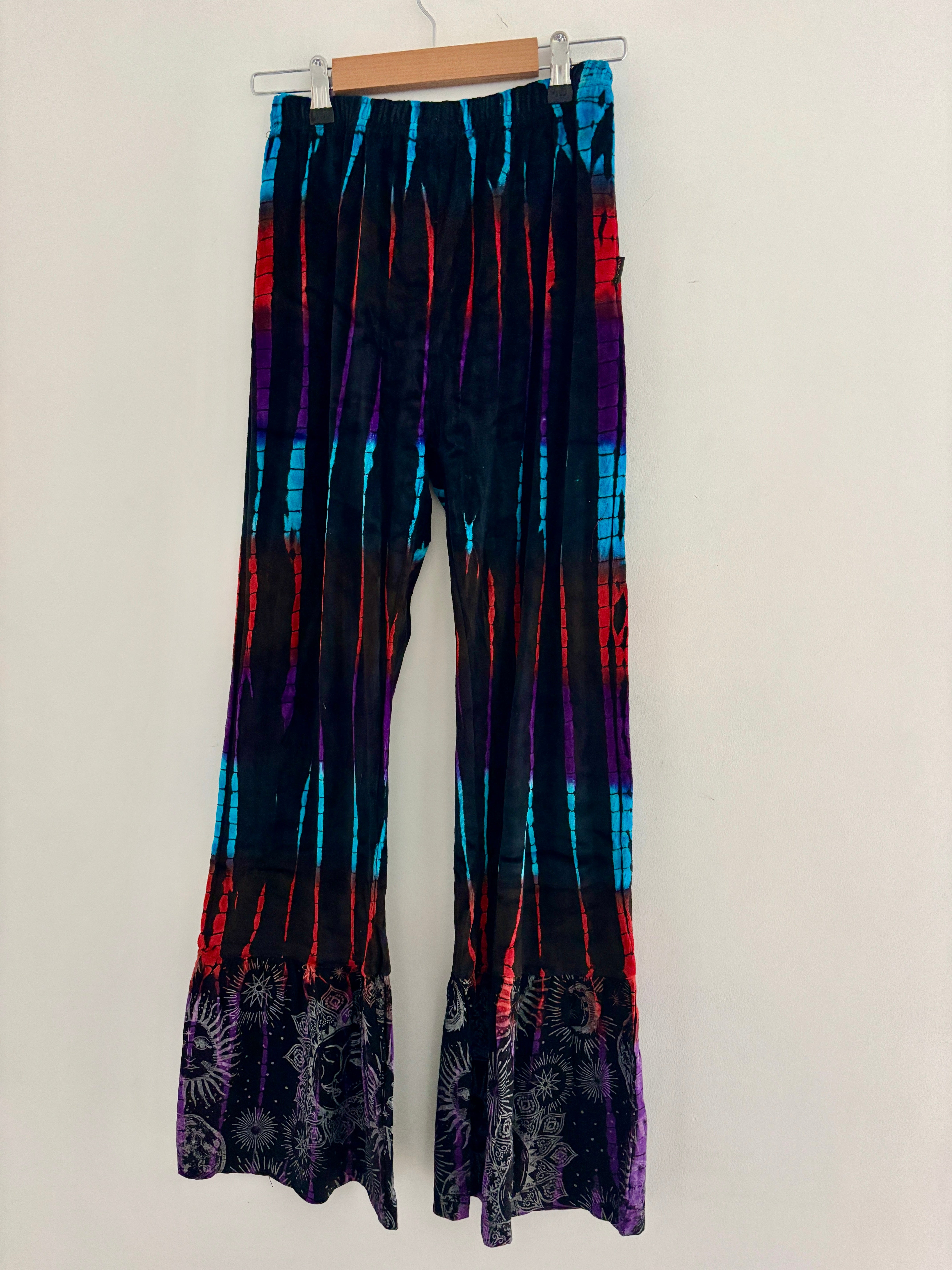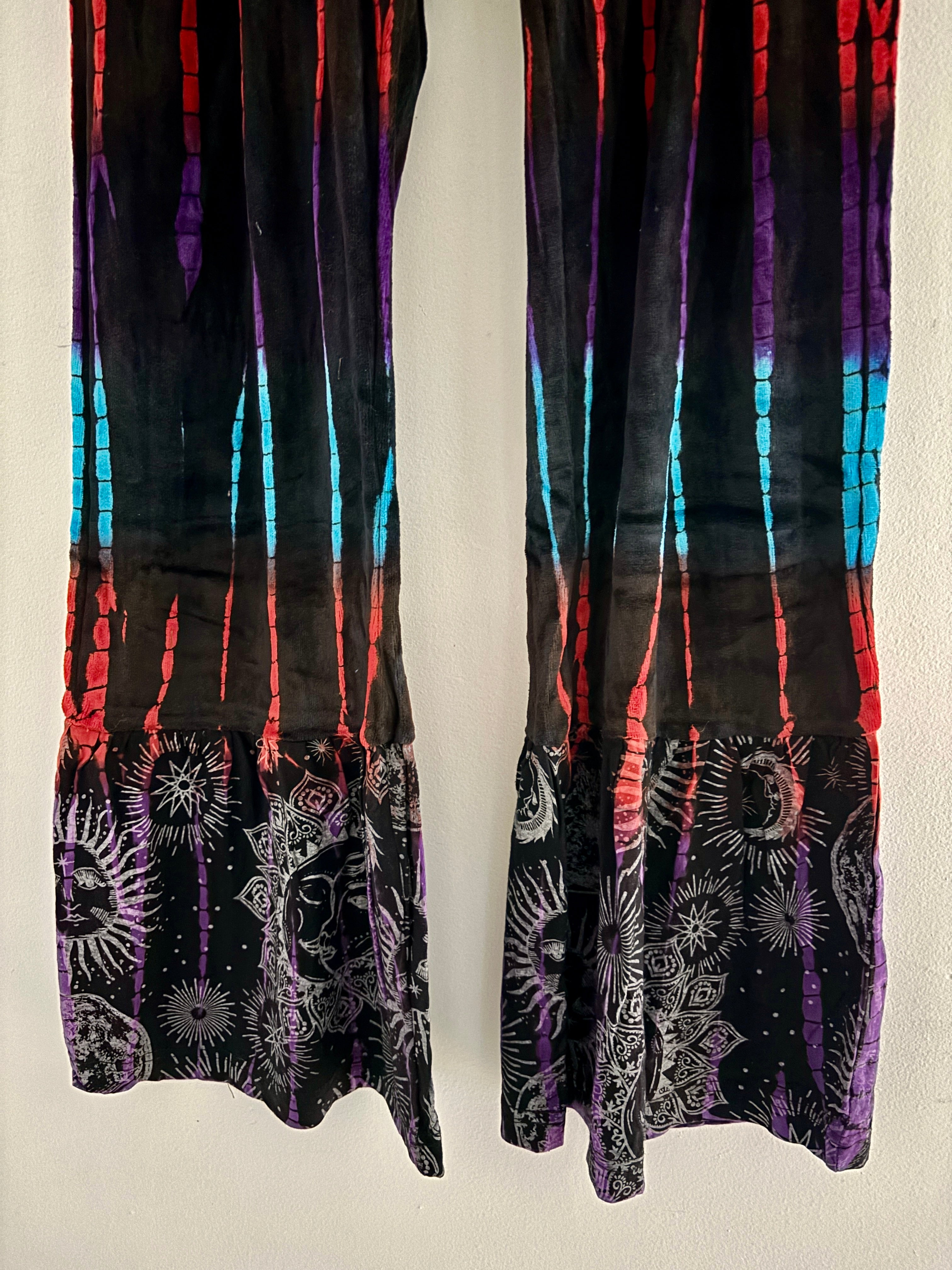 These new flared pants are made from soft velvet tie-dyed fabric, with a celestial design at the bottom. They have an elasticated waist and two side pockets.