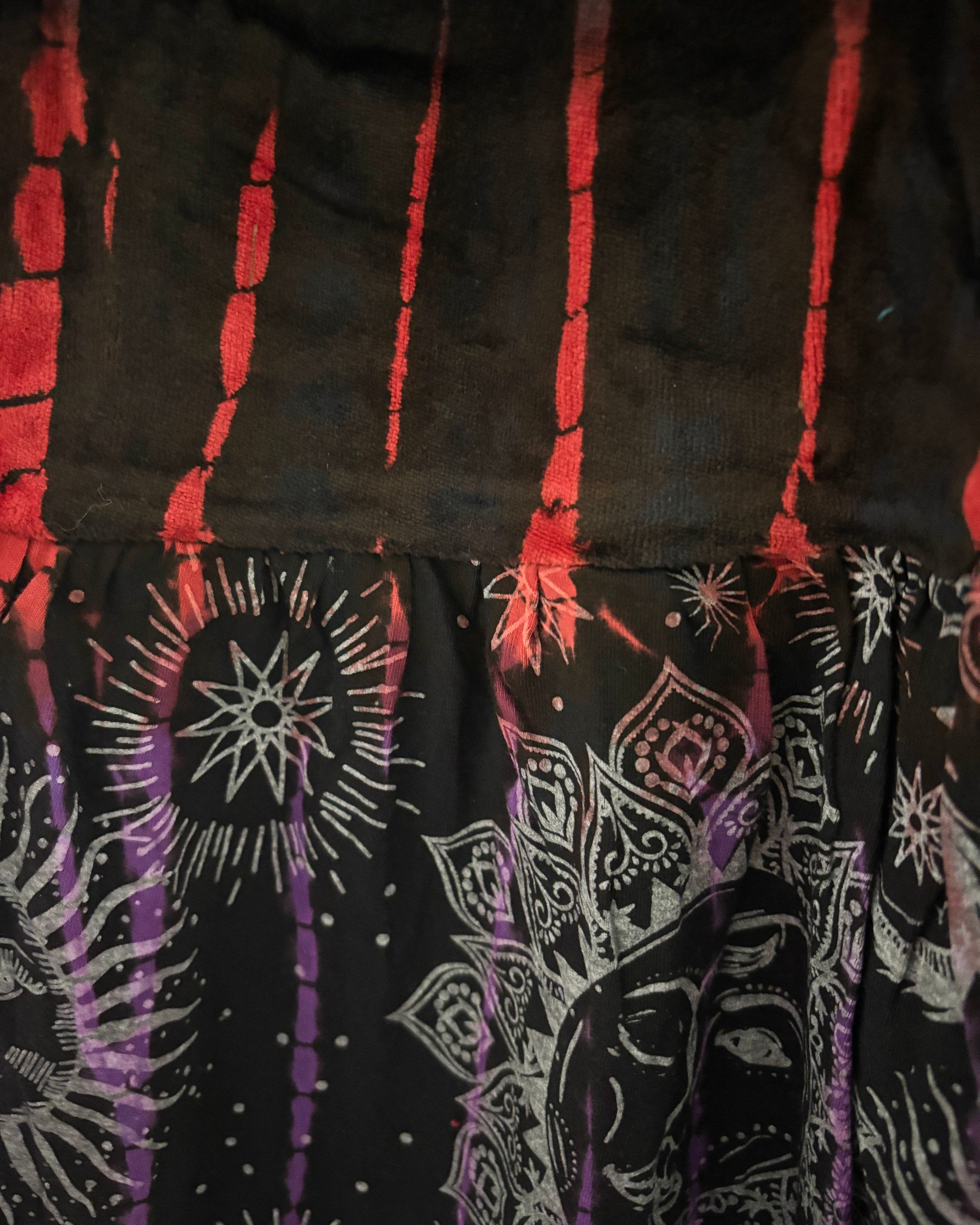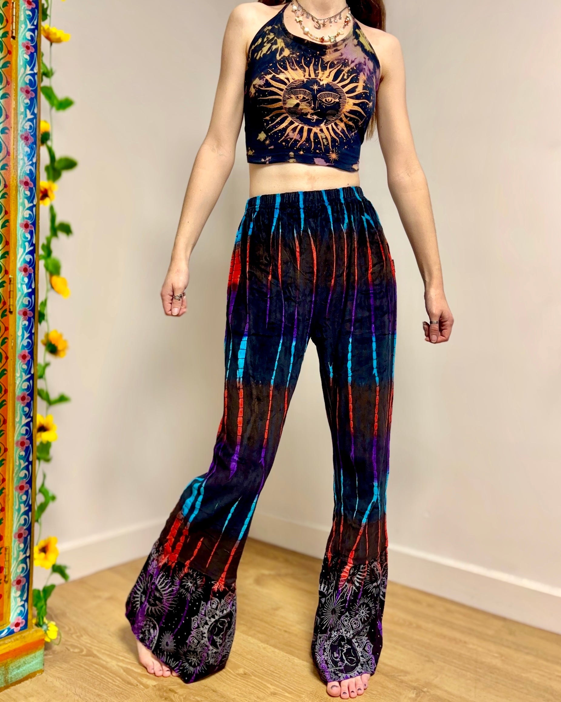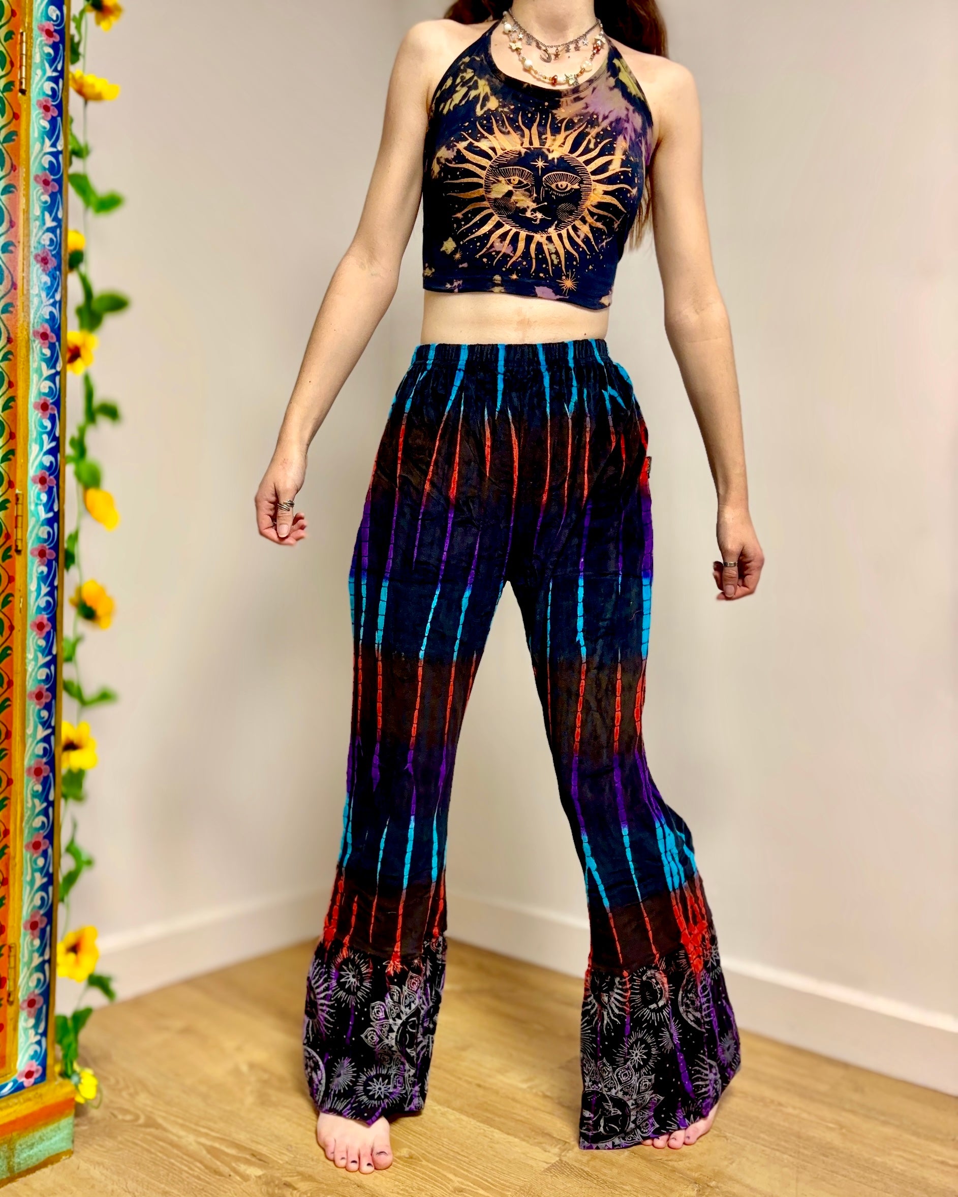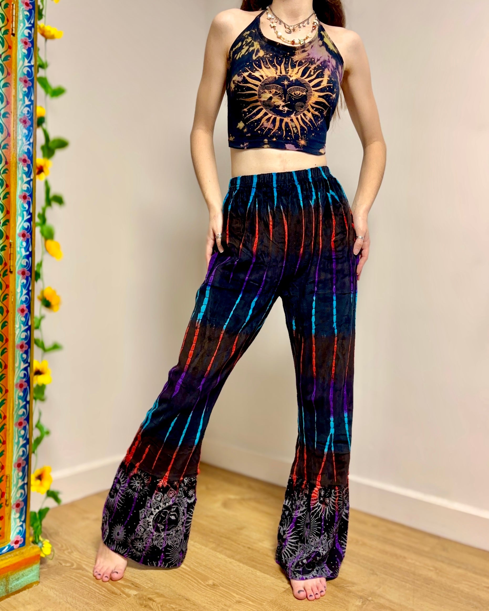 These new flared pants are made from soft velvet tie-dyed fabric, with a celestial design at the bottom. They have an elasticated waist and two side pockets.