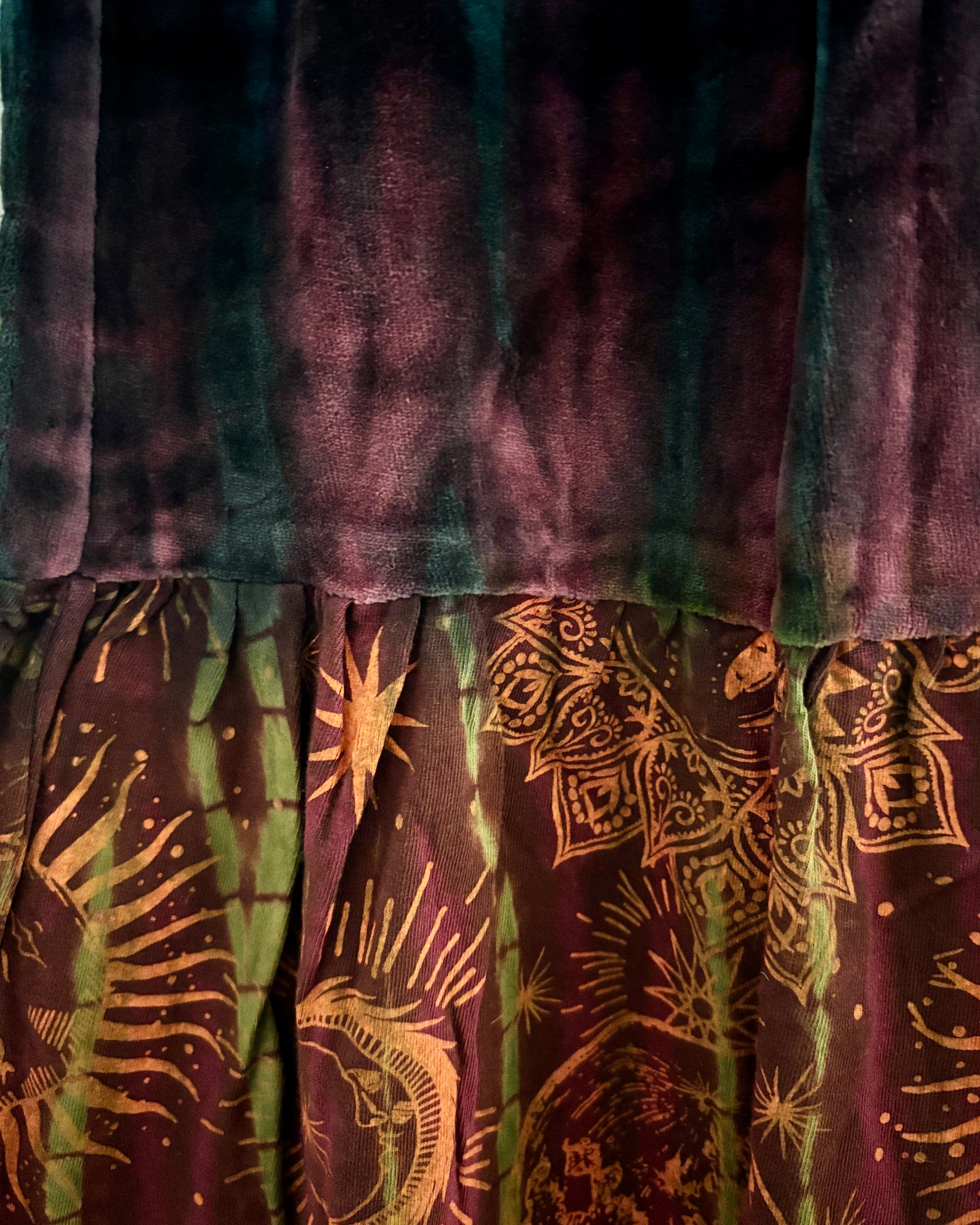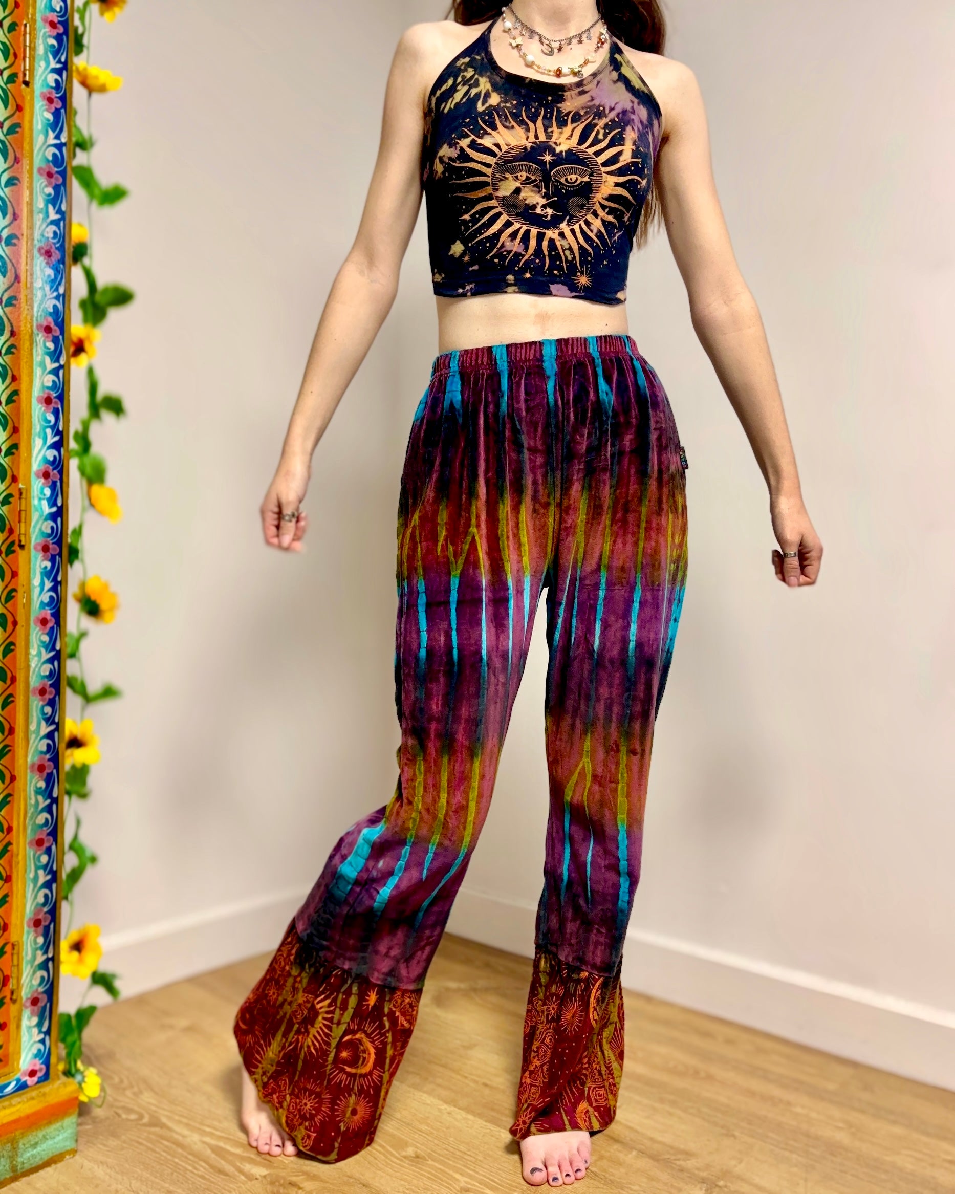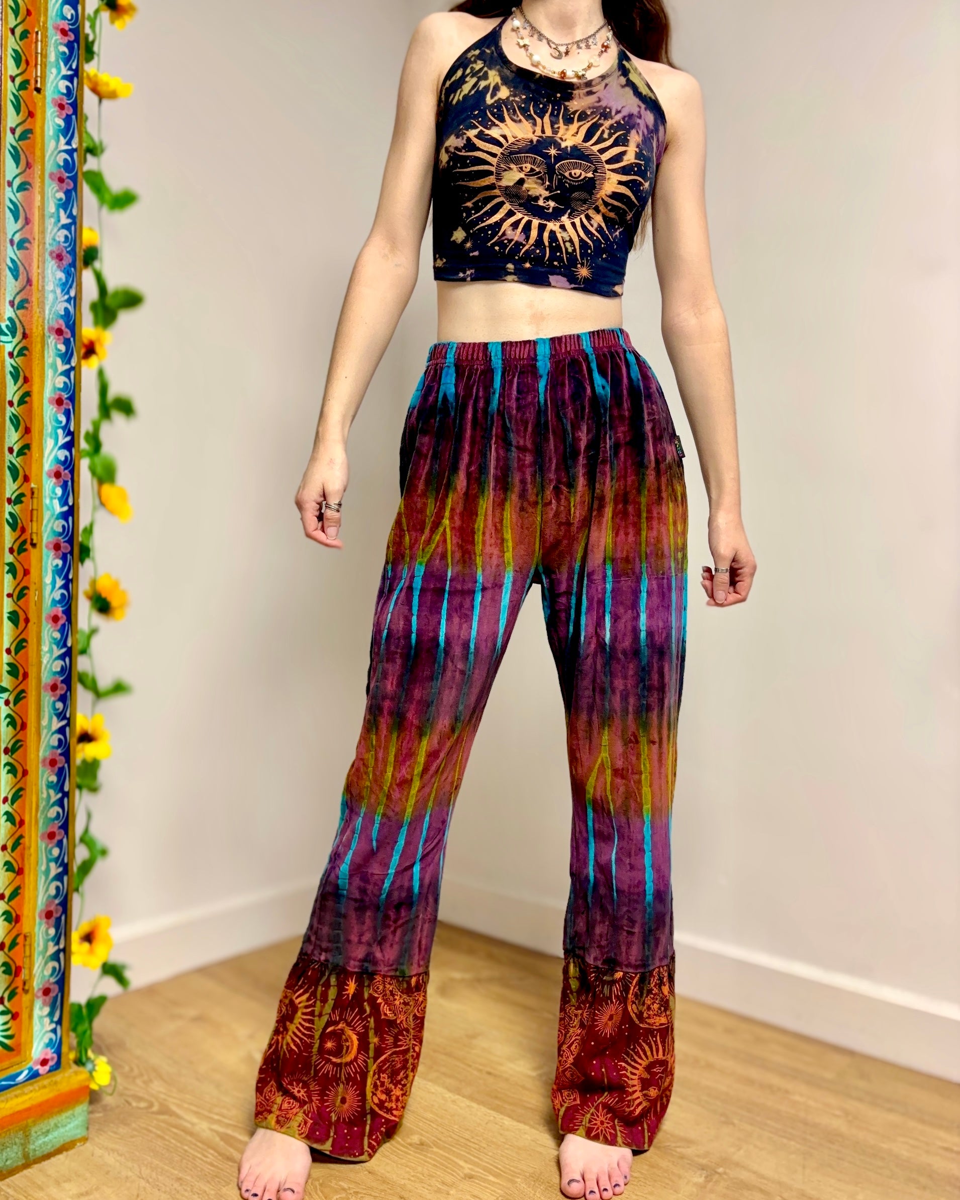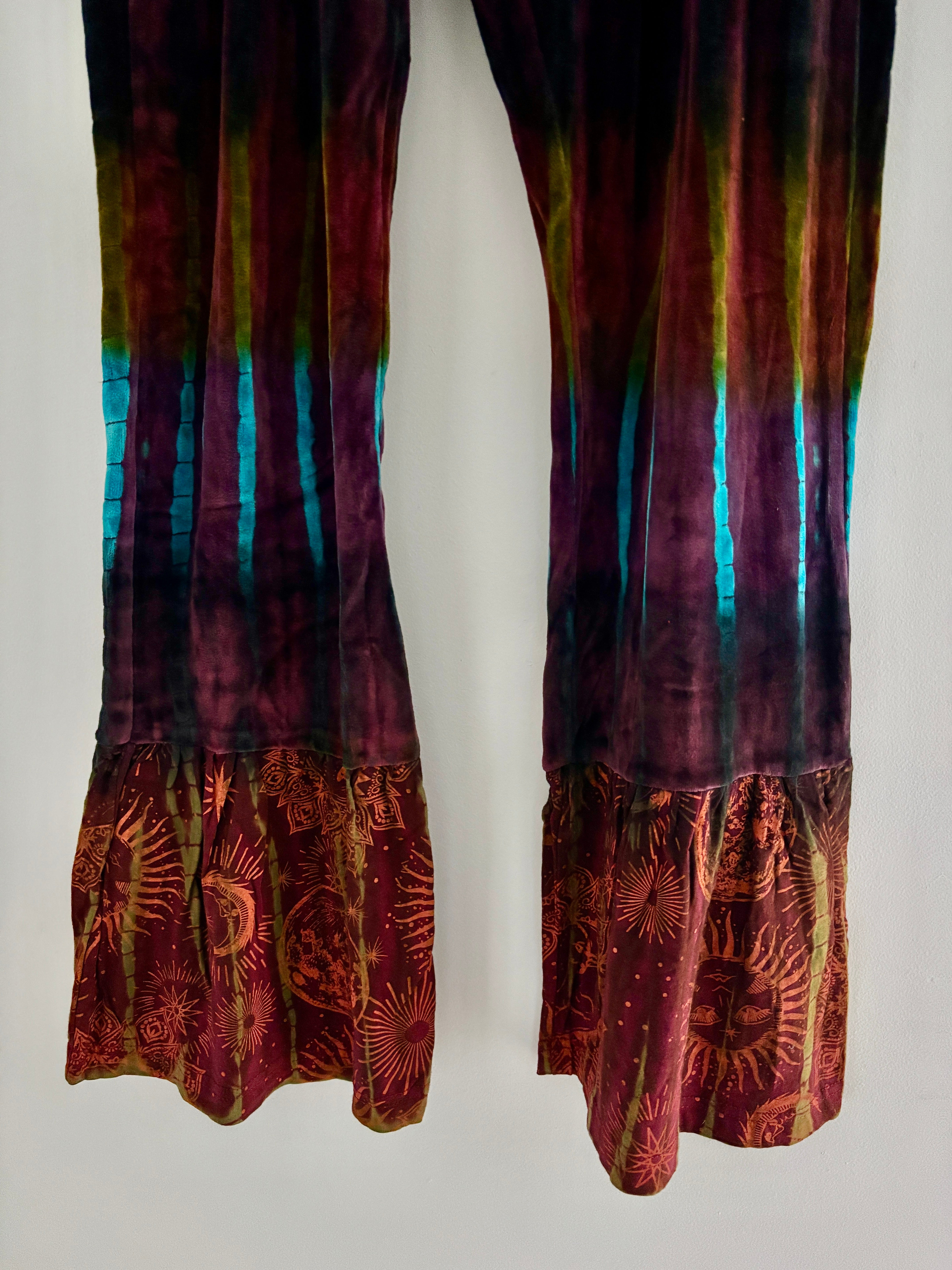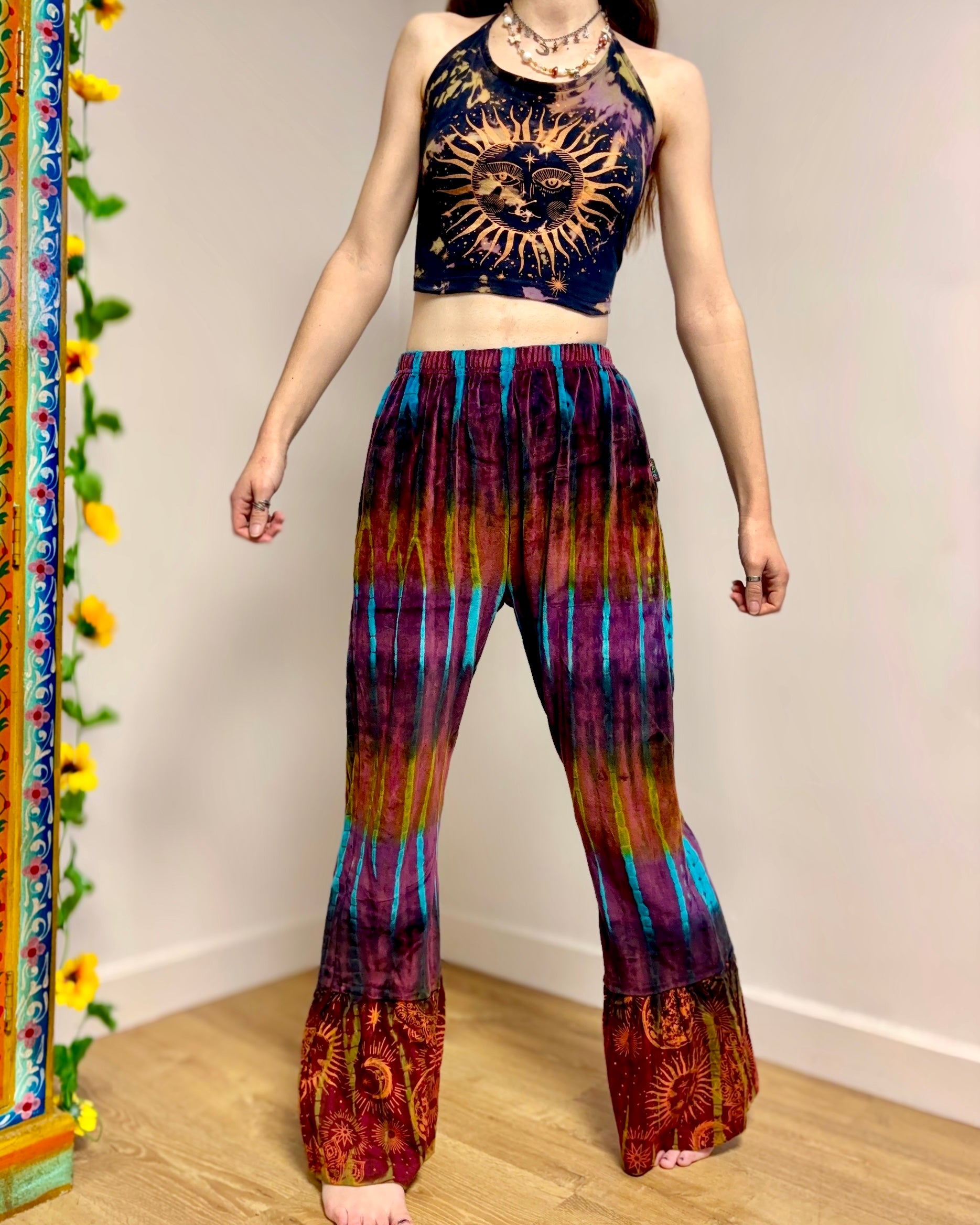 These new flared pants are made from soft velvet tie-dyed fabric, with a celestial design at the bottom. They have an elasticated waist and two side pockets.