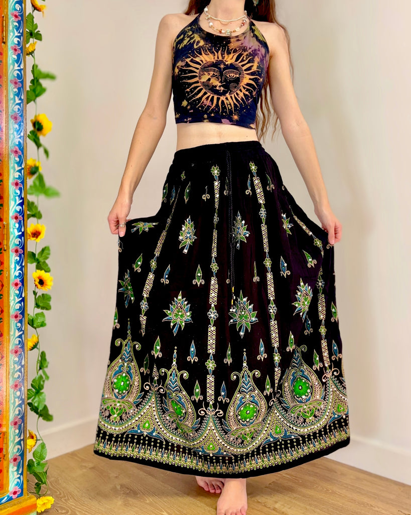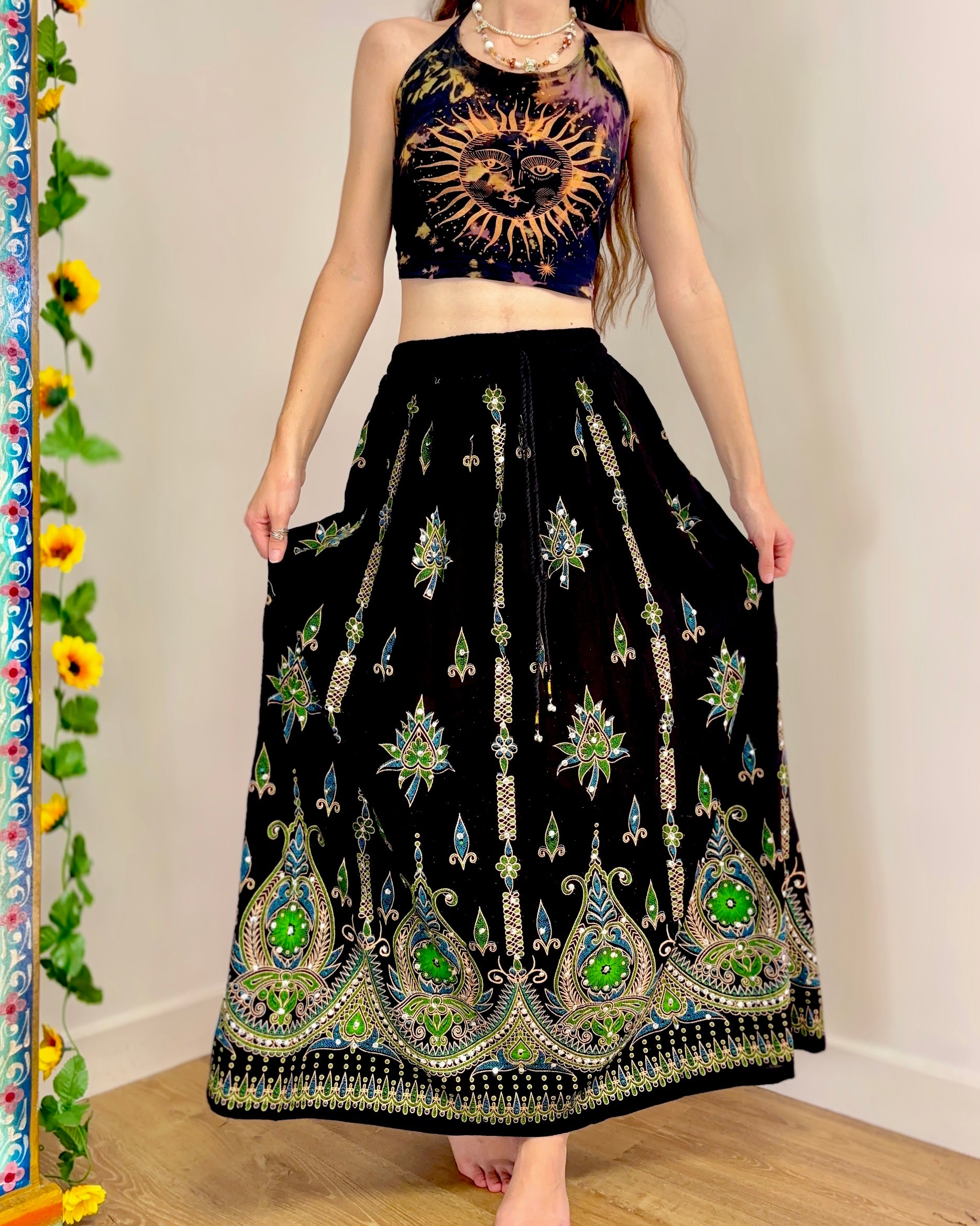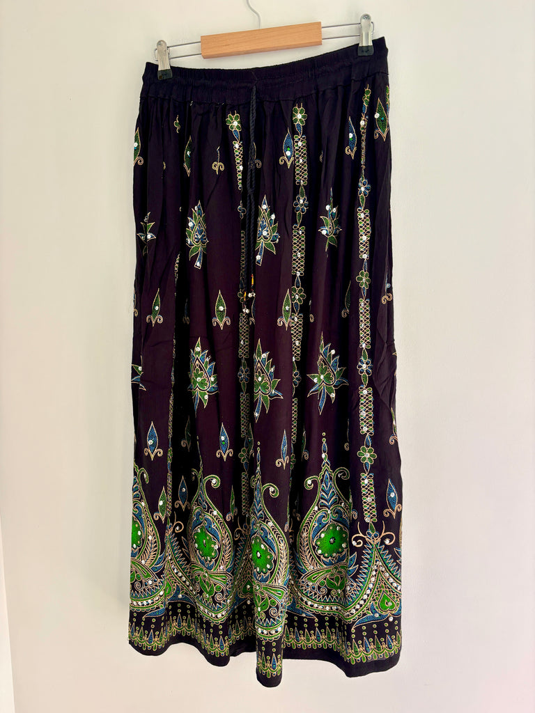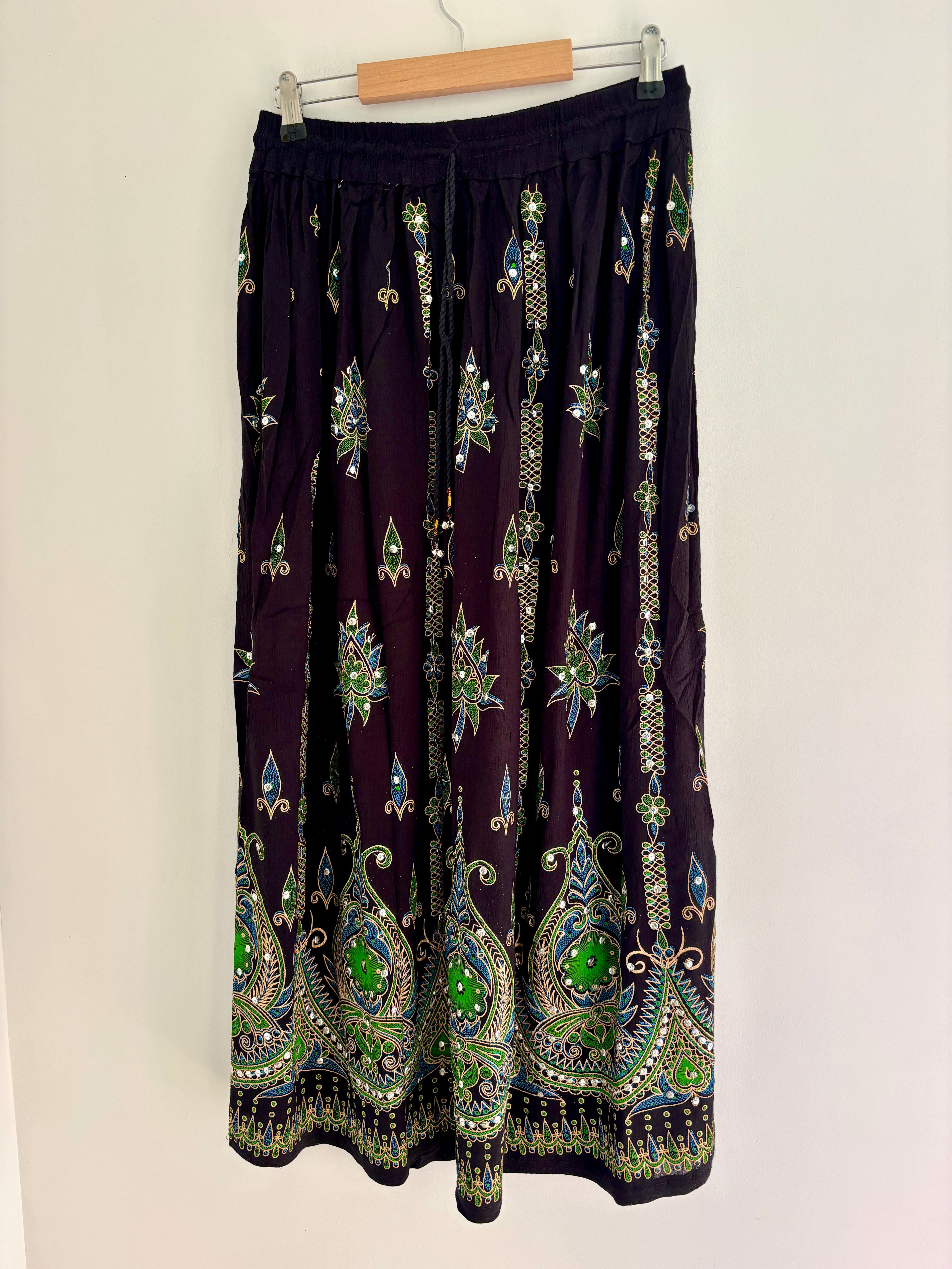 This beautiful Indian skirt is made from block-printed fabric adorned with sequins and bells.