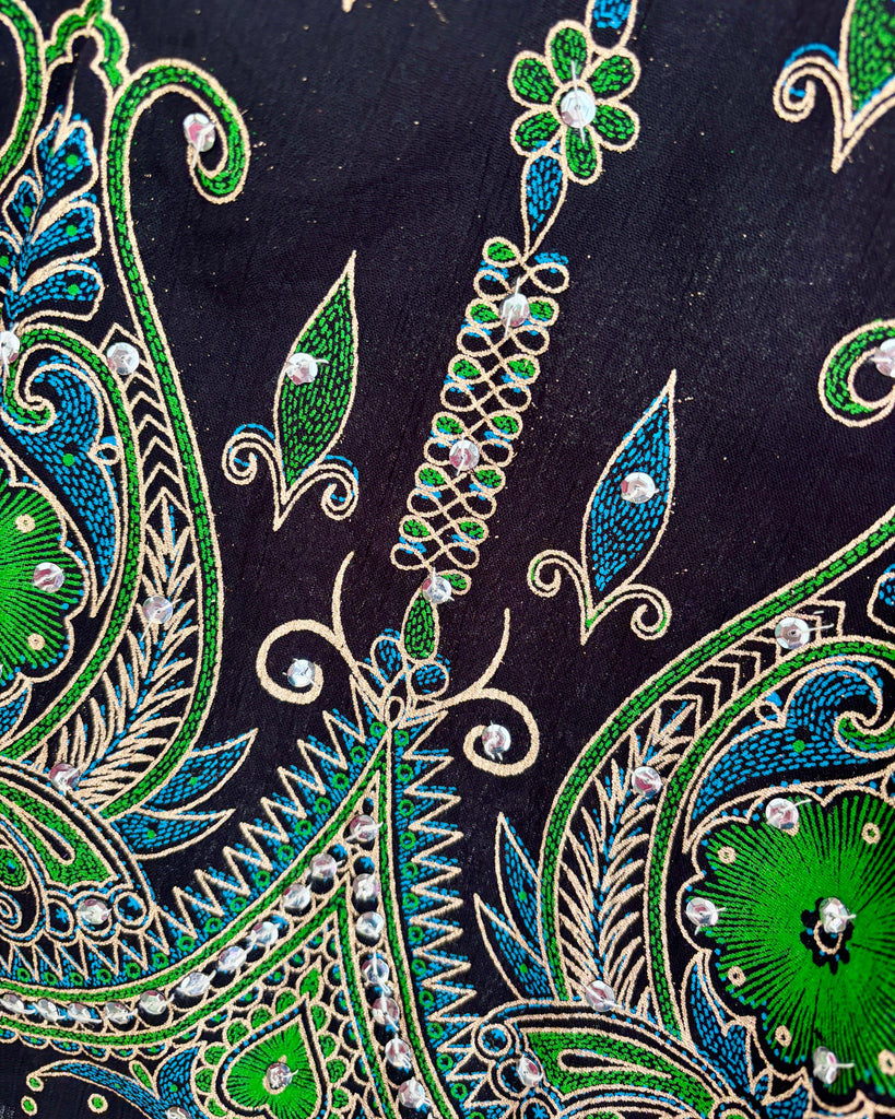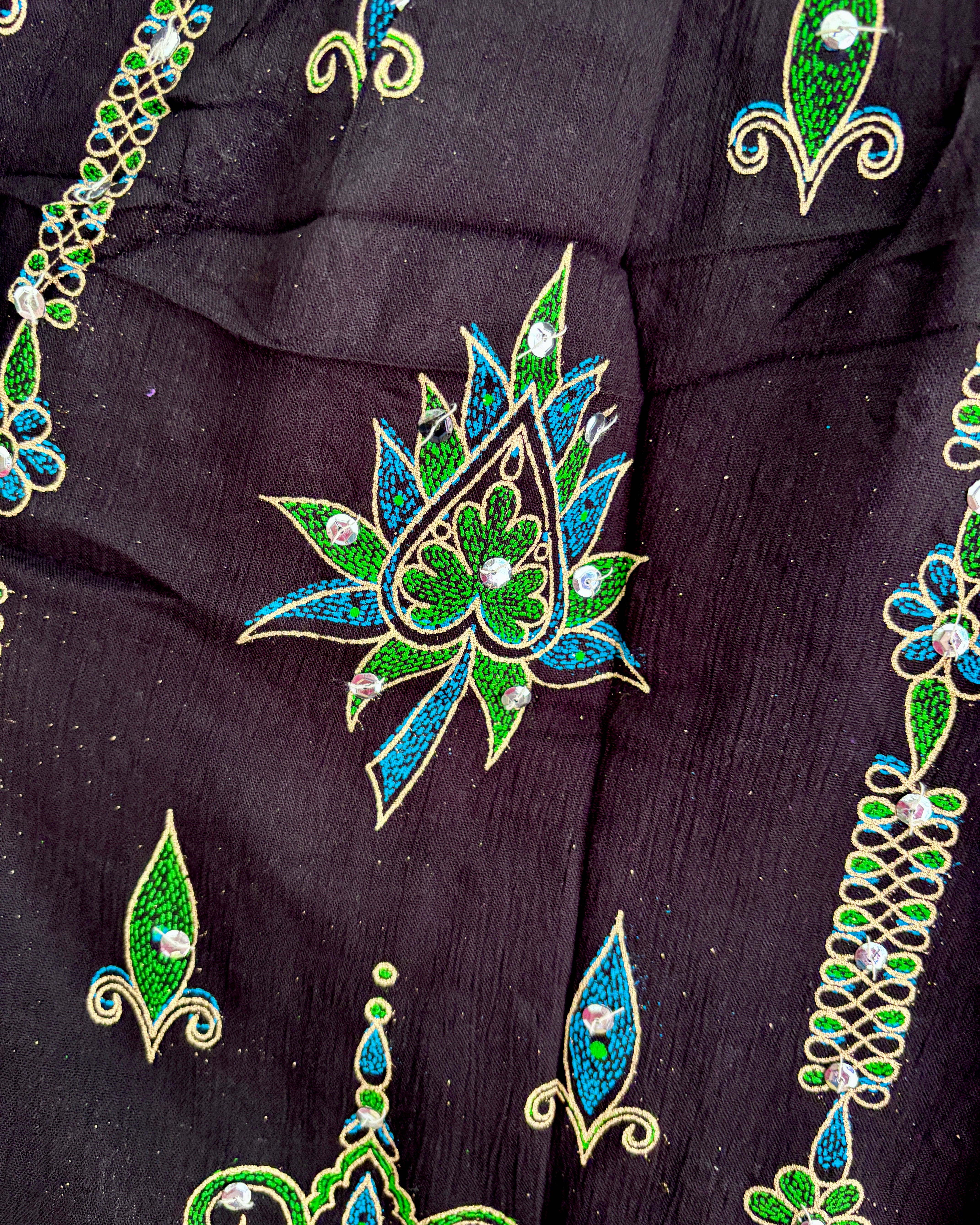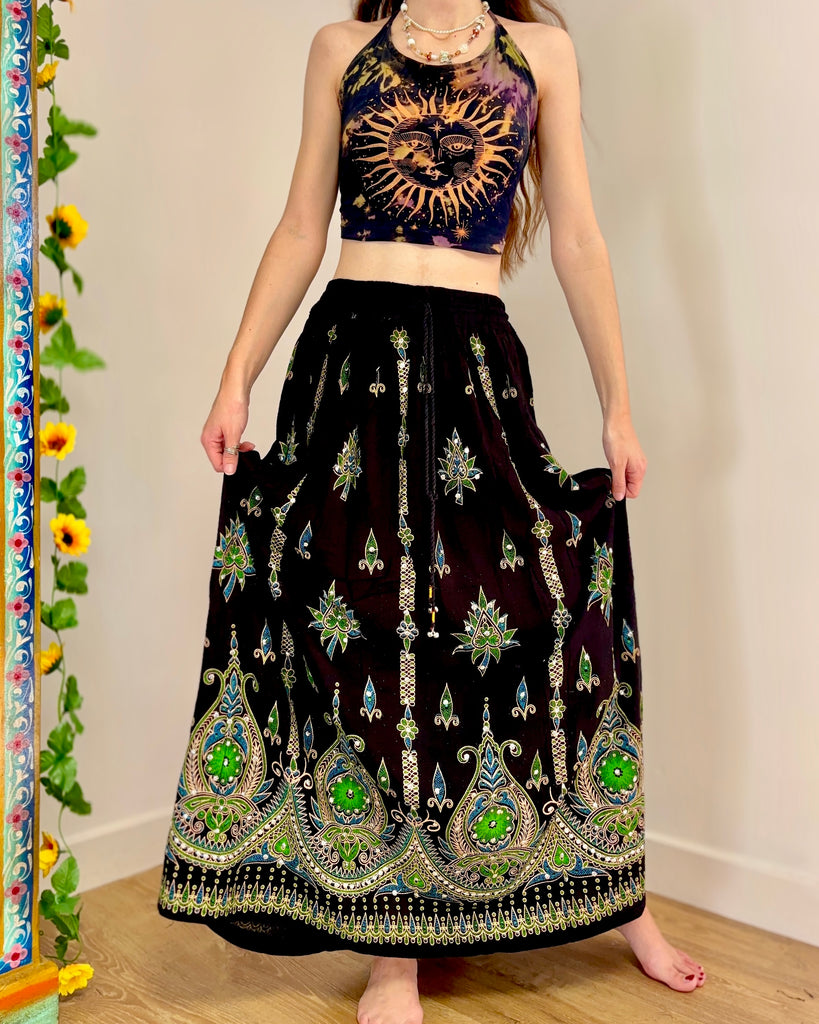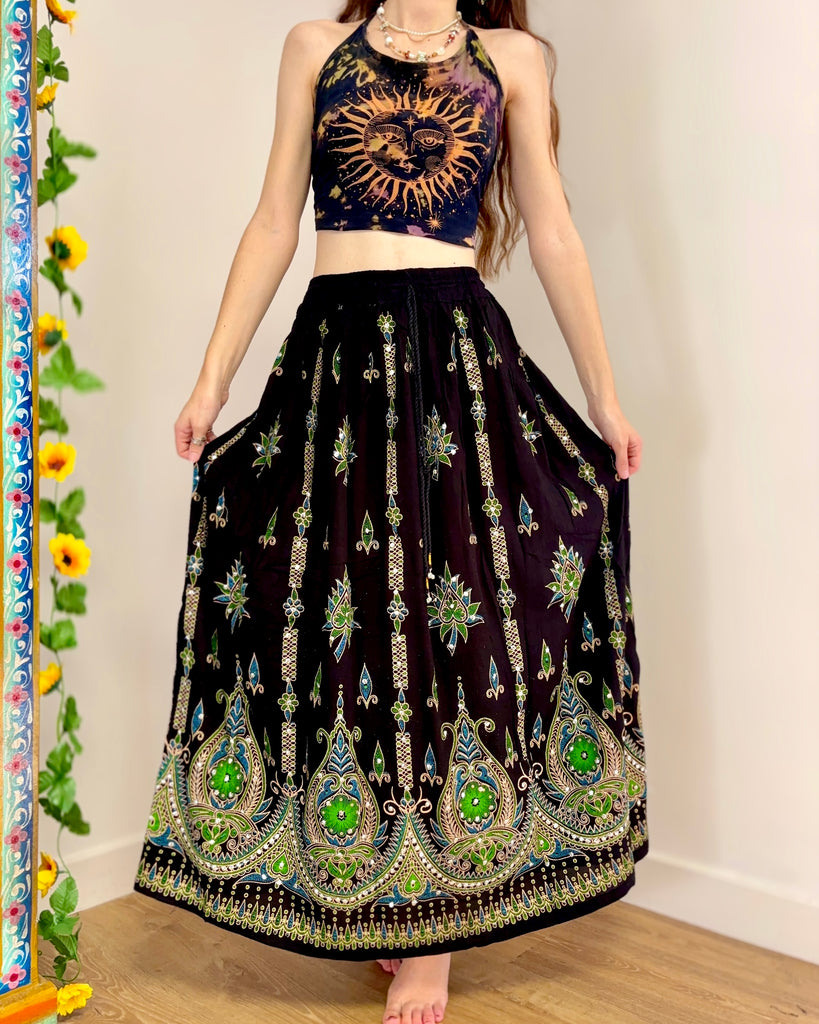 This beautiful Indian skirt is made from block-printed fabric adorned with sequins and bells.