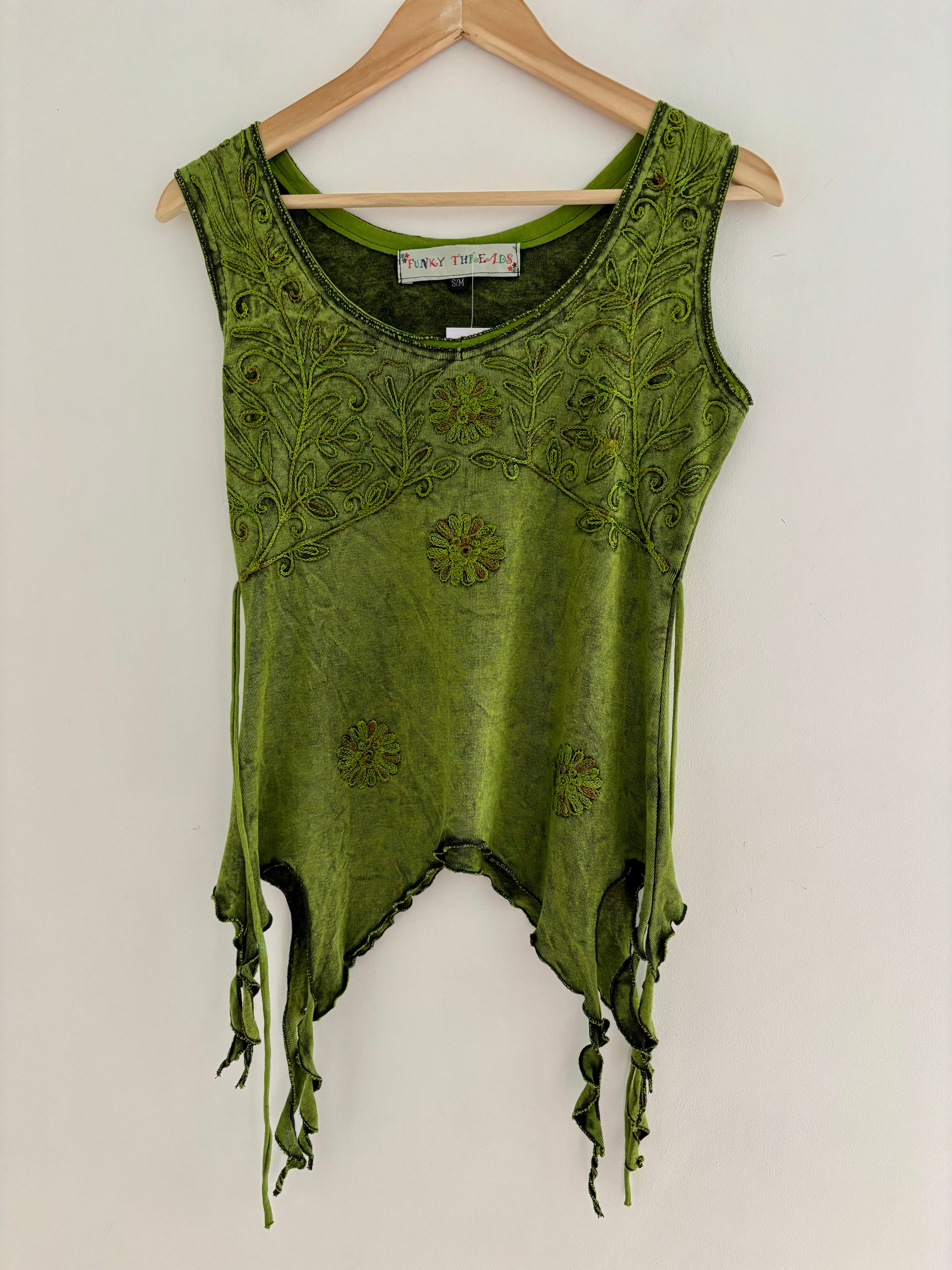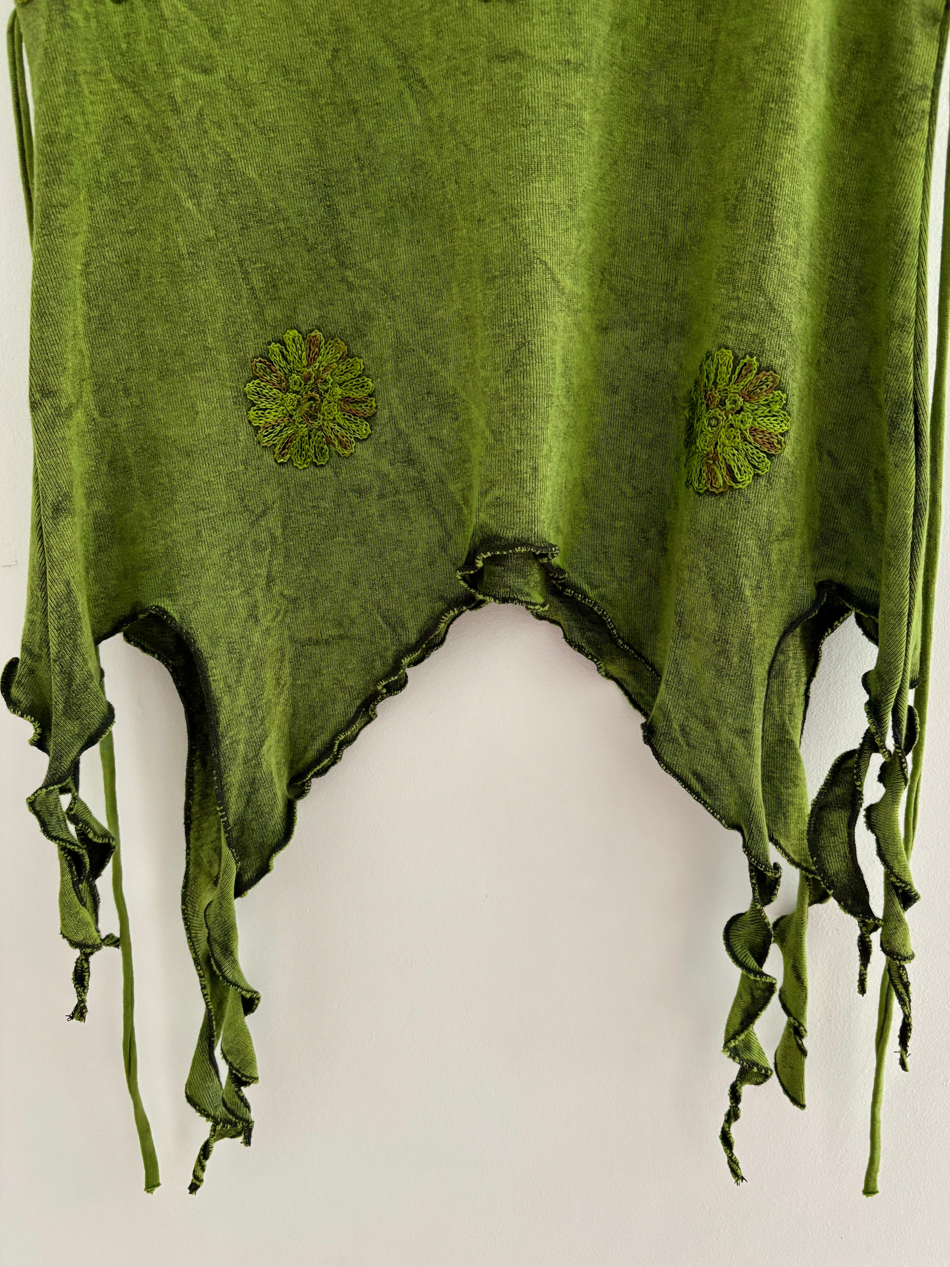 These beautiful sleeveless tops are made from green fabric, featuring embroidery and a pointed bottom to give a whimsical fairy look.