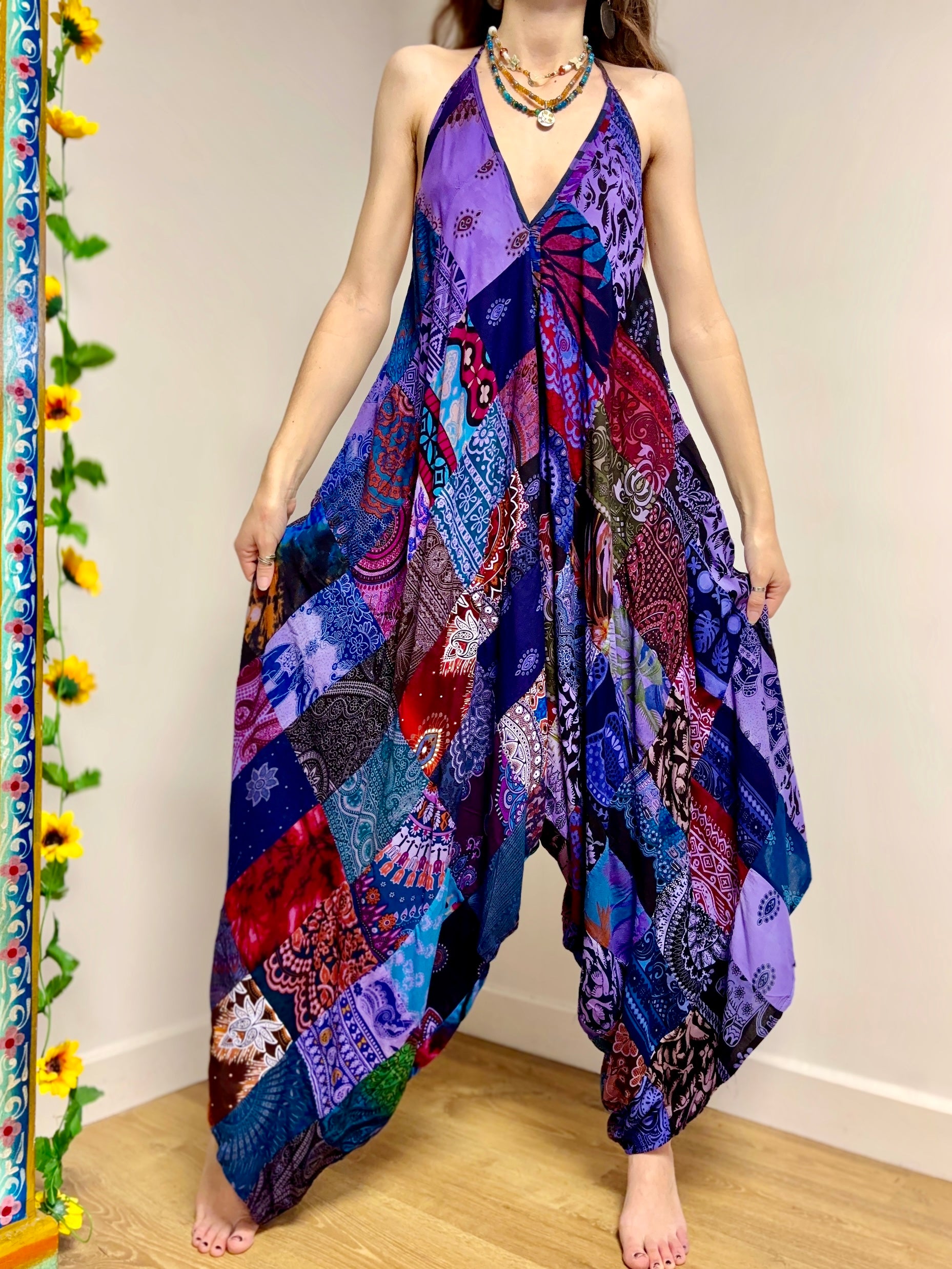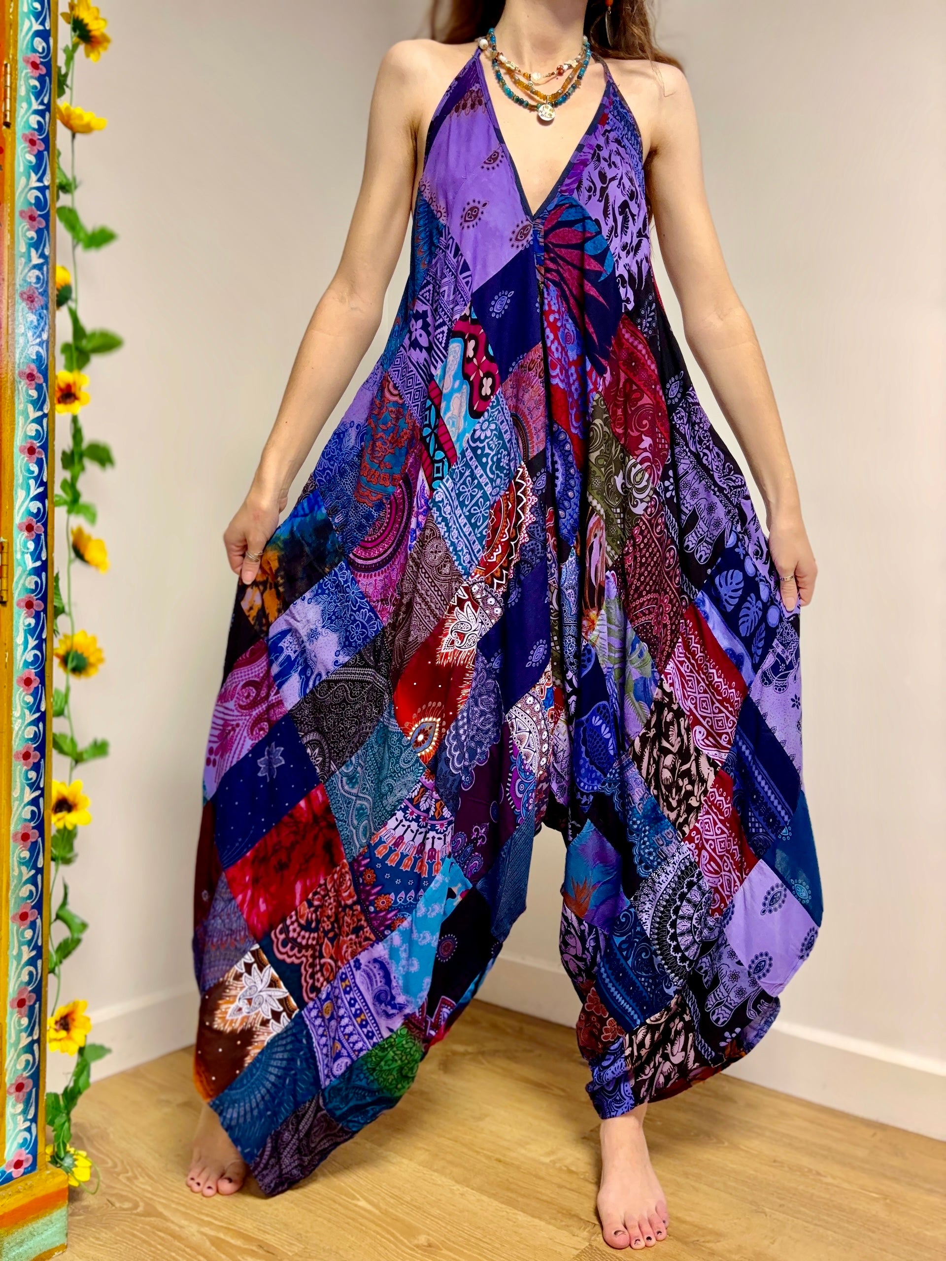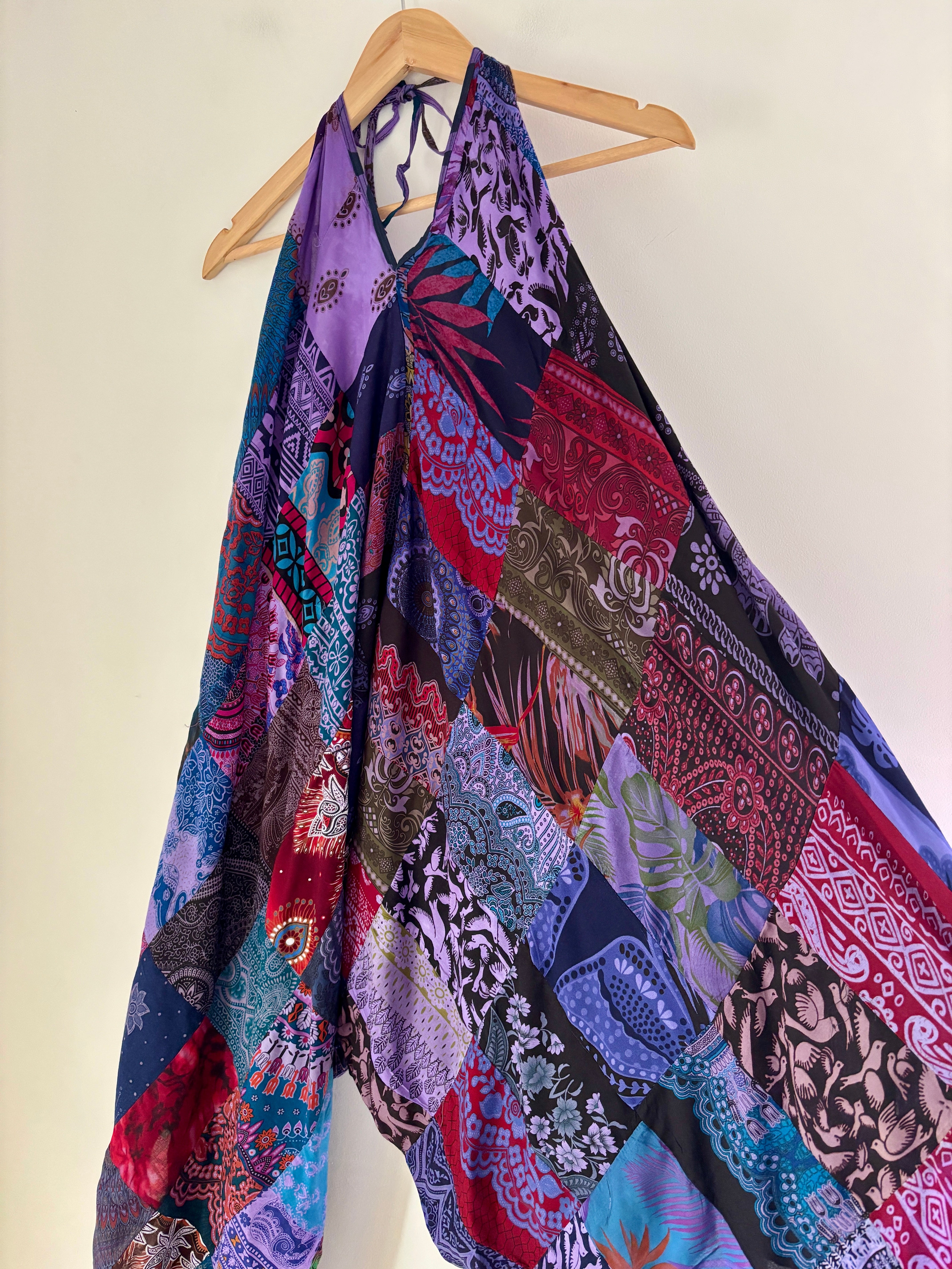 These jumpsuits are made from beautiful purple patchwork Thai fabric. They tie at the back and neck, with wide legs for a comfortable fit.