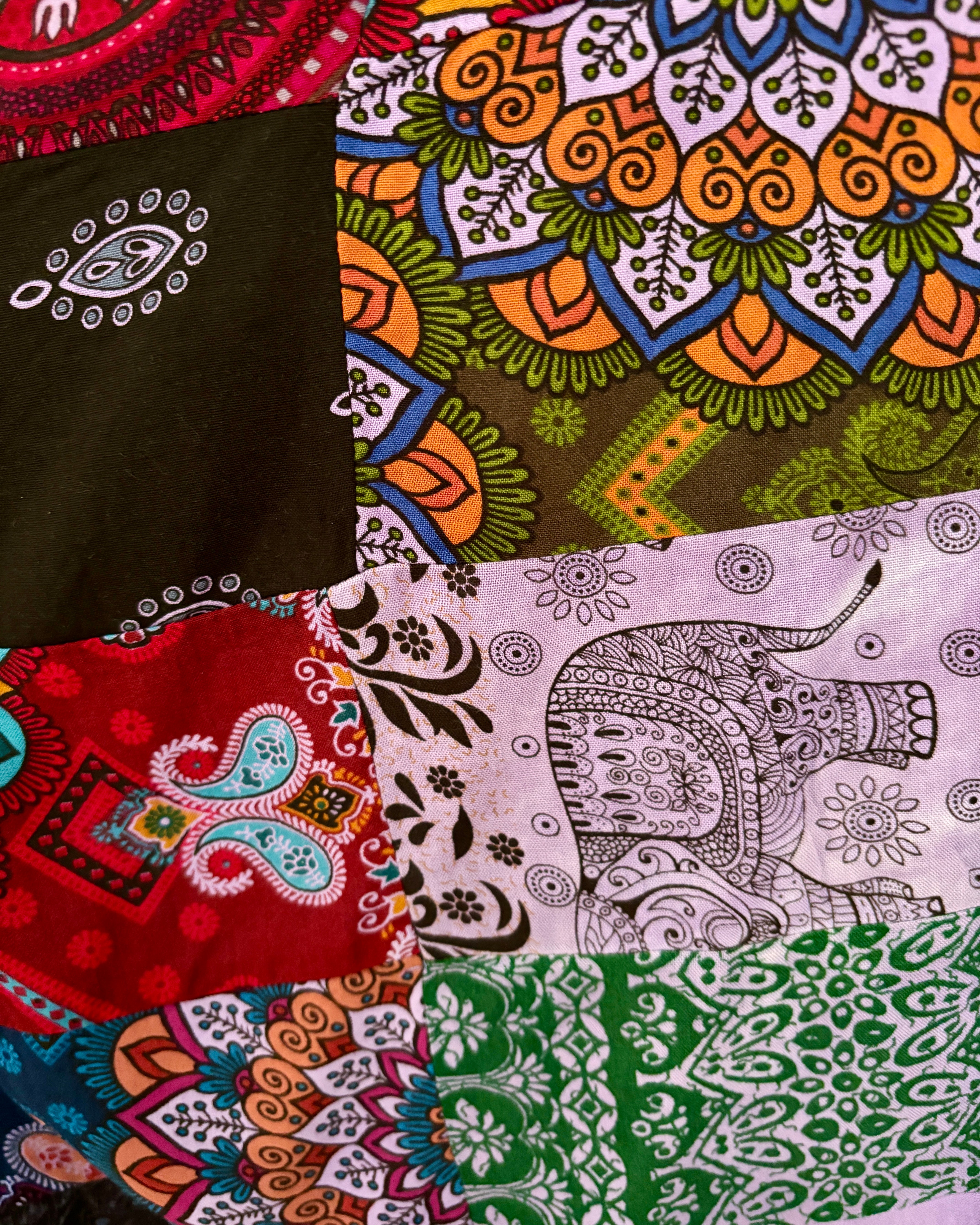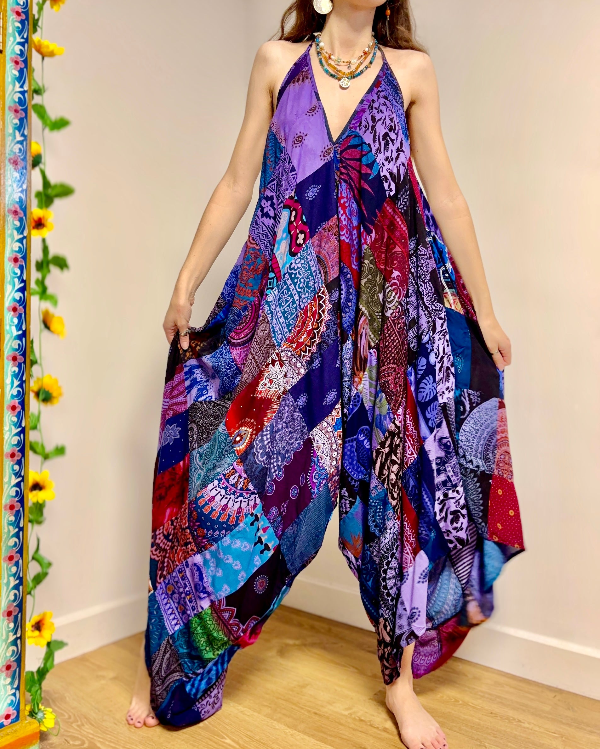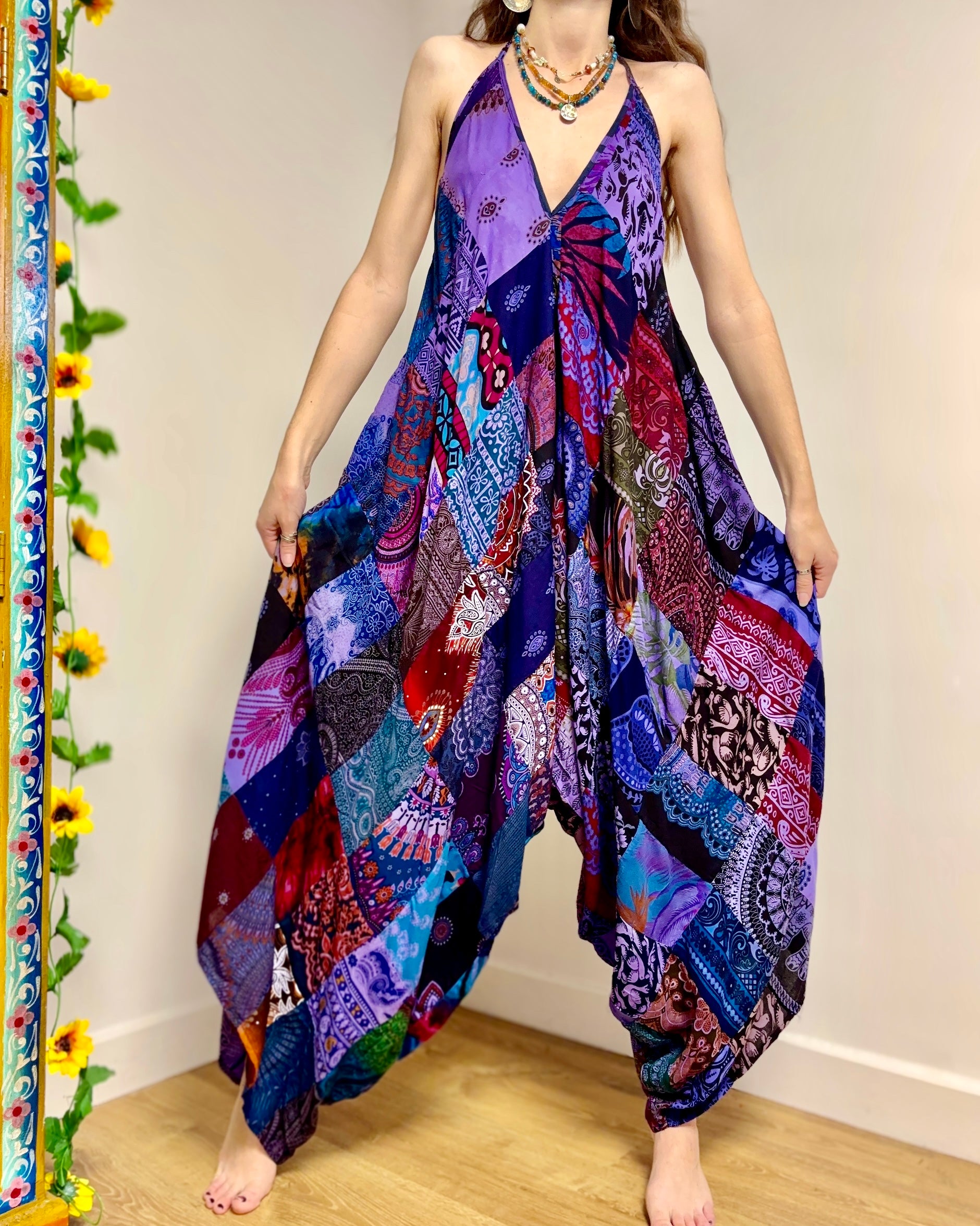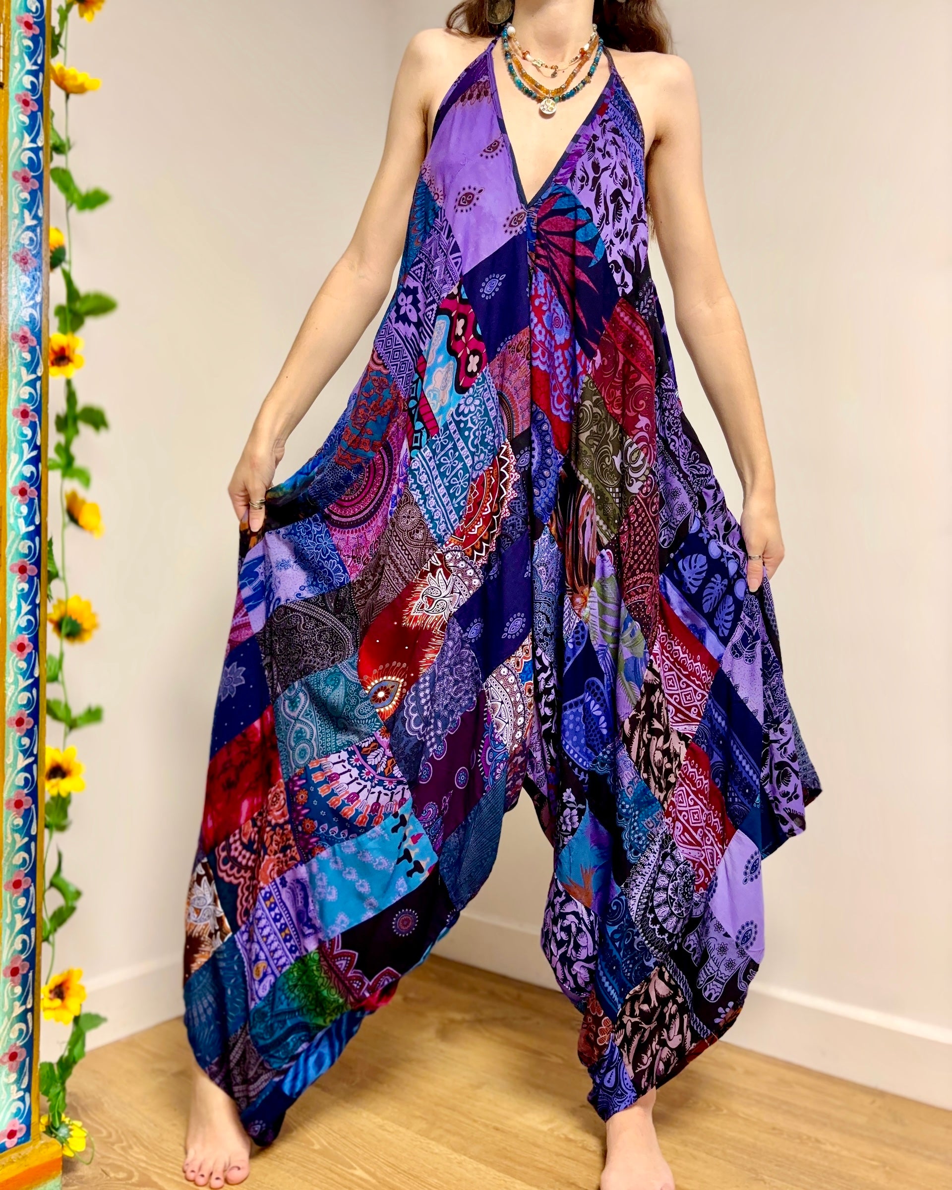 These jumpsuits are made from beautiful purple patchwork Thai fabric. They tie at the back and neck, with wide legs for a comfortable fit.