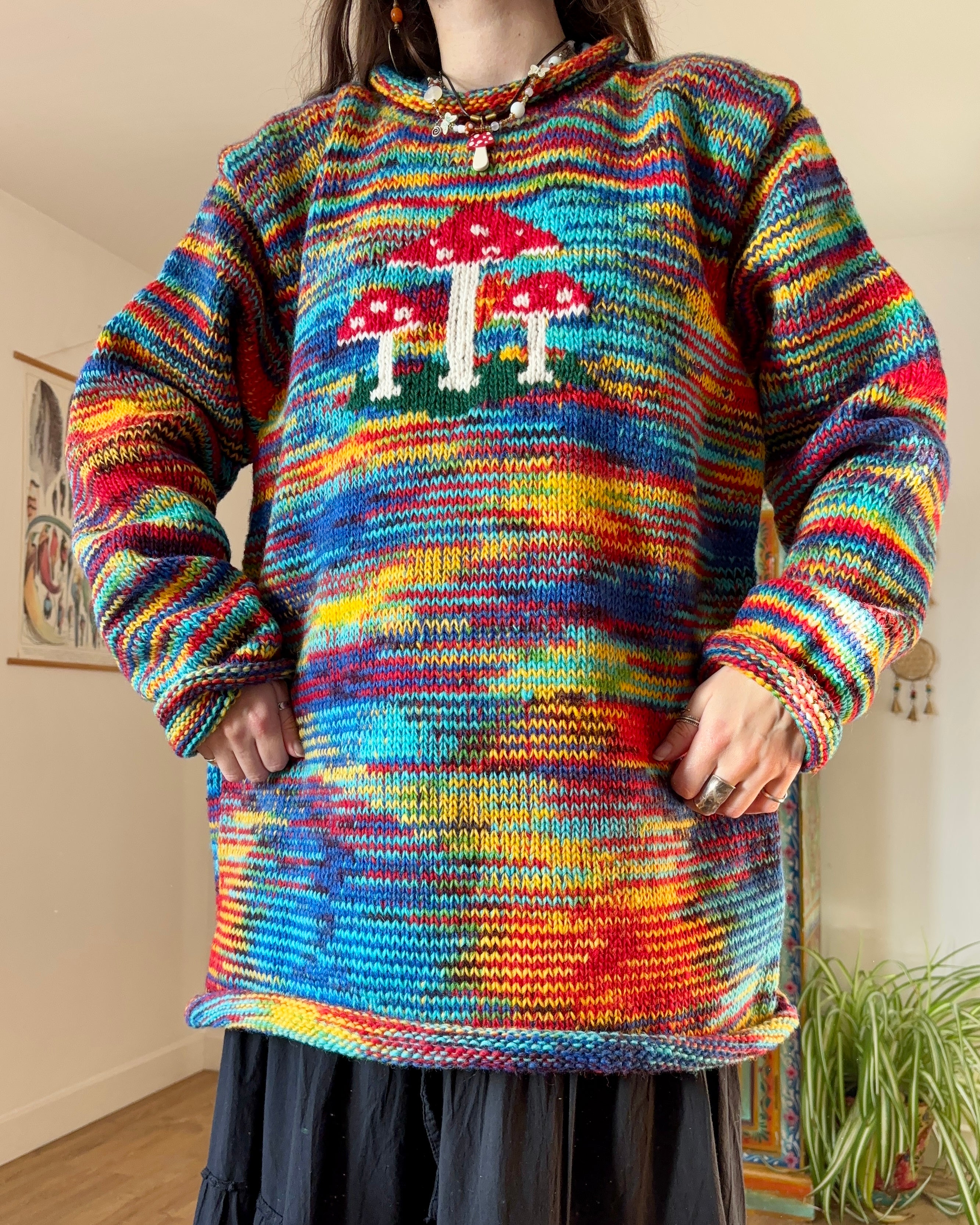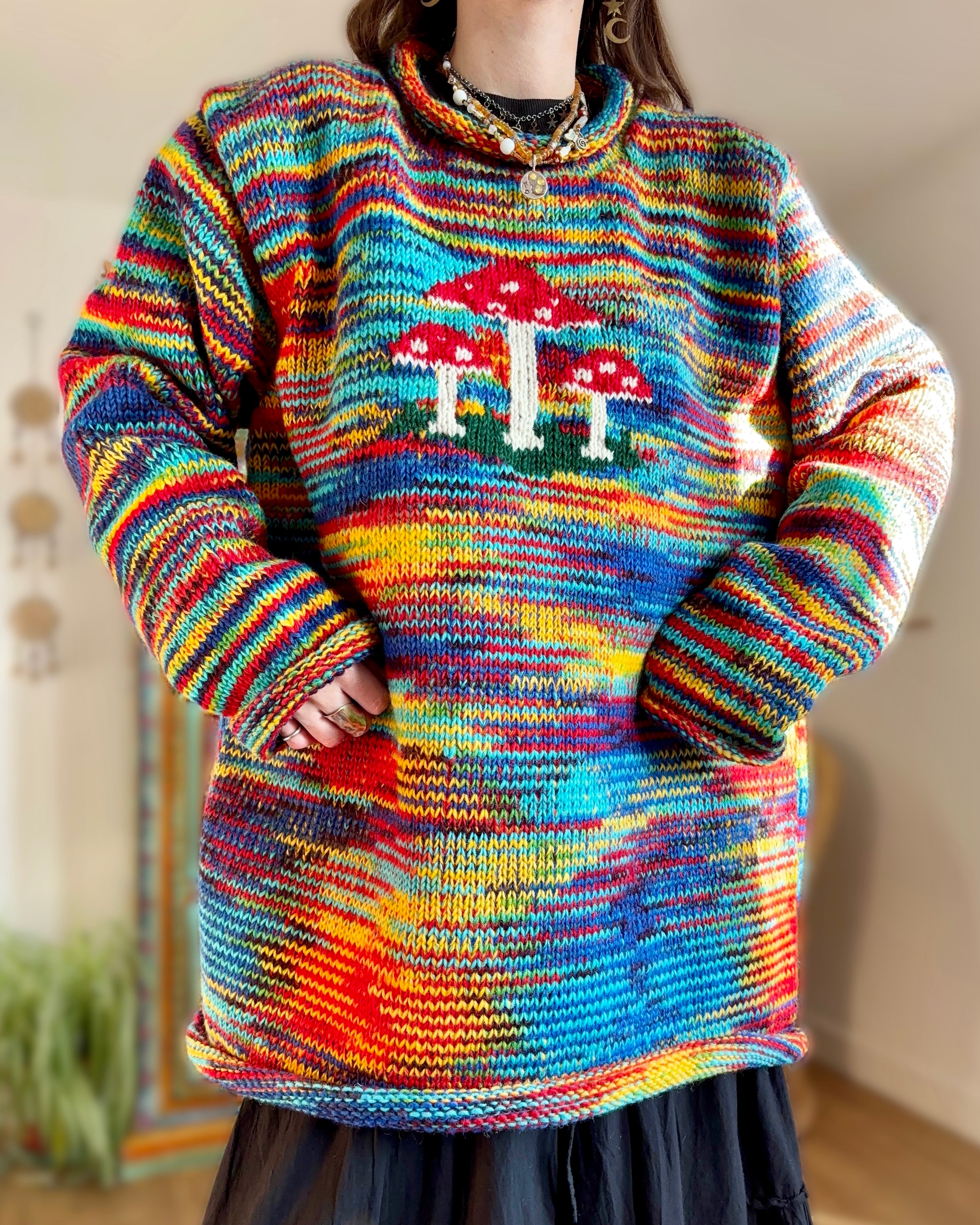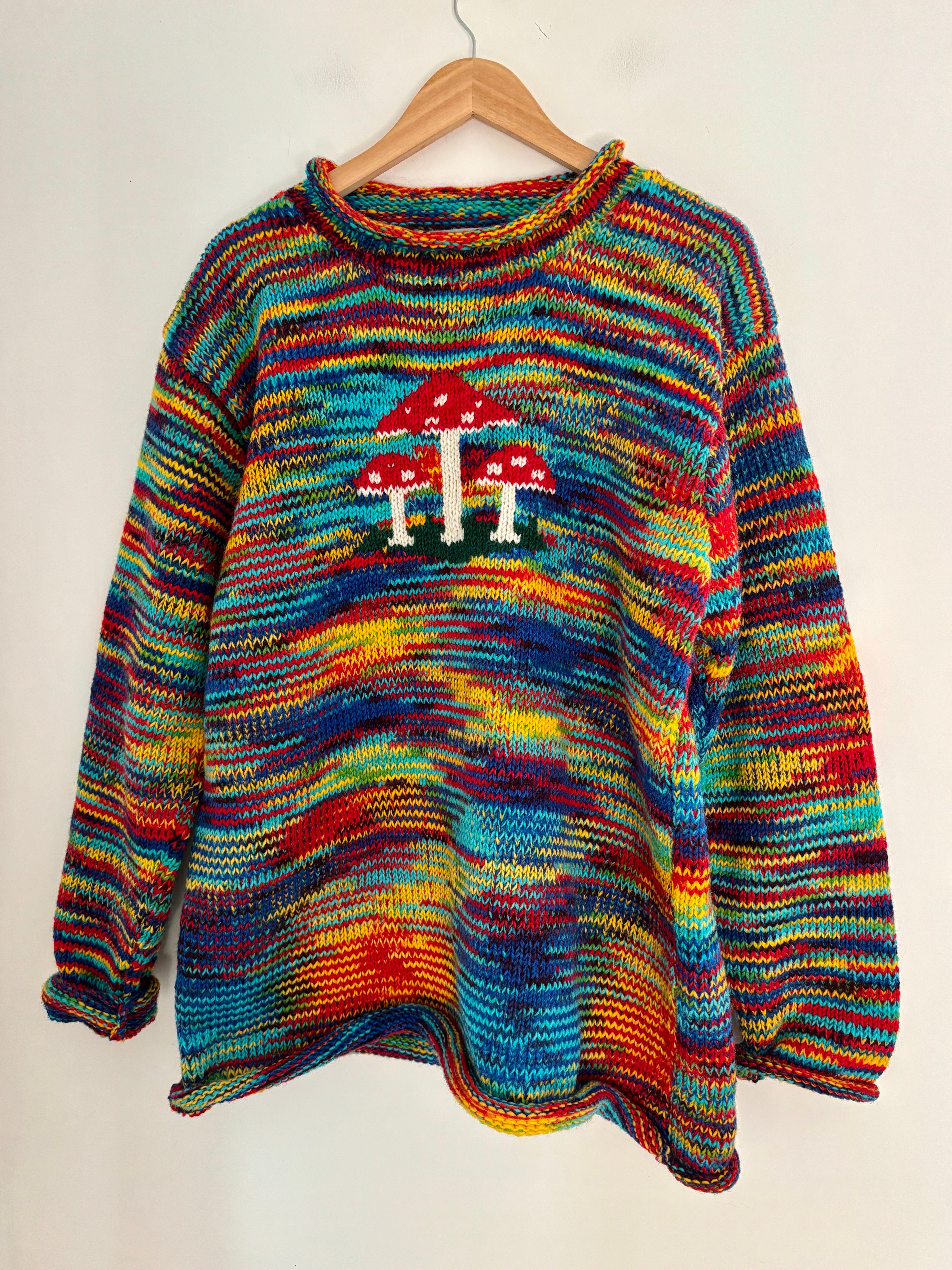 This magical mushroom jumper is hand-knitted by talented artisans Nepal. It is made from 100% wool.