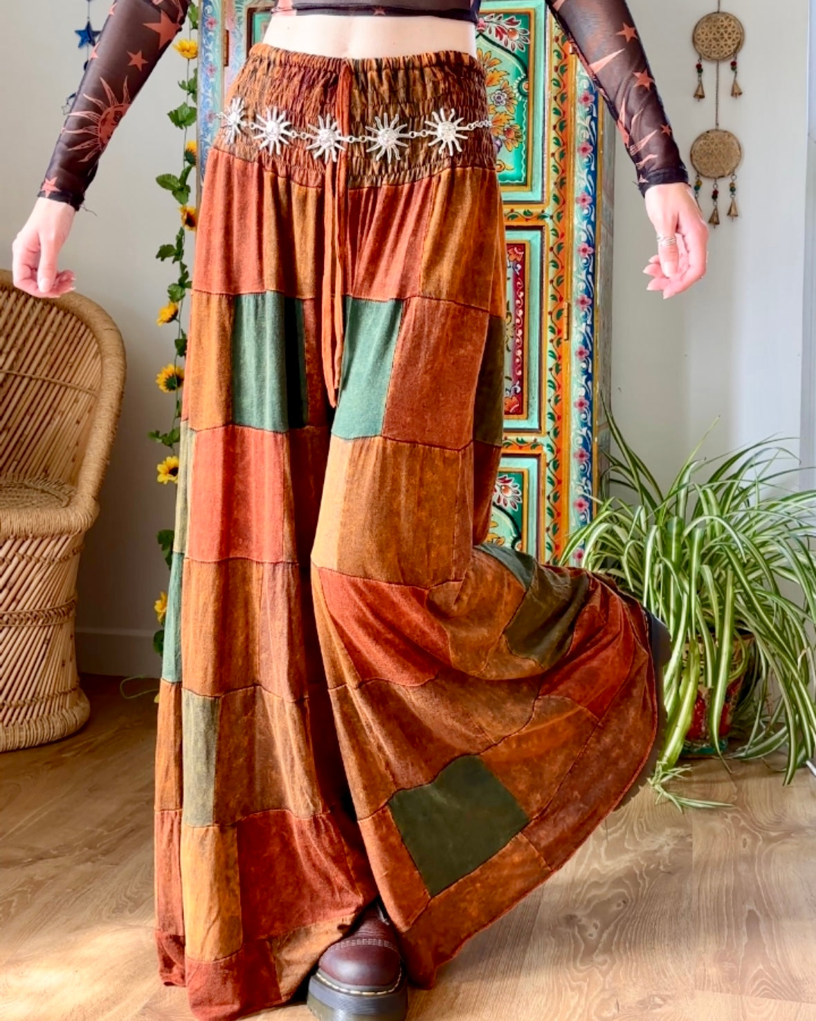 These palazzo trousers are made from patches of earthy orange fabric. They are soft, lightweight and comfortable, have an elasticated waist and two front pockets.